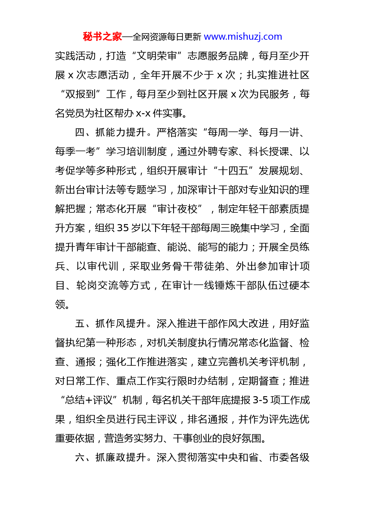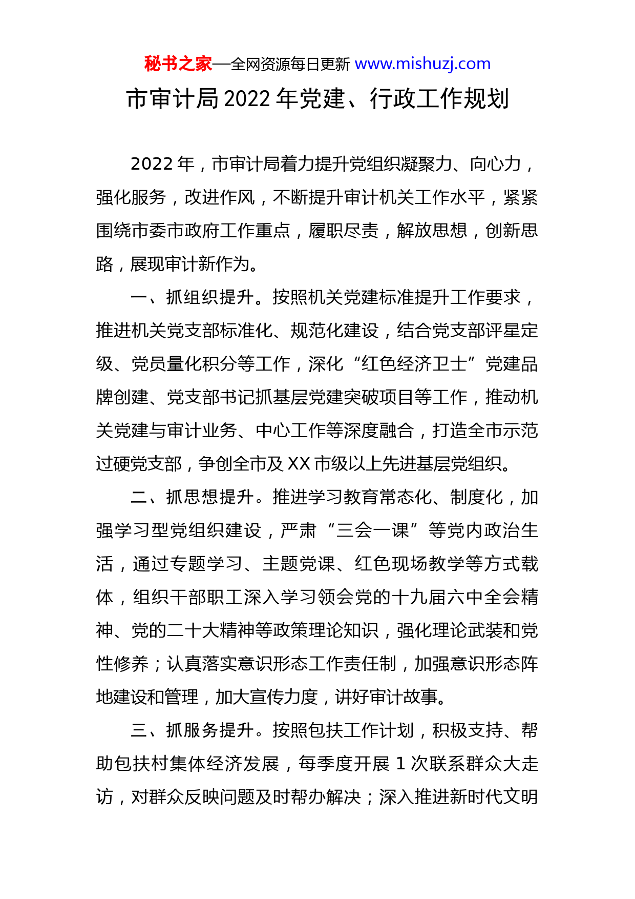 秘书之家—全网资源每日更新www.mishuzj.com市审计局2022年党建、行政工作规划2022年,市审计局着力提升党组织凝聚力、向心力,强化服务,改进作风,不断提升审计机关工作水平,紧紧围绕市委市政府工作重点,履职尽责,解放思想,创新思路,展现审计新作为。一、抓组织提升。按照机关党建标准提升工作要求,推进机关党支部标准化、规范化建设,结合党支部评星定级、党员量化积分等工作,深化“红色经济卫士”党建品牌创建、党支部书记抓基层党建突破项目等工作,推动机关党建与审计业务、中心工作等深度融合,打造全市示范过硬党支部,争创全市及XX市级以上先进基层党组织。二、抓思想提升。推进学习教育常态化、制度化,加强学习型党组织建设,严肃“三会一课”等党内政治生活,通过专题学习、主题党课、红色现场教学等方式载体,组织干部职工深入学习领会党的十九届六中全会精神、党的二十大精神等政策理论知识,强化理论武装和党性修养;认真落实意识形态工作责任制,加强意识形态阵地建设和管理,加大宣传力度,讲好审计故事。三、抓服务提升。按照包扶工作计划,积极支持、帮助包扶村集体经济发展,每季度开展1次联系群众大走访,对群众反映问题及时帮办解决;深入推进新时代文明秘书之家—全网资源每日更新www.mishuzj.com实践活动,打造“文明荣审”志愿服务品牌,每月至少开展x次志愿活动,全年开展不少于x次;扎实推进社区“双报到”工作,每月至少到社区开展x次为民服务,每名党员为社区帮办x-x件实事。四、抓能力提升。严格落实“每周一学、每月一讲、每季一考”学习培训制度,通过外聘专家、科长授课、以考促学等多种形式,组织开展审计“十四五”发展规划、新出台审计法等专题学习,加深审计干部对专业知识的理解把握;常态化开展“审计夜校”,制定年轻干部素质提升方案,组织35岁以下年轻干部每周三晚集中学习,全面提升青年审计干部能查、能说、能写的能力;开展全员练兵、以审代训,采取业务骨干带徒弟、外出参加审计项目、轮岗交流等方式,在审计一线锤炼干部队伍过硬本领。五、抓作风提升。深入推进干部作风大改进,用好监督执纪第一种形态,对机关制度执行情况常态化监督、检查、通报;强化工作推进落实,建立完善机关考评机制,对日常工作、重点工作实行限时办结制,定期督查;推进“总结+评议”机制,每名机关干部年底提报3-5项工作成果,组织全员进行民主评议,排名通报,并作为评先选优重要依据,营造务实努力、干事创业的良好氛围。六、抓廉政提升。深入贯彻落实中央和省、市委各级秘书之家—全网资源每日更新www.mishuzj.com关于从严治党的部署要求,坚持把纪律和规矩挺在前面,每季度开展x次廉政教育,加大警示教育力度;加强对党员干部的监督管理,强化审计“四严禁”工作要求和审计“八不准”工作纪律教育,组织审计组开展廉政审前承诺、审后述职工作,每季度联合法规科开展x次审计廉政回访,确保全员廉洁从审。