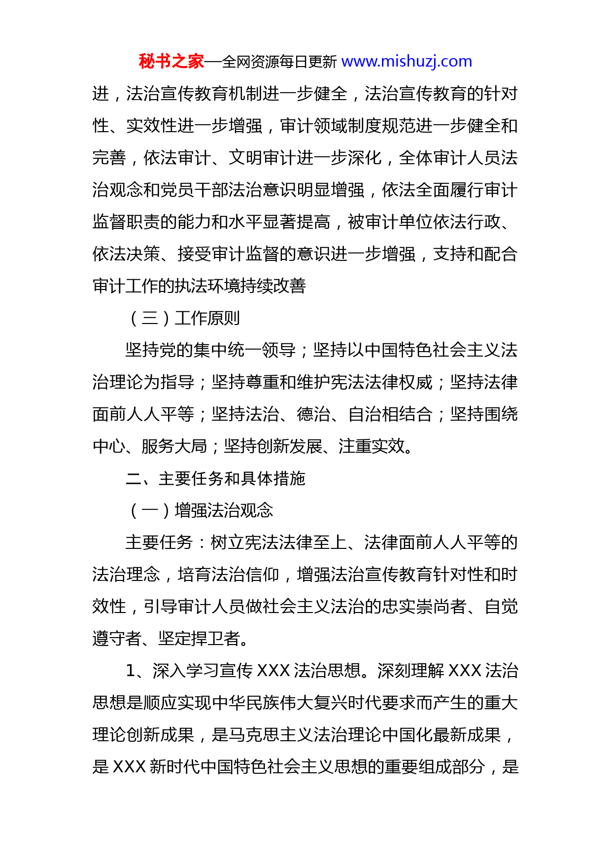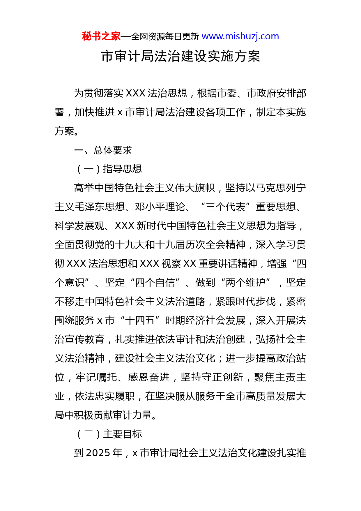 秘书之家—全网资源每日更新www.mishuzj.com市审计局法治建设实施方案为贯彻落实XXX法治思想,根据市委、市政府安排部署,加快推进x市审计局法治建设各项工作,制定本实施方案。一、总体要求(一)指导思想高举中国特色社会主义伟大旗帜,坚持以马克思列宁主义毛泽东思想、邓小平理论、“三个代表”重要思想、科学发展观、XXX新时代中国特色社会主义思想为指导,全面贯彻党的十九大和十九届历次全会精神,深入学习贯彻XXX法治思想和XXX视察XX重要讲话精神,增强“四个意识”、坚定“四个自信”、做到“两个维护”,坚定不移走中国特色社会主义法治道路,紧跟时代步伐,紧密围绕服务x市“十四五”时期经济社会发展,深入开展法治宣传教育,扎实推进依法审计和法治创建,弘扬社会主义法治精神,建设社会主义法治文化;进一步提高政治站位,牢记嘱托、感恩奋进,坚持守正创新,聚焦主责主业,依法忠实履职,在坚决服从服务于全市高质量发展大局中积极贡献审计力量。(二)主要目标到2025年,x市审计局社会主义法治文化建设扎实推秘书之家—全网资源每日更新www.mishuzj.com进,法治宣传教育机制进一步健全,法治宣传教育的针对性、实效性进一步增强,审计领域制度规范进一步健全和完善,依法审计、文明审计进一步深化,全体审计人员法治观念和党员干部法治意识明显增强,依法全面履行审计监督职责的能力和水平显著提高,被审计单位依法行政、依法决策、接受审计监督的意识进一步增强,支持和配合审计工作的执法环境持续改善(三)工作原则坚持党的集中统一领导;坚持以中国特色社会主义法治理论为指导;坚持尊重和维护宪法法律权威;坚持法律面前人人平等;坚持法治、德治、自治相结合;坚持围绕中心、服务大局;坚持创新发展、注重实效。二、主要任务和具体措施(一)增强法治观念主要任务:树立宪法法律至上、法律面前人人平等的法治理念,培育法治信仰,增强法治宣传教育针对性和时效性,引导审计人员做社会主义法治的忠实崇尚者、自觉遵守者、坚定捍卫者。1、深入学习宣传XXX法治思想。深刻理解XXX法治思想是顺应实现中华民族伟大复兴时代要求而产生的重大理论创新成果,是马克思主义法治理论中国化最新成果,是XXX新时代中国特色社会主义思想的重要组成部分,是秘书之家—全网资源每日更新www.mishuzj.com全面依法治国的根本遵循和行动指南。将学习宣传贯彻XXX法治思想作为首要任务,纳入“八五”普法重要内容,进一步增强审计机关厉行法治的积极性和主动性,自觉用XXX法治思想武装头脑、指导实践,把XXX法治思想贯彻落实到审计工作全过程和各方面,提高审计工作成效。2、深入持续开展宪法学习宣传。坚持把学习宣传贯彻宪法摆在首要位置,将宪法法律学习列为党组理论学习中心组学习的重要内容,在审计机关中营造出人人尊崇学法、学习宪法、遵守宪法、维护宪法、运用宪法的良好氛围,使广大审计人员进一步牢固树立以依法治国、执法为民、公平正义、服务大局、党的领导为基本内容的社会主义法治理念,自觉维护宪法尊严、保障宪法实施,深刻认识审计监督的宪法地位,全面履行宪法赋子审计机关的神圣职责。3、进一步推动民法典贯彻实施。将学习宣传贯彻实施民法典纳入主要负责人履行推进法治建设第一责任人职责的重要内容,坚持把民法典作为行政决策、行政管理、审计监督的重要标尺,将民法典的基本原则和要求贯彻和运用于执法、守法普法活动中。4、开展好审计职能相关的法律法规学习宣传。围绕服务中央重大决策部署、省委省政府和市委市政府中心工秘书之家—全网资源每日更新www.mishuzj.com作,在预算执行、经济责任、自然资源、民生、政府投资等审计项目开展过程中,主动进行《审计法》及其《审计实施条例》、《党政主要领导干部和国有企事业单位主要领导人员经济责任审计规定》、《国家审计准则》等相关法律法规宣传。(二)健全审计领域制度规范主要任务:加快建立健全审计领域法规制度,完善审计管理体系,强化审计质量控制,以高质量立法保障高质量发展,以良法促进社会进步。1、形成健全的审计管理制度体系。根据审计法的修订,修改完善相关审计管理制度规定,健全审计业务管理、廉政建设、岗位考核、责任追究等内部管理制度,完善和落实重大事项报告制度,提高规范化管理水平,建立和落实审计规范性文件的起草审查、集体审议、公开发布等制度,加强合法性审查,提高审计制度建设的程序化、科学化水平。2、形成健全的审计业务质量控制机制。压实审计质量控制各岗位、各环节责任,优化复核审理流程,严格制度执行,对发现的重大审计质量问题,要按照权责一致的原则,严格责任追究。改进优秀审计项目评选,发挥好优秀审计项目的示范引领作用。3、积极参与国家法律法规和地方性法规规章的制定工秘书之家—全网资源每日更新www.mishuzj.com作。认真分析研究审计发现的相关领域法制不健全、不完善的问题,提出制定或修订相关法律法规规章的建议。在办理立法征求意见过程中,加强对重要法律法规规章草案的研究论证,提出有深度高质量的意见和建议。充分发挥审计机关在推进法治建设和国家治理中的作用,促进完善中国特色社会主义法律体系。(三)增强审计执法力度和效果主要任