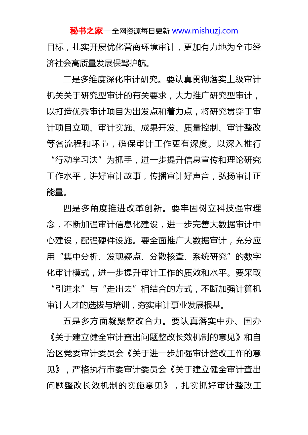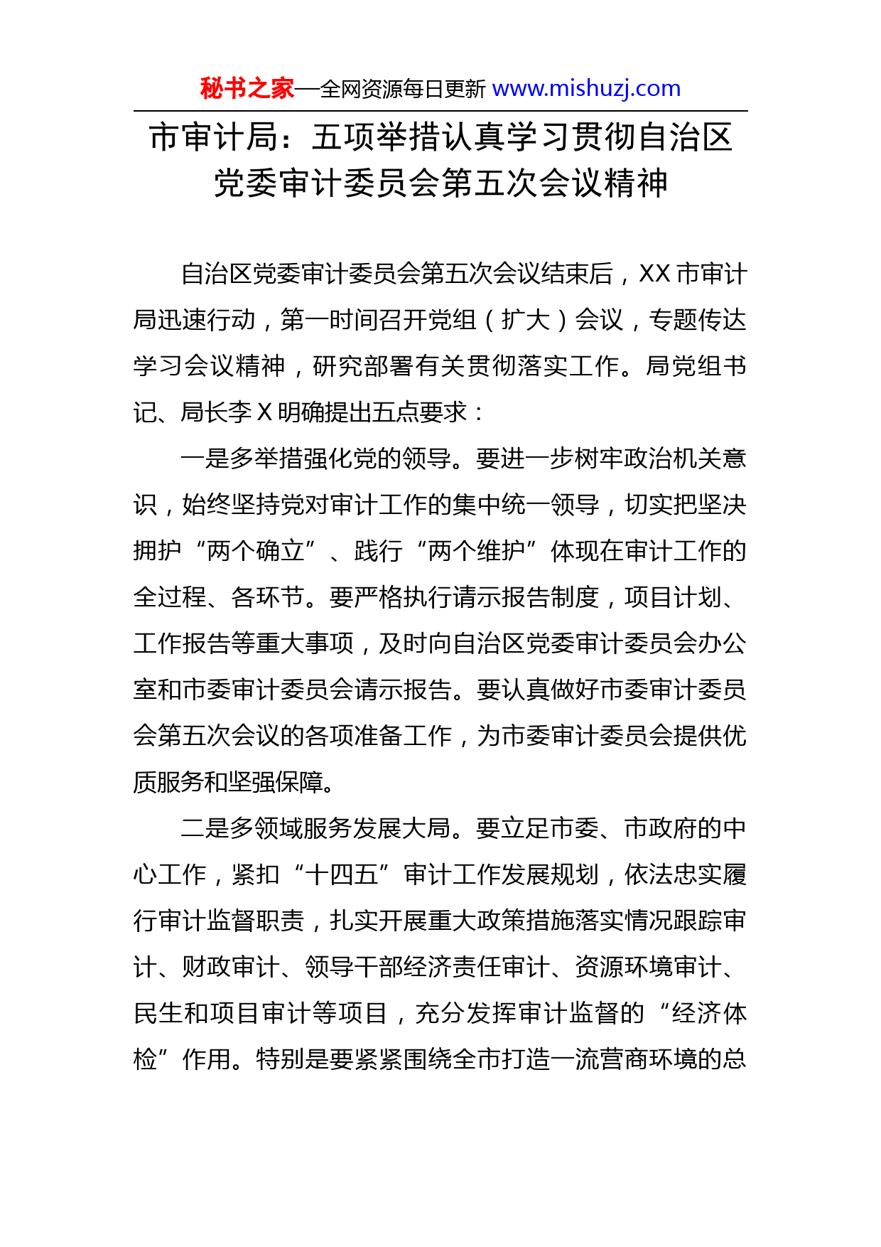 秘书之家—全网资源每日更新www.mishuzj.com市审计局:五项举措认真学习贯彻自治区党委审计委员会第五次会议精神自治区党委审计委员会第五次会议结束后,XX市审计局迅速行动,第一时间召开党组(扩大)会议,专题传达学习会议精神,研究部署有关贯彻落实工作。局党组书记、局长李X明确提出五点要求:一是多举措强化党的领导。要进一步树牢政治机关意识,始终坚持党对审计工作的集中统一领导,切实把坚决拥护“两个确立”、践行“两个维护”体现在审计工作的全过程、各环节。要严格执行请示报告制度,项目计划、工作报告等重大事项,及时向自治区党委审计委员会办公室和市委审计委员会请示报告。要认真做好市委审计委员会第五次会议的各项准备工作,为市委审计委员会提供优质服务和坚强保障。二是多领域服务发展大局。要立足市委、市政府的中心工作,紧扣“十四五”审计工作发展规划,依法忠实履行审计监督职责,扎实开展重大政策措施落实情况跟踪审计、财政审计、领导干部经济责任审计、资源环境审计、民生和项目审计等项目,充分发挥审计监督的“经济体检”作用。特别是要紧紧围绕全市打造一流营商环境的总秘书之家—全网资源每日更新www.mishuzj.com目标,扎实开展优化营商环境审计,更加有力地为全市经济社会高质量发展保驾护航。三是多维度深化审计研究。要认真贯彻落实上级审计机关关于研究型审计的有关要求,大力推广研究型审计,以打造优秀审计项目为出发点和着力点,将研究贯穿于审计项目立项、审计实施、成果开发、质量控制、审计整改等各流程和环节,确保审计工作更有深度。以深入推行“行动学习法”为抓手,进一步提升信息宣传和理论研究工作水平,讲好审计故事,传播审计好声音,弘扬审计正能量。四是多角度推进改革创新。要牢固树立科技强审理念,不断加强审计信息化建设,进一步完善大数据审计中心建设,配强硬件设施。要全面推广大数据审计,充分应用“集中分析、发现疑点、分散核查、系统研究”的数字化审计模式,进一步提升审计工作的质效和水平。要采取“引进来”与“走出去”相结合的方式,不断加强计算机审计人才的选拔与培训,夯实审计事业发展根基。五是多方面凝聚整改合力。要认真落实中办、国办《关于建立健全审计查出问题整改长效机制的意见》和自治区党委审计委员会《关于进一步加强审计整改工作的意见》,严格执行市委审计委员会《关于建立健全审计查出问题整改长效机制的实施意见》,扎实抓好审计整改工秘书之家—全网资源每日更新www.mishuzj.com作,做好审计监督“后半篇文章”。要推动审计监督与纪检监察、巡察、党政督查相结合,与人大监督、民主监督等各类监督相贯通,推动问题整改和成果共享。