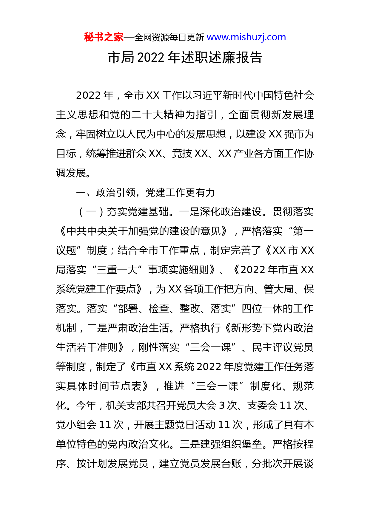 秘书之家—全网资源每日更新www.mishuzj.com市局2022年述职述廉报告2022年,全市XX工作以习近平新时代中国特色社会主义思想和党的二十大精神为指引,全面贯彻新发展理念,牢固树立以人民为中心的发展思想,以建设XX强市为目标,统筹推进群众XX、竞技XX、XX产业各方面工作协调发展。一、政治引领,党建工作更有力(一)夯实党建基础。一是深化政治建设。贯彻落实《中共中央关于加强党的建设的意见》,严格落实“第一议题”制度;结合全市工作重点,制定完善了《XX市XX局落实“三重一大”事项实施细则》、《2022年市直XX系统党建工作要点》,为XX各项工作把方向、管大局、保落实。落实“部署、检查、整改、落实”四位一体的工作机制,二是严肃政治生活。严格执行《新形势下党内政治生活若干准则》,刚性落实“三会一课”、民主评议党员等制度,制定了《市直XX系统2022年度党建工作任务落实具体时间节点表》,推进“三会一课”制度化、规范化。今年,机关支部共召开党员大会3次、支委会11次、党小组会11次,开展主题党日活动11次,形成了具有本单位特色的党内政治文化。三是建强组织堡垒。严格按程序、按计划发展党员,建立党员发展台账,分批次开展谈秘书之家—全网资源每日更新www.mishuzj.com话并进行后续考察,确定入党积极分子3名、党员发展对象2名,按期转正2人。组织开展贫困户慰问等一系列党支部活动,积极号召党员干部投身疫情防控,成立6支疫情防控一线党员先锋队,先后有134名干部职工下沉社区开展防疫服务。四是狠抓责任落实。党组书记带头履行党建工作“第一责任人”职责,党组成员履行“分管职责”,召开党建工作专题研究部署会议2次,将党建工作与业务工作同部署、同安排;确定“发挥党的领导优势,推动党建工作与迎战省运会深度融合的实践探索”为本年度书记抓党建突破项目,打造工作亮点。(二)抓牢思想建设。一是严格执行学习制度。制定《中共XX市XX局党组理论学习中心组2022年度学习安排》,提高学习频次,拓宽学习范围,系统领会习近平新时代中国特色社会主义思想,今年,党组中心组开展集中学习12次。二是巩固党史学习成果。根据XX市贯彻落实《关于推动党史学习教育常态化长效化的意见》的若干措施,引导广大党员干部深刻领悟“两个确立”的决定性意义,持续巩固党史学习教育成果;完成了《习近平谈治国理政》第四卷订阅学习工作,该书成为党员干部学习进步的重要材料。三是严抓意识形态工作。严格落实意识形态工作责任制,开展意识形态相关论述专题学习2次,共同参加“共筑网安防线维护国家安全”主题教育活动;充分秘书之家—全网资源每日更新www.mishuzj.com利用每周夜校、学习强国等平台,推进意识形态网格化管理;严审信息发布,全年开展意识形态领域风险隐患排查3次。四是扎实做好党的二十大精神学习宣传贯彻工作。制定《XX市XX局学习宣传贯彻党的二十大精神的意见》,把学习宣传贯彻党的二十大精神纳入市直XX系统党员干部教育培训全年学习计划,激励广大教练员、运动员把党的二十大精神贯彻落实到日常训练中去,自觉弘扬伟大的建党精神。(三)深化作风建设。一是持续改进工作作风。大力倡树“严真细实快”的工作作风,制定出台《市XX局“机关接地气、干部走基层”活动实施方案》,启动XX系统“能力作风建设年”活动;坚持集中教育、专题教育、日常教育相结合,通过观看纪委警示教育片、开展家教家风建设主题党课,引导党员干部知敬畏、存戒惧、守底线。二是加强党风廉政建设。起草了《中共XX市XX局党组关于推进2022年全面从严治党暨党风廉政建设和反腐败工作的实施意见》,压紧压实全面从严治党主体责任;开展读书、观展等廉洁教育活动,组织“吃拿卡要”行为自查等专项摸排,筑牢党员干部拒腐防变思想底线。三是强化权力运行监管。严格遵守“六大纪律”、《XX市领导干部廉洁用权“十严禁”》,驰而不息纠治“四风”;严格落实党内监督,先后起草《XX市XX局关于贯彻落实市纪委专秘书之家—全网资源每日更新www.mishuzj.com项监督工作的意见》、《XX市XX局关于贯彻落实对XX赛事举办及设施器材采购进行专项监督的工作方案》,持续营造XX系统风清气正的良好政治生态。二、强基固本,竞技XX攀高峰(一)国际大赛捷报频传。今年,XX籍运动员共获得包括铁饼、跆拳道、跳水、飞碟、场地自行车等项目在内的XXX个世界冠军,再次问鼎该项目冠军。(二)圆满完成XX省第XXX届省运会参赛任务。本届省运会,我市共派出1570名运动员、XX名教练员和XX名工作人员参加XX个大项、985个小项的比赛,经过顽强拼搏,XX代表团最终获得XX枚金牌,取得金牌成绩奖第XX名,总分成绩奖第XX名,比赛金牌成绩奖第XX名,比赛总分成绩奖第XX名,优秀运动员组金牌总分成绩奖第XX名的成绩,并获得XX道德风尚奖,实现XX成绩和精神文明双丰收、双胜利。(三)强化基地建设。抓牢阵地建设,落实市、县体校办学标准。做好国家级后备人才基地评估工作,共有10个单位上报总局参与评估。加强XX后备人才培养,组织体校教练员、管理人员、文化课教师开展远程研修;联合市教育局,举办2期全市校园篮球传统特色学校XX教师培训班,共培训教师97人;暑假期间举办4期游泳培训班,培训人数超1800人,合格率达99%。秘书之家—全网资源每日更