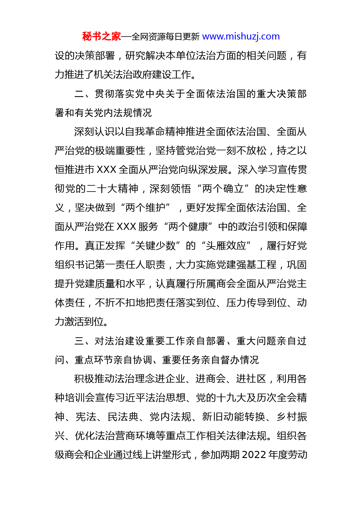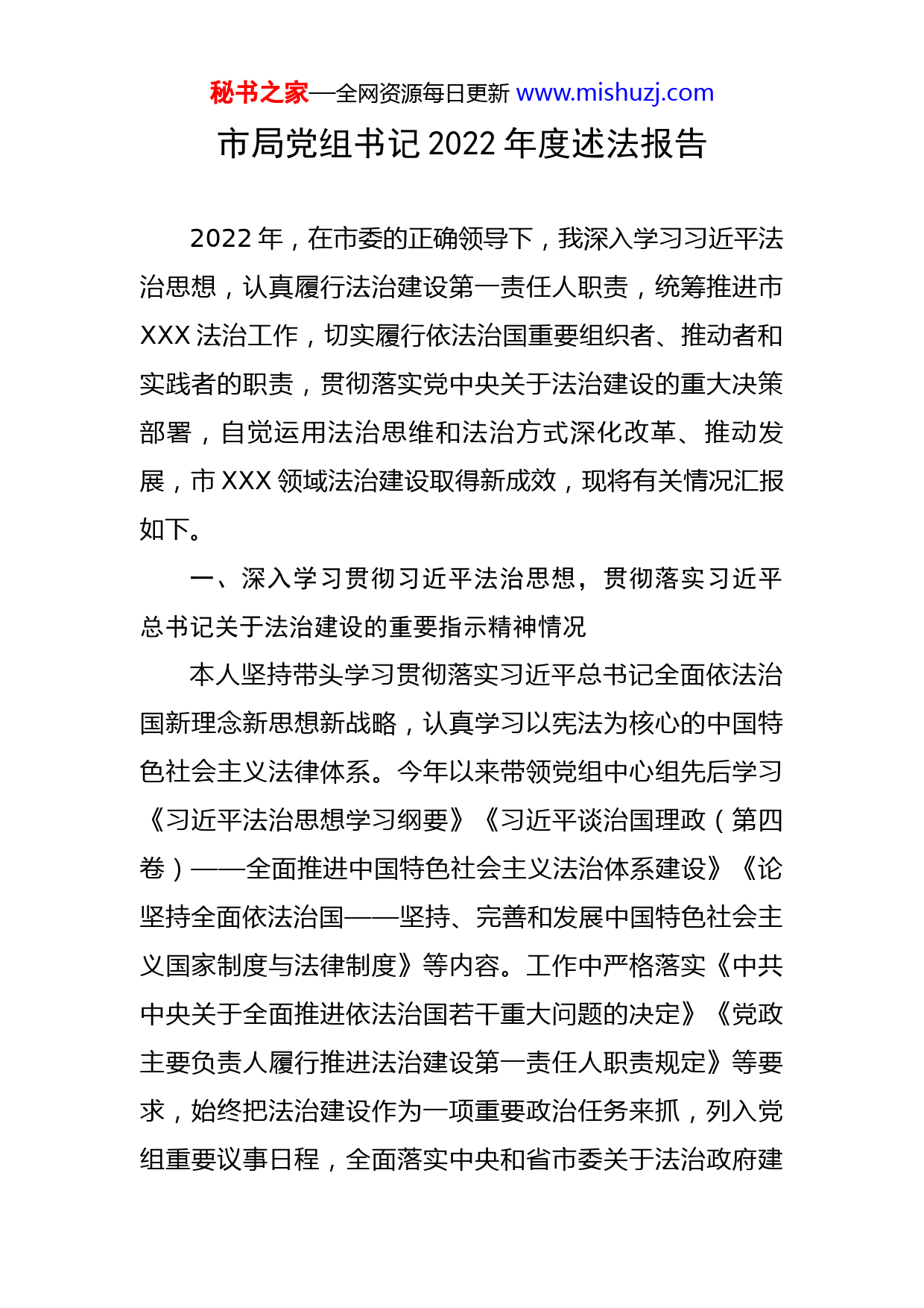 秘书之家—全网资源每日更新www.mishuzj.com市局党组书记2022年度述法报告2022年,在市委的正确领导下,我深入学习习近平法治思想,认真履行法治建设第一责任人职责,统筹推进市XXX法治工作,切实履行依法治国重要组织者、推动者和实践者的职责,贯彻落实党中央关于法治建设的重大决策部署,自觉运用法治思维和法治方式深化改革、推动发展,市XXX领域法治建设取得新成效,现将有关情况汇报如下。一、深入学习贯彻习近平法治思想,贯彻落实习近平总书记关于法治建设的重要指示精神情况本人坚持带头学习贯彻落实习近平总书记全面依法治国新理念新思想新战略,认真学习以宪法为核心的中国特色社会主义法律体系。今年以来带领党组中心组先后学习《习近平法治思想学习纲要》《习近平谈治国理政(第四卷)——全面推进中国特色社会主义法治体系建设》《论坚持全面依法治国——坚持、完善和发展中国特色社会主义国家制度与法律制度》等内容。工作中严格落实《中共中央关于全面推进依法治国若干重大问题的决定》《党政主要负责人履行推进法治建设第一责任人职责规定》等要求,始终把法治建设作为一项重要政治任务来抓,列入党组重要议事日程,全面落实中央和省市委关于法治政府建秘书之家—全网资源每日更新www.mishuzj.com设的决策部署,研究解决本单位法治方面的相关问题,有力推进了机关法治政府建设工作。二、贯彻落实党中央关于全面依法治国的重大决策部署和有关党内法规情况深刻认识以自我革命精神推进全面依法治国、全面从严治党的极端重要性,坚持管党治党一刻不放松,持之以恒推进市XXX全面从严治党向纵深发展。深入学习宣传贯彻党的二十大精神,深刻领悟“两个确立”的决定性意义,坚决做到“两个维护”,更好发挥全面依法治国、全面从严治党在XXX服务“两个健康”中的政治引领和保障作用。真正发挥“关键少数”的“头雁效应”,履行好党组织书记第一责任人职责,大力实施党建强基工程,巩固提升党建质量和水平,认真履行所属商会全面从严治党主体责任,不折不扣地把责任落实到位、压力传导到位、动力激活到位。三、对法治建设重要工作亲自部署、重大问题亲自过问、重点环节亲自协调、重要任务亲自督办情况积极推动法治理念进企业、进商会、进社区,利用各种培训会宣传习近平法治思想、党的十九大及历次全会精神、宪法、民法典、党内法规、新旧动能转换、乡村振兴、优化法治营商环境等重点工作相关法律法规。组织各级商会和企业通过线上讲堂形式,参加两期2022年度劳动秘书之家—全网资源每日更新www.mishuzj.com法进民企暨企业合规用工“云”讲堂活动,促进法惠民企。与市人社局、总工会等部门联合开展劳动人事争议调解工作,调整充实特约调解员队伍,我市劳动人事争议联合调解工作站和XX市商会劳动人事争议调解委员会被认定为全省首批标准化劳动人事争议调解组织。推进执常委失信企业信用修复工作,对省通报的我市4家失信执常委企业进行走访调研,协助对违规失信情况进行整改,推动失信企业积极恢复信用,保证企业健康发展。四、履行《党政主要负责人履行推进法治建设第一责任人职责规定》明确的党委、政府主要负责人职责情况深入宣传党和国家关于全面推进依法治国的重要战略部署,宣传习近平总书记关于法治建设的系列重要论述,引导XXX系统干部和全市民营经济代表人士了解掌握全面依法治国的重大意义。深入法治XXX宣传,增强参与法治XXX建设的主动性和积极性,把弘扬社会主义法治精神作为法治建设的重要内容,教育引导广大民营经济人士养成守法行为习惯,自觉依法办事,树立法治信仰。在XXX机关突出抓好宪法的学习宣传教育,弘扬宪法精神,树立宪法权威。大力宣传我国的根本制度、根本任务、国体、政体、基本政治制度和基本经济制度,进一步增强宪法意识、公民意识、爱国意识、国家安全统一意识和民主法治意识。秘书之家—全网资源每日更新www.mishuzj.com五、严格执行领导干部不得干预司法活动、插手具体案件处理等相关制度,无此类问题。六、市XXX法治建设中的突出问题和整改落实情况一是部分直属商会换届过程中,没有做到依法依规依纪,导致商会内部矛盾加剧、问题频出。下一步,市XXX将深入学习贯彻党的二十大精神,筑法治之基、行法治之力、积法治之势,严格落实《XX省社会团体换届选举工作指引》《XXX市XXX直属商会管理办法》,指导商会严格依法办事,确保换届选举各项工作在法治轨道上运行,为换届选举取得成功提供法治保障。二是法律服务还需进一步加强。下一步,市XXX要继续发挥好法律服务团的作用,组织服务团进商会、进企业,开展法律宣讲、体检等活动。与市人社局、总工会开展劳动人事争议调解工作的同时,开展“和谐同行”企业培育工作,面向企业开展“点对点”培育指导服务。与市司法局对接,依托有关律师事务所,积极推进成立总商会商会调解委员会,并指导各区市XXX和各直属商会成立调解组织,建立健全完善的工作机制。