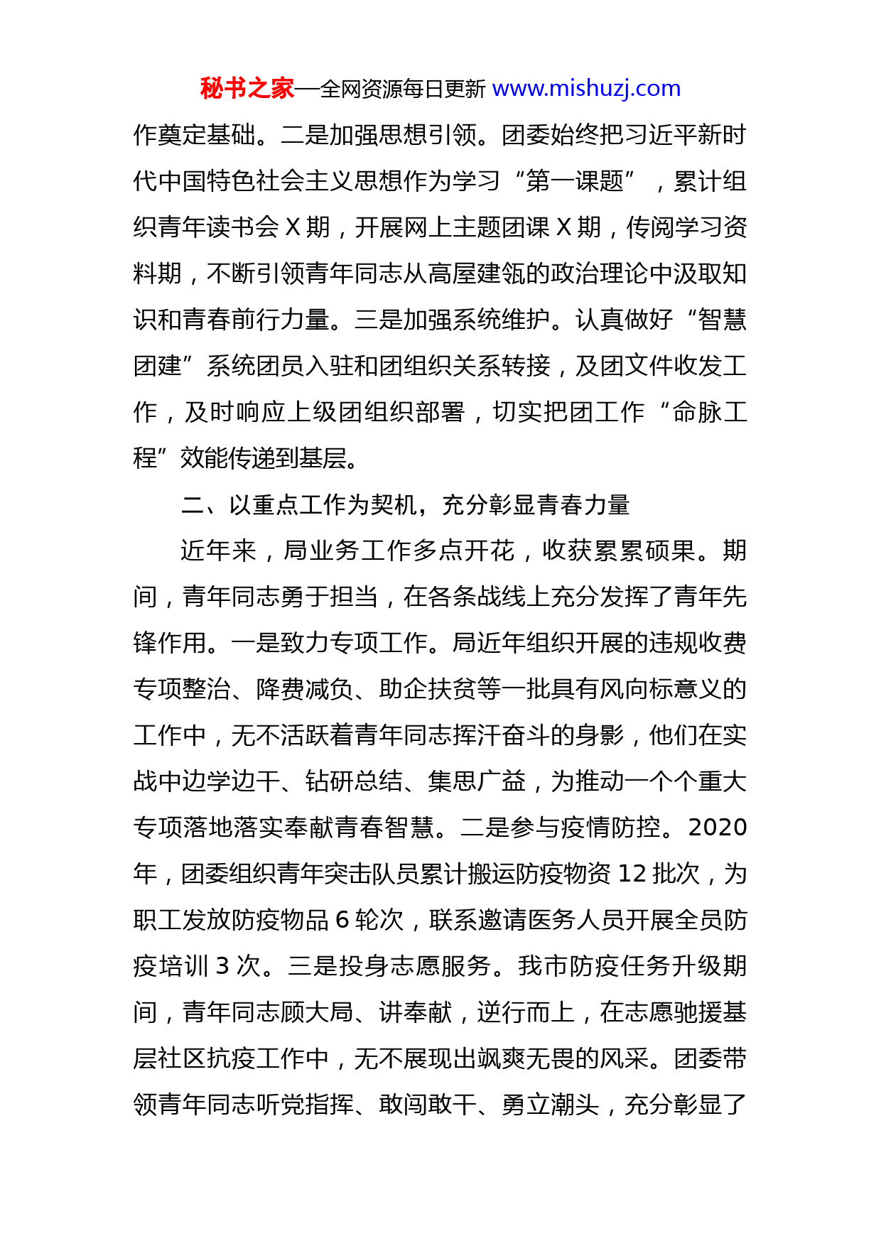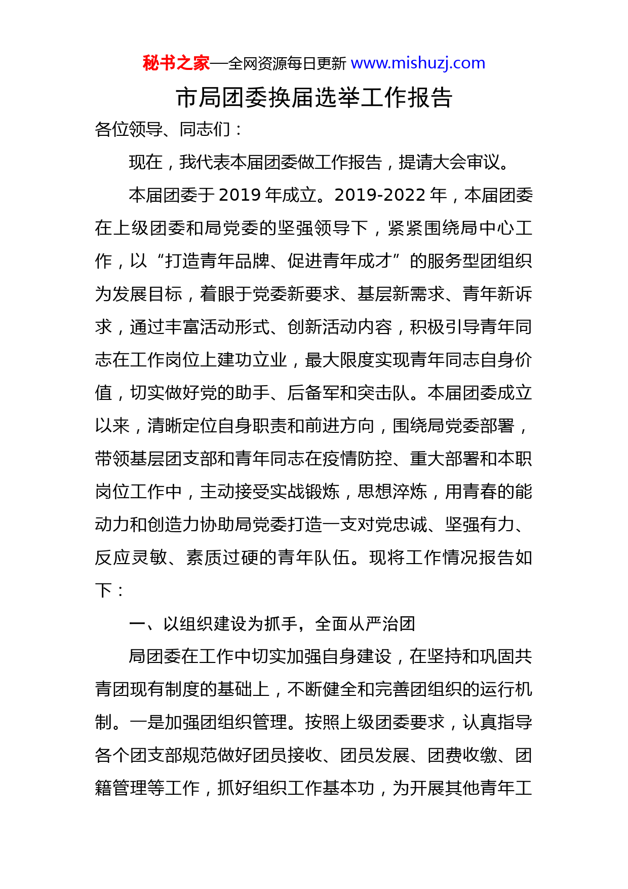 秘书之家—全网资源每日更新www.mishuzj.com市局团委换届选举工作报告各位领导、同志们:现在,我代表本届团委做工作报告,提请大会审议。本届团委于2019年成立。2019-2022年,本届团委在上级团委和局党委的坚强领导下,紧紧围绕局中心工作,以“打造青年品牌、促进青年成才”的服务型团组织为发展目标,着眼于党委新要求、基层新需求、青年新诉求,通过丰富活动形式、创新活动内容,积极引导青年同志在工作岗位上建功立业,最大限度实现青年同志自身价值,切实做好党的助手、后备军和突击队。本届团委成立以来,清晰定位自身职责和前进方向,围绕局党委部署,带领基层团支部和青年同志在疫情防控、重大部署和本职岗位工作中,主动接受实战锻炼,思想淬炼,用青春的能动力和创造力协助局党委打造一支对党忠诚、坚强有力、反应灵敏、素质过硬的青年队伍。现将工作情况报告如下:一、以组织建设为抓手,全面从严治团局团委在工作中切实加强自身建设,在坚持和巩固共青团现有制度的基础上,不断健全和完善团组织的运行机制。一是加强团组织管理。按照上级团委要求,认真指导各个团支部规范做好团员接收、团员发展、团费收缴、团籍管理等工作,抓好组织工作基本功,为开展其他青年工秘书之家—全网资源每日更新www.mishuzj.com作奠定基础。二是加强思想引领。团委始终把习近平新时代中国特色社会主义思想作为学习“第一课题”,累计组织青年读书会X期,开展网上主题团课X期,传阅学习资料期,不断引领青年同志从高屋建瓴的政治理论中汲取知识和青春前行力量。三是加强系统维护。认真做好“智慧团建”系统团员入驻和团组织关系转接,及团文件收发工作,及时响应上级团组织部署,切实把团工作“命脉工程”效能传递到基层。二、以重点工作为契机,充分彰显青春力量近年来,局业务工作多点开花,收获累累硕果。期间,青年同志勇于担当,在各条战线上充分发挥了青年先锋作用。一是致力专项工作。局近年组织开展的违规收费专项整治、降费减负、助企扶贫等一批具有风向标意义的工作中,无不活跃着青年同志挥汗奋斗的身影,他们在实战中边学边干、钻研总结、集思广益,为推动一个个重大专项落地落实奉献青春智慧。二是参与疫情防控。2020年,团委组织青年突击队员累计搬运防疫物资12批次,为职工发放防疫物品6轮次,联系邀请医务人员开展全员防疫培训3次。三是投身志愿服务。我市防疫任务升级期间,青年同志顾大局、讲奉献,逆行而上,在志愿驰援基层社区抗疫工作中,无不展现出飒爽无畏的风采。团委带领青年同志听党指挥、敢闯敢干、勇立潮头,充分彰显了秘书之家—全网资源每日更新www.mishuzj.com局党委的忠实助手和后备军的精神风貌。三、以文体活动为载体,有效增强队伍实力团委立足局青年人才建设,举办系列文体活动,为青年同志身心茁壮成长创造有利条件。2020年4月,隆重举办“礼赞英雄青春逐梦”五四交流活动,邀请3名援鄂医务人员讲述他们在疫情爆发期间逆行武汉、参加抗疫的故事,给青年同志上一堂生动的的思想教育课。2020年5月,组织开展“忠诚建功·实干兴邦”主题座谈会,邀请我局历届岗位标兵分享成长经历和工作感悟,引导青年以只争朝夕的奋斗姿态,撸起袖子加油干。2021年,先后协助举办党史知识竞赛,并主办“学党史、悟思想、守初心、担使命”故事分享会,砥砺青年同志在平凡岗位上,无私无畏,忠诚担当,奋力迸发青春正能量。2022年,先后举办两期青年读书会和突击队员入队仪式,通过满满的仪式感,持续引领青年队伍坚定追随党的脚步,用热血书写无悔的青春篇章。近年来,团委还先后举系列体育比赛、拓展活动,锻炼青年体魄,提升队伍协作意识和整体战斗力。四、以优良传统为纽带,赓续传承红色基因近年来,局团委多次组织青年同志以上门走访慰问、请老同志讲党课等形式,学习他们忠诚奉献、恪尽职守的政治品格。2020年,团委带队先后分X批次走访局离退休秘书之家—全网资源每日更新www.mishuzj.com老干,倾听老同志筚路蓝缕的青春故事,教育青年同志坚定信念、坚守初心、坚毅前行。2021年,按照庆祝建党100周年系列活动部署,组织开展“赓续红色基因,汲取奋进力量”主题宣讲。老同志从不同的角度论述了牢记初心使命,全心全意为人民服务这一主题,使青年同志对党的百年奋斗历史和开展党史学习教育的重大意义有了更为全面深刻的认识。此外,团委还在五四青年节之际,通过观看战斗英雄张富清的英雄事迹,倾听局退休干部讲述入党故事,引导青年同志感悟信仰的力量,筑牢信仰之基。这几年来,在局党委正确带领下,在全体青年齐心努力下,青年队伍收获了丰硕成果,取得了骄人成绩。集体层面,局团委荣获“2021年度优秀团委”荣誉,X个青年集体荣获市级“青年文明号”称号。个人层面,先后X人次获评优秀党员,X人次年度被评为“先进个人”,X人获得“岗位标兵”称号。这几年,团委工作可以说取得了一定成绩,但认真审视当前工作发展形势和青年队伍形势,抓好青年工作的重要性和迫切性日益彰显。如何进一步增强青年队伍凝聚力、向心力,如何持续改进青年人才培养机制,如何提升青年同志集体荣誉感和事业认同感方面,还不能满足局党委对青年同志的新期望、新要求。我们希望下一届团委,继