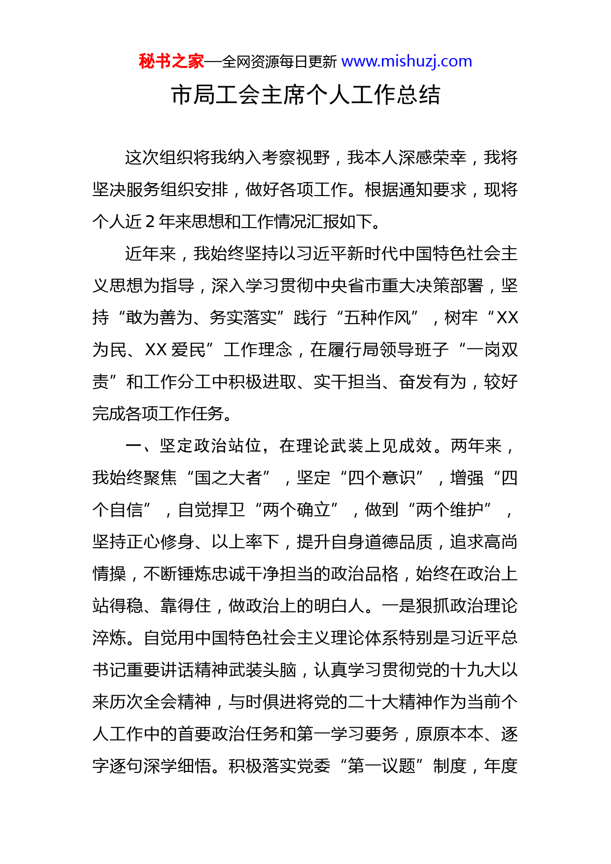 秘书之家—全网资源每日更新www.mishuzj.com市局工会主席个人工作总结这次组织将我纳入考察视野,我本人深感荣幸,我将坚决服务组织安排,做好各项工作。根据通知要求,现将个人近2年来思想和工作情况汇报如下。近年来,我始终坚持以习近平新时代中国特色社会主义思想为指导,深入学习贯彻中央省市重大决策部署,坚持“敢为善为、务实落实”践行“五种作风”,树牢“XX为民、XX爱民”工作理念,在履行局领导班子“一岗双责”和工作分工中积极进取、实干担当、奋发有为,较好完成各项工作任务。一、坚定政治站位,在理论武装上见成效。两年来,我始终聚焦“国之大者”,坚定“四个意识”,增强“四个自信”,自觉捍卫“两个确立”,做到“两个维护”,坚持正心修身、以上率下,提升自身道德品质,追求高尚情操,不断锤炼忠诚干净担当的政治品格,始终在政治上站得稳、靠得住,做政治上的明白人。一是狠抓政治理论淬炼。自觉用中国特色社会主义理论体系特别是习近平总书记重要讲话精神武装头脑,认真学习贯彻党的十九大以来历次全会精神,与时俱进将党的二十大精神作为当前个人工作中的首要政治任务和第一学习要务,原原本本、逐字逐句深学细悟。积极落实党委“第一议题”制度,年度秘书之家—全网资源每日更新www.mishuzj.com参加局党委中心组学习XX次,参与讨论发言XX次,提交读书调研报告和调研报告XX篇,上党课XX次,积极参与集体参观XX旧址并重温入党誓词,参加“两优一先”评选表彰,个人党性修养不断提升。二是狠抓政治品格锤炼。坚持以实际行动践行伟大建党精神,始终牢记自己的第一身份是共产党员,在处理关键问题时,在面临关键抉择时,正确认识“小我”与“大我”,不断增强自觉服从大局、服务大局的行动自觉,全力确保各项工作任务圆满完成。带头推动“五种风气”建设,先后参与开展“XX政策顾问”走基层活动、大走访、大调研、大解决、大落实活动、“两学两践”弘扬孺子牛精神活动,深入基层接地气、访民需、解民忧,走访并结对困难家庭,解决群众“急难愁盼”。三是狠抓政治斗争历练。始终带头践行民主集中决策机制,严格遵守局党委决策、权力运行、机关运转、“三重一大”、办文办事、财务管理等方面的管理制度。全面落实意识形态工作“一岗双责”责任,有针对性弥补意识形态领域的精神软肋、知识弱项、能力短板和经验盲区,旗帜鲜明、敢于发声,积极同不良网络舆论作斗争,推动全局意识形态工作积极有效开展。二、坚持率先垂范,在实干担当上见成效近两年,从职责分工上,除履行局领导班子成员“一岗双责”职责,我主要协助负责工会、档案管理和提案建秘书之家—全网资源每日更新www.mishuzj.com议办理等工作。(一)突出用心用情,提高工会服务温馨度。一是打造规范型工会。加强工会自身规范化建设,组织开展工会委员会、经费审查委员会增补选举工作,调整、充实工会干部队伍,进一步提高工会干部的业务素质。机构改革后及时指导XX家局属单位工会完成换届选举工作。建立健全工会工作制度,结合XX工作实际,严格执行各项财务制度,管好、用好工会经费,使工会经费真正用在为职工提供福利和工会建设上,确保机关工会工作规范、健康、高效运行。二是打造学习型工会。切实抓好职工的思想教育,组织基层工会干部认真学习《工会法》、《劳动合同法》,采取多种形式开展整治教育,先后组织工会会员进行习近平总书记重要讲话精神、十九届六中全会精神、XX业务知识等专题学习教育XX场次,同时推荐工会干部参加市级机关工会干部能力素质提升研修班和工会财务管理培训班,进一步提升干部职工的理论和业务素质。三是打造服务型工会。保障工会经费,提高职工基本福利,机关每名职工在生日时都会收到生日蛋糕券,此外在规范范围内保障一人一年1800元的工会福利,在春节、端午、中秋、冬至等重要节日给大家发放,并且确保符合要求,不违规不超标不浪费。坚持定期组织职工进行体检,使职工能及时了解自己的健康状况,保障职工的身体健康。开展走访秘书之家—全网资源每日更新www.mishuzj.com慰问全国、省、市劳模活动XX人次,看望慰问局属单位困难职工家庭,为困难劳模和职工家庭送去救助金及慰问物品。先后联合局属单位工作组织开展“暖冬行动”、“梦想夏令营”一对一牵手关爱集中服务日等一系列活动,发动工会职工在围绕聚焦社会民生、投身志愿工作、引领文明新风等中心工作中集思广益、献计献策。积极开展送温暖活动,逢职工生病住院、家庭发生重大事项等,及时按规定标准,把组织的关怀、温暖送到他们身边,同时不忘开展退休职工关爱工作,对离退休老同志表示关怀和问候并带去节日慰问品,进一步了解退休职工的所想、所需。四是打造聚力型工会。为丰富职工生活,营造更好的工作氛围,年初工会即制定了较为详细的全年活动计划,结合机关职工人少,年轻人多的特点,充分利用XX社会组织联系广泛的优势,与节日主题相结合,积极开展如趣味运动会、迎春晚会、闹元宵、包饺子等形式多样的工会活动,活跃机关气氛,展示机关团结一心、奋发向上的精神风貌。(二)突出精细规范,提高档案管理质效度。深入贯彻执行《档案法》,建立健全了档案管理制度,如《档案保管制度》《档案保