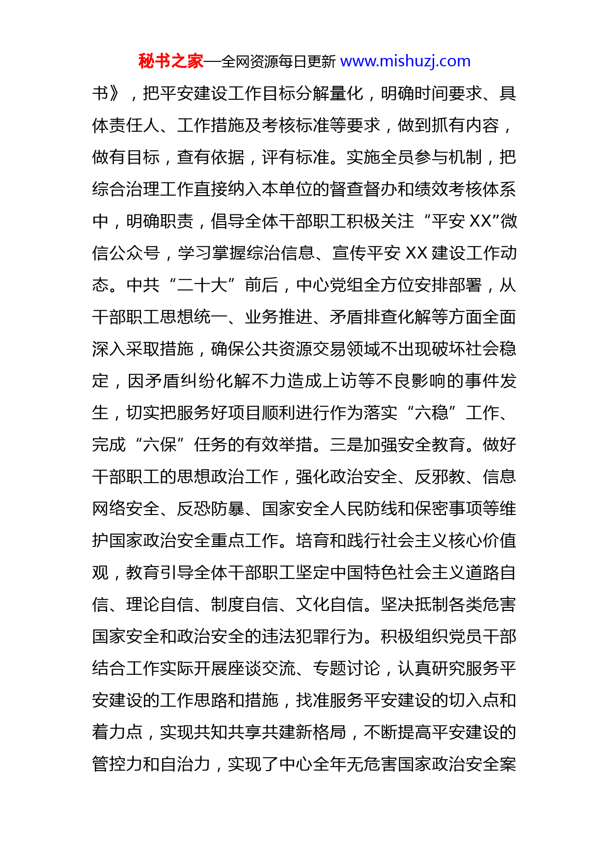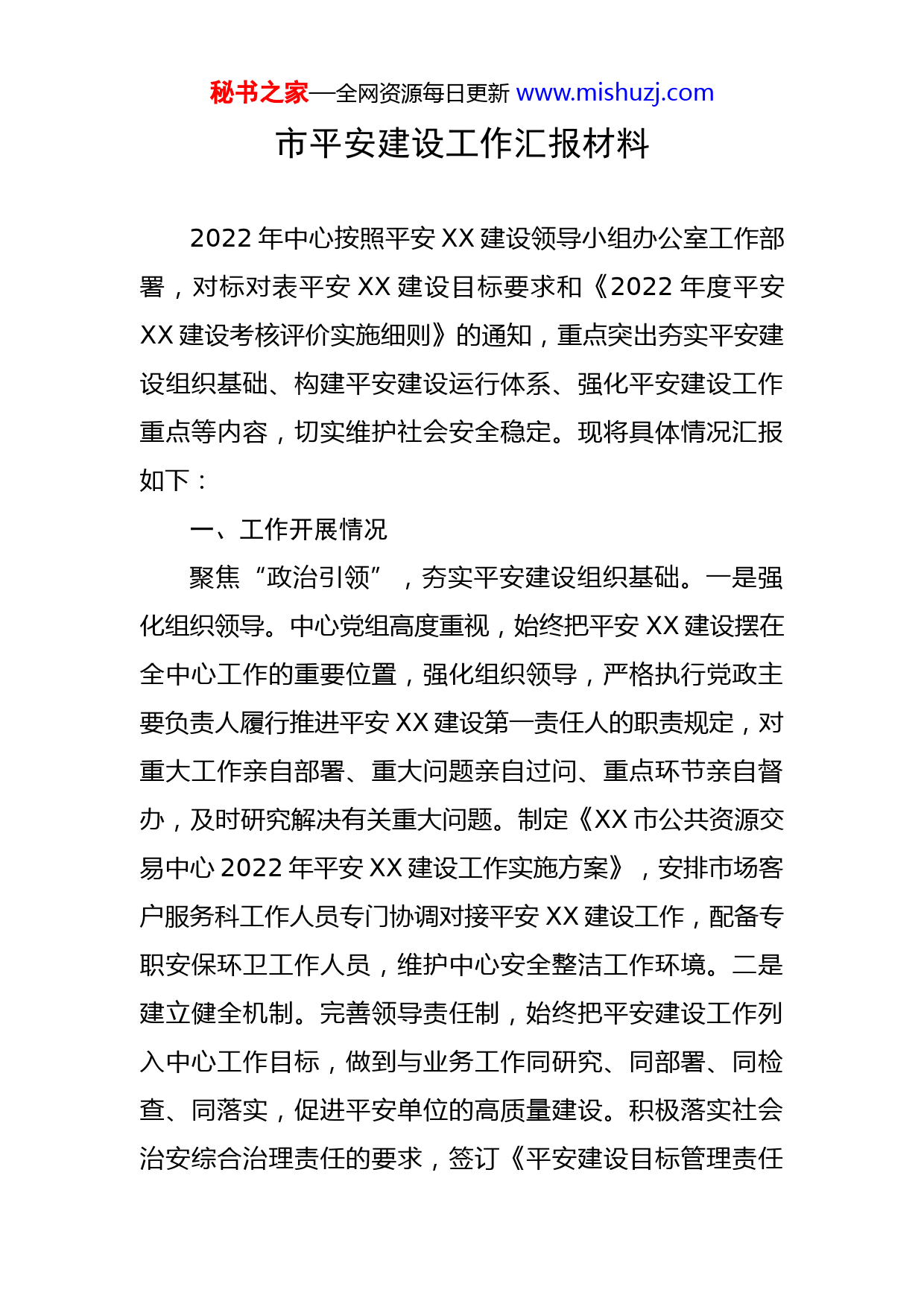 秘书之家—全网资源每日更新www.mishuzj.com市平安建设工作汇报材料2022年中心按照平安XX建设领导小组办公室工作部署,对标对表平安XX建设目标要求和《2022年度平安XX建设考核评价实施细则》的通知,重点突出夯实平安建设组织基础、构建平安建设运行体系、强化平安建设工作重点等内容,切实维护社会安全稳定。现将具体情况汇报如下:一、工作开展情况聚焦“政治引领”,夯实平安建设组织基础。一是强化组织领导。中心党组高度重视,始终把平安XX建设摆在全中心工作的重要位置,强化组织领导,严格执行党政主要负责人履行推进平安XX建设第一责任人的职责规定,对重大工作亲自部署、重大问题亲自过问、重点环节亲自督办,及时研究解决有关重大问题。制定《XX市公共资源交易中心2022年平安XX建设工作实施方案》,安排市场客户服务科工作人员专门协调对接平安XX建设工作,配备专职安保环卫工作人员,维护中心安全整洁工作环境。二是建立健全机制。完善领导责任制,始终把平安建设工作列入中心工作目标,做到与业务工作同研究、同部署、同检查、同落实,促进平安单位的高质量建设。积极落实社会治安综合治理责任的要求,签订《平安建设目标管理责任秘书之家—全网资源每日更新www.mishuzj.com书》,把平安建设工作目标分解量化,明确时间要求、具体责任人、工作措施及考核标准等要求,做到抓有内容,做有目标,查有依据,评有标准。实施全员参与机制,把综合治理工作直接纳入本单位的督查督办和绩效考核体系中,明确职责,倡导全体干部职工积极关注“平安XX”微信公众号,学习掌握综治信息、宣传平安XX建设工作动态。中共“二十大”前后,中心党组全方位安排部署,从干部职工思想统一、业务推进、矛盾排查化解等方面全面深入采取措施,确保公共资源交易领域不出现破坏社会稳定,因矛盾纠纷化解不力造成上访等不良影响的事件发生,切实把服务好项目顺利进行作为落实“六稳”工作、完成“六保”任务的有效举措。三是加强安全教育。做好干部职工的思想政治工作,强化政治安全、反邪教、信息网络安全、反恐防暴、国家安全人民防线和保密事项等维护国家政治安全重点工作。培育和践行社会主义核心价值观,教育引导全体干部职工坚定中国特色社会主义道路自信、理论自信、制度自信、文化自信。坚决抵制各类危害国家安全和政治安全的违法犯罪行为。积极组织党员干部结合工作实际开展座谈交流、专题讨论,认真研究服务平安建设的工作思路和措施,找准服务平安建设的切入点和着力点,实现共知共享共建新格局,不断提高平安建设的管控力和自治力,实现了中心全年无危害国家政治安全案秘书之家—全网资源每日更新www.mishuzj.com件发生的基本目标。同时坚持对干部职工进行个人信息自我保护教育提醒,定期传达电信诈骗形势,讲解反诈典型案例,防止电信诈骗和非法集资等金融案件发生。平安建设工作取得了丰硕成果,实现了全年无刑事案件、无治安案件、无职工犯罪、无重大灾害事故发生的“四无”目标。聚焦“中心主业”,维护市场主体安全。中心紧盯全市高质量发展和项目建设需要,聚焦服务市场主体,维护市场主体安全,提高市场主体满意度。一是健全业务办理规范平安的工作机制。积极配合扫黑办、公安机关,纪检监察机关认真开展线索核查和证据资料收集工作,共调取各类资料X次,项目X宗。建立健全安全检查制度和保安巡逻制度,安排专门科室工作人员对场内办公设备及水电暖设施进行巡检,严格落实“防火、防盗、防破坏、防事故”的防范措施,坚持每月对消防器材检视检修,按期更换,坚决杜绝发生安全事故。在各公共区域无死角、无盲区、全覆盖安装音视频监控,信息技术科实时对中心网站各类信息依法进行管控,确保信息网络安全和网络舆情有效应对处置,中心从未发生过一起失盗失窃和信息网络安全案件。确立保密工作人员和档案管理人员,落实落细各项保密措施,从未发生过重大泄密案件和档案丢失案件。二是全力克服疫情影响,保障市场主体安全,助力复工复秘书之家—全网资源每日更新www.mishuzj.com产。推行项目进场“网上办”。线上受理各类招标(采购)公告、公示发布业务,全天候正常受理项目交易服务。对重点项目和重点企业实行包抓工作机制,为省市列重点项目、民生项目及涉农采购等时令性项目开辟绿色通道。推行线上开标“网上见”。始终把优化营商环境作为公共资源交易的“生命线工程”,探索建立“不见面开标”系统,有效解决市场主体参与投标成本高难题。拓展“网上竞价”系统,实现以全流程电子化方式完成土地招拍挂项目摘牌交易。推行项目评标“网上联”。建立公共资源交易一体化协调调度机制,在各县区设立远程异地评标室,县区专家就近评标。通过强化区域合作,拓展远程异地评标适用地域,全面实现“线上开、异地评”,开启优质专家资源共享共用、平台资源优势互补的交易新常态。“不见面网上开标”和远程异地评标做法得到了社会各界的广泛关注和赞誉,2021年中心被评为“全国助力复工复产先进单位”,2022年在中国公共资源交易跨区域合作联盟组织的第三方评价中被评为“2021-2022年度公共资源交易XXXX奖”,并在今年年初全省经济调度会议中荣获省长点赞。三是