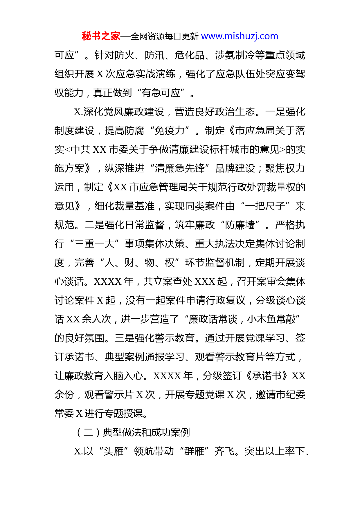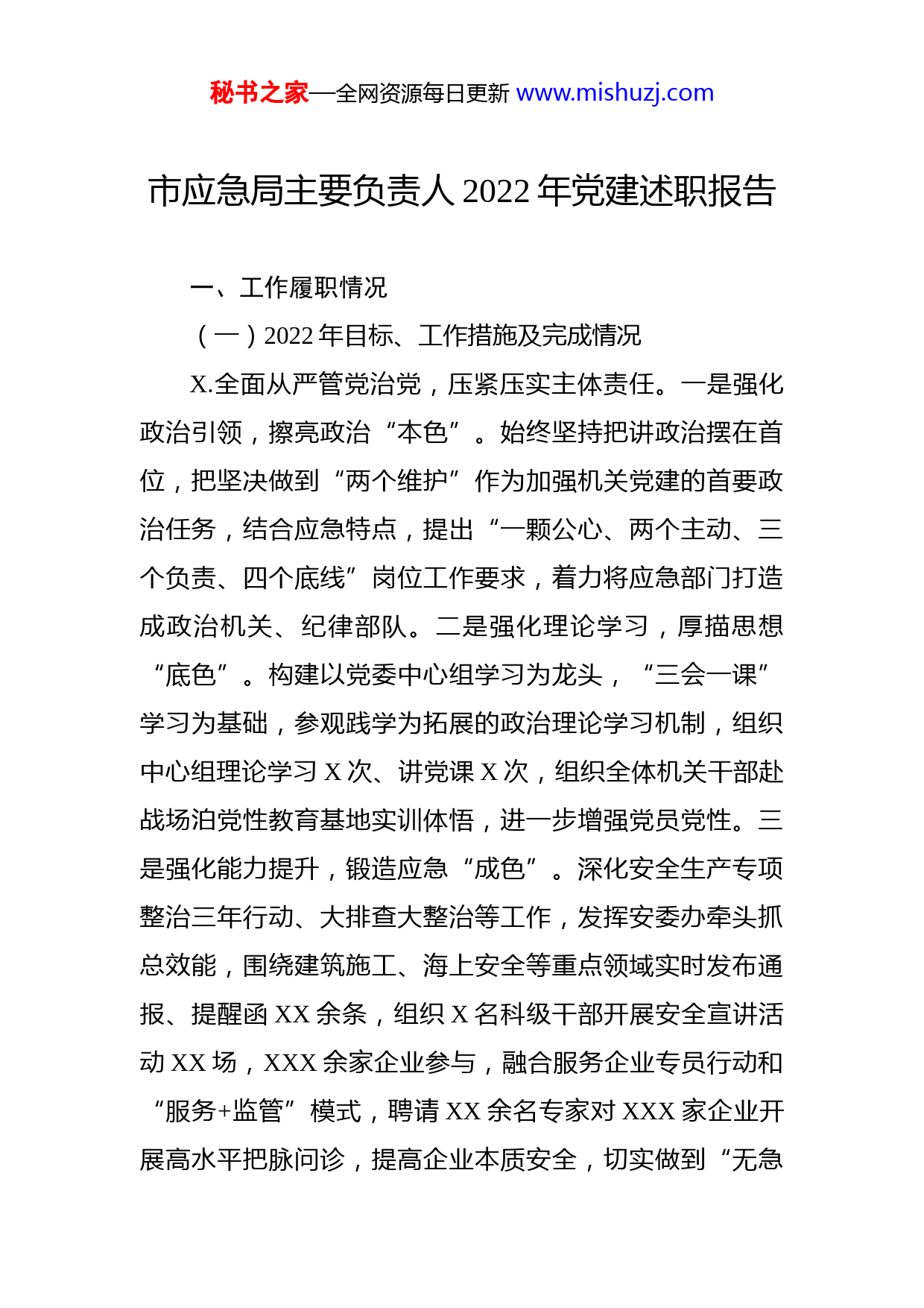 秘书之家—全网资源每日更新www.mishuzj.com市应急局主要负责人2022年党建述职报告一、工作履职情况(一)2022年目标、工作措施及完成情况X.全面从严管党治党,压紧压实主体责任。一是强化政治引领,擦亮政治“本色”。始终坚持把讲政治摆在首位,把坚决做到“两个维护”作为加强机关党建的首要政治任务,结合应急特点,提出“一颗公心、两个主动、三个负责、四个底线”岗位工作要求,着力将应急部门打造成政治机关、纪律部队。二是强化理论学习,厚描思想“底色”。构建以党委中心组学习为龙头,“三会一课”学习为基础,参观践学为拓展的政治理论学习机制,组织中心组理论学习X次、讲党课X次,组织全体机关干部赴战场泊党性教育基地实训体悟,进一步增强党员党性。三是强化能力提升,锻造应急“成色”。深化安全生产专项整治三年行动、大排查大整治等工作,发挥安委办牵头抓总效能,围绕建筑施工、海上安全等重点领域实时发布通报、提醒函XX余条,组织X名科级干部开展安全宣讲活动XX场,XXX余家企业参与,融合服务企业专员行动和“服务+监管”模式,聘请XX余名专家对XXX家企业开展高水平把脉问诊,提高企业本质安全,切实做到“无急秘书之家—全网资源每日更新www.mishuzj.com可应”。针对防火、防汛、危化品、涉氨制冷等重点领域组织开展X次应急实战演练,强化了应急队伍处突应变驾驭能力,真正做到“有急可应”。X.深化党风廉政建设,营造良好政治生态。一是强化制度建设,提高防腐“免疫力”。制定《市应急局关于落实<中共XX市委关于争做清廉建设标杆城市的意见>的实施方案》,纵深推进“清廉急先锋”品牌建设;聚焦权力运用,制定《XX市应急管理局关于规范行政处罚裁量权的意见》,细化裁量基准,实现同类案件由“一把尺子”来规范。二是强化日常监督,筑牢廉政“防廉墙”。严格执行“三重一大”事项集体决策、重大执法决定集体讨论制度,完善“人、财、物、权”环节监督机制,定期开展谈心谈话。XXXX年,共立案查处XXX起,召开案审会集体讨论案件X起,没有一起案件申请行政复议,分级谈心谈话XX余人次,进一步营造了“廉政话常谈,小木鱼常敲”的良好氛围。三是强化警示教育。通过开展党课学习、签订承诺书、典型案例通报学习、观看警示教育片等方式,让廉政教育入脑入心。XXXX年,分级签订《承诺书》XX余份,观看警示片X次,开展专题党课X次,邀请市纪委常委X进行专题授课。(二)典型做法和成功案例X.以“头雁”领航带动“群雁”齐飞。突出以上率下、秘书之家—全网资源每日更新www.mishuzj.com靠前指挥,结合应急实际,制定“三雁工程”实施意见,着力打造“头雁领航、强雁奋飞、雏雁争鸣”的应急格局发挥“领头雁”作用,率领X名科级干部包保镇区街道常态化下沉基层落实“三个一”,XX名中层干部组建服务企业专员队伍包保重点企业着重落实“六个一”,XX名党员干部加入基层安全生产微信群实时发布安全信息XXX余条。强化“群雁”培育,实行“师徒帮带”育人模式,开设“科长讲堂”上台述学,倒逼年轻干部勤学奋进、知难而进,XXXX年荣获XX市“干事创业好班子”称号。X.以“党建红”引领打造“应急蓝”亮色。立足职责使命,找准结合点,统筹“党建+作风改进+业务”三位一体融合推进,打通安全宣传“最后一公里”。发挥党员示范带头效用,以“安全生产月”为契机,组织XXXX余人次集中开展“安全宣传咨询日”、“安全之星”评选、“金海杯”知识竞赛、“八抓XX项”知识考试等系列活动,推动安全发展理念走心走深走实,应急局获评XX省安全生产月优秀组织单位。(三)年初述职点评问题整改情况认真履行市委巡察反馈意见整改政治责任,针对年初述职自查和上级点评问题,X项问题已经全部整改完成。二、存在的问题(一)研究新时期党建工作不够深入。平时将精力主秘书之家—全网资源每日更新www.mishuzj.com要放在抓业务上,面对新形势对党建工作的新要求,真正静下心来分析党员队伍现状、谋划加强党组织建设、开展多样化党员活动投入的精力不足,更多是浮于表面,过于依赖基层党建部署安排,主动谋划少、被动作为多。在对党支部的地位和应如何发挥作用、怎样发挥作用上,缺乏全面的了解和重视;在学习党建新理论、新知识上不经常不深入、不系统;在开展机关活动上,自己没有积极开动脑筋、灵活机动地解决困难,活动缺少创新;在推动应急管理工作与党建工作融合上,理论联系实际、创造性开展工作能力有待于进一步加强,导致党建带动工作成效不十分显著。表现在一是个别党员干部认为业务工作是“硬指标”,党建工作是“软指标”,开展组织活动要尽量给业务工作让路,党建工作无法摆上应有的位置,抓党建成为被动应付。二是个别党员干部无法发挥模范先锋作用,将自己混同于一般群众,缺乏比群众多学一点、多会一点、多干一点的创先争优意识,仅停留在工作八小时内的业务工作,主动学习党的理论知识意识不强。(二)党支部开展活动效果不明显。首先,虽定期组织开展多样化学习教育活动,但对学习成效的检验还不够到位,存在学过了、读过了、要求提了,但跟踪问效少的问题。主题活动质量还不够高,虽每月都开展主题党日活动,但多数是学习指定内容、收缴党费、过政治生日等为秘书之家—全网资源每日