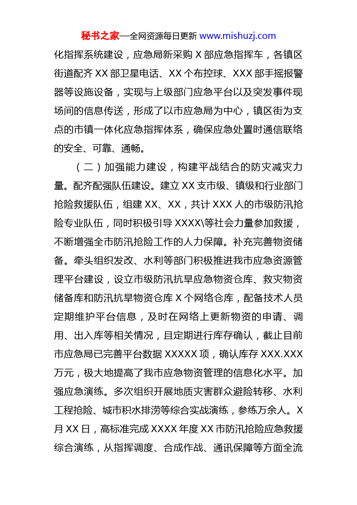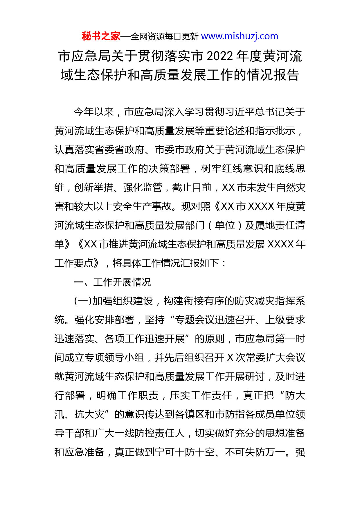 秘书之家—全网资源每日更新www.mishuzj.com市应急局关于贯彻落实市2022年度黄河流域生态保护和高质量发展工作的情况报告今年以来,市应急局深入学习贯彻习近平总书记关于黄河流域生态保护和高质量发展等重要论述和指示批示,认真落实省委省政府、市委市政府关于黄河流域生态保护和高质量发展工作的决策部署,树牢红线意识和底线思维,创新举措、强化监管,截止目前,XX市未发生自然灾害和较大以上安全生产事故。现对照《XX市XXXX年度黄河流域生态保护和高质量发展部门(单位)及属地责任清单》《XX市推进黄河流域生态保护和高质量发展XXXX年工作要点》,将具体工作情况汇报如下:一、工作开展情况(一)加强组织建设,构建衔接有序的防灾减灾指挥系统。强化安排部署,坚持“专题会议迅速召开、上级要求迅速落实、各项工作迅速开展”的原则,市应急局第一时间成立专项领导小组,并先后组织召开X次常委扩大会议就黄河流域生态保护和高质量发展工作开展研讨,及时进行部署,明确工作职责,压实工作责任,真正把“防大汛、抗大灾”的意识传达到各镇区和市防指各成员单位领导干部和广大一线防控责任人,切实做好充分的思想准备和应急准备,真正做到宁可十防十空、不可失防万一。强秘书之家—全网资源每日更新www.mishuzj.com化指挥系统建设,应急局新采购X部应急指挥车,各镇区街道配齐XX部卫星电话、XX个布控球、XXX部手摇报警器等设施设备,实现与上级部门应急平台以及突发事件现场间的信息传送,形成了以市应急局为中心,镇区街为支点的市镇一体化应急指挥体系,确保应急处置时通信联络的安全、可靠、通畅。(二)加强能力建设,构建平战结合的防灾减灾力量。配齐配强队伍建设。建立XX支市级、镇级和行业部门抢险救援队伍,组建XX、XX,共计XXX人的市级防汛抢险专业队伍,同时积极引导XXXX\等社会力量参加救援,不断增强全市防汛抢险工作的人力保障。补充完善物资储备。牵头组织发改、水利等部门积极推进我市应急资源管理平台建设,设立市级防汛抗旱应急物资仓库、救灾物资储备库和防汛抗旱物资仓库X个网络仓库,配备技术人员定期维护平台信息,及时在网络上更新物资的申请、调用、出入库等相关情况,且定期进行库存确认,截止目前市应急局已完善平台数据XXXXX项,确认库存XXX.XXX万元,极大地提高了我市应急物资管理的信息化水平。加强应急演练。多次组织开展地质灾害群众避险转移、水利工程抢险、城市积水排涝等综合实战演练,参练万余人。X月XX日,高标准完成XXXX年度XX市防汛抢险应急救援综合演练,从指挥调度、合成作战、通讯保障等方面全流秘书之家—全网资源每日更新www.mishuzj.com程展示了XX防汛抢险应急处置工作成效,获XX市级领导高度评价。(三)加强风险管控,构建科学完善的防灾减灾保障体系。加强体制机制建设,按照国家和省市工作要求,成立第一次全国自然灾害综合风险普查领导小组,制定印发了《XX市第一次全国自然灾害综合风险普查领导小组办公室、工作组职责及人员组成》《XX市第一次全国自然灾害综合风险普查总体方案》等文件,充分发挥普查领导小组综合协调作用,组织召开自然灾害综合普查工作会议XX余次,部署开展灾害普查清查、核查、经费测算等各项工作,全市XX余个部门、XX个镇区街道各司其职、各负其责,及时完成了XXXX条调查数据的国家普查系统录入工作,差错率仅为X.XX%,预计将于今年年底完成涉及的XX个部门的数据汇总工作,全面摸清我市自然灾害风险底数,绘制出全市自然灾害风险“一张图”,为我市将要开展的风险隐患治理打下坚实基础。加强风险管理和隐患排查,自上而下构建市、镇、村(社区)三级风险管理和隐患排查治理体系,建立了覆盖市、镇、村(社区)的共计XXX人的三级自然灾害报灾信息员队伍,各级报灾员均开通了手机自然灾害报灾“一键通”,建立了自然灾害报灾应急联动机制,有效打通防灾减灾应急管理的“最后一公里”。根据《XX市XXXX年防汛网格化管控人员明细表》秘书之家—全网资源每日更新www.mishuzj.com组织各部门、单位对各自责任点进行了全面排查,对全市水库、头顶库等XXXX余处风险隐患点进行了全面排查,截至目前,整改问题隐患XXX条。二、存在问题及原因分析半年来,虽然市应急局在黄河流域生态保护和高质量发展工作中取得显著成就,但与当前经济社会发展越来越高的防汛应急处置要求仍有一定差距,应急管理机制、应急抢险救援队伍和应急抢险物资储备体系等仍不完善,主要存在以下几方面问题:一是麻痹松懈思想时有抬头。部分人员对防汛减灾工作并没有深刻的感受,相对于安全生产周周部署、周周落实的重视程度,防汛减灾抓落实方面依然存在不均衡、不全面的问题,汛期形势严峻时,可以将防汛减灾工作摆在突出的位置重点抓,过了汛期则存有麻痹懈怠心理,未能实现一以贯之,全市上下尚未树立安全生产、防灾减灾与经济发展统筹规划的大局意识。二是基层应急能力建设滞后。突发公共事件往往带有连带性和叠加性,各种风险常常发生耦合,需要社会各方力量相互配合、相互支持,我市目前现有的各类应急救援力量分散于各个行业和部门,虽然各个镇区街道都已设立应急办,但无法实现基层防汛减灾的常态预警和部署预防,缺乏统一调度指挥各类应急救
