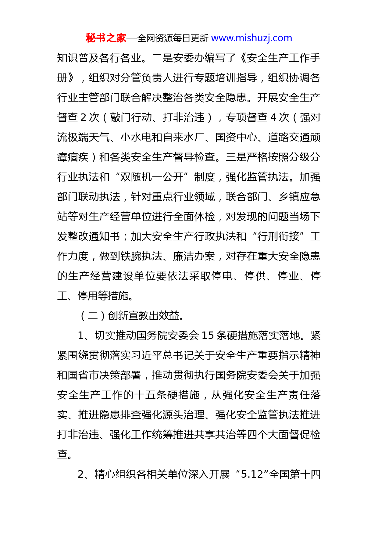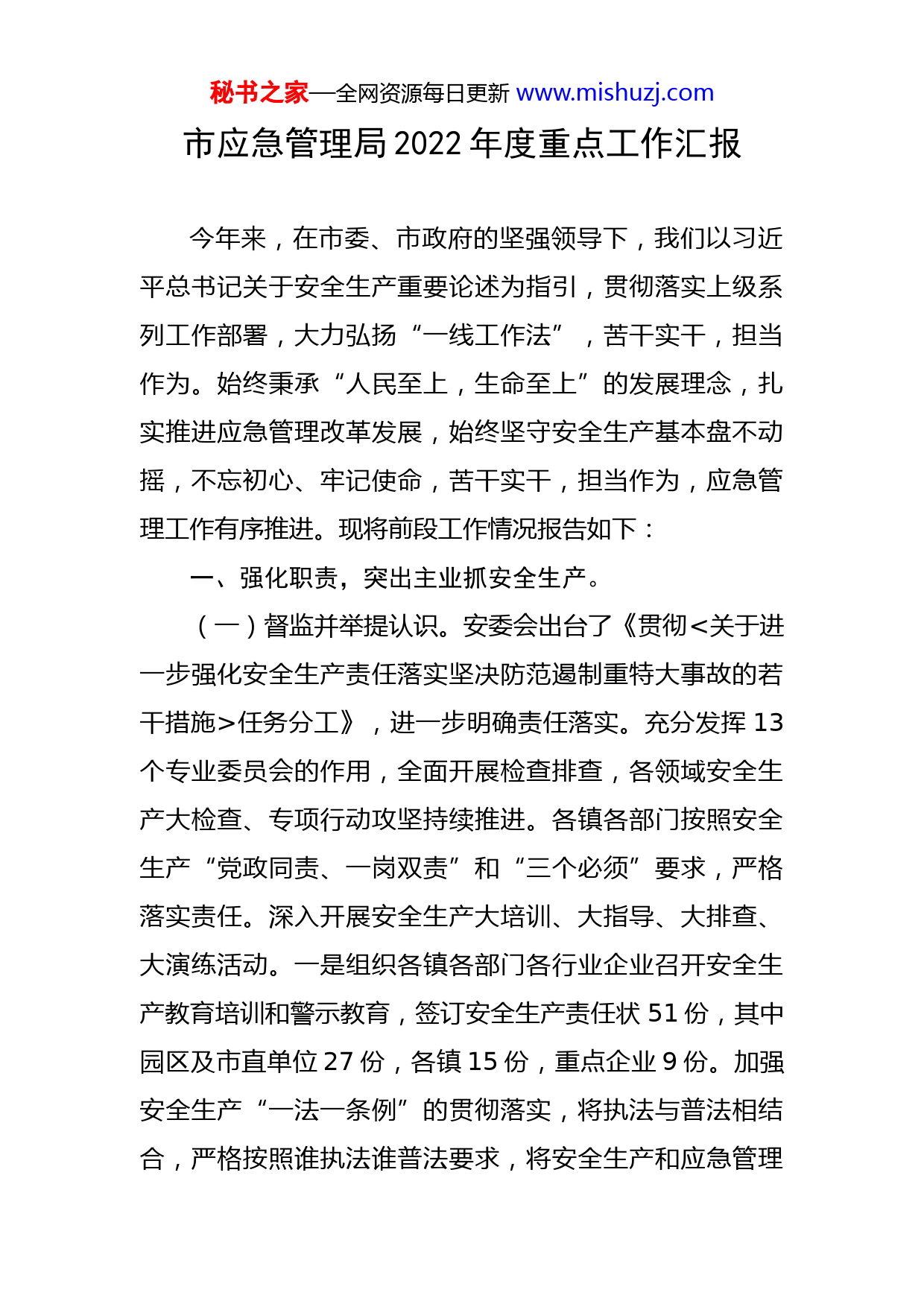 秘书之家—全网资源每日更新www.mishuzj.com市应急管理局2022年度重点工作汇报今年来,在市委、市政府的坚强领导下,我们以习近平总书记关于安全生产重要论述为指引,贯彻落实上级系列工作部署,大力弘扬“一线工作法”,苦干实干,担当作为。始终秉承“人民至上,生命至上”的发展理念,扎实推进应急管理改革发展,始终坚守安全生产基本盘不动摇,不忘初心、牢记使命,苦干实干,担当作为,应急管理工作有序推进。现将前段工作情况报告如下:一、强化职责,突出主业抓安全生产。(一)督监并举提认识。安委会出台了《贯彻<关于进一步强化安全生产责任落实坚决防范遏制重特大事故的若干措施>任务分工》,进一步明确责任落实。充分发挥13个专业委员会的作用,全面开展检查排查,各领域安全生产大检查、专项行动攻坚持续推进。各镇各部门按照安全生产“党政同责、一岗双责”和“三个必须”要求,严格落实责任。深入开展安全生产大培训、大指导、大排查、大演练活动。一是组织各镇各部门各行业企业召开安全生产教育培训和警示教育,签订安全生产责任状51份,其中园区及市直单位27份,各镇15份,重点企业9份。加强安全生产“一法一条例”的贯彻落实,将执法与普法相结合,严格按照谁执法谁普法要求,将安全生产和应急管理秘书之家—全网资源每日更新www.mishuzj.com知识普及各行各业。二是安委办编写了《安全生产工作手册》,组织对分管负责人进行专题培训指导,组织协调各行业主管部门联合解决整治各类安全隐患。开展安全生产督查2次(敲门行动、打非治违),专项督查4次(强对流极端天气、小水电和自来水厂、国资中心、道路交通顽瘴痼疾)和各类安全生产督导检查。三是严格按照分级分行业执法和“双随机一公开”制度,强化监管执法。加强部门联动执法,针对重点行业领域,联合部门、乡镇应急站等对生产经营单位进行全面体检,对发现的问题当场下发整改通知书;加大安全生产行政执法和“行刑衔接”工作力度,做到铁腕执法、廉洁办案,对存在重大安全隐患的生产经营建设单位要依法采取停电、停供、停业、停工、停用等措施。(二)创新宣教出效益。1、切实推动国务院安委会15条硬措施落实落地。紧紧围绕贯彻落实习近平总书记关于安全生产重要指示精神和国省市决策部署,推动贯彻执行国务院安委会关于加强安全生产工作的十五条硬措施,从强化安全生产责任落实、推进隐患排查强化源头治理、强化安全监管执法推进打非治违、强化工作统筹推进共享共治等四个大面督促检查。2、精心组织各相关单位深入开展“5.12”全国第十四秘书之家—全网资源每日更新www.mishuzj.com个防灾减灾日宣传、“安全生产月”宣传教育等活动,通过设置展板、悬挂横幅、发放资料、播放警示教育片、开展现场咨询等多种形式,努力营造社会关注安全、重视安全的良好舆论氛围。在5.12全国防灾减灾日宣传活动中,我局联合白塘镇,白塘学习、白塘妇联以及白塘镇团委,在白塘小学开展防灾减灾宣传进校园活动,为同学们讲解火灾逃生、防溺水及道路交通安全等相关知识,完成了防震减灾科普示范学校的创建;高新区组织召开了园区企业负责人培训会,市安委办组织13个安全生产专业委员会领域重点企业代表主要负责人召开座谈会,就当好第一责任人作了工作交流,对后段安全生产工作提出了建议参加。6月份,组织安委会成员单位在欢乐水岸开展以“遵守安全生产法,当好第一责任人”为主题的安全生产月宣传咨询日活动。上半年开展安全生产专题学习研讨活动20多场次、收看安全生产警示教育片50多场次、集中学习习近平总书记关于安全生产重要论述重要指示和国务院安全生产十五条措施100多场次、组织应急演练30多次、出动宣传车500次、张贴标语2000多份、手机发送短信10多万条、发放宣传手册近2万本、组织安全生产和应急管理知识抢答赛初赛、复赛和决赛,在全市营造了浓厚的安全生产宣传氛围,为迎接党的二十大召开提供了优良的安全生产环境。秘书之家—全网资源每日更新www.mishuzj.com(三)健全体系压责任。1、压实企业主体责任。按照《X省生产经营单位安全生产主体责任规定》,督促企业建立健全安全生产责任制、规章制度与操作规程,依法依规加强安全生产,加大安全投入并保证安全生产投入的有效实施,确保生产经营单位安全生产主体责任的落实。2、推进乡镇政府监管责任的落实。督促各镇人民政府认真落实“党政同责、一岗双责、齐抓共管”的要求,根据各辖区内的安全生产实际状况,乡镇分管应急管理工作负责人均由党政班子成员担任,对各自行政区域内容易发生较大、重大生产安全事故的生产经营单位进行严格检查,定期召开安全生产工作研究及部署会议,组织解决安全生产重点难点问题。3、强化行业部门安全生产监管职责。严格实施“三个必须”和“一岗双责、党政同责”的规定,按照《X市各级各部门和各级领导干部安全生产和消防安全工作责任清单》要求,督促各行业主管部门按照分类分级监督管理的要求,制定安全生产年度监督检查计划,并按照年度监督检查计划进行监督检查,发现事故隐患及时处理,落实落细安全生产“三个必须”、“四个责任”,确保安全生产和消防安全工作责任全覆盖、无漏洞。二、深化落实,加