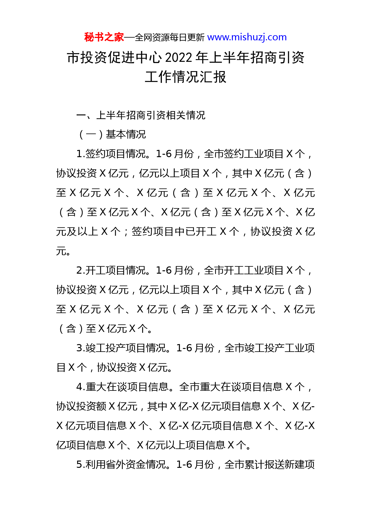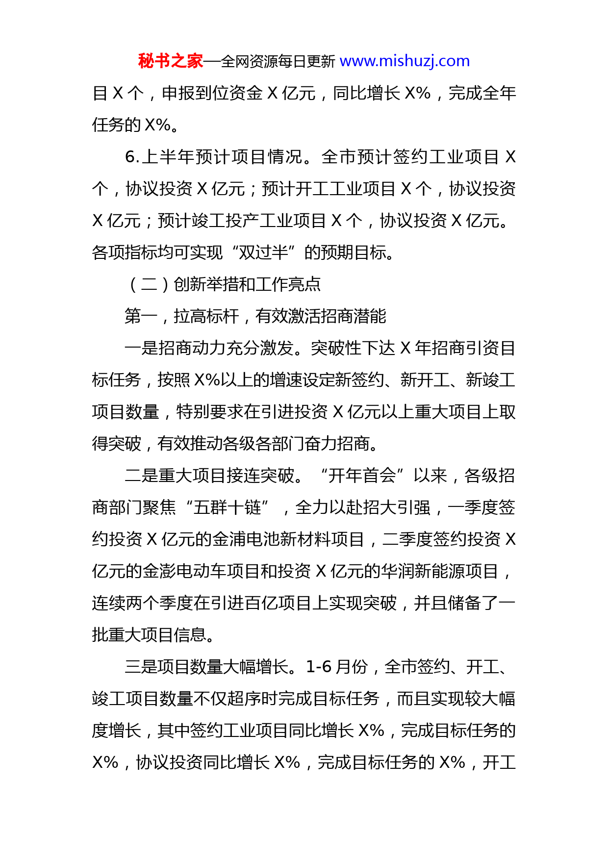 秘书之家—全网资源每日更新www.mishuzj.com市投资促进中心2022年上半年招商引资工作情况汇报一、上半年招商引资相关情况(一)基本情况1.签约项目情况。1-6月份,全市签约工业项目X个,协议投资X亿元,亿元以上项目X个,其中X亿元(含)至X亿元X个、X亿元(含)至X亿元X个、X亿元(含)至X亿元X个、X亿元(含)至X亿元X个、X亿元及以上X个;签约项目中已开工X个,协议投资X亿元。2.开工项目情况。1-6月份,全市开工工业项目X个,协议投资X亿元,亿元以上项目X个,其中X亿元(含)至X亿元X个、X亿元(含)至X亿元X个、X亿元(含)至X亿元X个。3.竣工投产项目情况。1-6月份,全市竣工投产工业项目X个,协议投资X亿元。4.重大在谈项目信息。全市重大在谈项目信息X个,协议投资额X亿元,其中X亿-X亿元项目信息X个、X亿-X亿元项目信息X个、X亿-X亿元项目信息X个、X亿-X亿项目信息X个、X亿元以上项目信息X个。5.利用省外资金情况。1-6月份,全市累计报送新建项秘书之家—全网资源每日更新www.mishuzj.com目X个,申报到位资金X亿元,同比增长X%,完成全年任务的X%。6.上半年预计项目情况。全市预计签约工业项目X个,协议投资X亿元;预计开工工业项目X个,协议投资X亿元;预计竣工投产工业项目X个,协议投资X亿元。各项指标均可实现“双过半”的预期目标。(二)创新举措和工作亮点第一,拉高标杆,有效激活招商潜能一是招商动力充分激发。突破性下达X年招商引资目标任务,按照X%以上的增速设定新签约、新开工、新竣工项目数量,特别要求在引进投资X亿元以上重大项目上取得突破,有效推动各级各部门奋力招商。二是重大项目接连突破。“开年首会”以来,各级招商部门聚焦“五群十链”,全力以赴招大引强,一季度签约投资X亿元的金浦电池新材料项目,二季度签约投资X亿元的金澎电动车项目和投资X亿元的华润新能源项目,连续两个季度在引进百亿项目上实现突破,并且储备了一批重大项目信息。三是项目数量大幅增长。1-6月份,全市签约、开工、竣工项目数量不仅超序时完成目标任务,而且实现较大幅度增长,其中签约工业项目同比增长X%,完成目标任务的X%,协议投资同比增长X%,完成目标任务的X%,开工秘书之家—全网资源每日更新www.mishuzj.com工业项目同比增长X%,完成目标任务的X%,竣工投产工业项目同比增长X%,完成目标任务X%。第二,多措并举,有效加强信息推进一是实行招商信息闭环管理。按照“搜集-筛选-研判-推送-跟进”的流程,对招商信息进行闭环管理,确保每条有效信息都有县级领导干部跟踪推进。市投资中心每月汇总各县区、开发园区及三支招商队伍在手的较为成熟的信息,分层分类推送至相关载体单位和产业链专班负责跟进。二是实行优质信息提级跟进。每月安排重大项目信息,由市级领导顶格推进,进一步发挥了“以上率下”的带动作用,推动项目加快落地。各载体单位的重点招商信息均由其主要负责同志领衔跟进。三是实行上下联动协同推进。实施重大产业项目联审评审工作机制,出台招商引资项目决策办法,重点项目及时推送至相关部门综合研判,市县(区)合力把好项目质量“源头关”。市投资促进中心主动加强与各招商主体对接,常态化开展联合研判和洽谈,力争有效信息盯得住、落下来。第三,强基固本,有效提升专业水平一是推动招商队伍规模化。将各单位零散招商人员“整编”为三支招商队伍,在成立X支县干招商组基础秘书之家—全网资源每日更新www.mishuzj.com上,组建X人的专业招商队伍。通过比选和点调组建“双百双招”先锋团,先期选派X名优秀干部赴沪苏浙地区开展“双招双引”,全市常态化开展招商引资工作的人员突破X人。三支队伍累计外出访商X家,邀请客商来淮X批次,备案有效招商信息X条,签约项目X个。二是推动业务培训实战化。举办招商引资专题培训班,从招商实操层面讲授招商引资方法论。开展“云在线”课堂,培训招商政策、谈判技巧、税务等方面知识。组织“三支”队伍代表在线观摩重点项目研判洽谈的全过程。召开招商引资项目务虚会,分管市领导以会代训。各县区结合各自实际开展精准培训,推动招商人员由专职化向专业化过渡。三是推动项目招引精准化。聚焦“五群十链”,分链条编制招商项目册,梳理建立重点招商项目库,为引进延链补链强链和产业集聚型项目提供指导。组织各级招商人员认真研究《防范招商引资风险指引》,着手制定招商负面清单,明确禁招、慎招项目,提升甄别筛选项目的能力水平。第四,赛马竞争,有效激发招商干劲一是推动比学赶超。开展“一季度争创招商开门红”百日攻坚活动,重点围绕新签约、新开工项目的数量和质量,组织载体单位进行招商比武,掀起了“比学赶超”热秘书之家—全网资源每日更新www.mishuzj.com潮,实现了招商首季“开门红”。组织现场观摩活动,县区、开发园区招商部门在相互交流学习中相互比较、“竞争赛马”,营造了争先进位的浓厚氛围。二是强化调度考核。认真落实“周通报、月调度、季考核、年总评”的考核评价体系,推动调度考核由“结果导向”变为“过程管控”。定期召开月度项目调度会和季度招商调度会,季度调度会面向全网直播,切实传递了招商压力。二、存在主要问题一是协同联动的机制不够顺畅。重大项目联审评审机制有待进一步用足用好,载体单位在推进项目时习惯于