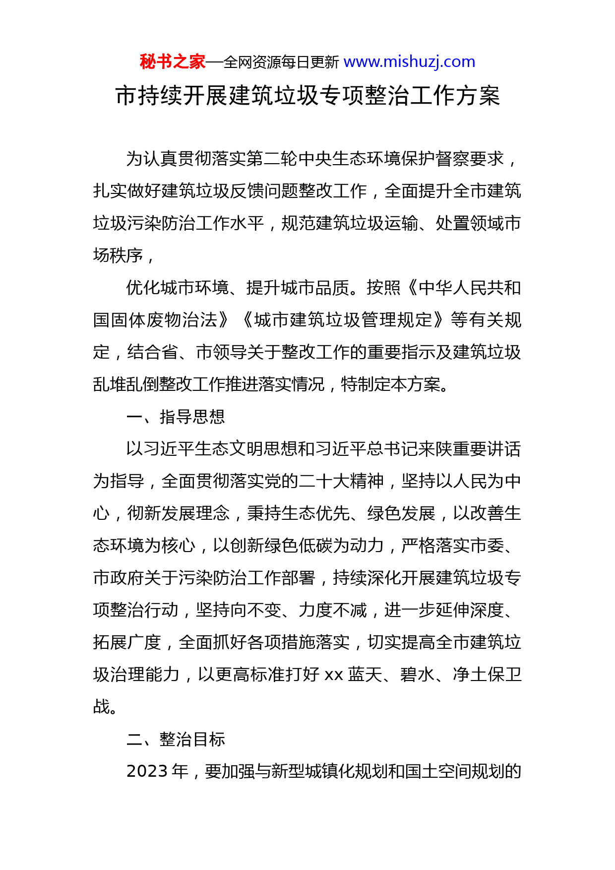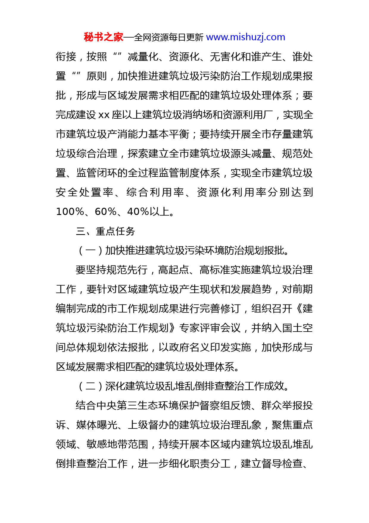 秘书之家—全网资源每日更新www.mishuzj.com市持续开展建筑垃圾专项整治工作方案为认真贯彻落实第二轮中央生态环境保护督察要求,扎实做好建筑垃圾反馈问题整改工作,全面提升全市建筑垃圾污染防治工作水平,规范建筑垃圾运输、处置领域市场秩序,优化城市环境、提升城市品质。按照《中华人民共和国固体废物治法》《城市建筑垃圾管理规定》等有关规定,结合省、市领导关于整改工作的重要指示及建筑垃圾乱堆乱倒整改工作推进落实情况,特制定本方案。一、指导思想以习近平生态文明思想和习近平总书记来陕重要讲话为指导,全面贯彻落实党的二十大精神,坚持以人民为中心,彻新发展理念,秉持生态优先、绿色发展,以改善生态环境为核心,以创新绿色低碳为动力,严格落实市委、市政府关于污染防治工作部署,持续深化开展建筑垃圾专项整治行动,坚持向不变、力度不减,进一步延伸深度、拓展广度,全面抓好各项措施落实,切实提高全市建筑垃圾治理能力,以更高标准打好xx蓝天、碧水、净土保卫战。二、整治目标2023年,要加强与新型城镇化规划和国土空间规划的秘书之家—全网资源每日更新www.mishuzj.com衔接,按照“”减量化、资源化、无害化和谁产生、谁处置“”原则,加快推进建筑垃圾污染防治工作规划成果报批,形成与区域发展需求相匹配的建筑垃圾处理体系;要完成建设xx座以上建筑垃圾消纳场和资源利用厂,实现全市建筑垃圾产消能力基本平衡;要持续开展全市存量建筑垃圾综合治理,探索建立全市建筑垃圾源头减量、规范处置、监管闭环的全过程监管制度体系,实现全市建筑垃圾安全处置率、综合利用率、资源化利用率分别达到100%、60%、40%以上。三、重点任务(一)加快推进建筑垃圾污染环境防治规划报批。要坚持规范先行,高起点、高标准实施建筑垃圾治理工作,要针对区域建筑垃圾产生现状和发展趋势,对前期编制完成的市工作规划成果进行完善修订,组织召开《建筑垃圾污染防治工作规划》专家评审会议,并纳入国土空间总体规划依法报批,以政府名义印发实施,加快形成与区域发展需求相匹配的建筑垃圾处理体系。(二)深化建筑垃圾乱堆乱倒排查整治工作成效。结合中央第三生态环境保护督察组反馈、群众举报投诉、媒体曝光、上级督办的建筑垃圾治理乱象,聚焦重点领域、敏感地带范围,持续开展本区域内建筑垃圾乱堆乱倒排查整治工作,进一步细化职责分工,建立督导检查、秘书之家—全网资源每日更新www.mishuzj.com联合执法机制,持续健全排查整治和长效管理“四清一责任”工作机制,加快排查问题整改,明确整改任务、目标、时限及整改责任人,同时要对清理整治工作进行回头望,防止建现象出现反弹。(三)加快建筑垃圾末端处置设施建设步伐。要根据区域建筑垃圾产生现状及预测产生量,结合建筑垃圾乱倒排查整改工作情况,合理确定填埋处置、资源利用设施布局和规模,年底前,至少完成xx座以上建筑垃圾消纳场所或建筑垃圾资源化利用厂建设任务。同时,要全面加强现有建筑垃圾笑纳场所的监督管理,实现本区域建筑垃圾产消平衡。(四)大力实施建筑垃圾源头减量措施。要按照建筑垃圾“谁产生、谁负责”原则,落实建设单位建筑垃圾减量化企业主体责任,建设单位要将建筑垃圾减量化目标和措施措施纳入招标文件和合同文件,建筑垃圾减量化措施费纳入工程概算;施工单位应组织编制施工现场建筑垃圾减量化专项方案,并采取针对性措施降低施工现场建筑垃圾排放量,要全面推行精装房、装配房制度。(五)建立健全建筑垃圾治理工作联合机制。要建立以城市管理执法、发改、住建、自然资源、生态环境、水务等部门组成的建筑垃圾治理工作联合机制。秘书之家—全网资源每日更新www.mishuzj.com由城市管理执法部门牵头,建立常态化议事协调机制,有效推动全市建筑垃圾处理项目建设、日常监管、综合利用等工作。城管执法、公安交警、交通运输等部门要加强联合执法,加大重点区域、重点路段,重点时段的执法力度和检查频次,对沿途抛洒、带泥上路、不按照规定路线行驶、超速、闯红灯、乱倾倒、非法运输等违法违规行为依法从严查处。(七)深入开展建筑垃圾堆体风险排查。要加强建筑垃圾堆体风险排查治理,要对现有建筑垃圾堆体进行常态化检查,对摸排的数量、位置、堆体形成原因等登记造册,建立完善详细的台账体系,要聘请专业第三方检测机构对每一处建筑垃圾堆放点开展稳定性检查评估,对存在的安全隐患堆放点,制定综合加固整治方案限期治理,做到底数清、情况明、数据准。四、相关要求(一)加强组织领导。各(镇)办、各相关部门要高度重视建筑垃圾专项治理工作,结合本方案和实际情况制定细化行动方案,高位部署相关工作,要把建筑垃圾治理工作纳入年度计划和重点工作清单,加强组织领导,统筹协调推进,明确目标任务,确保建筑垃圾专项整治工作顺利推动。(二)明确协同职能。各(镇)办、各相关部门要根秘书之家—全网资源每日更新www.mishuzj.com据本方案要求,结合2022年中央环保督察反馈建筑垃圾乱倾倒问题整改工作推进落实情况,各司其职、密切配合,协同推进建筑垃圾治理工作。(三)压实属地责任。各(镇)办、各相关部门要切实履行建筑垃圾治理工作属地责任,通过建立网格化管理机制,快速发现