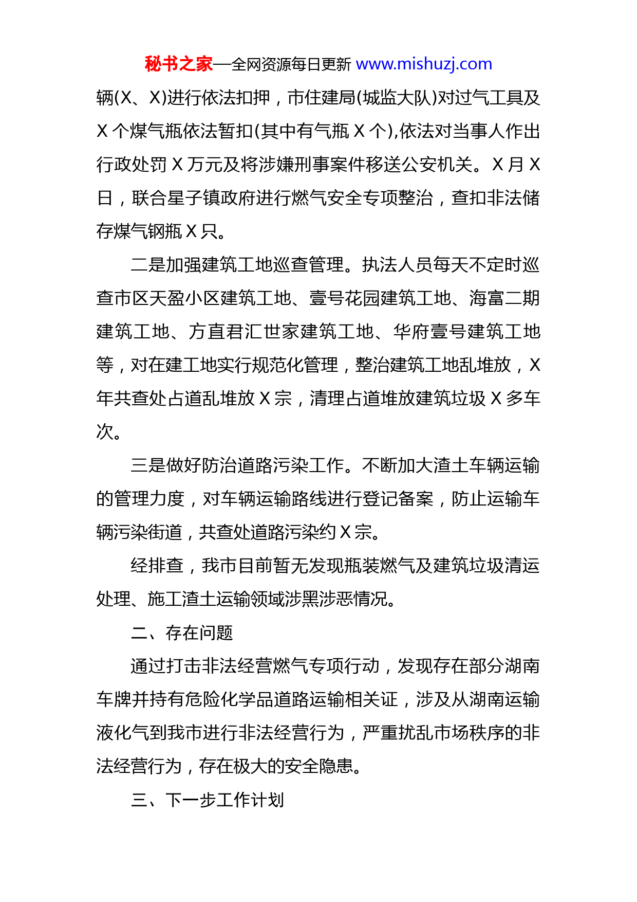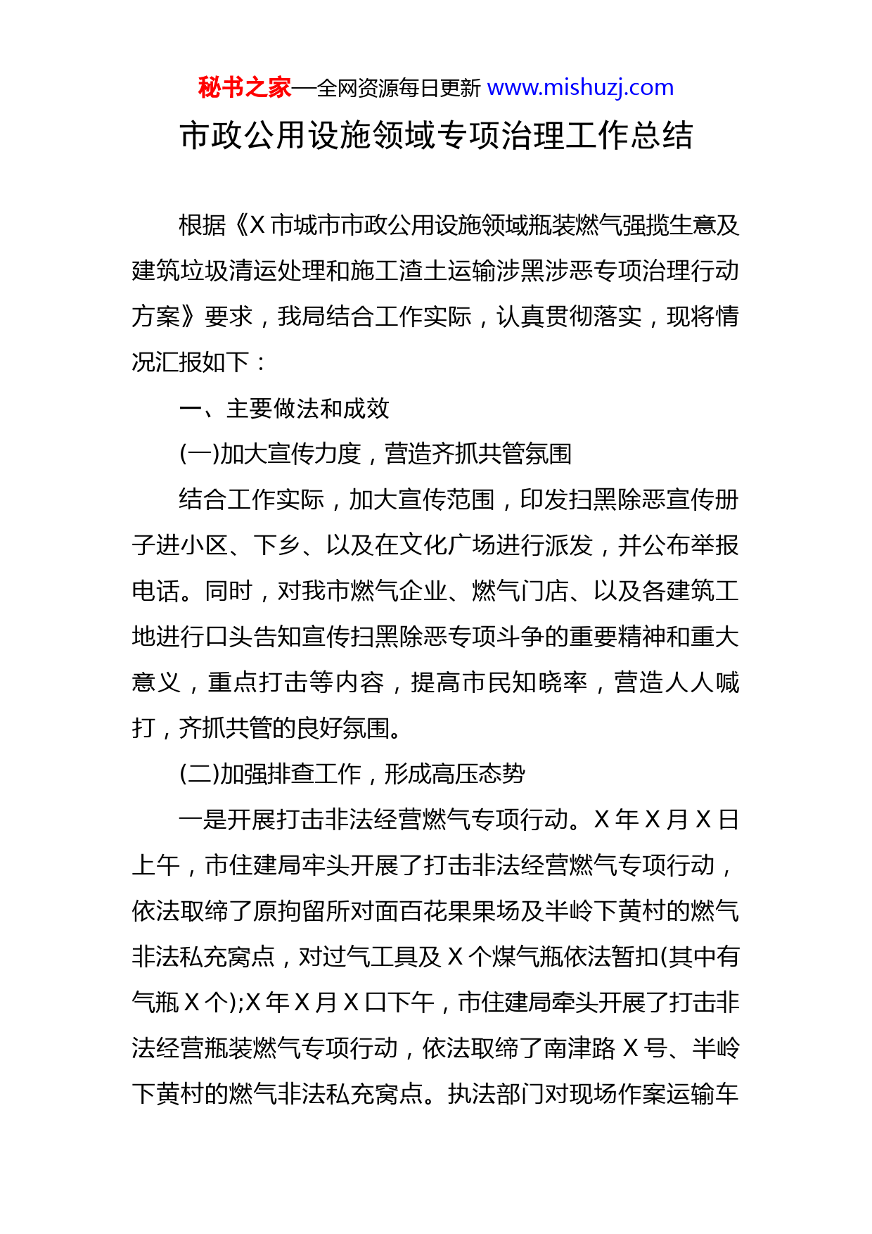 秘书之家—全网资源每日更新www.mishuzj.com市政公用设施领域专项治理工作总结根据《X市城市市政公用设施领域瓶装燃气强揽生意及建筑垃圾清运处理和施工渣土运输涉黑涉恶专项治理行动方案》要求,我局结合工作实际,认真贯彻落实,现将情况汇报如下:一、主要做法和成效(一)加大宣传力度,营造齐抓共管氛围结合工作实际,加大宣传范围,印发扫黑除恶宣传册子进小区、下乡、以及在文化广场进行派发,并公布举报电话。同时,对我市燃气企业、燃气门店、以及各建筑工地进行口头告知宣传扫黑除恶专项斗争的重要精神和重大意义,重点打击等内容,提高市民知晓率,营造人人喊打,齐抓共管的良好氛围。(二)加强排查工作,形成高压态势一是开展打击非法经营燃气专项行动。X年X月X日上午,市住建局牢头开展了打击非法经营燃气专项行动,依法取缔了原拘留所对面百花果果场及半岭下黄村的燃气非法私充窝点,对过气工具及X个煤气瓶依法暂扣(其中有气瓶X个);X年X月X口下午,市住建局牵头开展了打击非法经营瓶装燃气专项行动,依法取缔了南津路X号、半岭下黄村的燃气非法私充窝点。执法部门对现场作案运输车秘书之家—全网资源每日更新www.mishuzj.com辆(X、X)进行依法扣押,市住建局(城监大队)对过气工具及X个煤气瓶依法暂扣(其中有气瓶X个),依法对当事人作出行政处罚X万元及将涉嫌刑事案件移送公安机关。X月X日,联合星子镇政府进行燃气安全专项整治,查扣非法储存煤气钢瓶X只。二是加强建筑工地巡查管理。执法人员每天不定时巡查市区天盈小区建筑工地、壹号花园建筑工地、海富二期建筑工地、方直君汇世家建筑工地、华府壹号建筑工地等,对在建工地实行规范化管理,整治建筑工地乱堆放,X年共查处占道乱堆放X宗,清理占道堆放建筑垃圾X多车次。三是做好防治道路污染工作。不断加大渣土车辆运输的管理力度,对车辆运输路线进行登记备案,防止运输车辆污染街道,共查处道路污染约X宗。经排查,我市目前暂无发现瓶装燃气及建筑垃圾清运处理、施工渣土运输领域涉黑涉恶情况。二、存在问题通过打击非法经营燃气专项行动,发现存在部分湖南车牌并持有危险化学品道路运输相关证,涉及从湖南运输液化气到我市进行非法经营行为,严重扰乱市场秩序的非法经营行为,存在极大的安全隐患。三、下一步工作计划秘书之家—全网资源每日更新www.mishuzj.com一是继续保持高压态势,开展打击燃气黑点专项行动,捣毁非法私充窝点,打击燃气非法经营。坚决依法从重处罚,做到以强化执法查处加强安全管理,以强化执法查处促进安全隐患整改,以强化执法查处增强全民安全责任意识。二是加强建筑垃圾及余泥渣土运输管理工作。加强日常巡查监控,严厉打击涉黑涉恶行为,如发现有关涉黑涉恶线索及时报送有部门,切实将黑恶势力消灭在萌芽状态。