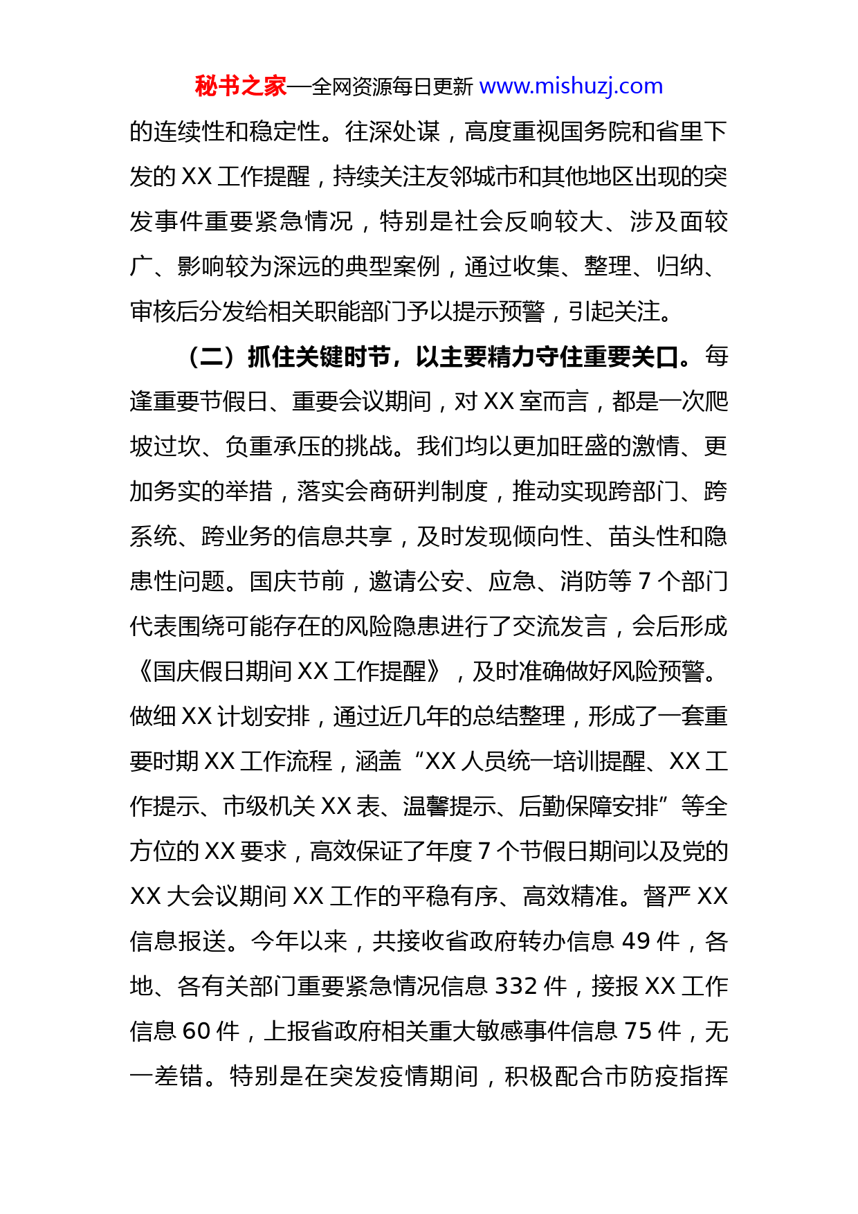 秘书之家—全网资源每日更新www.mishuzj.com市政办2022年工作总结及2023年工作计划2022年是党的XX大召开之年,是实施“十四五”规划的关键之年,也是向第二个百年奋斗目标进军的开局之年。年初以来,市委书记XXX多次带队检查节假日期间XX工作,关心慰问一线XX人员;市长XX亲赴XXX,点调各辖市区应急值守情况。在市领导的亲切关怀下,在各位秘书长、主任的正确领导下,在兄弟处室的大力支持下,XXX圆满完成了年度工作。现将2022年各项工作开展情况和2023年工作计划报告如下:一、2022年工作情况(一)提高思想站位,以思想领先推动工作靠前。XXX始终将对党忠诚作为XX人员的首要政治品格,往高处站,坚持把做好XX工作作为坚定拥护“两个确立”、坚决做到“两个维护”的具体举措;作为奋力推进“XXX”发展战略,谱写“XX”新XX现代化建设新篇章的实际行动;作为防范重大风险、化解各类矛盾的重要抓手,不断强化人员政治意识和能力。往远处看,注重把握XX工作的规律性,尽力将问题矛盾做好预想预测,将重点工作提前筹划部署,熨平工作节奏,克服忙乱问题。比如,提前编排全年7个假期领导XX安排,整理37个突发事件应急预案形成突发事件报告制式模板等,确保XX工作秘书之家—全网资源每日更新www.mishuzj.com的连续性和稳定性。往深处谋,高度重视国务院和省里下发的XX工作提醒,持续关注友邻城市和其他地区出现的突发事件重要紧急情况,特别是社会反响较大、涉及面较广、影响较为深远的典型案例,通过收集、整理、归纳、审核后分发给相关职能部门予以提示预警,引起关注。(二)抓住关键时节,以主要精力守住重要关口。每逢重要节假日、重要会议期间,对XX室而言,都是一次爬坡过坎、负重承压的挑战。我们均以更加旺盛的激情、更加务实的举措,落实会商研判制度,推动实现跨部门、跨系统、跨业务的信息共享,及时发现倾向性、苗头性和隐患性问题。国庆节前,邀请公安、应急、消防等7个部门代表围绕可能存在的风险隐患进行了交流发言,会后形成《国庆假日期间XX工作提醒》,及时准确做好风险预警。做细XX计划安排,通过近几年的总结整理,形成了一套重要时期XX工作流程,涵盖“XX人员统一培训提醒、XX工作提示、市级机关XX表、温馨提示、后勤保障安排”等全方位的XX要求,高效保证了年度7个节假日期间以及党的XX大会议期间XX工作的平稳有序、高效精准。督严XX信息报送。今年以来,共接收省政府转办信息49件,各地、各有关部门重要紧急情况信息332件,接报XX工作信息60件,上报省政府相关重大敏感事件信息75件,无一差错。特别是在突发疫情期间,积极配合市防疫指挥秘书之家—全网资源每日更新www.mishuzj.com部,24小时分秒在岗,扎实守好XX阵地,确保各项工作正常运转。X月X日,省政府总XX室下发《XX工作情况》,专题总结了XX的经验做法。(三)强化能力提升,以过硬本领筑牢一线堡垒为了促使XX工作的接续开展不断档,作风传承不变样,我们始终把加强XX队伍建设作为提升XX工作整体水平的根本保证。抓好“老带新”,今年来,XX室先后有1人赴基层挂职锻炼、1人调整岗位、1名军转借用,人员流动较大,为了充分融合个体优势,完善人才梯队培养,XX室积极创建主副班“一老带一新”的传帮带制度,通过“跟班—副班—主班”的渐次培养,帮助新人快速上手、融入团队、独立工作。办好“培训会”,为进一步提升基层XX工作水平,XX室先后举办了“《信访工作条例》专题培训”和“XX工作培训会”,特别是在7月27日,专程邀请省政府XX室XXX主任亲临XX授课,权威阐释了XX工作的认识、重点、方法和技巧,有效加强了对基层XX工作业务指导。用好“工作册”,通过学习、领会《全国政府系统XX工作规范(试行)》《关于进一步加强新形势下党委政府系统XX工作的通知》等规范性文件,更新《XX工作手册》,进一步明确各部门XX带班要求。同时,通过制作《突发紧急情况报送处置流程》PPT一套,绘制XX专报、领导请假等日常工作思维导图5张,在醒目秘书之家—全网资源每日更新www.mishuzj.com位置张贴重要提醒3份,以“饱和式”的提醒提升XX人员业务水平,降低XX工作的差错率。(四)突出务实创新,以制度规范稳控XX质效XX室坚持创新工作思路、抓强制度建设、用活信息化手段,全力推动XX工作走上制度化、科学化、规范化的轨道。深化平台运用,在智能办公平台及时传达市领导相关批示XX件,反馈贯彻落实情况XX件,有效提高了突发事件和重要紧急情况信息传递效率;整合归并了XX专报、XX通报、请假报备等日常XX工作,借助OA系统编制《XX专报》XX期,编发《XX通报》6期,办理请假事件XX件,形成了工作流程闭环化、批示落实高效化、跟踪反馈智能化。规范办事程序,细化XX室各项制度管理,明确主副XX员岗位职责清单,减少因人员更替、工作繁忙所带来的工作波动,确保各项台账事无巨细皆有记录,倒查责任有据可循。全年共落实会议名单上报XX余次,听社会群众来电5000余个,拟制电话记录7件,接收传递各类文电XX余份,各项文电流转均于“来文来函登记簿”和“电话记录”上详细备案。强化督导检查,采取电话抽查和视频点名相结合的方式,对7个辖市(区)及15家应急联动单位的值守工作情况进行抽查,全年共抽查XX次;坚持每周一下午对辖市、区进行视频点名,全年共组织视频点名XX次;国庆节前利用两天时间实地检