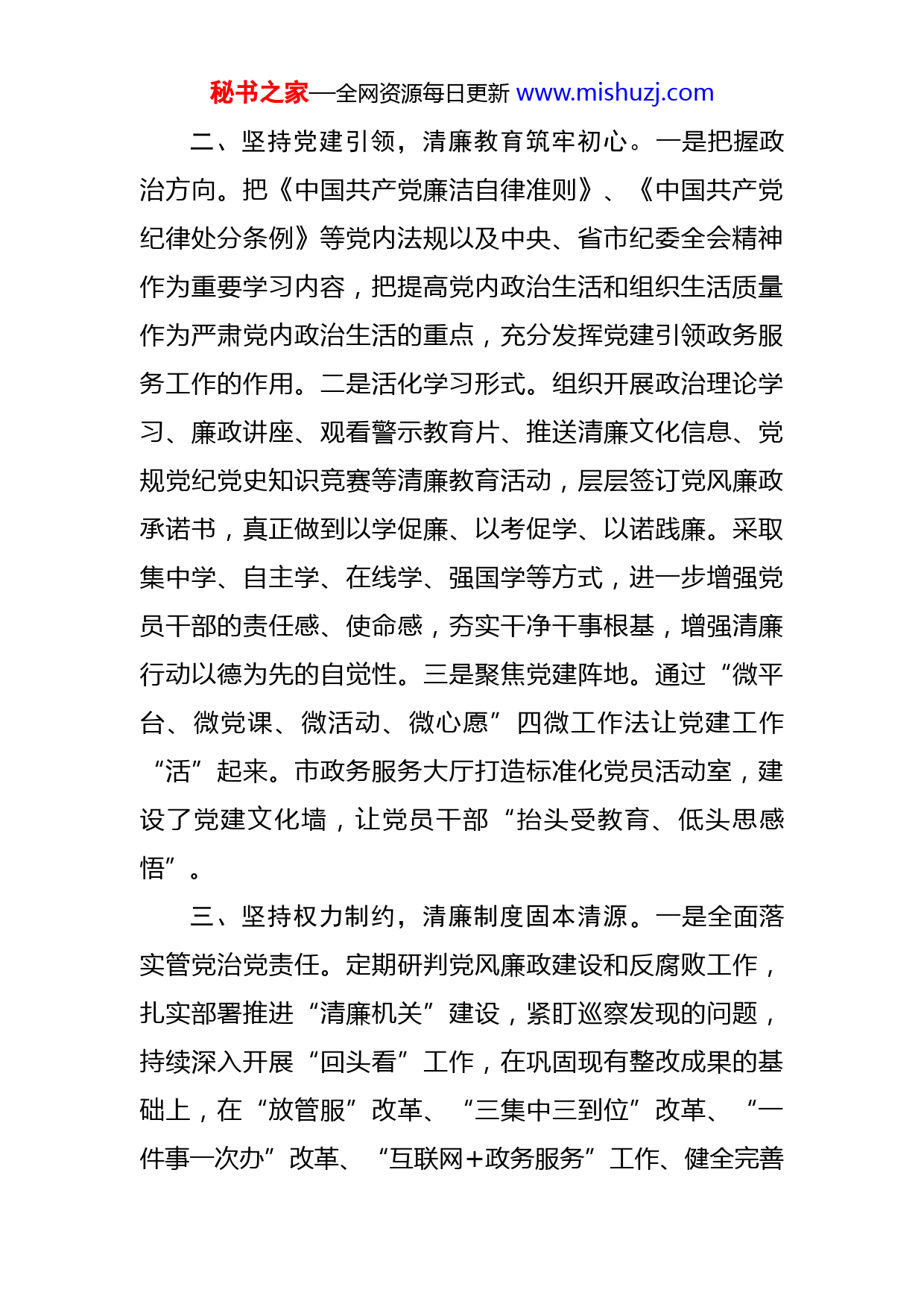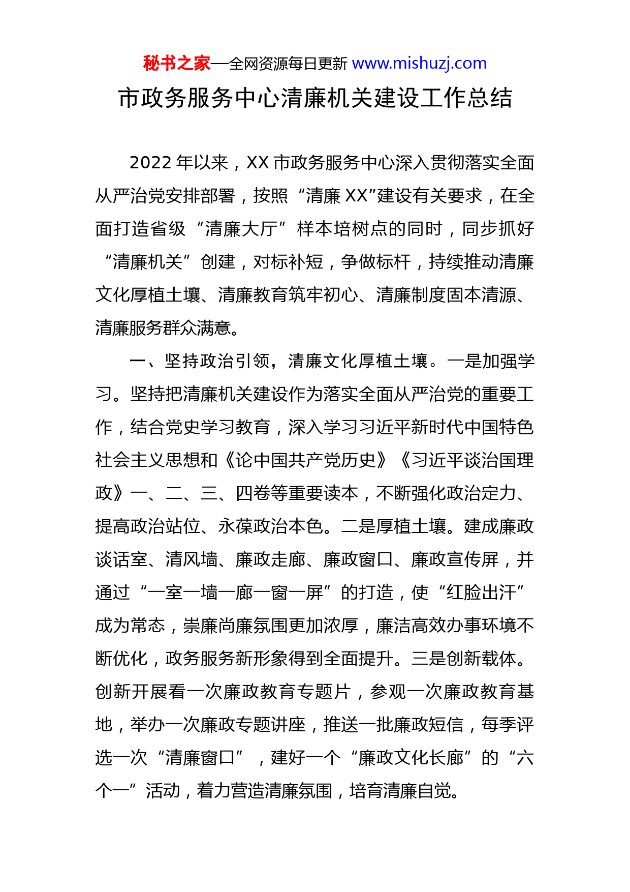 秘书之家—全网资源每日更新www.mishuzj.com市政务服务中心清廉机关建设工作总结2022年以来,XX市政务服务中心深入贯彻落实全面从严治党安排部署,按照“清廉XX”建设有关要求,在全面打造省级“清廉大厅”样本培树点的同时,同步抓好“清廉机关”创建,对标补短,争做标杆,持续推动清廉文化厚植土壤、清廉教育筑牢初心、清廉制度固本清源、清廉服务群众满意。一、坚持政治引领,清廉文化厚植土壤。一是加强学习。坚持把清廉机关建设作为落实全面从严治党的重要工作,结合党史学习教育,深入学习习近平新时代中国特色社会主义思想和《论中国共产党历史》《习近平谈治国理政》一、二、三、四卷等重要读本,不断强化政治定力、提高政治站位、永葆政治本色。二是厚植土壤。建成廉政谈话室、清风墙、廉政走廊、廉政窗口、廉政宣传屏,并通过“一室一墙一廊一窗一屏”的打造,使“红脸出汗”成为常态,崇廉尚廉氛围更加浓厚,廉洁高效办事环境不断优化,政务服务新形象得到全面提升。三是创新载体。创新开展看一次廉政教育专题片,参观一次廉政教育基地,举办一次廉政专题讲座,推送一批廉政短信,每季评选一次“清廉窗口”,建好一个“廉政文化长廊”的“六个一”活动,着力营造清廉氛围,培育清廉自觉。秘书之家—全网资源每日更新www.mishuzj.com二、坚持党建引领,清廉教育筑牢初心。一是把握政治方向。把《中国共产党廉洁自律准则》、《中国共产党纪律处分条例》等党内法规以及中央、省市纪委全会精神作为重要学习内容,把提高党内政治生活和组织生活质量作为严肃党内政治生活的重点,充分发挥党建引领政务服务工作的作用。二是活化学习形式。组织开展政治理论学习、廉政讲座、观看警示教育片、推送清廉文化信息、党规党纪党史知识竞赛等清廉教育活动,层层签订党风廉政承诺书,真正做到以学促廉、以考促学、以诺践廉。采取集中学、自主学、在线学、强国学等方式,进一步增强党员干部的责任感、使命感,夯实干净干事根基,增强清廉行动以德为先的自觉性。三是聚焦党建阵地。通过“微平台、微党课、微活动、微心愿”四微工作法让党建工作“活”起来。市政务服务大厅打造标准化党员活动室,建设了党建文化墙,让党员干部“抬头受教育、低头思感悟”。三、坚持权力制约,清廉制度固本清源。一是全面落实管党治党责任。定期研判党风廉政建设和反腐败工作,扎实部署推进“清廉机关”建设,紧盯巡察发现的问题,持续深入开展“回头看”工作,在巩固现有整改成果的基础上,在“放管服”改革、“三集中三到位”改革、“一件事一次办”改革、“互联网+政务服务”工作、健全完善秘书之家—全网资源每日更新www.mishuzj.com大厅管理制度等方面持续发力,全面提高政务管理服务工作水平。二是落实廉政风险点制度规范。深入落实《XX市政务服务中心“不能腐”防范机制实施方案》(X政务发〔2021〕12号),对重点岗位、重点环节和重点人员实行分级分类风险防控,并深化“互联网+监督”运用,促进“小微权力”廉洁行事、规范运行。三是严格日常管理。进一步压实政务服务大厅入驻单位窗口管理和作风建设主体责任,坚持落实政务服务大厅现场作风建设日巡查制度和视频监控管理平台实时监控制度,有针对性地采取警示教育、廉政访谈、提醒谈话等举措,切实增强党员干部和工作人员的廉洁自觉。四、坚持宗旨意识,清廉服务群众满意。坚持把为企业群众解难事办实事作为检验清廉机关建设成效的重要标尺。一是深化“三项服务”破解难题。组织政务先锋党建联合政务服务大厅个党支部、党员开展组团上门服务、预约服务、延时服务,破解审批难题做到项目“帮办”服务到位。重点做好与省旅发会相关项目的落地实施,通过“帮代办”和保姆式服务,确保重点项目建设顺利推进。多次召开相关窗口部门行政审批科长和“首席代表”会议,做好110多个省旅游发展大会项目的指导与服务。二是营造风清气正政务环境。通过设立政务服务“办不成事”反映窗口,公开投诉举报信箱、“好差评”评秘书之家—全网资源每日更新www.mishuzj.com价、12388举报电话、12345政务服务热线等投诉举报渠道,全面落实行政效能电子监察和政务服务“好差评”,对政务服务行为进行实时监测、预警纠错和效能评价,坚决防止窗口人员及审批工作人员在行政审批、政务服务中设置“门槛”、暗箱操作、利益输送、权力寻租问题,坚决杜绝勾结黑中介行为,坚决查处“提篮子”“打牌子”“拉款子”等隐性腐败、新型腐败,着力预防窗口及审批工作人员“怕、慢、假、庸、散”“吃拿卡要”等作风和腐败问题。三是倒逼服务质量水平提升。开展“清廉机关”建设工作以来,一批堵点、难点得以疏通,一批“疑难梗阻”得到解决,政务服务水平和质量得到大幅提升,事项办理承诺时限在法定时限基础上提速62%,申请材料自2021年11月以来减少201个,群众心中原本难办的事,变成了“方便的事”“不求人办的事”,群众满意率大幅提升。