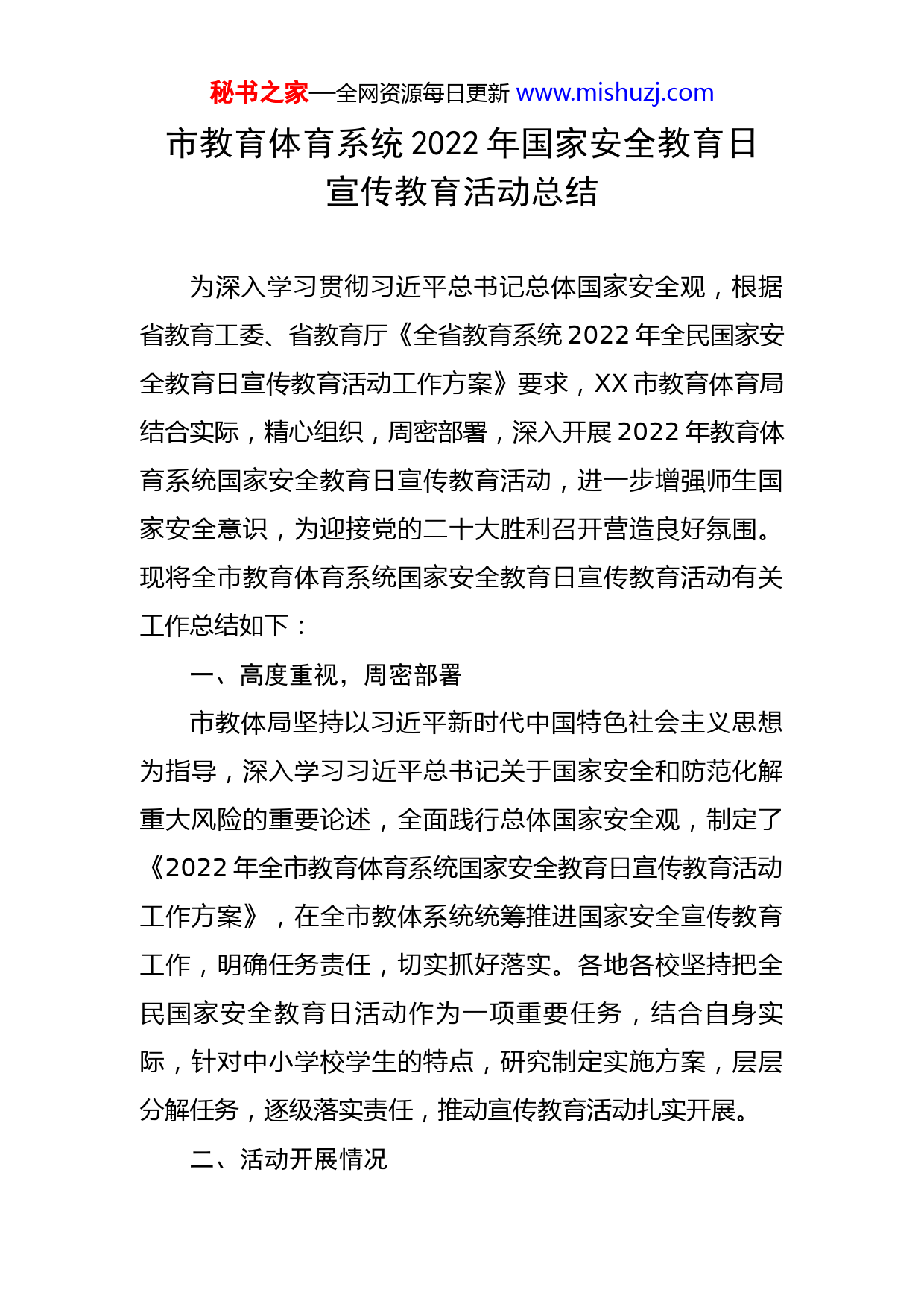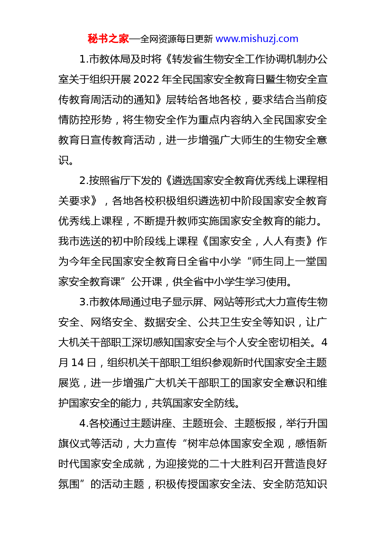 秘书之家—全网资源每日更新www.mishuzj.com市教育体育系统2022年国家安全教育日宣传教育活动总结为深入学习贯彻习近平总书记总体国家安全观,根据省教育工委、省教育厅《全省教育系统2022年全民国家安全教育日宣传教育活动工作方案》要求,XX市教育体育局结合实际,精心组织,周密部署,深入开展2022年教育体育系统国家安全教育日宣传教育活动,进一步增强师生国家安全意识,为迎接党的二十大胜利召开营造良好氛围。现将全市教育体育系统国家安全教育日宣传教育活动有关工作总结如下:一、高度重视,周密部署市教体局坚持以习近平新时代中国特色社会主义思想为指导,深入学习习近平总书记关于国家安全和防范化解重大风险的重要论述,全面践行总体国家安全观,制定了《2022年全市教育体育系统国家安全教育日宣传教育活动工作方案》,在全市教体系统统筹推进国家安全宣传教育工作,明确任务责任,切实抓好落实。各地各校坚持把全民国家安全教育日活动作为一项重要任务,结合自身实际,针对中小学校学生的特点,研究制定实施方案,层层分解任务,逐级落实责任,推动宣传教育活动扎实开展。二、活动开展情况秘书之家—全网资源每日更新www.mishuzj.com1.市教体局及时将《转发省生物安全工作协调机制办公室关于组织开展2022年全民国家安全教育日暨生物安全宣传教育周活动的通知》层转给各地各校,要求结合当前疫情防控形势,将生物安全作为重点内容纳入全民国家安全教育日宣传教育活动,进一步增强广大师生的生物安全意识。2.按照省厅下发的《遴选国家安全教育优秀线上课程相关要求》,各地各校积极组织遴选初中阶段国家安全教育优秀线上课程,不断提升教师实施国家安全教育的能力。我市选送的初中阶段线上课程《国家安全,人人有责》作为今年全民国家安全教育日全省中小学“师生同上一堂国家安全教育课”公开课,供全省中小学生学习使用。3.市教体局通过电子显示屏、网站等形式大力宣传生物安全、网络安全、数据安全、公共卫生安全等知识,让广大机关干部职工深切感知国家安全与个人安全密切相关。4月14日,组织机关干部职工组织参观新时代国家安全主题展览,进一步增强广大机关干部职工的国家安全意识和维护国家安全的能力,共筑国家安全防线。4.各校通过主题讲座、主题班会、主题板报,举行升国旗仪式等活动,大力宣传“树牢总体国家安全观,感悟新时代国家安全成就,为迎接党的二十大胜利召开营造良好氛围”的活动主题,积极传授国家安全法、安全防范知识秘书之家—全网资源每日更新www.mishuzj.com及典型案列,使广大师生认清国家安全形势、增强忧患意识、树立国家安全观念。全市共进行集中宣传XX场次,受益师生XXXXXX人(次),发动学校XXX所,影响师生XXXXXX人(次)。XX市、XX县举办了“感悟新时代国家安全成就展,迎接党的二十大胜利召开”主题画展。万载县开展了“国家安全在我心中”主题班会。5.各地利用广播、电视、LED显示屏等深入宣传《国家安全法》《反间谍法》《网络安全法》《反恐怖主义法》《保守国家秘密法》等法律法规,营造维护国家安全的浓厚法治氛围。全市共制作展板XXX块,制作宣传册、宣传单XXXXXX份。6.各地各校大力开展全民国家安全教育日有奖知识竞答等活动,普及国家安全知识,不断提升广大师生和家长维护国家安全的意识。XX区组织教职工开展了“我和新时代国家安全”宣讲比赛和“X·XX”宣传海报评选活动。XX县通过班级微信群向学生家长发送生物安全知识链接约XXXX余条。XX市邀请法治副校长进校园进行国家安全法律知识讲座。XX县组织了疫情防控演练。XX县公安局国安大队网安大队到校开展了国家安全日宣传教育。三、下一步打算(一)提高政治站位。各地各校思想上要高度重视,充分认识国家安全宣传教育的极端重要性和重大意义,丰秘书之家—全网资源每日更新www.mishuzj.com富宣传内容,注重实效方式,常态化开展国家安全宣传教育活动。(二)及时归纳总结。各地各校要认真做好国家安全宣传教育活动的收集、整理、归档和经验总结,及时总结提炼,为深入开展国家安全宣传教育活动提供示范引领和有益参照。(三)积极宣传报道。各地各校要坚持正面宣传的方针,充分利用广播、电视、报纸、网络等多种媒体,及时做好活动报道,增强国家安全宣传教育活动的影响力和效果。