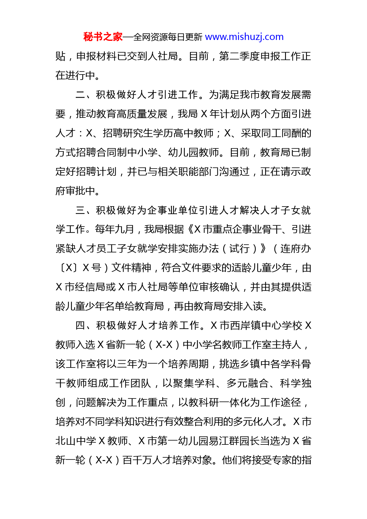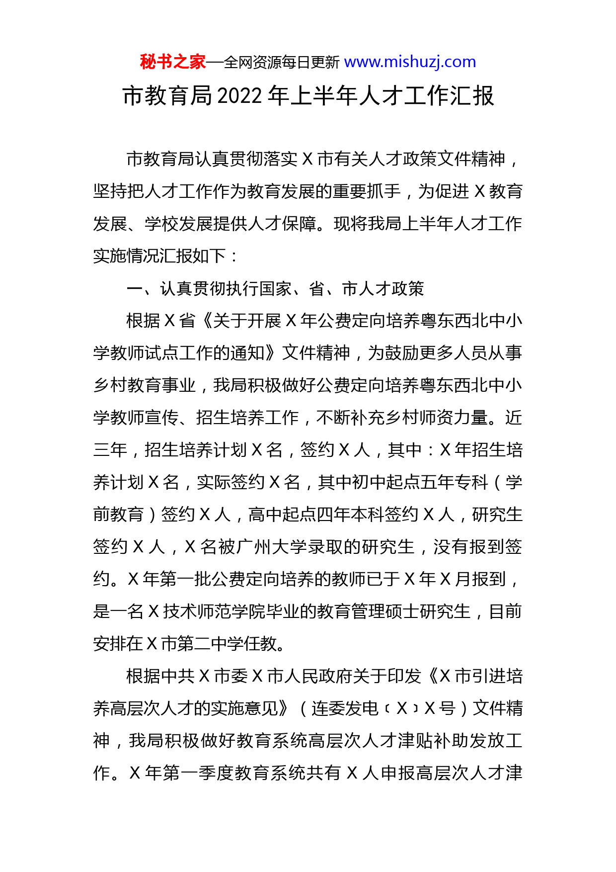 秘书之家—全网资源每日更新www.mishuzj.com市教育局2022年上半年人才工作汇报市教育局认真贯彻落实X市有关人才政策文件精神,坚持把人才工作作为教育发展的重要抓手,为促进X教育发展、学校发展提供人才保障。现将我局上半年人才工作实施情况汇报如下:一、认真贯彻执行国家、省、市人才政策根据X省《关于开展X年公费定向培养粤东西北中小学教师试点工作的通知》文件精神,为鼓励更多人员从事乡村教育事业,我局积极做好公费定向培养粤东西北中小学教师宣传、招生培养工作,不断补充乡村师资力量。近三年,招生培养计划X名,签约X人,其中:X年招生培养计划X名,实际签约X名,其中初中起点五年专科(学前教育)签约X人,高中起点四年本科签约X人,研究生签约X人,X名被广州大学录取的研究生,没有报到签约。X年第一批公费定向培养的教师已于X年X月报到,是一名X技术师范学院毕业的教育管理硕士研究生,目前安排在X市第二中学任教。根据中共X市委X市人民政府关于印发《X市引进培养高层次人才的实施意见》(连委发电﹝X﹞X号)文件精神,我局积极做好教育系统高层次人才津贴补助发放工作。X年第一季度教育系统共有X人申报高层次人才津秘书之家—全网资源每日更新www.mishuzj.com贴,申报材料已交到人社局。目前,第二季度申报工作正在进行中。二、积极做好人才引进工作。为满足我市教育发展需要,推动教育高质量发展,我局X年计划从两个方面引进人才:X、招聘研究生学历高中教师;X、采取同工同酬的方式招聘合同制中小学、幼儿园教师。目前,教育局已制定好招聘计划,并已与相关职能部门沟通过,正在请示政府审批中。三、积极做好为企事业单位引进人才解决人才子女就学工作。每年九月,我局根据《X市重点企事业骨干、引进紧缺人才员工子女就学安排实施办法(试行)》(连府办〔X〕X号)文件精神,符合文件要求的适龄儿童少年,由X市经信局或X市人社局等单位审核确认,并由其提供适龄儿童少年名单给教育局,再由教育局安排入读。四、积极做好人才培养工作。X市西岸镇中心学校X教师入选X省新一轮(X-X)中小学名教师工作室主持人,该工作室将以三年为一个培养周期,挑选乡镇中各学科骨干教师组成工作团队,以聚集学科、多元融合、科学独创,问题解决为工作重点,以教科研一体化为工作途径,培养对不同学科知识进行有效整合利用的多元化人才。X市北山中学X教师、X市第一幼儿园易江群园长当选为X省新一轮(X-X)百千万人才培养对象。他们将接受专家的指秘书之家—全网资源每日更新www.mishuzj.com导,增长先进理念和掌握先进方法,从而进行点面结合,为X市教育事业培养更多优秀人才。目前,X市教育系统共有X个工作室,其中县级工作室X个,市级工作室X个,省级工作室X个。工作室以教师专业能力建设为核心,以中青年骨干教师培养为重点,整合资源、团队培养、整体提升,提高学科教学质量,促进教师专业化发展,培养了一批年轻的骨干教师和学科带头人。加大教师师资培训培养力度。截至X年X月,举办了X个培训班,培训教师X人次。今年上半年,采取“走出去”的办法,我局派出X位骨干教师到广州市荔湾区学校跟岗学习,让他们走出去,学习省级学校名师教育教学方法,接受名师面对面的指导,掌握先进教育教学方法。七、教育系统人才队伍建设方面存在的困难。一是研究生学历人才较少。二是部分农村教师教学观念较落后,教学水平不高。三是乡村学校高层次人才极少。四是乡村学校教师年龄结构不协调,断层现象严重。新招聘的优秀大学生大多不愿到农村一线学校任教,导致农村中小学教师队伍青黄不接。八、下半年工作思路(一)持续开展高层次人才“我为群众办实事”实践活动,进一步推动教育系统人才工作。秘书之家—全网资源每日更新www.mishuzj.com(二)通过组织多种形式的活动,广泛了解高层次人才遇到的民生问题,积极谋划改善措施,做好高层次人才关爱活动,为教育系统留住人才。(三)教育系统今后将积极组织优秀的年轻教师参加各类培训班,提升个人综合素养及业务水平,为X教育储备人才做努力。