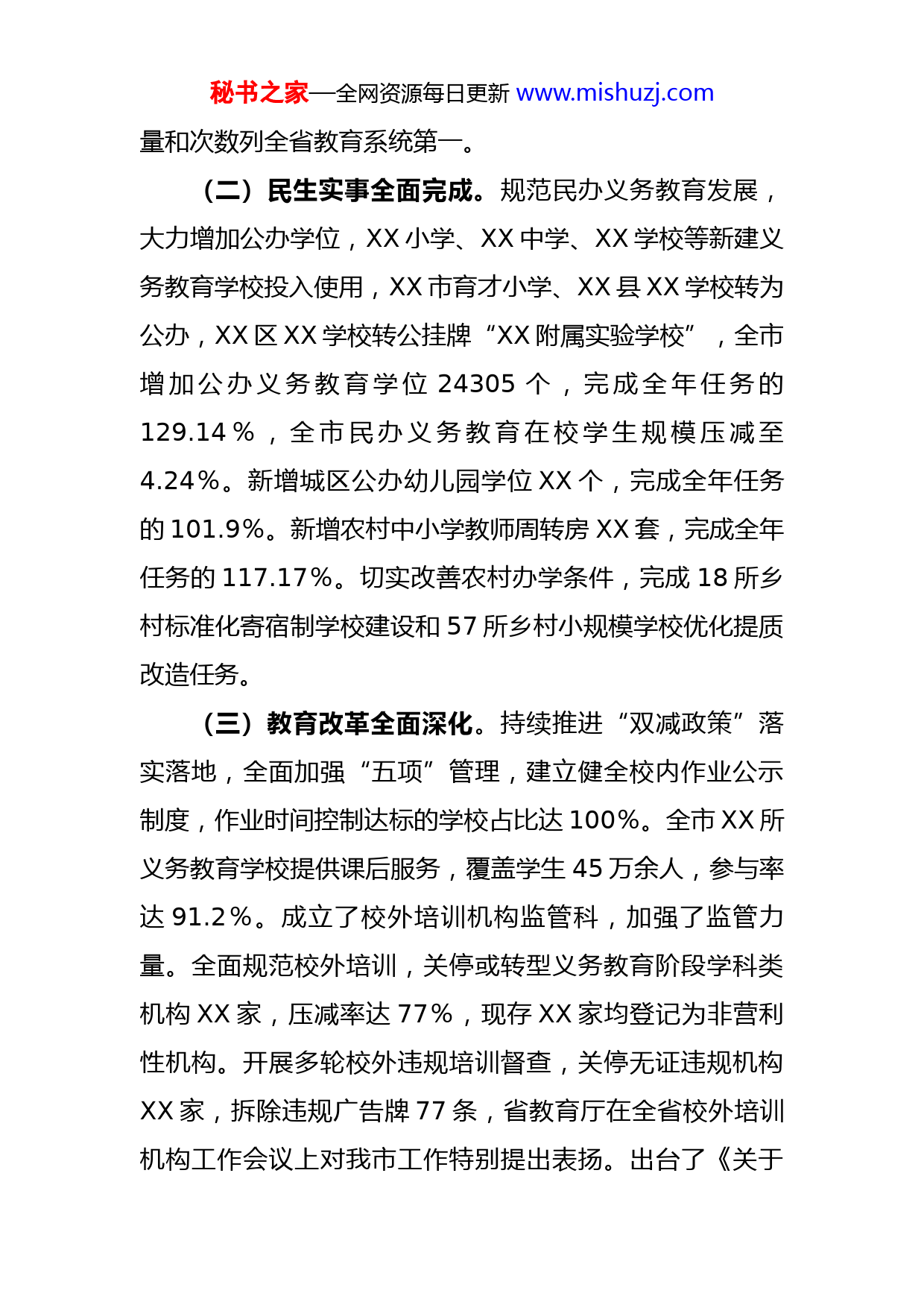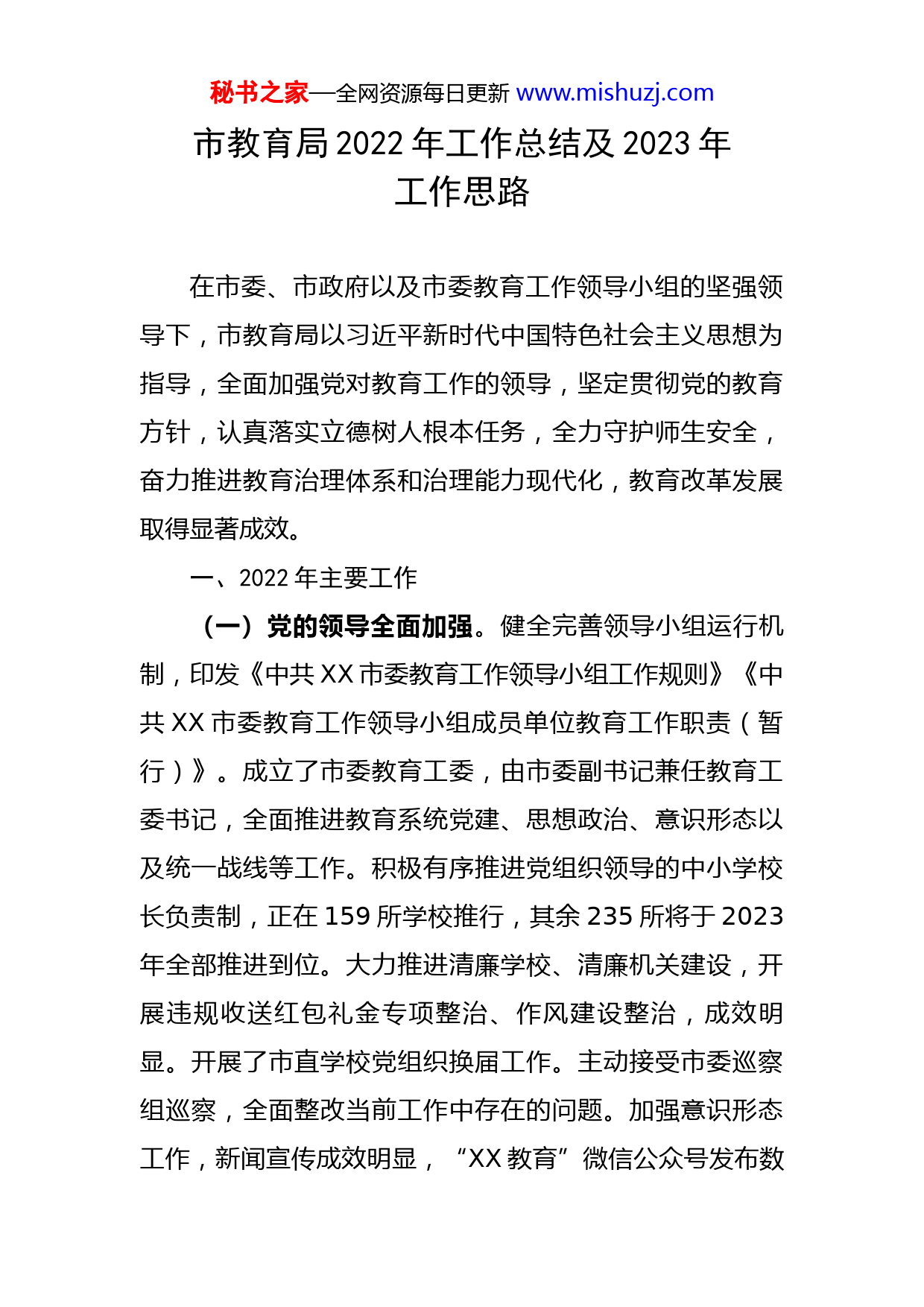 秘书之家—全网资源每日更新www.mishuzj.com市教育局2022年工作总结及2023年工作思路在市委、市政府以及市委教育工作领导小组的坚强领导下,市教育局以习近平新时代中国特色社会主义思想为指导,全面加强党对教育工作的领导,坚定贯彻党的教育方针,认真落实立德树人根本任务,全力守护师生安全,奋力推进教育治理体系和治理能力现代化,教育改革发展取得显著成效。一、2022年主要工作(一)党的领导全面加强。健全完善领导小组运行机制,印发《中共XX市委教育工作领导小组工作规则》《中共XX市委教育工作领导小组成员单位教育工作职责(暂行)》。成立了市委教育工委,由市委副书记兼任教育工委书记,全面推进教育系统党建、思想政治、意识形态以及统一战线等工作。积极有序推进党组织领导的中小学校长负责制,正在159所学校推行,其余235所将于2023年全部推进到位。大力推进清廉学校、清廉机关建设,开展违规收送红包礼金专项整治、作风建设整治,成效明显。开展了市直学校党组织换届工作。主动接受市委巡察组巡察,全面整改当前工作中存在的问题。加强意识形态工作,新闻宣传成效明显,“XX教育”微信公众号发布数秘书之家—全网资源每日更新www.mishuzj.com量和次数列全省教育系统第一。(二)民生实事全面完成。规范民办义务教育发展,大力增加公办学位,XX小学、XX中学、XX学校等新建义务教育学校投入使用,XX市育才小学、XX县XX学校转为公办,XX区XX学校转公挂牌“XX附属实验学校”,全市增加公办义务教育学位24305个,完成全年任务的129.14%,全市民办义务教育在校学生规模压减至4.24%。新增城区公办幼儿园学位XX个,完成全年任务的101.9%。新增农村中小学教师周转房XX套,完成全年任务的117.17%。切实改善农村办学条件,完成18所乡村标准化寄宿制学校建设和57所乡村小规模学校优化提质改造任务。(三)教育改革全面深化。持续推进“双减政策”落实落地,全面加强“五项”管理,建立健全校内作业公示制度,作业时间控制达标的学校占比达100%。全市XX所义务教育学校提供课后服务,覆盖学生45万余人,参与率达91.2%。成立了校外培训机构监管科,加强了监管力量。全面规范校外培训,关停或转型义务教育阶段学科类机构XX家,压减率达77%,现存XX家均登记为非营利性机构。开展多轮校外违规培训督查,关停无证违规机构XX家,拆除违规广告牌77条,省教育厅在全省校外培训机构工作会议上对我市工作特别提出表扬。出台了《关于秘书之家—全网资源每日更新www.mishuzj.com全面推进新时代教育督导体制机制改革的若干措施》,配备总督学并进入党组班子;扎实开展了对县级人民政府和党政主要领导履行教育职责评价工作,对XX县、XX区开展了实地评价;圆满完成省对市州人民政府履行教育职责评价的迎检工作,反响较好。(四)职业教育全面提升。全力实施职业教育XX行动,我市4所院校、10个专业(群)成功入围XX省XX高水平高职学校(优质中职学校)和专业(群)建设。实施中职达标工程,按照“一校一策”的标准,科学规划全市中职学校“A/B/C”类。已新增城区公办中职学位1300个,完成全年任务的100%。职教城项目前期规划准备工作有序推进。XX市XX中职学校改扩建项目已完成三通一平、施工图纸审查等工作,完成全年任务的80%。(五)素质教育全面推行。坚持“五育并举”,开足开齐体艺课,发挥好劳动教育的综合育人功能。继续实施第四期学前教育提升计划,实施“安吉游戏”推广计划,持续开展幼儿园“小学化”治理,促进科学保教。加强语言文字工作,组织开展“笔墨中国”汉字书写大赛、“诗语时光”诗文朗诵大赛。加强未成人思想道德建设,市教育关工委连续22年获全国主题教育先进。(六)队伍建设全面加强。招聘和引进教师2000余名,送培公费定向师范生XX名,录取优师专项XX人。加秘书之家—全网资源每日更新www.mishuzj.com强师德师风建设,连续X年开展了师德师风集中教育培训,经验在全省推介。组织XX人参加97个“国培”“省培”子项目,组织1746名市直学校教师参加信息技术应用能力提升工程2.0能力点考核。加强网络名师工作室建设,XX个工作室成为首批XX省名师网络工作室。加强农村师资力量,全市有“三区”支教教师XX名,有XX位教师参与中央银龄讲学计划。召开庆祝第38个教师节暨“双百工程”表彰大会,表彰了200名优秀教师和教育工作者。(七)安全工作全面抓稳。加强安全教育培训,组织XXX名校(园)长及校外培训机构负责人开展安全管理专题培训。扎实推进教育安全大检查“百日攻坚”,对教育系统政治安全、意识形态、自建房、学生防溺水、学生防性侵、消防、食品安全等进行了全面清理整治,坚决杜绝发生安全事件。开展自建房安全隐患排查整治,排查校内(含校外培训机构)建筑XX栋,拆除XX栋、维修加固23栋,封闭并停止使用20栋。加强中小学实验室危险化学品的管理与督查,有效规范校园实验室易制毒、易制爆等危险化学品在采购、贮存、使用、收集、处理环节的管理行为。扎实做好学生防溺水工作,投入XX万元加强人防、物防、技防建设,对XX人重点学生落实精准帮扶“双联”责任制,学生溺水事故得到有效遏制。成功创建省级秘书之家—全网资源每日更新www.mishuzj.com“平安建设示范校”XX所,中心城区建成校园警务室XX个。(八)疫情防线全面织牢。统