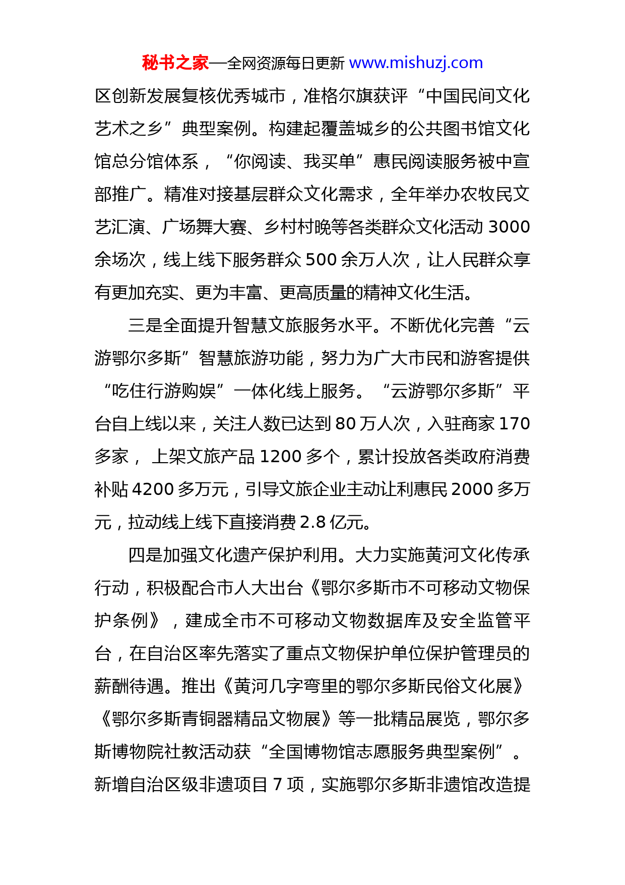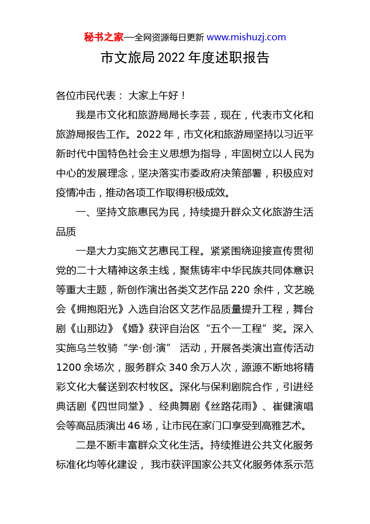 秘书之家—全网资源每日更新www.mishuzj.com市文旅局2022年度述职报告各位市民代表:大家上午好!我是市文化和旅游局局长李芸,现在,代表市文化和旅游局报告工作。2022年,市文化和旅游局坚持以习近平新时代中国特色社会主义思想为指导,牢固树立以人民为中心的发展理念,坚决落实市委政府决策部署,积极应对疫情冲击,推动各项工作取得积极成效。一、坚持文旅惠民为民,持续提升群众文化旅游生活品质一是大力实施文艺惠民工程。紧紧围绕迎接宣传贯彻党的二十大精神这条主线,聚焦铸牢中华民族共同体意识等重大主题,新创作演出各类文艺作品220余件,文艺晚会《拥抱阳光》入选自治区文艺作品质量提升工程,舞台剧《山那边》《婚》获评自治区“五个一工程”奖。深入实施乌兰牧骑“学·创·演”活动,开展各类演出宣传活动1200余场次,服务群众340余万人次,源源不断地将精彩文化大餐送到农村牧区。深化与保利剧院合作,引进经典话剧《四世同堂》、经典舞剧《丝路花雨》、崔健演唱会等高品质演出46场,让市民在家门口享受到高雅艺术。二是不断丰富群众文化生活。持续推进公共文化服务标准化均等化建设,我市获评国家公共文化服务体系示范秘书之家—全网资源每日更新www.mishuzj.com区创新发展复核优秀城市,准格尔旗获评“中国民间文化艺术之乡”典型案例。构建起覆盖城乡的公共图书馆文化馆总分馆体系,“你阅读、我买单”惠民阅读服务被中宣部推广。精准对接基层群众文化需求,全年举办农牧民文艺汇演、广场舞大赛、乡村村晚等各类群众文化活动3000余场次,线上线下服务群众500余万人次,让人民群众享有更加充实、更为丰富、更高质量的精神文化生活。三是全面提升智慧文旅服务水平。不断优化完善“云游鄂尔多斯”智慧旅游功能,努力为广大市民和游客提供“吃住行游购娱”一体化线上服务。“云游鄂尔多斯”平台自上线以来,关注人数已达到80万人次,入驻商家170多家,上架文旅产品1200多个,累计投放各类政府消费补贴4200多万元,引导文旅企业主动让利惠民2000多万元,拉动线上线下直接消费2.8亿元。四是加强文化遗产保护利用。大力实施黄河文化传承行动,积极配合市人大出台《鄂尔多斯市不可移动文物保护条例》,建成全市不可移动文物数据库及安全监管平台,在自治区率先落实了重点文物保护单位保护管理员的薪酬待遇。推出《黄河几字弯里的鄂尔多斯民俗文化展》《鄂尔多斯青铜器精品文物展》等一批精品展览,鄂尔多斯博物院社教活动获“全国博物馆志愿服务典型案例”。新增自治区级非遗项目7项,实施鄂尔多斯非遗馆改造提秘书之家—全网资源每日更新www.mishuzj.com升工程,组织开展了系列文化遗产保护宣传展示活动,切实让文化遗产保护“活起来”。二、多措并举纾困助企,加快文旅行业恢复发展一是强化精准政策扶持。精准落实国家、自治区和我市稳经济一揽子政策措施,推动市政府出台加快旅游业恢复发展15条政策措施,安排财政资金5000万元,持续为文旅企业纾困解难。积极倡导“鄂尔多斯人游鄂尔多斯”,累计发放“鄂尔多斯旅游一卡通”18.9万余张、核销旅游消费券1300万元,带动消费近1.1亿元,文旅消费信心不断提振。近期,正在集中开展文旅企业贷款贴息,文旅消费政策奖励兑现等工作,切实让文旅行业恢复发展更有信心、更有底气!二是不断优化营商环境。深化“放管服”改革,严格落实“三集中三到位”“一件事一次办”工作要求,简化办事流程,缩短办事时间、提升办事效率,全年共受理业务207件,全部高效办结。积极为文旅企业营造安心发展“暖环境”,在单位官网上开设了优化营商环境专栏和“企业心愿墙”政企互动板块,2021年全区营商环境评估中,鄂尔多斯市基本公共文化指标得分排名全区第一。不断优化文旅市场发展环境,深入开展“不合理低价游”、打击养老诈骗、私设“景点”问题专项整治行动。积极培育壮大各类文旅市场主体,新增四星级旅游饭店3家、丙秘书之家—全网资源每日更新www.mishuzj.com级旅游民宿1家、自治区文明旅游示范单位4家。三是打造旅游城市品牌。加快推进旅游休闲城市建设,大力发展生态旅游、康养旅游、乡村旅游、红色旅游、工业旅游、冰雪旅游等新业态。全市新增全国乡村旅游重点村镇2个、国家4A级景区1家、3A级旅游景区1家,获评国家3C级自驾车旅居车营地1家、自治区首批夜间文旅消费集聚区1家,自治区首批重点培育文化产业园区2家。深入开展城市形象宣传和文旅品牌推介,在全国10余个城市开展文旅宣传推介活动,浙江卫视《“食”万八千里》等多档热播综艺节目走进鄂尔多斯,“网红康巴什”的出圈之路获评全国旅游宣传推广优秀案例,打造了鄂尔多斯黄河几字弯生态文化旅游节、乡村文化旅游节、冰雪文化旅游季等品牌活动,不断扩大鄂尔多斯文化旅游影响力和美誉度。三、注重高效办理办结,积极回应社会关切我局高度重视人大代表建议和政协委员提案办理工作,不断完善工作机制,压实工作责任,强化跟踪问效,切实提高建议提案办理质量,今年共收到人大代表建议6件、政协委员提案16件,按时办结率均为100%,代表和委员满意率达100%。认真落实12345政务服务便民热线“接诉即办”工作要求,及时回应社会关切,切实解决百姓诉求问题,今年以来共受