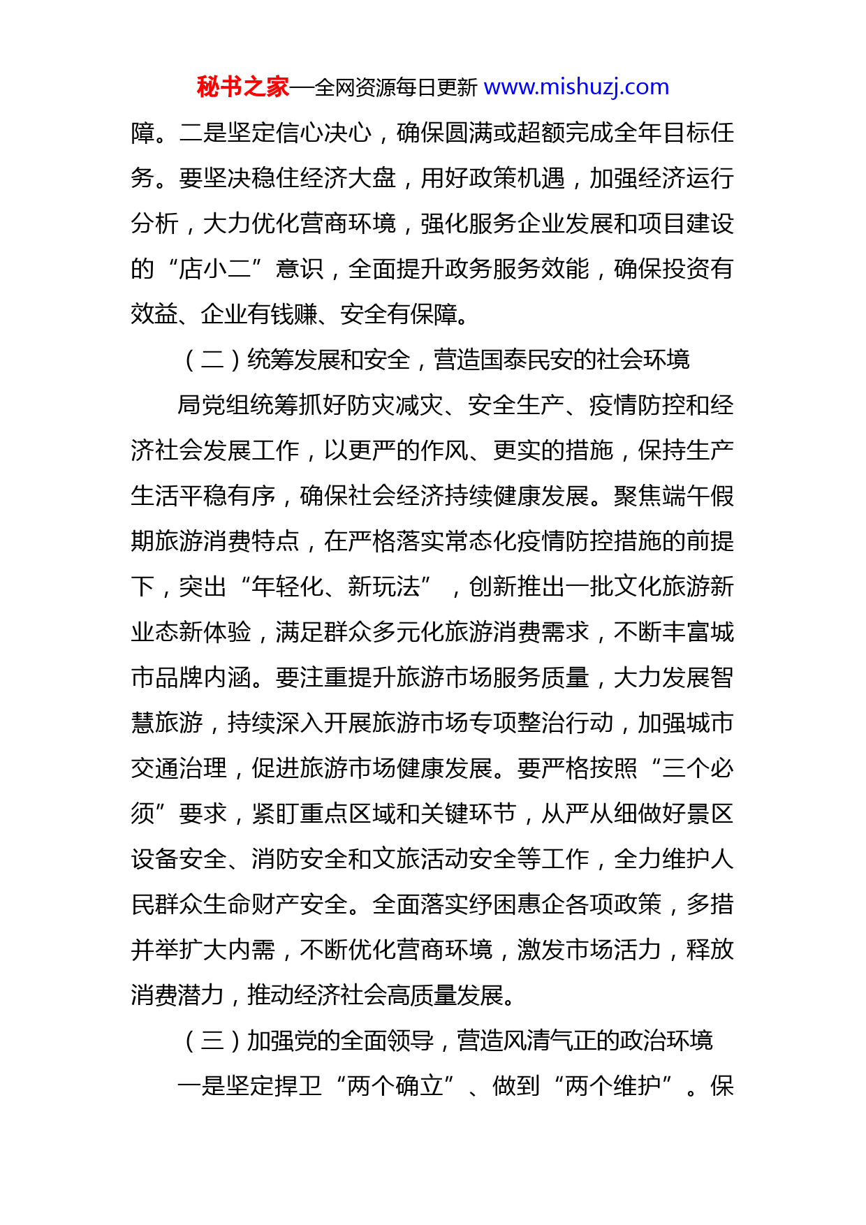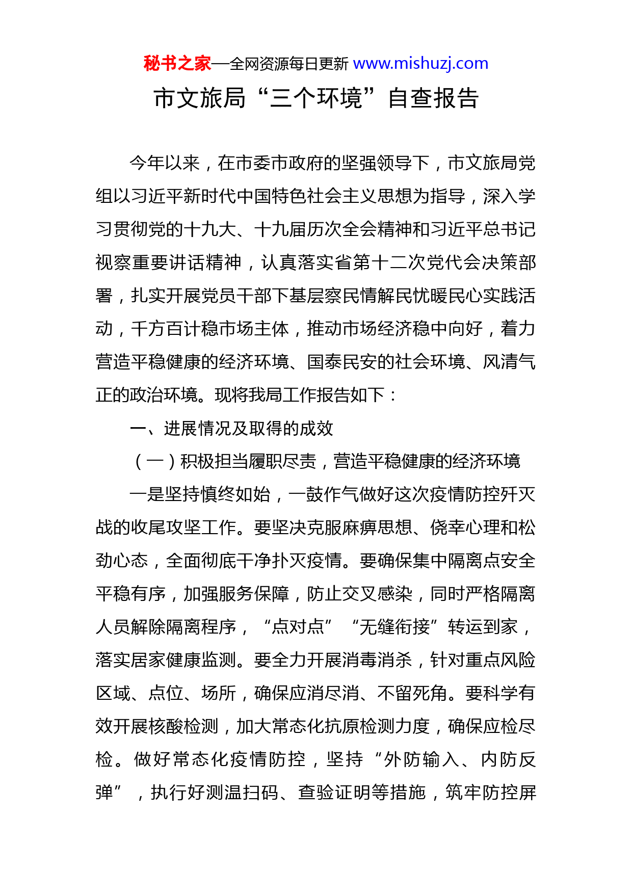 秘书之家—全网资源每日更新www.mishuzj.com市文旅局“三个环境”自查报告今年以来,在市委市政府的坚强领导下,市文旅局党组以习近平新时代中国特色社会主义思想为指导,深入学习贯彻党的十九大、十九届历次全会精神和习近平总书记视察重要讲话精神,认真落实省第十二次党代会决策部署,扎实开展党员干部下基层察民情解民忧暖民心实践活动,千方百计稳市场主体,推动市场经济稳中向好,着力营造平稳健康的经济环境、国泰民安的社会环境、风清气正的政治环境。现将我局工作报告如下:一、进展情况及取得的成效(一)积极担当履职尽责,营造平稳健康的经济环境一是坚持慎终如始,一鼓作气做好这次疫情防控歼灭战的收尾攻坚工作。要坚决克服麻痹思想、侥幸心理和松劲心态,全面彻底干净扑灭疫情。要确保集中隔离点安全平稳有序,加强服务保障,防止交叉感染,同时严格隔离人员解除隔离程序,“点对点”“无缝衔接”转运到家,落实居家健康监测。要全力开展消毒消杀,针对重点风险区域、点位、场所,确保应消尽消、不留死角。要科学有效开展核酸检测,加大常态化抗原检测力度,确保应检尽检。做好常态化疫情防控,坚持“外防输入、内防反弹”,执行好测温扫码、查验证明等措施,筑牢防控屏秘书之家—全网资源每日更新www.mishuzj.com障。二是坚定信心决心,确保圆满或超额完成全年目标任务。要坚决稳住经济大盘,用好政策机遇,加强经济运行分析,大力优化营商环境,强化服务企业发展和项目建设的“店小二”意识,全面提升政务服务效能,确保投资有效益、企业有钱赚、安全有保障。(二)统筹发展和安全,营造国泰民安的社会环境局党组统筹抓好防灾减灾、安全生产、疫情防控和经济社会发展工作,以更严的作风、更实的措施,保持生产生活平稳有序,确保社会经济持续健康发展。聚焦端午假期旅游消费特点,在严格落实常态化疫情防控措施的前提下,突出“年轻化、新玩法”,创新推出一批文化旅游新业态新体验,满足群众多元化旅游消费需求,不断丰富城市品牌内涵。要注重提升旅游市场服务质量,大力发展智慧旅游,持续深入开展旅游市场专项整治行动,加强城市交通治理,促进旅游市场健康发展。要严格按照“三个必须”要求,紧盯重点区域和关键环节,从严从细做好景区设备安全、消防安全和文旅活动安全等工作,全力维护人民群众生命财产安全。全面落实纾困惠企各项政策,多措并举扩大内需,不断优化营商环境,激发市场活力,释放消费潜力,推动经济社会高质量发展。(三)加强党的全面领导,营造风清气正的政治环境一是坚定捍卫“两个确立”、做到“两个维护”。保秘书之家—全网资源每日更新www.mishuzj.com持风清气正的政治环境,最根本的要求是上下一条心、全国一盘棋,全党坚决服从党中央统一指挥、统一协调、统一调度,做到令出如山、令行禁止。“两个确立”是深刻总结党的百年奋斗、党的十八大以来伟大实践得出的重大历史结论,是时代呼唤、历史选择、民心所向,是党和国家之幸、人民之幸、中华民族之幸。要坚定捍卫“两个确立”、做到“两个维护”,始终牢记“国之大者”,锚定党中央擘画的宏伟蓝图和确定的工作任务,识大体、顾大局,观大势、谋大事,自觉在大局下思考、在大局下行动。坚决贯彻落实习近平总书记重要讲话、重要指示批示和党中央决策部署,将自觉同党中央保持高度一致落实到行动上,体现到贯彻落实党的路线方针政策的实际行动上,体现到推动高质量发展的实际行动上,体现到为党分忧、为国尽责、为民奉献的实际行动上。二是严肃党内政治生活。良好政治环境和自然环境一样,稍不注意,就容易受到污染。必须严肃党内政治生活,激浊扬清、正本清源,铲除“污染源”,让党内正能量充沛,让歪风邪气无所遁形。要固本培元,加强思想教育,引导党员特别是领导干部筑牢信仰之基、补足精神之钙、把稳思想之舵,保持强大的政治定力、纪律定力、道德定力、抵腐定力。坚持正确选人用人导向,以用人环境涵养政治环境,支持和保护那些能干事、敢担当、善作为秘书之家—全网资源每日更新www.mishuzj.com的干部,形成见贤思齐、心齐气顺的良好氛围。用好党的组织生活、批评和自我批评等载体和手段,建设积极向上的党内政治文化,让干部在严肃党内政治生活中砥砺淬炼、百炼成钢。三是严明政治纪律和政治规矩。“两个维护”是党的最高政治原则和根本政治规矩,要把“两个维护”落实到制度规范、体制机制、行为规范、工作程序当中,筑牢风清气正政治环境的根基。立规明矩、扶正祛邪,严肃查处“七个有之”问题,严肃查处对党不忠诚不老实的两面派、两面人,拜码头搭天线搞结党营私的小山头、小团伙,坚决制止一切弱化党的领导、动摇党的执政基础、损害党的核心和党中央权威的言行。坚决纠正一些地方存在的政治意识淡化、党的领导弱化、党建工作虚化、责任落实软化等突出问题,弘扬和践行忠诚老实、公道正派、实事求是、清正廉洁等价值观,用严明的政治纪律营造良好的政治环境。四是落实管党治党政治责任。保持风清气正的政治环境,必须压实管党治党主体责任和监督责任。局党组始终把政治环境建设放在心上、抓在手上、扛在肩上,树好“风向标”,把好“作风关”,架好“高压