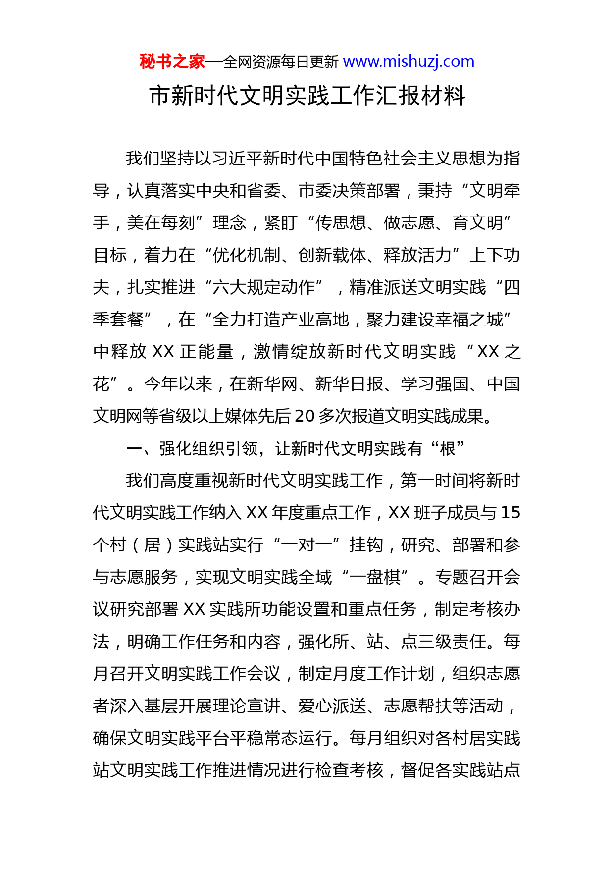 秘书之家—全网资源每日更新www.mishuzj.com市新时代文明实践工作汇报材料我们坚持以习近平新时代中国特色社会主义思想为指导,认真落实中央和省委、市委决策部署,秉持“文明牵手,美在每刻”理念,紧盯“传思想、做志愿、育文明”目标,着力在“优化机制、创新载体、释放活力”上下功夫,扎实推进“六大规定动作”,精准派送文明实践“四季套餐”,在“全力打造产业高地,聚力建设幸福之城”中释放XX正能量,激情绽放新时代文明实践“XX之花”。今年以来,在新华网、新华日报、学习强国、中国文明网等省级以上媒体先后20多次报道文明实践成果。一、强化组织引领,让新时代文明实践有“根”我们高度重视新时代文明实践工作,第一时间将新时代文明实践工作纳入XX年度重点工作,XX班子成员与15个村(居)实践站实行“一对一”挂钩,研究、部署和参与志愿服务,实现文明实践全域“一盘棋”。专题召开会议研究部署XX实践所功能设置和重点任务,制定考核办法,明确工作任务和内容,强化所、站、点三级责任。每月召开文明实践工作会议,制定月度工作计划,组织志愿者深入基层开展理论宣讲、爱心派送、志愿帮扶等活动,确保文明实践平台平稳常态运行。每月组织对各村居实践站文明实践工作推进情况进行检查考核,督促各实践站点秘书之家—全网资源每日更新www.mishuzj.com把新时代文明实践责任牢牢抓在手上、落实到具体行动中。二、强化阵地引推,让新时代文明实践有“枝”XX新时代文明实践所严格按照“五个一”标准打造实践阵地,同时整合党群、农社、政社等各部门资源,打造XX八大平台,集中举行授旗仪式,配置“8+N”志愿服务队伍,常态化开展志愿服务活动。建立村(居)文明实践站15个,按照“六大规定动作”,常态输送丰富的“营养液”,精心打造“一村一品”实践项目品牌。因地制宜,打造217个文明实践点的同时发挥就近就便功能,构建“10分钟志愿服务圈”,开展各类微小型志愿服务活动260多场,形成“政企联动、点面互动效应”。铁锚玻璃捐赠39台,总价值720万元的进囗医用呼吸机,支持抗疫。鼎德传动科技公司捐赠平面口罩打片机1台和防护口罩1万只,助力柬埔寨抗击疫情共渡难关。三、强化项目引导,让新时代文明实践有“叶”XXXX把志愿服务项目作为深化新时代文明实践工作的有效载体和有力抓手,聚焦群众需求,突出思想引领,统筹调度16支志愿服务队伍,精准推出“文化五进”“护苗行动”“爱心义剪”“欣连心”等一批具有鲜明特色的文明实践志愿服务项目。尤其是充分挖掘非公企业的潜力,通过搭建平台、配套服务、典型引领等形式激发非公企业秘书之家—全网资源每日更新www.mishuzj.com参与新时代文明实践志愿服务的热情。今年以来,已有60家企业成立文明实践志愿服务队,其中“理论百灵鸟”、“筑安冲锋连”、“烽火志愿队”更是成为特色志愿服务组织。我们还协助达欣集团成立了达欣集团鲁班传人·新时代文明实践站,发布了“欣”思想,“欣”福家,“欣”关怀,“欣”绿园等八项志愿服务项目。其中的“欣”福家(幸福改造家)项目更是获得江苏省第五届志交会金奖项目。各具特色、可复制可推广的志愿服务项目充分发挥了关心服务群众、教育引导群众、凝聚团结群众的作用,有力推动XX新时代文明实践工作深化拓展、提质增效,有效促进XX精神文明建设实起来、暖起来、强起来,激发和凝聚了广大人民群众昂扬向上奔小康、同心共筑中国梦的强大精神力量。四、强化服务引路,让新时代文明实践有“果”突出需求导向,各文明实践站点坚持带着使命、带着问题,深入村组、深入农户、深入企业、深入车间开展走访活动,及时了解掌握群众需求和诉求,举办“夏之韵”、“秋之实”、“冬之暖”系列主题实践活动28场。“防灾减灾平安在,文明实践幸福来”、“高温送清凉志愿沁人心”、“《中国制度面对面》知识竞赛”、“‘情暖重阳’万寿宴”等一批文明实践活动形成“眼球效应”。结合“中央一号文件进万家”“百团进万企”活秘书之家—全网资源每日更新www.mishuzj.com动,分赴各实践站点开展送理论、保安全、助脱贫、创文明等各类宣传宣讲30余场,把党的声音、党的关怀送到田头、暖入群众心头。常态化开展圆梦微心愿、全民阅读等活动,XX成立以来共为群众圆梦微心愿97条,实现率达100%。西园社区农家书屋管理员解宝悦更是作为全省唯一的农家书屋代表参加省2020年农家书屋重点出版物评审会,并以《夯实农家书屋之基绽放全民阅读之花》为题,亮点式推介全民阅读的“XX做法”。2020年各实践站点累计开展志愿服务活动1069次,志愿者活跃率达100%。通过我们的实际行动让基层群众切身感受到党的声音就在身边、社会的温暖就在身边、美好的生活就在身边。下一步,我们将以市委十三届十次全会精神为指导,持续唱响新时代文明实践四季歌,奋力推动新时代文明实践工作迈上新台阶,让“XX文明之花”在现代化新征程中开出更多更美更绚丽的花朵。一是突出“站位更高”,在“重点突破”上下功夫。新时代文明实践工作是一项政治工程、战略工程、民心工程,做好这项工作需要提高认识、群策群力、齐心协力、凝聚共识,把文明实践工作往心里去。二是突出“措施更新”,在“优化机制”上下功夫。要突出群