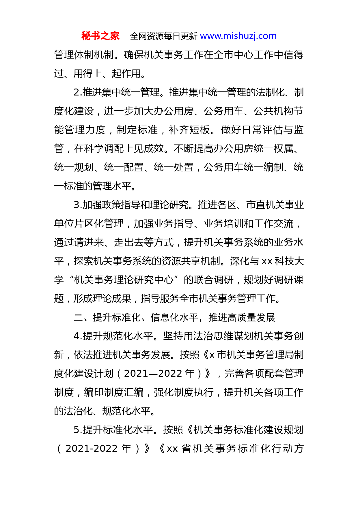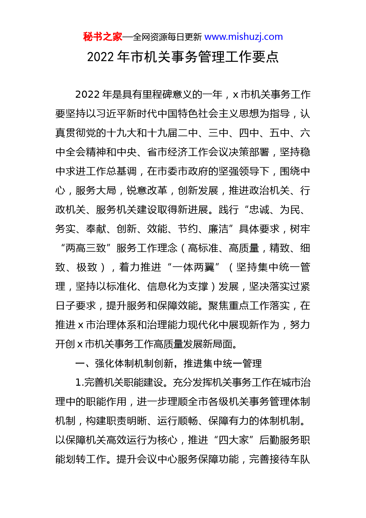 秘书之家—全网资源每日更新www.mishuzj.com2022年市机关事务管理工作要点2022年是具有里程碑意义的一年,x市机关事务工作要坚持以习近平新时代中国特色社会主义思想为指导,认真贯彻党的十九大和十九届二中、三中、四中、五中、六中全会精神和中央、省市经济工作会议决策部署,坚持稳中求进工作总基调,在市委市政府的坚强领导下,围绕中心,服务大局,锐意改革,创新发展,推进政治机关、行政机关、服务机关建设取得新进展。践行“忠诚、为民、务实、奉献、创新、效能、节约、廉洁”具体要求,树牢“两高三致”服务工作理念(高标准、高质量,精致、细致、极致),着力推进“一体两翼”(坚持集中统一管理,坚持以标准化、信息化为支撑)发展,坚决落实过紧日子要求,提升服务和保障效能。聚焦重点工作落实,在推进x市治理体系和治理能力现代化中展现新作为,努力开创x市机关事务工作高质量发展新局面。一、强化体制机制创新,推进集中统一管理1.完善机关职能建设。充分发挥机关事务工作在城市治理中的职能作用,进一步理顺全市各级机关事务管理体制机制,构建职责明晰、运行顺畅、保障有力的体制机制。以保障机关高效运行为核心,推进“四大家”后勤服务职能划转工作。提升会议中心服务保障功能,完善接待车队秘书之家—全网资源每日更新www.mishuzj.com管理体制机制。确保机关事务工作在全市中心工作中信得过、用得上、起作用。2.推进集中统一管理。推进集中统一管理的法制化、制度化建设,进一步加大办公用房、公务用车、公共机构节能管理力度,制定标准,补齐短板。做好日常评估与监管,在科学调配上见成效。不断提高办公用房统一权属、统一规划、统一配置、统一处置,公务用车统一编制、统一标准的管理水平。3.加强政策指导和理论研究。推进各区、市直机关事业单位片区化管理,加强业务指导、业务培训和工作交流,通过请进来、走出去等方式,提升机关事务系统的业务水平,探索机关事务系统的资源共享机制。深化与xx科技大学“机关事务理论研究中心”的联合调研,规划好调研课题,形成理论成果,指导服务全市机关事务管理工作。二、提升标准化、信息化水平,推进高质量发展4.提升规范化水平。坚持用法治思维谋划机关事务创新,依法推进机关事务发展。按照《x市机关事务管理局制度化建设计划(2021—2022年)》,完善各项配套管理制度,编印制度汇编,强化制度执行,提升机关各项工作的法治化、规范化水平。5.提升标准化水平。按照《机关事务标准化建设规划(2021-2022年)》《xx省机关事务标准化行动方秘书之家—全网资源每日更新www.mishuzj.com案》,完成公共机构能耗标准和政务会议服务标准的建设,谋划机关事务管理新标准的建设。选取业务成熟领域开展标准研制工作,强化与标准行政部门及专业机构的深度合作。6.提升信息化水平。认真贯彻落实数字政府建设规划,制订本部门信息化发展规划。拓展机关网站服务功能,探索建立市直党政机关大型会议室(含功能厅)共享使用平台,进一步完善办公用房、公务用车信息化管理平台,升级优化资源管理、数据更新及统计分析等系统功能。逐步将市级事业单位公务用车纳入公务用车信息化平台统一管理,推进各区(功能区)完善公务用车信息化管理平台功能。三、加强节约型机关建设,推进重点工作落实7.抓好市级重点工作落实。加大力度推进凯旋大厦项目维修主体工程完工,完善相关建设手续。服务经济发展,按照要求组织实施沿江大道市直党政机关办公用房腾退和调配工作。做好惠济路x号院政策性住房配售工作。持续做好文明创建和综合治理工作。9.提升后勤服务保障能力。建立市级大型接待、重大活动的公务用车保障机制,加强市级综合执法执勤用车保障平台的管理,提升对重大活动、重要会议、重点接待的服务质量。按“四大家”要求加强对相关物业服务的指导,秘书之家—全网资源每日更新www.mishuzj.com提高解放公园路x号院、永清庭院、惠济路x号院的物业管理服务水平。探索推进机关事业单位内部停车场服务群众、电动汽车租赁和机关干部的保障住房的相关办法。10.推进绿色机关建设。树牢过紧日子思想,加大绿色机关建设宣传力度,提倡节约一滴水、一度电、一粒米、一张纸、一分钱的节俭理念。制定节约型机关考核指标体系,持续开展节约型公共机构示范单位和节水型单位创建工作,开展公共机构能耗统计数据质量抽查,开展公共机构能源审计,推动节能降耗工作上新台阶。推进党政机关等公共机构生活垃圾分类工作,加强对垃圾分类的考核和检查,推进新能源、新技术、新模式在公共机构的应用,落实新能源汽车在党政机关的配备比例。四、强化“两个责任落实”,推进模范机关建设11.始终把政治建设摆在首位。牢牢把握机关运行保障的政治功能、政治定位、政治效果。巩固拓展“两学一做”“不忘初心,牢记使命”主题教育、党史学习教育成果,持续加强政治纪律和政治规矩教育,掌握意识形态工作的主动权,引导全体党员干部树牢“四个意识”、坚定“四个自信”、坚决做到“两个维护”。12.坚决落实管党治党主体责任。加强党组班子建设,制订党组理论中心组学习计划,建立主体责任清单和廉政建设责任清单,落实好重大事项报告制度。坚持民主