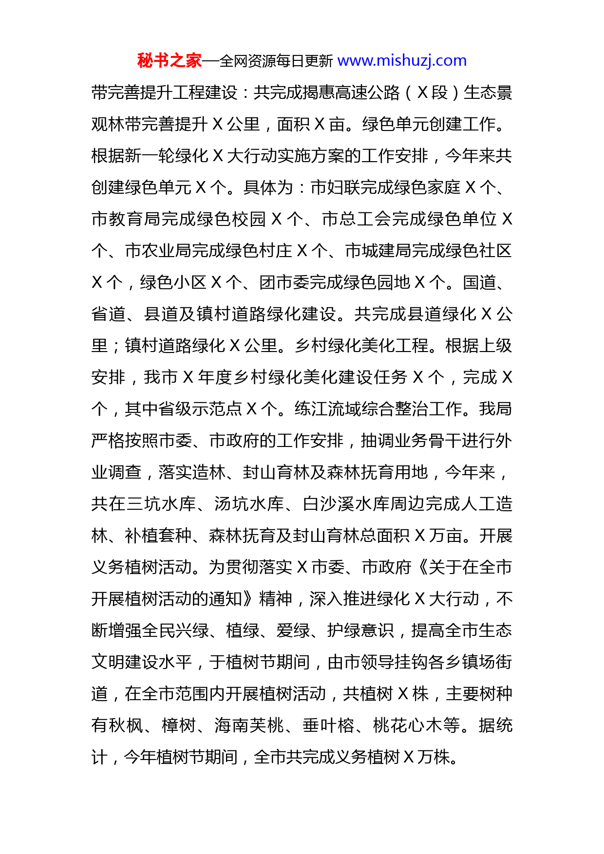 秘书之家—全网资源每日更新www.mishuzj.com市林业局在老区建设促进会上的汇报材料2021年,我局在市委、市政府的正确领导,在上级主管部门的大力支持和指导下,认真贯彻落实党的十九届四中、五中、六中全会以及习近平总书记系列重要讲话精神,紧紧围绕新一轮绿化X大行动,狠抓森林资源培育和管护,积极构建稳定安全的森林生态体系,提升生态文明水平,取得了较好的成效,全市生态环境得到了有效保护,人居生态环境进一步提升。至X年底,全市林业用地面积X万公顷,有林地面积X万公顷,其中省级生态公益林面积X万亩,森林活立木蓄积量X万立方米,森林覆盖率X%,林地绿化率X%;完成全民义务植树X万株。现将有关情况汇报如下:一、狠抓造林绿化,全力推进林业生态建设按照揭阳市委、市政府和我市市委、市政府确定的工作目标,我局认真贯彻落实《森林法》《关于开展全民义务植树运动的决议》和《广东省全民义务植树条例》等法律法规,积极争取造林资金,扎实推进各项林业重点生态工程建设,取得了良好成效,全市生态水平稳步提升。森林碳汇工程建设。X年度共完成森林碳汇工程建设X亩。一是完成中央防护林工程X亩,其中人工造林X亩、封山育林X亩;二是完成省级森林碳汇工程X亩。生态景观林秘书之家—全网资源每日更新www.mishuzj.com带完善提升工程建设:共完成揭惠高速公路(X段)生态景观林带完善提升X公里,面积X亩。绿色单元创建工作。根据新一轮绿化X大行动实施方案的工作安排,今年来共创建绿色单元X个。具体为:市妇联完成绿色家庭X个、市教育局完成绿色校园X个、市总工会完成绿色单位X个、市农业局完成绿色村庄X个、市城建局完成绿色社区X个,绿色小区X个、团市委完成绿色园地X个。国道、省道、县道及镇村道路绿化建设。共完成县道绿化X公里;镇村道路绿化X公里。乡村绿化美化工程。根据上级安排,我市X年度乡村绿化美化建设任务X个,完成X个,其中省级示范点X个。练江流域综合整治工作。我局严格按照市委、市政府的工作安排,抽调业务骨干进行外业调查,落实造林、封山育林及森林抚育用地,今年来,共在三坑水库、汤坑水库、白沙溪水库周边完成人工造林、补植套种、森林抚育及封山育林总面积X万亩。开展义务植树活动。为贯彻落实X市委、市政府《关于在全市开展植树活动的通知》精神,深入推进绿化X大行动,不断增强全民兴绿、植绿、爱绿、护绿意识,提高全市生态文明建设水平,于植树节期间,由市领导挂钩各乡镇场街道,在全市范围内开展植树活动,共植树X株,主要树种有秋枫、樟树、海南芙桃、垂叶榕、桃花心木等。据统计,今年植树节期间,全市共完成义务植树X万株。秘书之家—全网资源每日更新www.mishuzj.com二、依法管理,确保森林资源安全强化源头管理,严格控制木材采伐。我局认真落实“严管林”措施,严格执行木材采伐限额制度,实行批砍一支笔、采伐一本帐,凭证采伐,严格限额采伐、加强采伐源头管理,确保森林消耗总量低于生长量,保持良好的生态环境。加强林地管理。严格执行森林资源采伐限额管理制度,认真落实破坏森林资源责任追究制度,有针对性地开展“红线行动”“打击非法占用林地等涉林违法犯罪专项行动”等专项行动,整合森林公安和林业行政执法力量,严厉打击涉林违法行为,特别是加大对毁林造坟的巡查力度,坚决制止和查处违法使用林地等行为。今年来,依法查处林业行政案件X宗,其中擅自改变林地用途X宗,野外随意用火X宗,盗伐滥伐林木X宗。狠狠地打击了破坏森林资源违法犯罪分子的嚣张气焰,有效地保护了我市森林资源安全。加强管护,确保成活成林。三分造林七分管,为了防止栽树不见树的现象,我局切实加强对新造林的管护,特别对于公路两侧新栽树木,及时加强浇水、培墩、病虫害防治等管护措施,确保有人栽树、有人管护,对于荒山绿化及时落实专人看护,保证荒山绿化栽一棵活一棵,造一片成一片。加强野生动物保护管理。野生动物是森林资源的重要组成部分,我局认真贯彻实施《野生动物保护法》和上级主管部门的有关文件精神,强秘书之家—全网资源每日更新www.mishuzj.com化野生动物保护管理,对非法贩卖野生动物及其产品的行为,及时进行查处。今年来,我市在汕头市中心动物园寄养蟒蛇X条。严格控制林业有害生物。我局高度重视林业有害生物除治工作,及时制订除治方案,有效遏制了林业有害生物的扩散和蔓延。今年来,组织专业技术人员分别在疫情较为严重的广太镇胶北村田螺池水库边、流沙北街道西陇村马嘶岩山及池尾街道塘边村山等地进行除治工作。共除治有害生物面积X亩,取得良好成效。三、狠抓森林防火,维护林业生态安全我局认真贯彻“预防为主、积极消灭”的方针,把森林防火工作作为林业工作的重中之重来抓,采取有效措施,加大工作力度,周密部署,积极做好森林火灾的预防和扑救工作。X年我市森林火灾大幅下降,没有发生大的森林火灾和人员伤亡事故。加强管理,全面落实责任。按照森林防火行政领导负责制“五条标准”,全面落实地方行政首长负责制和部门分工责任制,层层落实森林防火工作责任制。一是及时下发了文件X个,及时召开相关会议,要求各单位领导高度重视,狠抓森林防火工作,责任落实到人,常抓不懈,确保绿化成果不受森林火灾的危害。二是