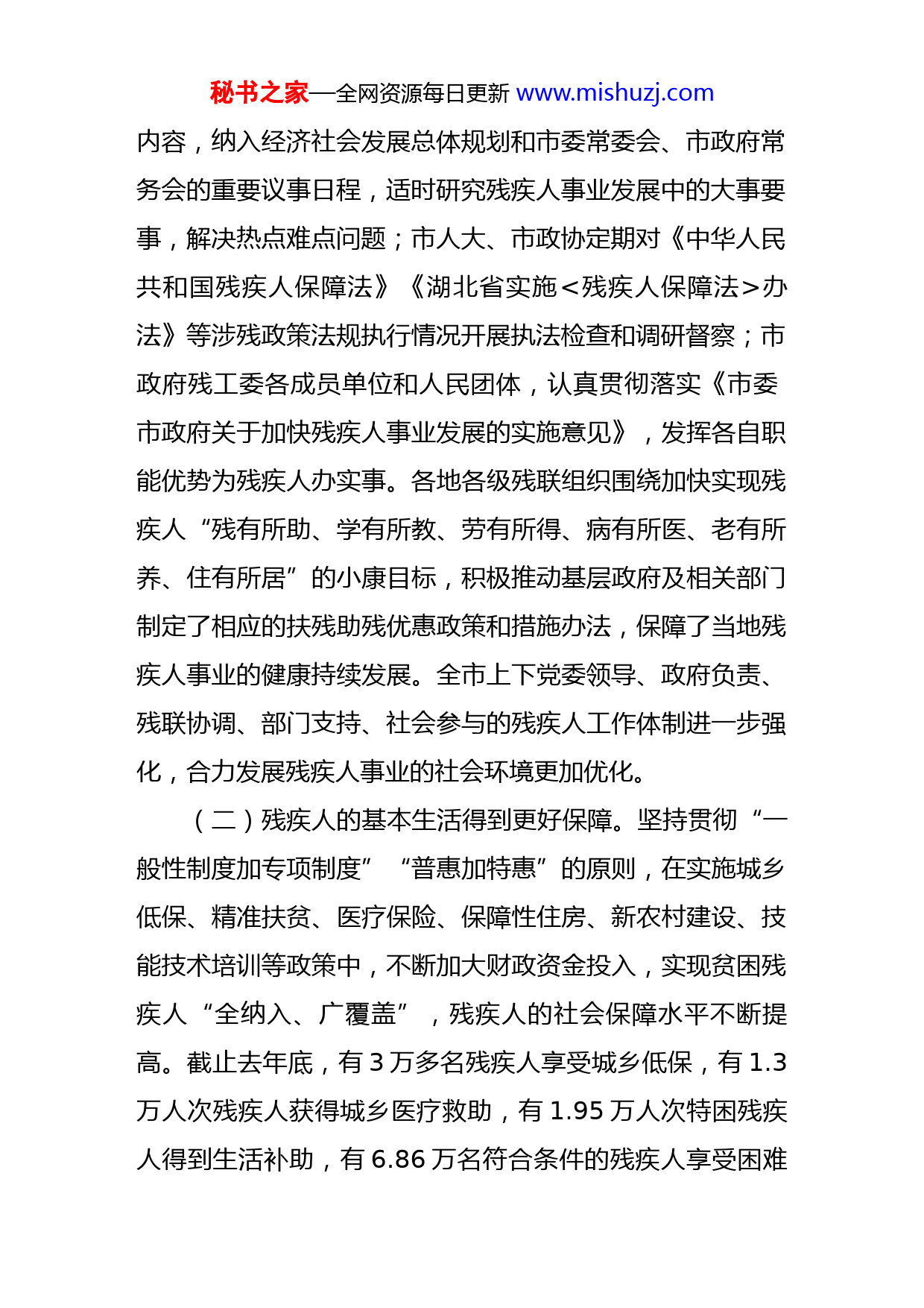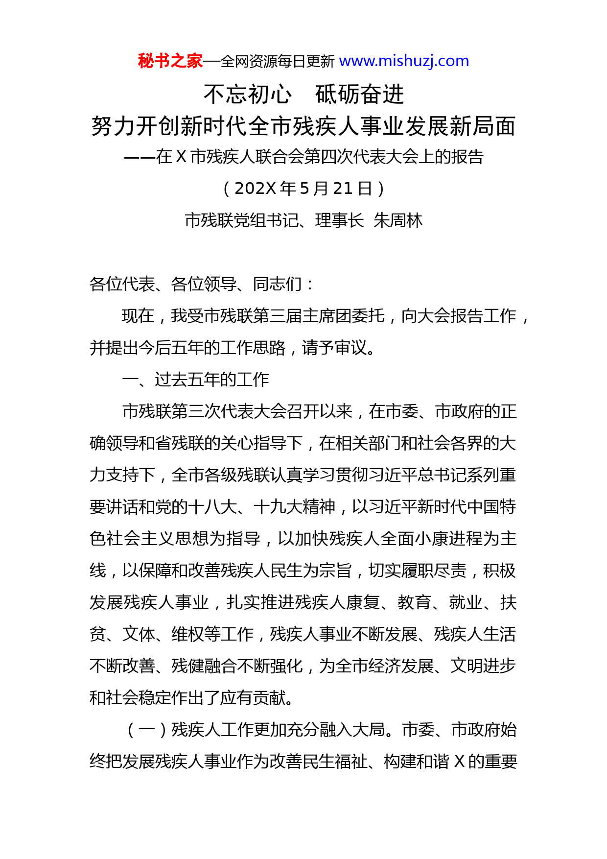 秘书之家—全网资源每日更新www.mishuzj.com不忘初心砥砺奋进努力开创新时代全市残疾人事业发展新局面——在X市残疾人联合会第四次代表大会上的报告(202X年5月21日)市残联党组书记、理事长朱周林各位代表、各位领导、同志们:现在,我受市残联第三届主席团委托,向大会报告工作,并提出今后五年的工作思路,请予审议。一、过去五年的工作市残联第三次代表大会召开以来,在市委、市政府的正确领导和省残联的关心指导下,在相关部门和社会各界的大力支持下,全市各级残联认真学习贯彻习近平总书记系列重要讲话和党的十八大、十九大精神,以习近平新时代中国特色社会主义思想为指导,以加快残疾人全面小康进程为主线,以保障和改善残疾人民生为宗旨,切实履职尽责,积极发展残疾人事业,扎实推进残疾人康复、教育、就业、扶贫、文体、维权等工作,残疾人事业不断发展、残疾人生活不断改善、残健融合不断强化,为全市经济发展、文明进步和社会稳定作出了应有贡献。(一)残疾人工作更加充分融入大局。市委、市政府始终把发展残疾人事业作为改善民生福祉、构建和谐X的重要秘书之家—全网资源每日更新www.mishuzj.com内容,纳入经济社会发展总体规划和市委常委会、市政府常务会的重要议事日程,适时研究残疾人事业发展中的大事要事,解决热点难点问题;市人大、市政协定期对《中华人民共和国残疾人保障法》《湖北省实施<残疾人保障法>办法》等涉残政策法规执行情况开展执法检查和调研督察;市政府残工委各成员单位和人民团体,认真贯彻落实《市委市政府关于加快残疾人事业发展的实施意见》,发挥各自职能优势为残疾人办实事。各地各级残联组织围绕加快实现残疾人“残有所助、学有所教、劳有所得、病有所医、老有所养、住有所居”的小康目标,积极推动基层政府及相关部门制定了相应的扶残助残优惠政策和措施办法,保障了当地残疾人事业的健康持续发展。全市上下党委领导、政府负责、残联协调、部门支持、社会参与的残疾人工作体制进一步强化,合力发展残疾人事业的社会环境更加优化。(二)残疾人的基本生活得到更好保障。坚持贯彻“一般性制度加专项制度”“普惠加特惠”的原则,在实施城乡低保、精准扶贫、医疗保险、保障性住房、新农村建设、技能技术培训等政策中,不断加大财政资金投入,实现贫困残疾人“全纳入、广覆盖”,残疾人的社会保障水平不断提高。截止去年底,有3万多名残疾人享受城乡低保,有1.3万人次残疾人获得城乡医疗救助,有1.95万人次特困残疾人得到生活补助,有6.86万名符合条件的残疾人享受困难秘书之家—全网资源每日更新www.mishuzj.com生活补贴和重度护理补贴。在城市,将符合条件的低收入残疾人家庭优先纳入廉租房、公租房保障范围;在农村,实施贫困残疾人危房改造1300余户。分期分批对300户贫困残疾人家庭和部分社区、残疾人康复机构实施无障碍改造;为9525人次重度残疾人提供托养服务,为1400多人次下肢残疾人发放了机动轮椅车燃油补贴。争取省残联健康快车“光明行”、省残疾人福利基金会爱心企业物资捐赠、中国残联长江新里程“关心你的残疾人邻居”、明智基金“关爱脑瘫患儿公益行”等项目落户我市,使我市残疾人分享了福利慈善项目“红利”。有效实施精准扶贫战略,帮扶1.7万名残疾人相继脱贫。(三)残疾人的基本公共服务不断拓展。残疾人公共服务体系基本建立,服务领域不断延伸,服务能力不断提升。通过实施白内障免费复明手术、辅助器具适配、精神病患者医疗救助、残疾儿童抢救性康复、脊髓损伤者“希望之家”生活重建等重点项目,累计为4万多人次残疾人提供了精准康复服务;发挥部门联动作用,推进残疾人学前康复教育、适龄残疾儿童少年义务教育、特殊教育和中高等教育协调发展,重点帮扶贫困残疾学生1165人次、0至6岁贫困残疾儿童4279人次;2万余名残疾人免费接受职业技能和实用技术培训;开展“春风行动”“就业援助月”和专项招聘会等活动,拓展了残疾人就业创业渠道;重点资助1000多户秘书之家—全网资源每日更新www.mishuzj.com农村残疾人发展种植、养殖业、小型加工业和生态旅游服务业;支持创办了一批残疾人就业示范基地和自强创业示范基地,3900余名残疾人实现个体创业,涌现出一大批残疾人自强创业典型,有3人被评为全省第二届残疾人“创业之星”。2015年10月,省残联在我市召开了全省肢协创业就业经验交流会。X组队参加第五届全省残疾人职业技能竞赛,获得团体第四名的好成绩,有一名残疾人选手夺得计算机组装项目第一名。(四)残疾人平等参与社会活动更加广泛。倡导“残健共融”理念,积极举办残健联谊会、残疾人文化周、世界读书日、全国助残日残疾人文艺演出等活动,不断满足残疾人的精神文化需求,促进残疾人平等融于社会生活。重视残疾人文体人才培养选拔工作,踊跃参加全国全省残疾人文体赛事,在全省第九届残疾人文艺汇演中位居第三名、在全省第十四届运动会暨第九届残运会上获得24枚奖牌和“体育道德风尚奖”;组织残疾人轮椅舞蹈队参加了中国残联举办的首届全国肢残人轮椅马拉松健身赛及肢残人健身项目展示活动,我市参赛表演的轮椅太极拳《问道武当》大为出彩;市盲人足球队多次代表湖北省参加全国盲