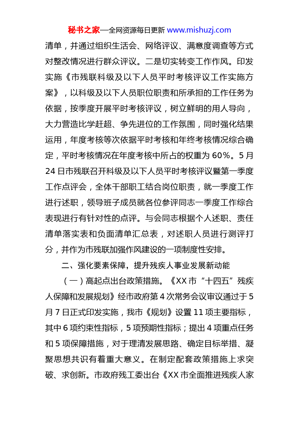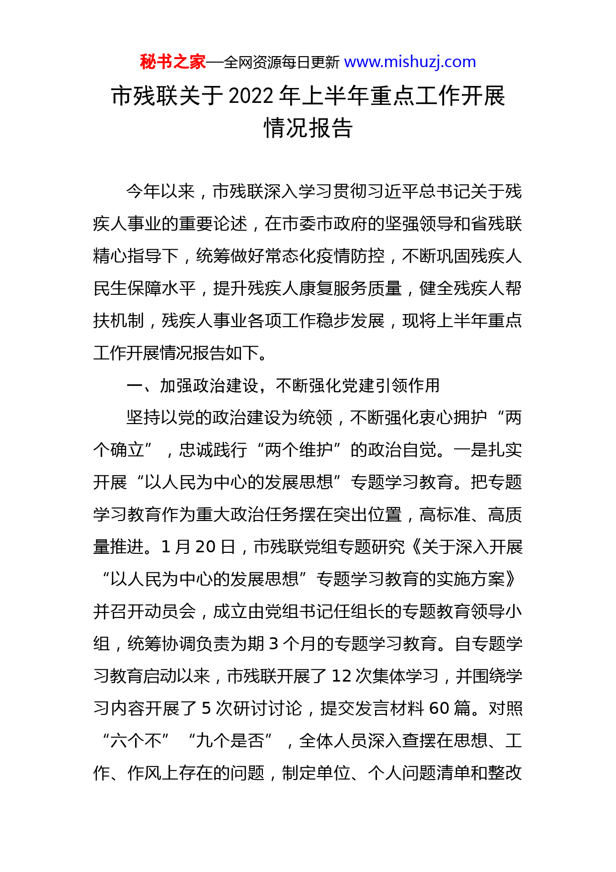 秘书之家—全网资源每日更新www.mishuzj.com市残联关于2022年上半年重点工作开展情况报告今年以来,市残联深入学习贯彻习近平总书记关于残疾人事业的重要论述,在市委市政府的坚强领导和省残联精心指导下,统筹做好常态化疫情防控,不断巩固残疾人民生保障水平,提升残疾人康复服务质量,健全残疾人帮扶机制,残疾人事业各项工作稳步发展,现将上半年重点工作开展情况报告如下。一、加强政治建设,不断强化党建引领作用坚持以党的政治建设为统领,不断强化衷心拥护“两个确立”,忠诚践行“两个维护”的政治自觉。一是扎实开展“以人民为中心的发展思想”专题学习教育。把专题学习教育作为重大政治任务摆在突出位置,高标准、高质量推进。1月20日,市残联党组专题研究《关于深入开展“以人民为中心的发展思想”专题学习教育的实施方案》并召开动员会,成立由党组书记任组长的专题教育领导小组,统筹协调负责为期3个月的专题学习教育。自专题学习教育启动以来,市残联开展了12次集体学习,并围绕学习内容开展了5次研讨讨论,提交发言材料60篇。对照“六个不”“九个是否”,全体人员深入查摆在思想、工作、作风上存在的问题,制定单位、个人问题清单和整改秘书之家—全网资源每日更新www.mishuzj.com清单,并通过组织生活会、网络评议、满意度调查等方式对整改情况进行群众评议。二是切实转变工作作风。印发实施《市残联科级及以下人员平时考核评议工作实施方案》,以科级及以下人员职位职责和所承担的工作任务为依据,按季度开展平时考核评议,树立鲜明的用人导向,大力营造比学赶超、争先进位的工作氛围,同时强化结果运用,年度考核等次依据平时考核和年终考核情况综合确定,平时考核情况在年度考核中所占的权重为60%。5月24日市残联召开科级及以下人员平时考核评议暨第一季度工作点评会,全体干部职工结合岗位职责,就一季度工作进行述职,领导班子成员就各位参评同志一季度工作综合表现进行有针对性的点评。与会同志根据个人述职、责任清单落实表和负面清单汇总表,对述职人员进行测评打分,并作为市残联加强作风建设的一项制度性安排。二、强化要素保障,提升残疾人事业发展新动能(一)高起点出台政策措施。《XX市“十四五”残疾人保障和发展规划》经市政府第4次常务会议审议通过于5月7日正式印发实施,我市《规划》设置11项主要指标,其中6项约束性指标,5项预期性指标;提出4项重点任务和5项保障措施,对于理清发展思路、确定目标举措、凝聚思想共识有着重大意义。在制定配套政策措施上求突破、求创新。市政府残工委出台《XX市全面推进残疾人家秘书之家—全网资源每日更新www.mishuzj.com庭医生签约服务重点联系点工作实施方案》,全面开展残疾人家庭医生签约服务重点联系工作,在总结金寨县作为试点基础上,其他县区均选择一或二个乡镇开展残疾人家庭医生签约服务重点联系点工作,依托重点联系点所在乡镇建设残疾人“康复之家”,进一步探索有利于残疾人康复服务的最佳路径。印发实施《XX市“十四五”残疾人康复服务实施方案》,为我市“十四五”残疾人康复服务工作高质量发展提供根本遵循。代市政府草拟《XX市残疾预防行动计划(2022-2025年)》,在提高文件的突破性、创新性和可操作性上下下功夫,目前正在征求意见建议。(二)高站位谋划改革创新。一是认真落实“优化残疾人证办理”改革项目。联合市卫健委、市数管局印发《关于优化残疾人证办理工作的通知》,各县区残联积极对接相关单位,通过召开专题会议、下发文件等方式进行安排部署,推进该项改革任务落地见效。截至5月底,全市各县区已全部将残疾人证申请权限全部下放到乡镇政务服务中心,正在有序办理群众申请残疾人证业务。同时,针对行动不便或边远山区的残疾人开辟绿色通道,完善上门办证机制,打通服务残疾人“最后一公里”。二是积极推进“凤凰健康助残项目”。对接“凤凰健康助残项目”工作组,开展选点、装修、布展以及政策制定等工作,建秘书之家—全网资源每日更新www.mishuzj.com设市级医疗康复器具展示服务中心和综合服务平台,进行线上和线下相结合的辅具服务模式,为需求者提供适配服务,最大限度满足残疾人个性化辅助器具需求。三、紧盯重点领域,努力提高扶残助残能力按照市政府“时间过半,任务过六”的要求,以“十四五”残疾人保障和发展规划为目标,以年度各项工作要点为准绳,聚焦重点领域和关键环节,在强化担当作为上实现了新突破。(一)提升残疾人康复质效。及时下发《XX市2022年残疾人康复工作要点》,依据2021年全国残联信息化服务平台基本状况调查统计数据,下达2022年全市残疾人康复服务任务目标。认真落实康复定点机构督查暗访,针对疫情防控、安全管理、康复教学等方面,开展复课暗访督查,进一步强化定点机构按照“两案九制”落实主体责任,动态做好师生及家长常态化疫情防控核酸检测抽检和风险接触信息档案,规范开展每日环境清洁消杀,强提高师生及家长疫情防控及安全管理思想认识。开展“阳光伴我行”集善明门儿童轮椅项目捐赠活动,为99名符合条件的儿童捐赠了轮椅;做客市广播电台“政风行风”,针对今年以来全市残疾人康复工作开展情况,以及2022年困难残疾人