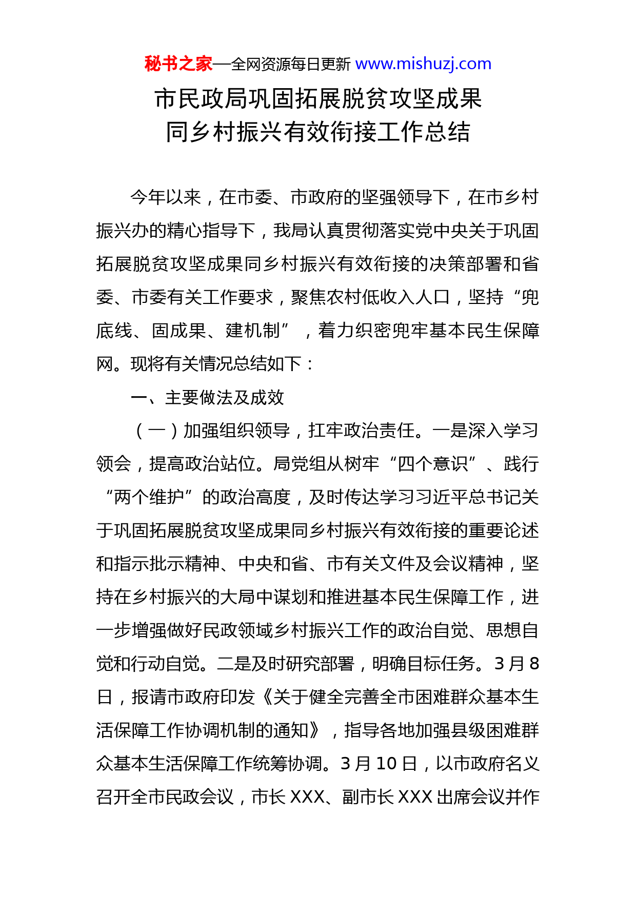 秘书之家—全网资源每日更新www.mishuzj.com市民政局巩固拓展脱贫攻坚成果同乡村振兴有效衔接工作总结今年以来,在市委、市政府的坚强领导下,在市乡村振兴办的精心指导下,我局认真贯彻落实党中央关于巩固拓展脱贫攻坚成果同乡村振兴有效衔接的决策部署和省委、市委有关工作要求,聚焦农村低收入人口,坚持“兜底线、固成果、建机制”,着力织密兜牢基本民生保障网。现将有关情况总结如下:一、主要做法及成效(一)加强组织领导,扛牢政治责任。一是深入学习领会,提高政治站位。局党组从树牢“四个意识”、践行“两个维护”的政治高度,及时传达学习习近平总书记关于巩固拓展脱贫攻坚成果同乡村振兴有效衔接的重要论述和指示批示精神、中央和省、市有关文件及会议精神,坚持在乡村振兴的大局中谋划和推进基本民生保障工作,进一步增强做好民政领域乡村振兴工作的政治自觉、思想自觉和行动自觉。二是及时研究部署,明确目标任务。3月8日,报请市政府印发《关于健全完善全市困难群众基本生活保障工作协调机制的通知》,指导各地加强县级困难群众基本生活保障工作统筹协调。3月10日,以市政府名义召开全市民政会议,市长XXX、副市长XXX出席会议并作秘书之家—全网资源每日更新www.mishuzj.com重要讲话,对巩固脱贫攻坚兜底保障成果、推进民政领域乡村振兴工作进行安排部署。4月28日,举办全市社会救助工作培训班,提高基层经办人员政策水平。将巩固兜底保障成果纳入对各县(市、区)党委政府2021年度目标考核“社会救助政策落实情况”指标体系,细化目标任务,压实各地责任。三是加强检查督促,压实监管责任。将巩固拓展脱贫攻坚成果同乡村振兴有效衔接纳入年度民政重点工作任务,建立调度、提示、督办、通报机制,先后印发《2021年上半年社会救助政策落实进展情况的通报》《关于全面完成年度重点目标任务的提示》,指导督促各地坚持问题导向、补齐工作短板。(二)保持政策稳定,强化兜底保障。一是加强政策指导,调整保障标准。3月14日,经市政府常务会议审议同意,在全省市州首个以市政府名义制定印发《XX市社会救助对象家庭经济状况评估认定办法》,明确和规范社会救助家庭经济状况评估认定的对象、指标、方法、程序及结果运用。7月22日,报请市政府调整并公布2021年度全市城乡低保、特困供养、孤儿养育和低收入家庭认定标准,保持农村低保、特困供养标准“达标不降”。修订《XX市困难群众临时救助实施办法》,进一步完善优化分类分档救助办法及标准。二是加强数据比对,完善监测机制。开展社会救助兜底脱贫成果“回头看”,定期比对、秘书之家—全网资源每日更新www.mishuzj.com全面排查未纳入兜底保障范围的“三类人口”,及时将XXXX名符合条件的对象纳入农村低保或特困供养范围,确保“应兜尽兜、不漏一人”。加大与乡村振兴、医保、残联等部门信息共享和数据比对力度,在全省率先建立全市低收入人口监测平台,初步汇集形成全市困难群众数据库,建立完善线上监测预警、线下核查反馈的防返贫致贫动态监测机制,做到“早发现、早救助、早帮扶”。三是加强分类施策,提高救助水平。指导督促各地精准落实农村低保、特困供养、临时救助、残疾人“两项补贴”、孤儿保障等兜底保障政策,加大“重点救助”“单人施保”“特困扩围”“分类救助”力度,不断提高农村低收入人口救助水平。截至12月底,全市现有农村低保对象XXXX万人,其中脱贫人口XXX万人,月人均补助标准XXX元;农村特困供养对象XXX万人,其中脱贫人口XXX万人,月人均供养标准XXX元;临时救助XXXXX人次,其中脱贫人口XXXX人次,人均救助标准XXXX元;困难残疾人生活补贴标准由每人每月50元提高到70元,XXXX万残疾人纳入“两项补贴”范围;XXXX名孤儿(事实无人抚养儿童)得到基本生活保障,累计发放各类救助补助资金XXX亿元。(三)落实帮扶责任,加大帮扶力度。一是选优配强力量,加强支持保障。今年上半年,按照“四个不摘”要秘书之家—全网资源每日更新www.mishuzj.com求,我局继续驻村帮扶XX县花X乡群力村、星光村、宝山村,共派驻工作队员X人,其中X名党组成员、副局长、X名局属事业单位副职分别担任工作队长。今年下半年,根据市委市政府统一部署,选派3名工作队员(其中1名二级调研员担任工作队长)进驻XX县东X乡万X村,开展新一轮驻村帮扶工作。二是坚持党建引领,夯实组织基础。严格履行“第一书记”职责,健全村级组织,落实三会一课。协助抓好村“两委”换届选举有关工作。规范村级基础台账资料、重点问题台账、政策落实台账,紧盯动态信息变化,加强信息核查更新。抓好常态化疫情防控,认真组织开展疫苗接种、返乡人员排查、重点人员核酸检测及管控。三是加大资金投入,推动产业发展。用好专项扶贫资金,投入XX万元完成村级扶贫基本设施建设,拓宽硬化原同乐村温李湾X00米通湾路,整修加固原界河村官塘水库堤坝。积极谋划村级产业发展项目,拟投入XX余万元在东X乡万X村新建一座100KW的光伏发电站,其中我局扶持资金XX万元,建成后每年可增加村集体收入X万元。四是链接整合资源,加强关爱帮扶。协调市慈善总会安排资金X万元走访慰问困难群众XX户,为X名贫困家庭大学生分别提供助学金XXXX元。组织市康复医院有关专家医生到村对XX名