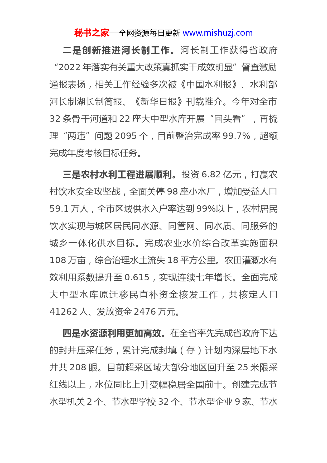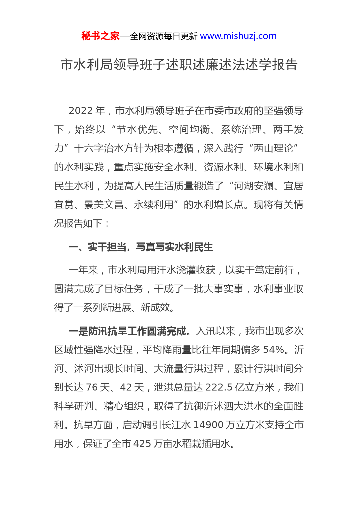 秘书之家—全网资源每日更新www.mishuzj.com市水利局领导班子述职述廉述法述学报告2022年,市水利局领导班子在市委市政府的坚强领导下,始终以“节水优先、空间均衡、系统治理、两手发力”十六字治水方针为根本遵循,深入践行“两山理论”的水利实践,重点实施安全水利、资源水利、环境水利和民生水利,为提高人民生活质量锻造了“河湖安澜、宜居宜赏、景美文昌、永续利用”的水利增长点。现将有关情况报告如下:一、实干担当,写真写实水利民生一年来,市水利局用汗水浇灌收获,以实干笃定前行,圆满完成了目标任务,干成了一批大事实事,水利事业取得了一系列新进展、新成效。一是防汛抗旱工作圆满完成。入汛以来,我市出现多次区域性强降水过程,平均降雨量比往年同期偏多54%。沂河、沭河出现长时间、大流量行洪过程,累计行洪时间分别长达76天、42天,泄洪总量达222.5亿立方米,我们科学研判、精心组织,取得了抗御沂沭泗大洪水的全面胜利。抗旱方面,启动调引长江水14900万立方米支持全市用水,保证了全市425万亩水稻栽插用水。秘书之家—全网资源每日更新www.mishuzj.com二是创新推进河长制工作。河长制工作获得省政府“2022年落实有关重大政策真抓实干成效明显”督查激励通报表扬,相关工作经验多次被《中国水利报》、水利部河长制湖长制简报、《新华日报》刊载推介。今年对全市32条骨干河道和22座大中型水库开展“回头看”,再梳理“两违”问题2095个,目前整治完成率99.7%,超额完成年度考核目标任务。三是农村水利工程进展顺利。投资6.82亿元,打赢农村饮水安全攻坚战,全面关停98座小水厂,增加受益人口59.1万人,全市区域供水入户率达到99%以上,农村居民饮水实现与城区居民同水源、同管网、同水质、同服务的城乡一体化供水目标。完成农业水价综合改革实施面积108万亩,综合治理水土流失18平方公里。农田灌溉水有效利用系数提升至0.615,实现连续七年增长。全面完成大中型水库原迁移民直补资金核发工作,共核定人口41262人、发放资金2476万元。四是水资源利用更加高效。在全省率先完成省政府下达的封井压采任务,累计完成封填(存)计划内深层地下水井共208眼。目前超采区域大部分地区回升至25米限采红线以上,水位同比上升变幅稳居全国前十。创建完成节水型机关2个、节水型学校32个、节水型企业9家、节水秘书之家—全网资源每日更新www.mishuzj.com型社区21个、节水型灌区4个。完成水资源费征收4100万元,水费征收910万元。二、坚守底线,安全防范滴水不漏一年来,市水利局认真贯彻落实安全生产“党政同责、一岗双责”和“三管三必须”原则,以及省、市安全生产文件精神,紧紧围绕水旱灾害专项整治及水利行业中心工作,切实做好水利安全生产各项工作。一是牢固树立安全发展理念。专题学习习近平总书记安全生产重要论述和对江苏工作重要指示要求,安全生产三百行动等文件精神,并通过定期听取研究专项整治行动汇报、“一把手讲安全”、“挂钩领导”安全生产主题宣讲网上云课堂警示教育视频学习、消防安全知识讲座等系列活动,将专项整治工作的思想与要求传达到每一位干部职工。在全国水利安全生产知识竞赛中,通过落实全员100%参赛率,强化、内化从业人员安全知识,提升个人分值等举措,收获全省13个地级市第一,全国地市级水利部门并列第2名的好成绩。二是坚决遏制安全生产事故发生。今年3月疫情反复期间,较好的完成了疫情阻击战宣传发动、防疫物资采购发放、值班值守安排、办公生活区卫生整治等工作,全市水利工程未发生一例安全事故,未发生饮用水源污染事故,秘书之家—全网资源每日更新www.mishuzj.com饮用水源水质稳定达标。开展水利风险隐患大排查大整治瞄准长期以来反复治理、反复出现的重大风险、隐患和监管失守问题,建立问题隐患和制度措施“两个清单”,边查边改、立查立改。目前,全局安全管理体系总体运行平稳、有效,在完成安全生产任务的同时,无安全生产事故。三是紧盯弱项短板不放松。紧盯水旱灾害专项整治排定的15个病险水闸落实除险加固与拆除重建等工作,对全市267座水库进行全覆盖督查,对97座水库、30座水闸开展安全鉴定,实现全市水旱灾害骨干工程重大风险隐患清单管理与动态管控。三、创优争先,树立行业全新形象一年来,市水利局各部门、各条线,真抓实干,勇攀高峰,上上下下形成了挑灯夜战、热火朝天的浓厚干事创业氛围,敢为人先,勇争一流成为全市水利行业形象的一张名片。一是不断提高窗口服务水平。今年以来,市政务服务中心水利窗口主动创新工作方式,持续落实“不见面审批”改革,140项水利政务服务事项实现“一窗受理”,全程网办“零跑腿”得以实现。针对跨多县区(园区)的重点项目,通过上下联动提速,实行统一勘查、分头审批,实现市、县区(园区)两级审批事项高效整合;坚持从方便服务对象角秘书之家—全网资源每日更新www.mishuzj.com度改进和优化政务服务方式,帮助企业轻松做好项目报审工作。累计接待各类咨询1500余件,办结政务服务事项210项,全部在规定时限内办结,实现“一次不跑”事项数占依申请办理类事项总数比例达100%、受理办结率100%、承诺件提前办结率100%,群众满意率100%。二是依法行政能力显著提高。局党组中心组带头尊法学
