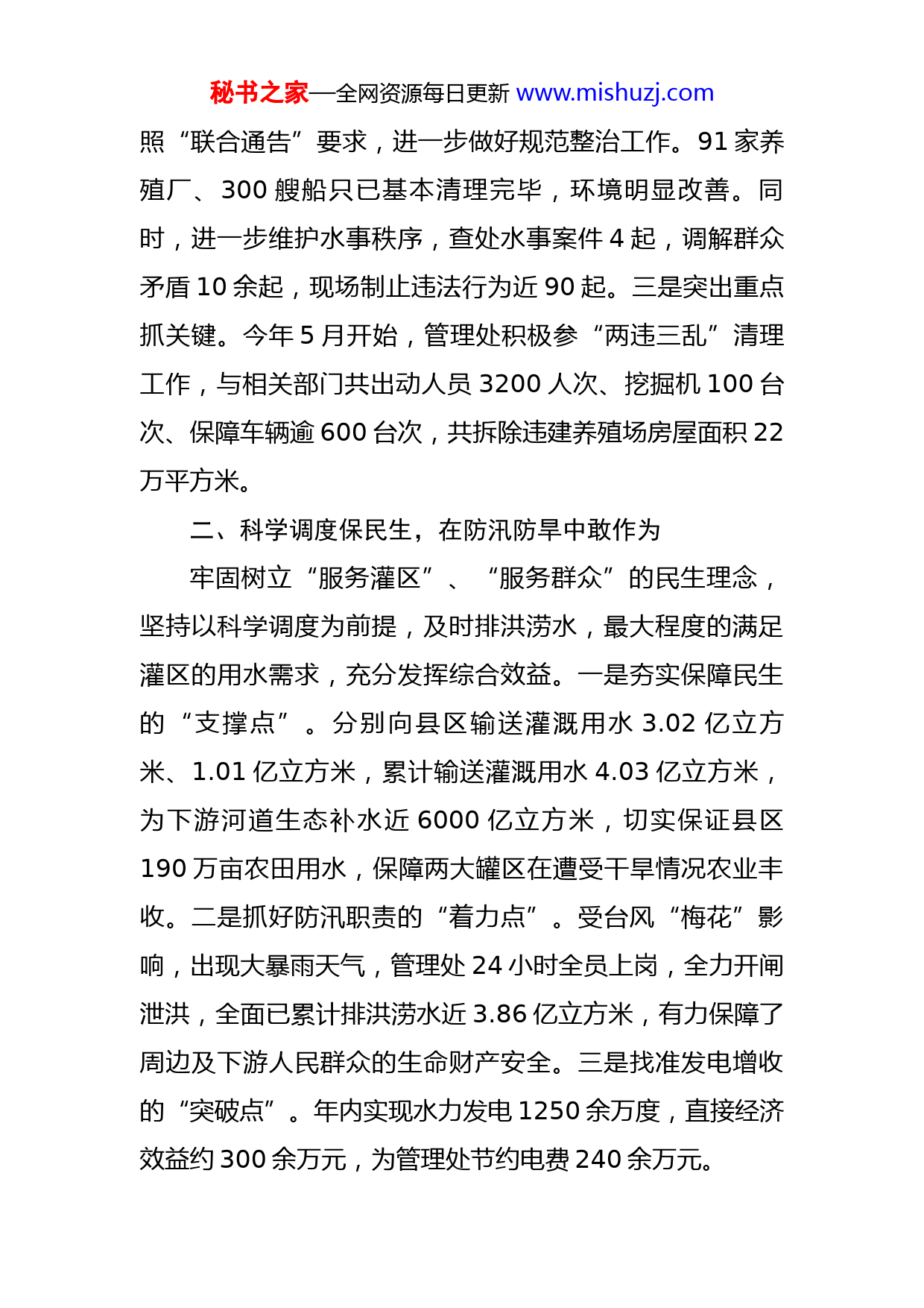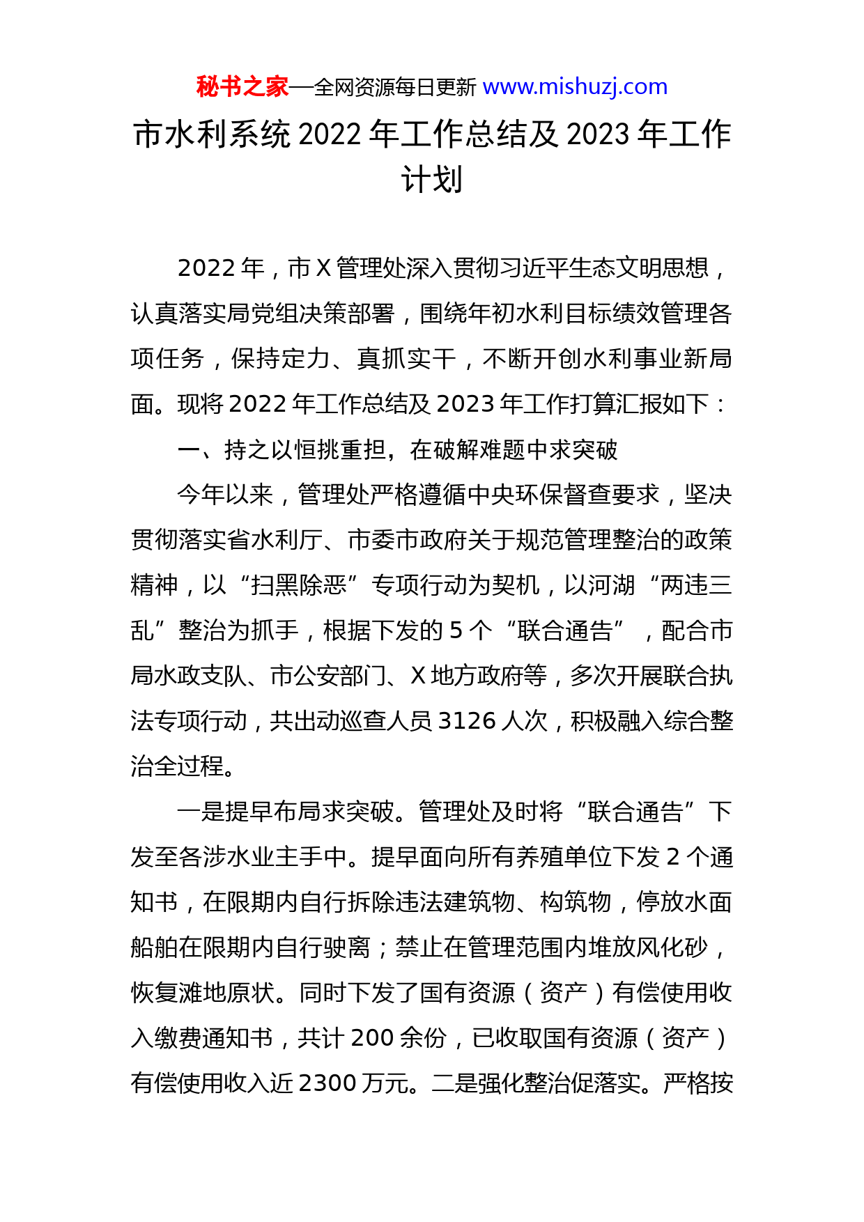 秘书之家—全网资源每日更新www.mishuzj.com市水利系统2022年工作总结及2023年工作计划2022年,市X管理处深入贯彻习近平生态文明思想,认真落实局党组决策部署,围绕年初水利目标绩效管理各项任务,保持定力、真抓实干,不断开创水利事业新局面。现将2022年工作总结及2023年工作打算汇报如下:一、持之以恒挑重担,在破解难题中求突破今年以来,管理处严格遵循中央环保督查要求,坚决贯彻落实省水利厅、市委市政府关于规范管理整治的政策精神,以“扫黑除恶”专项行动为契机,以河湖“两违三乱”整治为抓手,根据下发的5个“联合通告”,配合市局水政支队、市公安部门、X地方政府等,多次开展联合执法专项行动,共出动巡查人员3126人次,积极融入综合整治全过程。一是提早布局求突破。管理处及时将“联合通告”下发至各涉水业主手中。提早面向所有养殖单位下发2个通知书,在限期内自行拆除违法建筑物、构筑物,停放水面船舶在限期内自行驶离;禁止在管理范围内堆放风化砂,恢复滩地原状。同时下发了国有资源(资产)有偿使用收入缴费通知书,共计200余份,已收取国有资源(资产)有偿使用收入近2300万元。二是强化整治促落实。严格按秘书之家—全网资源每日更新www.mishuzj.com照“联合通告”要求,进一步做好规范整治工作。91家养殖厂、300艘船只已基本清理完毕,环境明显改善。同时,进一步维护水事秩序,查处水事案件4起,调解群众矛盾10余起,现场制止违法行为近90起。三是突出重点抓关键。今年5月开始,管理处积极参“两违三乱”清理工作,与相关部门共出动人员3200人次、挖掘机100台次、保障车辆逾600台次,共拆除违建养殖场房屋面积22万平方米。二、科学调度保民生,在防汛防旱中敢作为牢固树立“服务灌区”、“服务群众”的民生理念,坚持以科学调度为前提,及时排洪涝水,最大程度的满足灌区的用水需求,充分发挥综合效益。一是夯实保障民生的“支撑点”。分别向县区输送灌溉用水3.02亿立方米、1.01亿立方米,累计输送灌溉用水4.03亿立方米,为下游河道生态补水近6000亿立方米,切实保证县区190万亩农田用水,保障两大罐区在遭受干旱情况农业丰收。二是抓好防汛职责的“着力点”。受台风“梅花”影响,出现大暴雨天气,管理处24小时全员上岗,全力开闸泄洪,全面已累计排洪涝水近3.86亿立方米,有力保障了周边及下游人民群众的生命财产安全。三是找准发电增收的“突破点”。年内实现水力发电1250余万度,直接经济效益约300余万元,为管理处节约电费240余万元。秘书之家—全网资源每日更新www.mishuzj.com三、优化机制谋发展,在工程管理中创先进始终把工程管理摆在全处工作的突出位置,认真执行工程检查及工程养护相关要求,夯实安全生产标准化管理基础,着力提升省级水利风景区品质,持续推进管理精细化,通过省级水管单位复核,持续提高全处工程管理水平。一是不断夯实水利工程安全。完成主坝及枢纽建筑物、漫水闸工程沉降观测工作,新增观察点200余处;完成大坝坝后渗水及迎水面护坡应急修复工程;开工建设大坝路灯工程、防护工程及东坝大路改造工程。完成390处卫星遥感监测疑似违法点现场调查核实工作,保证河长制工作贯彻实施;启动精细化管理工作,加快档案资料的整理汇编,不管提高管理水平。二是不断提升水利景区品质。推进大坝沿线及管理区绿化工程,栽植女贞等树木1000余棵;栽植黑松、红叶色楠色块,铺设草坪近5000平方米;院内水塘建设生态浮岛300平方米;启动节水机关建设项目,并根据不同树木不同季节管理特点,采取不同养护和病虫害方式。三是不断强化水利安全生产。签订2022年度安全生产责任状,完善安全生产基础设备142具,增加警示牌30余处,禁止标识50余处。结合“安全生产月”,制作条幅20余个,预防溺水宣传册500余份;组织开展“一把手”谈安全生产及安全生产培训,组织管理处职工参加2022年水利安全生产网络知识竞赛,参秘书之家—全网资源每日更新www.mishuzj.com赛率100%。四、旗帜鲜明讲政治,在从严从实中抓党建一年来,管理处全体党员干部以习近平新时代中国特色社会主义思想为指引,落实“三会一课”等组织生活制度,严守政治底线,丰富党员活动形式,荣获“市巾帼建功先进集体”殊荣,为全处水利事业发展提供了坚强的思想基础和组织保障。一是增强政治自觉,抓实学习教育。制订了学习教育《实施方案》、《实施计划》、《理论学习周计划》、《调查研究工作方案》。开展教育专题学习9次,并组织主题教育应知应会答题活动。赴烈士陵园、市革命纪念馆、周恩来纪念馆、“廉政文化教育示范点”等地开展主题党日活动,引领全体党员干部立足平凡岗位,将灌溉供水服务和打赢整治攻坚战作为水利人勇担使命的第一缕旗帜,将边学边改贯穿主题教育始终。二是突出政治引领,筑牢思想根基。把学习习近平新时代中国特色社会主义思想作为加强党的政治建设的根本任务,将深入学习宣传贯彻党的二十大精神与“党员固定学习日”、“三会一课”等制度相结合,已召开党员大会24次,专题学习14次,党员固定学习日19次,下发二十大及习近平新时代中国特色社会主义思想学习材料1600余册。及时对“学习强国”和党建云的“新思想一起学”答题活动进行监督,引导全处党员干部把认识向高处提领,成效向实践转