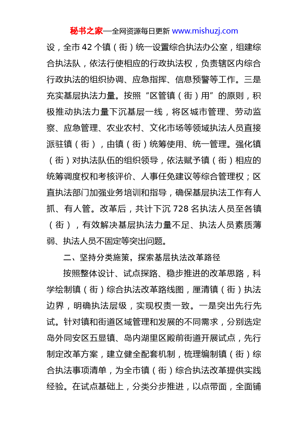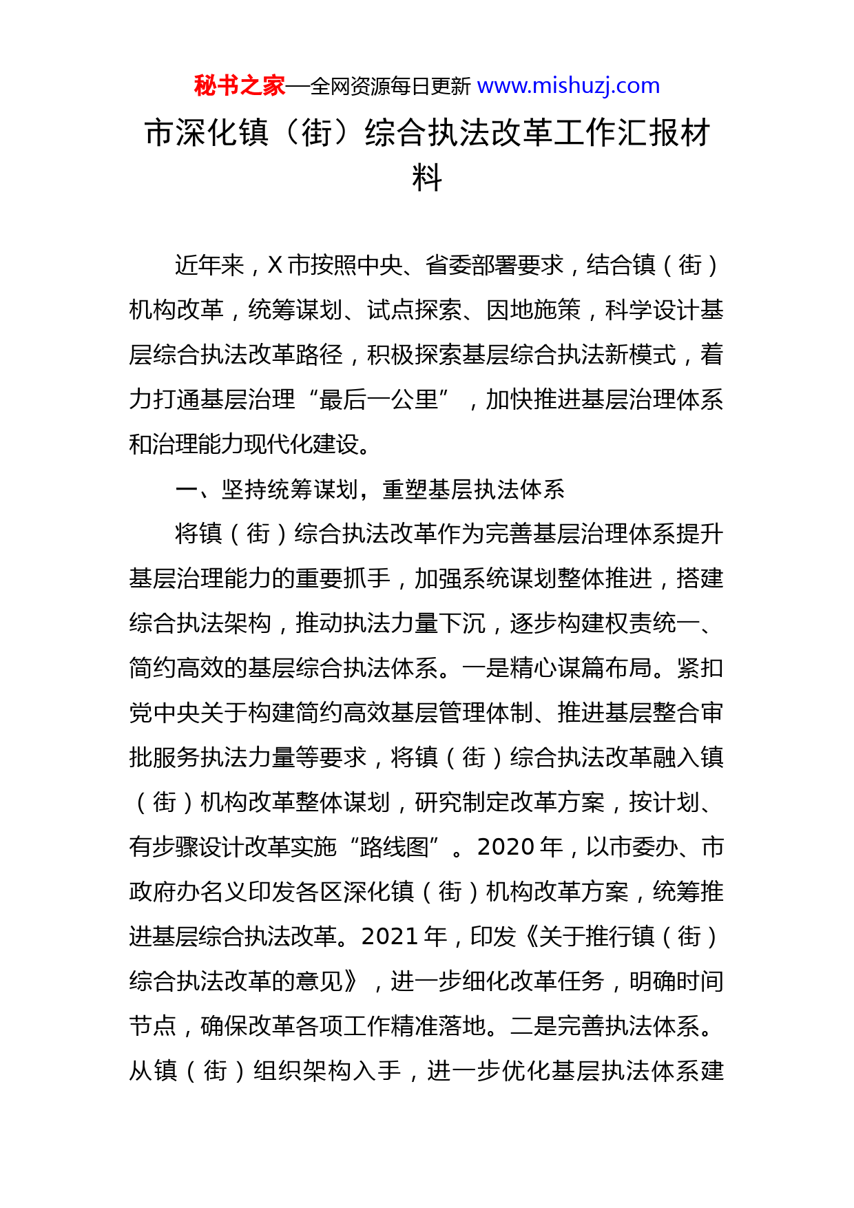 秘书之家—全网资源每日更新www.mishuzj.com市深化镇(街)综合执法改革工作汇报材料近年来,X市按照中央、省委部署要求,结合镇(街)机构改革,统筹谋划、试点探索、因地施策,科学设计基层综合执法改革路径,积极探索基层综合执法新模式,着力打通基层治理“最后一公里”,加快推进基层治理体系和治理能力现代化建设。一、坚持统筹谋划,重塑基层执法体系将镇(街)综合执法改革作为完善基层治理体系提升基层治理能力的重要抓手,加强系统谋划整体推进,搭建综合执法架构,推动执法力量下沉,逐步构建权责统一、简约高效的基层综合执法体系。一是精心谋篇布局。紧扣党中央关于构建简约高效基层管理体制、推进基层整合审批服务执法力量等要求,将镇(街)综合执法改革融入镇(街)机构改革整体谋划,研究制定改革方案,按计划、有步骤设计改革实施“路线图”。2020年,以市委办、市政府办名义印发各区深化镇(街)机构改革方案,统筹推进基层综合执法改革。2021年,印发《关于推行镇(街)综合执法改革的意见》,进一步细化改革任务,明确时间节点,确保改革各项工作精准落地。二是完善执法体系。从镇(街)组织架构入手,进一步优化基层执法体系建秘书之家—全网资源每日更新www.mishuzj.com设,全市42个镇(街)统一设置综合执法办公室,组建综合执法队,依法行使相应的行政执法权,负责辖区内综合行政执法的组织协调、应急指挥、信息预警等工作。三是充实基层执法力量。按照“区管镇(街)用”的原则,积极推动执法力量下沉基层一线,将区城市管理、劳动监察、应急管理、农业农村、文化市场等领域执法人员直接派驻镇(街),由镇(街)统筹使用、统一管理。强化镇(街)对执法队伍的组织领导,依法赋予镇(街)相应的统筹调度权和考核评价、人事任免建议等综合管理权;区直执法部门加强业务培训和指导,确保基层执法工作有人抓、有人管。改革后,共计下沉728名执法人员至各镇(街),有效解决基层执法力量不足、执法人员素质薄弱、执法人员不固定等突出问题。二、坚持分类施策,探索基层执法改革路径按照整体设计、试点探路、稳步推进的改革思路,科学绘制镇(街)综合执法改革路线图,厘清镇(街)执法边界,明确执法层级,实现权责一致。一是突出先行先试。针对镇和街道区域管理和发展的不同需求,分别选定岛外同安区五显镇、岛内湖里区殿前街道开展试点,先行制定改革方案,建立健全配套机制,梳理编制镇(街)综合执法事项清单,为全市镇(街)综合执法改革提供实践经验。在试点基础上,分类分步推进,以点带面,全面铺秘书之家—全网资源每日更新www.mishuzj.com开,为全市推动镇(街)综合执法改革落地见效打下良好基础。二是突出因地制宜。注重结合岛内、岛外镇(街)发展定位,在岛内街道突出城市管理、经济发展功能,以城管为中心,将劳动监察、应急管理等领域相关执法权限下沉街道,并强化与其他领域的联动执法,着力构建岛内“1+2+N”综合执法模式。在岛外镇突出乡村振兴和文化市场等职能,以城管为中心,在劳动监察、应急管理领域基础上进一步推进农业农村、文化市场等领域下沉,构建岛外“1+4+N”综合执法模式。三是突出赋能增效。按照“放得下、接得住、管得好”的标准,将面广量大、基层管理迫切需要且能有效承接的执法权限等赋予镇(街),扩大镇(街)在农业农村、安全生产等方面的执法权限。坚持“一镇(街)一清单”,不搞“一刀切”,各镇(街)根据区域及经济社会发展差异,制定综合行政执法事项清单,如同安区五显镇,结合实际梳理公布综合执法事项1005项。同时,调整优化“属地管理”事项主体责任和配合责任清单,各区共公布“属地管理”事项462项;出台《镇(街)职责事项准入制度》,厘清部门、镇(街)执法边界,理顺“条”“块”关系,扎实推进基层依法高效履职。三、坚持规范管理,夯实基层执法基础加强镇(街)综合执法规范化建设,建立执法协调联秘书之家—全网资源每日更新www.mishuzj.com动机制,提升执法人员业务能力,严密执法标准和操作规程,着力打造一支正规化、专业化、职业化的基层综合执法队伍。一是建立健全执法机制。综合行政执法队与各执法部门建立顺畅的信息共享、资源共享、协同联动机制,与公安、检察机关和法院建立违法犯罪行为线索和案件移送、联合调查、案情通报等协同配合制度,积极实现行政执法和刑事司法的无缝衔接、职能互补。在跨领域、跨部门综合行政执法方面加强上下联动,形成符合基层特点的“统一指挥、部门协同、整体联动”执法机制。二是加强人员执法培训。围绕“一专多能”岗位要求,开展多元执法培训,迅速提升镇(街)综合执法队员的法律素养和执法实务操作水平。严格落实行政执法人员持证上岗和资格管理制度,全市镇(街)综合执法人员818名,其中持证人员725名,持证人员占比达88.63%,为扎实推进基层执法规范化建设奠定坚实基础。三是规范基层执法流程。突出抓好基层执法规范化建设,建立法制审核会商、法律顾问律师参与审核等工作机制,着力健全落实行政执法公示制度、执法全过程记录制度、重大执法决定法制审核制度。围绕执法有章程、操作有模板、结果有量化,统一规范执法流程、执法文书等各类执法要素,推动基层综合执法规范化建设。四、坚持多元共治,提升基层执法效能