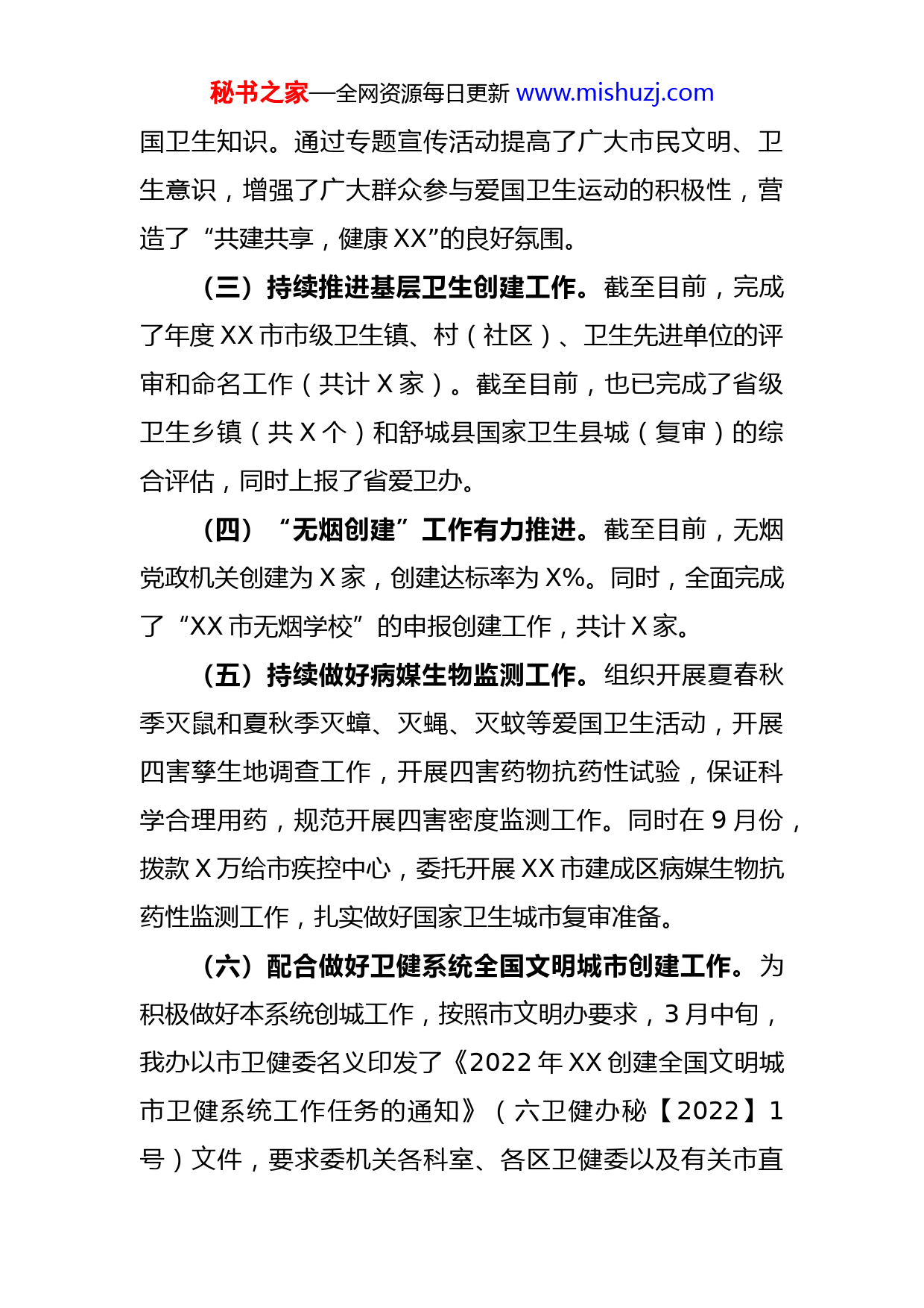 秘书之家—全网资源每日更新www.mishuzj.comXX市爱卫办2022年工作总结及2023年工作计划2022年,全市爱国卫生运动工作在市委、市政府的正确领导下,按照省爱卫办的统一部署,紧紧围绕《XX省深入开展爱国卫生运动实施方案》以及“健康XX”“健康XX”建设目标,以全国文明城市创建和国家卫生城市创建成果巩固为抓手,结合常态化疫情防控工作要求,完成了各类“卫生创建”行动,开展了爱国卫生节日活动(爱国卫生月、世界无烟日等)以及“无烟创建”各专项工作,现将具体工作情况总结如下:一、2022年工作(一)卫生城市创建工作圆满成功。2022年1月14日,全国爱国卫生运动委员会公开发布X周期国家卫生城市(区)命名名单,全国共X个城市(区)入选,我市被全国爱卫会正式授予X周期“国家卫生城市”。(二)扎实开展爱国卫生系列活动。在全国第33个爱国卫生月活动期间,全市上下分别围绕“文明健康绿色环保”主题以及《关于开展文明健康绿色环保生活方式活动的意见》精神,联合市文明办共同发文转发,要求各县区结合文明城市创建和“健康XX”建设工作,集中时段,开展以城乡环境整洁行动、病媒防控、健康环境和健康促进等为主要内容的爱国卫生月系列活动。各地充分利用电视报纸、网站、公众号等传播媒介,多层次、多角度传播爱秘书之家—全网资源每日更新www.mishuzj.com国卫生知识。通过专题宣传活动提高了广大市民文明、卫生意识,增强了广大群众参与爱国卫生运动的积极性,营造了“共建共享,健康XX”的良好氛围。(三)持续推进基层卫生创建工作。截至目前,完成了年度XX市市级卫生镇、村(社区)、卫生先进单位的评审和命名工作(共计X家)。截至目前,也已完成了省级卫生乡镇(共X个)和舒城县国家卫生县城(复审)的综合评估,同时上报了省爱卫办。(四)“无烟创建”工作有力推进。截至目前,无烟党政机关创建为X家,创建达标率为X%。同时,全面完成了“XX市无烟学校”的申报创建工作,共计X家。(五)持续做好病媒生物监测工作。组织开展夏春秋季灭鼠和夏秋季灭蟑、灭蝇、灭蚊等爱国卫生活动,开展四害孳生地调查工作,开展四害药物抗药性试验,保证科学合理用药,规范开展四害密度监测工作。同时在9月份,拨款X万给市疾控中心,委托开展XX市建成区病媒生物抗药性监测工作,扎实做好国家卫生城市复审准备。(六)配合做好卫健系统全国文明城市创建工作。为积极做好本系统创城工作,按照市文明办要求,3月中旬,我办以市卫健委名义印发了《2022年XX创建全国文明城市卫健系统工作任务的通知》(六卫健办秘【2022】1号)文件,要求委机关各科室、各区卫健委以及有关市直秘书之家—全网资源每日更新www.mishuzj.com卫生健康单位按照时间节点上报所需的创城网上申报材料常态化组织志愿者到结对共建小区-舒怡花园开展入户宣传活动。其中在年第二、三季度A类单位考核中予以X万元的资金奖补。(七)做好卫生创建牌匾制作和有关交接工作。完成年度,2021年度省(市)级卫生乡镇、卫生村(社区)、卫生先进单位共计X家单位的荣誉称号牌匾制作工作;同时与市档案馆完成“国家卫生城市”奖牌的使用交接工作。二、2023年工作计划(一)总体思路。认真贯彻党的十九大及十九届六中全会精神,以XJP新时代中国特色社会主义思想为指导,贯彻落实XJP总书记关于“爱国卫生运动”的重要论述,按照省、市爱卫会的要求,围绕市委、市政府的中心工作结合工作职能和业务工作目标,做好爱国卫生工作,认真做好国家卫生城市成果巩固、文明城市创建、卫生单位创建、病媒生物防制、无烟环境建设五大工作目标。(二)重点举措1.完善国家卫生城市管理长效机制。根据新的《国家卫生城市标准》,结合本市工作实际,拟以市政府名义起草印发《XX市创建国家卫生城市成果巩固工作方案》,明确各部门工作职责,细化工作任务,在做好2022年卫生城市创建工作巩固的基础上,进一步指导各单位各部门查漏补秘书之家—全网资源每日更新www.mishuzj.com缺,明确重点,打造亮点,树立标杆。2.加强组织协调营造巩卫氛围。进一步协调创卫领导组成员单位,依法制定城市卫生管理长效机制,提高城市管理水平。对照国家卫生城市标准,组织开展创卫工作专项督查,以问题为导向,自查自纠,对标达标,落实国家卫生城市创建各项工作措施。加强卫生创建的组织协调,宣传、培训、和督查工作,充分调动各县区、政府各职能部门和广大群众的积极性,营造浓厚的创建成果巩固氛围。3.持续做好病媒生物防制工作。继续组织开展夏春秋季灭鼠和夏秋季灭蟑、灭蝇、灭蚊等爱国卫生活动,开展四害孳生地调查工作,开展四害药物抗药性试验,保证科学合理用药,规范开展四害密度监测工作。4.扎实开展好爱国卫生系列活动。借助“世界无烟日”、“爱国卫生月”“爱国卫生法制宣传周”等重大活动主题平台,结合文明城市创建和常态化疫情防控要求,采取多种形式,广泛开展卫生知识宣传教育活动,倡导健康礼貌的生活方式,不断提高群众健康水平,努力营造整洁、靓丽、规范、有序的生产生活环境。5.有序推进卫生创建工作。按照省、市卫生单位创建标准以及考核管理办法,对2022年度申报创建的省(市)级卫生乡镇、卫生村(社区)、卫生先进单位进行统一命名工作,并持续深入开展2023年度的省级各类卫生创建活动,