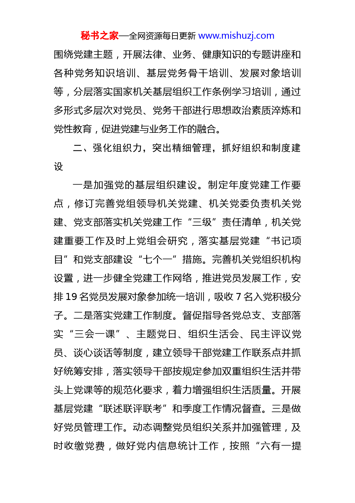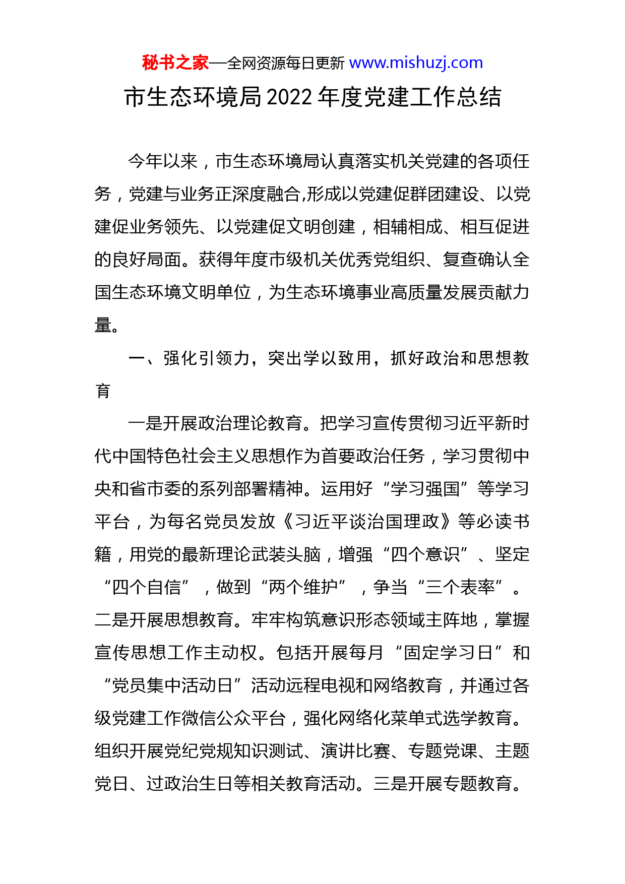 秘书之家—全网资源每日更新www.mishuzj.com市生态环境局2022年度党建工作总结今年以来,市生态环境局认真落实机关党建的各项任务,党建与业务正深度融合,形成以党建促群团建设、以党建促业务领先、以党建促文明创建,相辅相成、相互促进的良好局面。获得年度市级机关优秀党组织、复查确认全国生态环境文明单位,为生态环境事业高质量发展贡献力量。一、强化引领力,突出学以致用,抓好政治和思想教育一是开展政治理论教育。把学习宣传贯彻习近平新时代中国特色社会主义思想作为首要政治任务,学习贯彻中央和省市委的系列部署精神。运用好“学习强国”等学习平台,为每名党员发放《习近平谈治国理政》等必读书籍,用党的最新理论武装头脑,增强“四个意识”、坚定“四个自信”,做到“两个维护”,争当“三个表率”。二是开展思想教育。牢牢构筑意识形态领域主阵地,掌握宣传思想工作主动权。包括开展每月“固定学习日”和“党员集中活动日”活动远程电视和网络教育,并通过各级党建工作微信公众平台,强化网络化菜单式选学教育。组织开展党纪党规知识测试、演讲比赛、专题党课、主题党日、过政治生日等相关教育活动。三是开展专题教育。秘书之家—全网资源每日更新www.mishuzj.com围绕党建主题,开展法律、业务、健康知识的专题讲座和各种党务知识培训、基层党务骨干培训、发展对象培训等,分层落实国家机关基层组织工作条例学习培训,通过多形式多层次对党员、党务干部进行思想政治素质淬炼和党性教育,促进党建与业务工作的融合。二、强化组织力,突出精细管理,抓好组织和制度建设一是加强党的基层组织建设。制定年度党建工作要点,修订完善党组领导机关党建、机关党委负责机关党建、党支部落实机关党建工作“三级”责任清单,机关党建重要工作及时上党组会研究,落实基层党建“书记项目”和党支部建设“七个一”措施。完善机关党组织机构设置,进一步健全党建工作网络,推进党员发展工作,安排19名党员发展对象参加统一培训,吸收7名入党积极分子。二是落实党建工作制度。督促指导各党总支、支部落实“三会一课”、主题党日、组织生活会、民主评议党员、谈心谈话等制度,建立领导干部党建工作联系点并抓好统筹安排,落实领导干部按规定参加双重组织生活并带头上党课等的规范化要求,着力增强组织生活质量。开展基层党建“联述联评联考”和季度工作情况督查。三是做好党员管理工作。动态调整党员组织关系并加强管理,及时收缴党费,做好党内信息统计工作,按照“六有一提秘书之家—全网资源每日更新www.mishuzj.com升”标准落实对离退休老党员的管理和服务。三、强化战斗力,突出严格标准,抓好廉政纪律和作风建设一是落实廉政主体责任。贯彻落实中央和省、市委关于党风廉政建设责任制和全面从严治党的文件精神,协助党组制定全市生态环境系统党风廉政建设主体责任清单,召开党风廉政建设相关会议,部署任务,明确主体责任,推进“两个责任”履职纪实平台和“阳光扶贫”涉农资金监管平台建设。二是推进勤廉机关创建。认真落实中央八项规定和实施细则精神,开展党风廉政教育月系列活动和两次廉政警示教育活动,推动大气监测站、防污办等直属管理单位廉政教育示范点建设、水环境管理处廉政教育基地提质扩面升级和政治环境打造,开展廉政风险点排查及风险防控,及时查办纪检监察部门转办件,参加全市第四届廉洁文化优秀作品征集活动,将廉政文化与生态文化深度融合。三是强化机关作风建设。落实中央关于整治形式主义、官僚主义的规定,减文减会,减轻基层负担。新冠疫情防控工作中坚持从严管理、令行禁止。围绕机关作风和效能建设不定期不定点开展明察暗访,妥善解决信访案件和12345平台投诉的问题,落实“行风热线”双月活动具体安排,参加市级机关“作风聚焦”行动节目录制及宣传,保持作风建设常态化、长效化。秘书之家—全网资源每日更新www.mishuzj.com四、强化影响力,突出整体优势,抓好机关党建品牌创建一是创建党建系列品牌。年初,根据市级机关“三争”行动的部署要求,以党建品牌创建为引领,在8个直属单位创建系列党建品牌,并争创高质发展决战决胜突击队,11月份进行了突击队党建品牌创建工作内部验收,形成“1+8”党建品牌方阵。在机关各支部中开展党支部有精神、党小组有理念、党员有格言的“三有”活动,设立10个党员先锋岗,着力于党建与文明创建融合、党建与群团建设融合,激发每名党员的内生动力和基层党组织的组织力,促进队伍整体精神面貌的明显提升,10月份形成了相关党建研究课题上报。二是深化党建+文明创建。制定2022年精神文明建设工作要点,统筹落实全市创文、创卫复审和我局创建全国文明单位等工作。及时分解落实目标任务和责任清单,做到有计划、有安排、有落实、有督查。结合志愿品牌创建开展公益活动,落实无偿献血、慈善捐款、植绿护绿、低碳环保出行宣传和“关爱山川河流我行动”等活动,擦亮志愿服务品牌。结合核心价值观培育营造崇德向善氛围,组织廉洁家庭、文明家庭评选,组织道德模范报告会和开展弘扬优秀传统文化的“我们的节日”宣传活动。结合脱贫攻坚任务开展扶贫济困善举,组织党员结对帮扶,