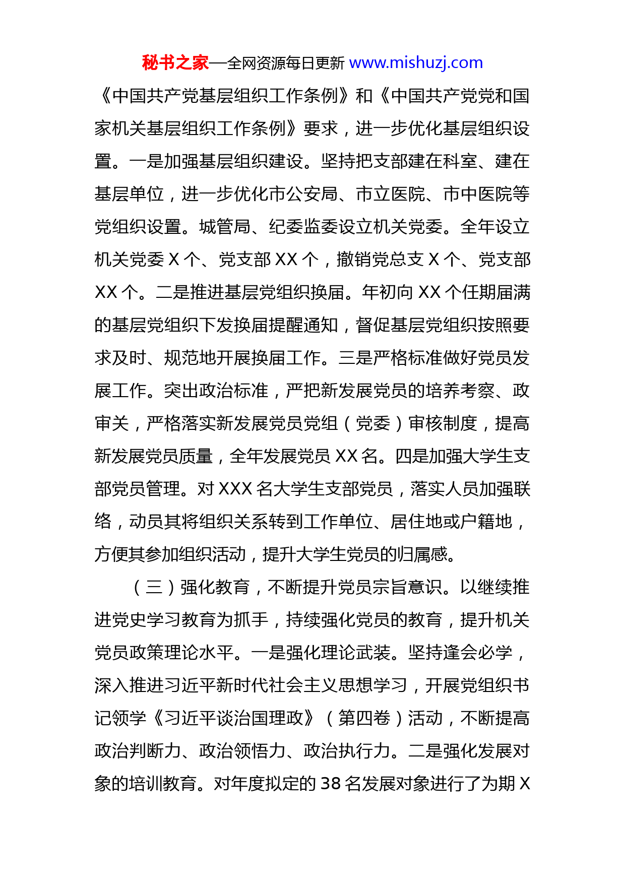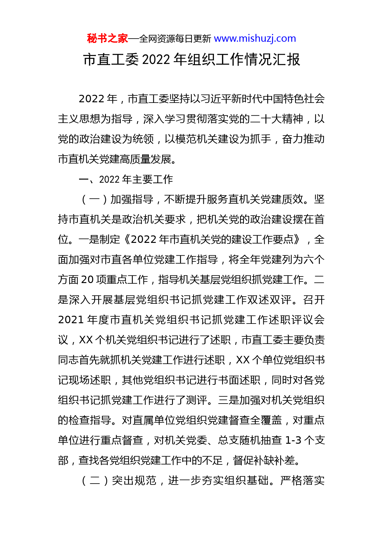 秘书之家—全网资源每日更新www.mishuzj.com市直工委2022年组织工作情况汇报2022年,市直工委坚持以习近平新时代中国特色社会主义思想为指导,深入学习贯彻落实党的二十大精神,以党的政治建设为统领,以模范机关建设为抓手,奋力推动市直机关党建高质量发展。一、2022年主要工作(一)加强指导,不断提升服务直机关党建质效。坚持市直机关是政治机关要求,把机关党的政治建设摆在首位。一是制定《2022年市直机关党的建设工作要点》,全面加强对市直各单位党建工作指导,将全年党建列为六个方面20项重点工作,指导机关基层党组织抓党建工作。二是深入开展基层党组织书记抓党建工作双述双评。召开2021年度市直机关党组织书记抓党建工作述职评议会议,XX个机关党组织书记进行了述职,市直工委主要负责同志首先就抓机关党建工作进行述职,XX个单位党组织书记现场述职,其他党组织书记进行书面述职,同时对各党组织书记抓党建工作进行了测评。三是加强对机关党组织的检查指导。对直属单位党组织党建督查全覆盖,对重点单位进行重点督查,对机关党委、总支随机抽查1-3个支部,查找各党组织党建工作中的不足,督促补缺补差。(二)突出规范,进一步夯实组织基础。严格落实秘书之家—全网资源每日更新www.mishuzj.com《中国共产党基层组织工作条例》和《中国共产党党和国家机关基层组织工作条例》要求,进一步优化基层组织设置。一是加强基层组织建设。坚持把支部建在科室、建在基层单位,进一步优化市公安局、市立医院、市中医院等党组织设置。城管局、纪委监委设立机关党委。全年设立机关党委X个、党支部XX个,撤销党总支X个、党支部XX个。二是推进基层党组织换届。年初向XX个任期届满的基层党组织下发换届提醒通知,督促基层党组织按照要求及时、规范地开展换届工作。三是严格标准做好党员发展工作。突出政治标准,严把新发展党员的培养考察、政审关,严格落实新发展党员党组(党委)审核制度,提高新发展党员质量,全年发展党员XX名。四是加强大学生支部党员管理。对XXX名大学生支部党员,落实人员加强联络,动员其将组织关系转到工作单位、居住地或户籍地,方便其参加组织活动,提升大学生党员的归属感。(三)强化教育,不断提升党员宗旨意识。以继续推进党史学习教育为抓手,持续强化党员的教育,提升机关党员政策理论水平。一是强化理论武装。坚持逢会必学,深入推进习近平新时代社会主义思想学习,开展党组织书记领学《习近平谈治国理政》(第四卷)活动,不断提高政治判断力、政治领悟力、政治执行力。二是强化发展对象的培训教育。对年度拟定的38名发展对象进行了为期X秘书之家—全网资源每日更新www.mishuzj.com天的脱产培训,进一步提高了发展对象对党的认识,端正了入党动机。三是深入开展《机关基层组织工作条例》的宣传和学习,提升机关基层党组织抓党建工作能力,直属机关各党组织积极组织学习,深入开展调研,卫健委、数据资源局等单位党组织就如何加强业务工作与党建整合等方面写出党建调研报告XX余份。四是强化党务干部业务培训。对市直机关单位党组织负责人和业务经办人员开展为期X天的政策业务知识培训,提高了基层党务干部抓党建业务的能力和水平。五是深入开展庆祝建党101周年活动。市直机关各党组织深入开展革命传统教育、重温入党誓词、给党员过政治生日、慰问困难党员、党员志愿服务、表彰“两优一先”等活动。(四)围绕中心,发挥党建引领作用。以党建为引领,充分发挥党组织战斗堡垒作用,将党建与业务工作深度融合,以高质量的党建促进中心工作健康发展。一是深抓书记项目和书记领办事项,以项目化思维抓实基层党建工作,工委所属基层党组织均按要求申报了书记项目或书记领办事项,实现基层党组织全面覆盖,完成率100%。二是狠抓党建品牌创建。全市机关单位形成了一批有影响的党建品牌。市林业局的“绿水青山、红色卫士”、市税务局的“天柱税蓝党旗红”、市水利局的“我心向党水润潜阳”等党建品牌在创建过程中将业务工作与党建工作深秘书之家—全网资源每日更新www.mishuzj.com度融合,以党建为引领,带动业务工作突破发展,取得了明显实效。二、存在的主要问题一是抓党建主责意识不够强。少数机关主要负责人不能很好履行抓党建的主体责任,对党建工作研究不深、抓得不实、管得不严;领导班子成员“一岗双责”落实不力,仍然存在“重业务、轻党建”思想。二是机关党建亮点不够多。抓党建习惯于按部就班,满足于完成常规性工作,缺乏创新意识和办法,党建工作和业务工作结合不够紧,还不同程度存在“两张皮”现象。虽然持续开展“一单位一品牌”创建活动,真正叫得响的机关党建品牌偏少。三、2023年工作安排一是深入学习宣传贯彻党的二十大及精神。将学习宣传贯彻党的二十大精神作为当前和今后一段时间的重要政治任务,联合市直相关部门,出台工作方案,推动机关在学习宣传贯彻党的二十大精神上走在前、作表率,让二十大精神在机关落地生根、开花结果。二是进一步加强机关政治建设。把政治标准和政治要求贯穿于机关党建和业务工作全过程、各方面,持续开展“建设模范机关”建设,强化典型引路,提升模范机关建设水平,培树更多模范机关典