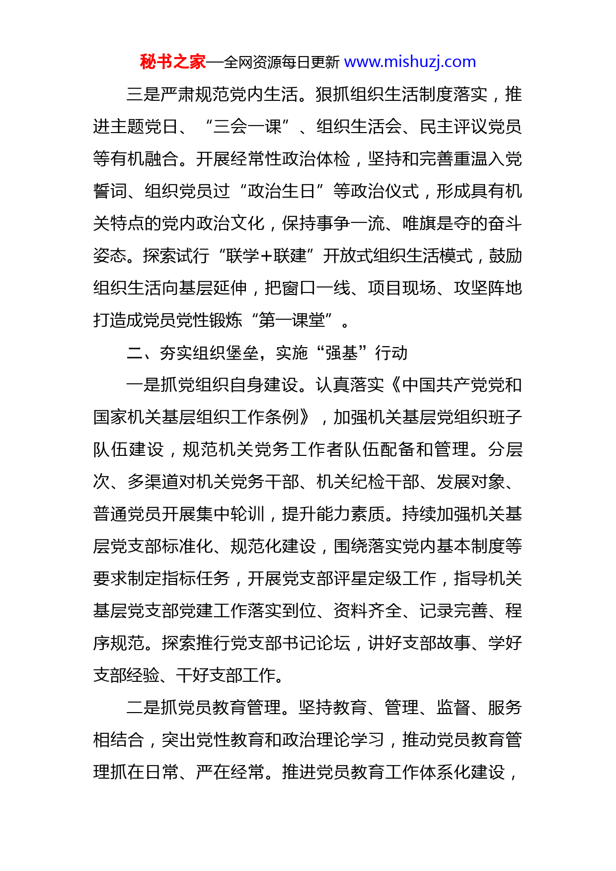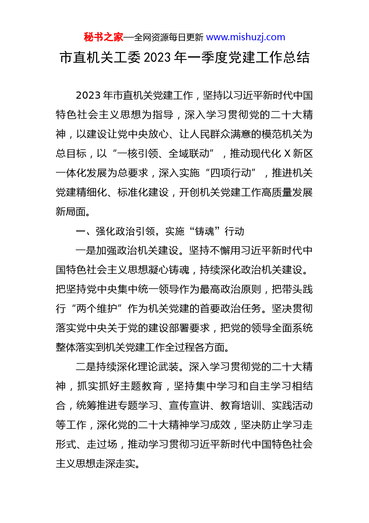 秘书之家—全网资源每日更新www.mishuzj.com市直机关工委2023年一季度党建工作总结2023年市直机关党建工作,坚持以习近平新时代中国特色社会主义思想为指导,深入学习贯彻党的二十大精神,以建设让党中央放心、让人民群众满意的模范机关为总目标,以“一核引领、全域联动”,推动现代化X新区一体化发展为总要求,深入实施“四项行动”,推进机关党建精细化、标准化建设,开创机关党建工作高质量发展新局面。一、强化政治引领,实施“铸魂”行动一是加强政治机关建设。坚持不懈用习近平新时代中国特色社会主义思想凝心铸魂,持续深化政治机关建设。把坚持党中央集中统一领导作为最高政治原则,把带头践行“两个维护”作为机关党建的首要政治任务。坚决贯彻落实党中央关于党的建设部署要求,把党的领导全面系统整体落实到机关党建工作全过程各方面。二是持续深化理论武装。深入学习贯彻党的二十大精神,抓实抓好主题教育,坚持集中学习和自主学习相结合,统筹推进专题学习、宣传宣讲、教育培训、实践活动等工作,深化党的二十大精神学习成效,坚决防止学习走形式、走过场,推动学习贯彻习近平新时代中国特色社会主义思想走深走实。秘书之家—全网资源每日更新www.mishuzj.com三是严肃规范党内生活。狠抓组织生活制度落实,推进主题党日、“三会一课”、组织生活会、民主评议党员等有机融合。开展经常性政治体检,坚持和完善重温入党誓词、组织党员过“政治生日”等政治仪式,形成具有机关特点的党内政治文化,保持事争一流、唯旗是夺的奋斗姿态。探索试行“联学+联建”开放式组织生活模式,鼓励组织生活向基层延伸,把窗口一线、项目现场、攻坚阵地打造成党员党性锻炼“第一课堂”。二、夯实组织堡垒,实施“强基”行动一是抓党组织自身建设。认真落实《中国共产党党和国家机关基层组织工作条例》,加强机关基层党组织班子队伍建设,规范机关党务工作者队伍配备和管理。分层次、多渠道对机关党务干部、机关纪检干部、发展对象、普通党员开展集中轮训,提升能力素质。持续加强机关基层党支部标准化、规范化建设,围绕落实党内基本制度等要求制定指标任务,开展党支部评星定级工作,指导机关基层党支部党建工作落实到位、资料齐全、记录完善、程序规范。探索推行党支部书记论坛,讲好支部故事、学好支部经验、干好支部工作。二是抓党员教育管理。坚持教育、管理、监督、服务相结合,突出党性教育和政治理论学习,推动党员教育管理抓在日常、严在经常。推进党员教育工作体系化建设,秘书之家—全网资源每日更新www.mishuzj.com落实《2019—2023年全国党员教育培训工作规划》具体要求,不断提高党员教育培训质量。高质量做好发展党员工作,举办市直机关党员发展对象培训班。组织开展形式多样的党员志愿服务活动,引导市直广大党员积极投身城市更新、文明创建等具体实践,切实发挥党员先锋模范作用。三是抓党建品牌创建和典型推树。聚焦党建赋能实体经济和招商引资、城市更新、城市建设、营商环境等重点工作,培育一批示范引领作用好、辐射带动作用强、群众认可度高、叫得响过得硬推得开的机关党建品牌。深入挖掘一批市直机关党建引领作用强、党建文化富有特色、工作亮点突出、机制务实创新、品牌特色鲜明、资料规范详实的党建工作示范单位,发挥典型引路、示范引导、辐射带动作用,全面提升市直机关党建工作整体水平。三、服务中心大局,实施“聚力”行动一是围绕中心工作聚力服务大局。紧紧围绕X新区“项目落地年”攻坚突破行动,聚焦市委重点工作,研究制定机关党建与业务工作深度融合的路数打法,探索把支部建在项目上,深化“专班+临时党支部”攻坚模式,在重点工作一线组建党员“突击队”,打造党员“先锋岗”,开展各具特色的主题党日活动,用高质量发展成效检验机关党建实效。秘书之家—全网资源每日更新www.mishuzj.com二是大力宣传推介党建工作成果。聚焦作用发挥,深入挖掘党建与业务“双优”典型,培育命名一批鲜活新颖、务实管用、彰显单位特色、融合业务紧密的党建工作品牌和党建示范点,及时总结提炼基层实践的有益经验,加强信息报送和宣传,择优向省、市宣传推介品牌成果,扩大机关党建工作的影响力。三是主动下沉积极服务基层。严格落实工委领导干部联系点、领导班子成员党支部联系点、机关党组织和在职党员“双报到、双服务”制度,推动机关组织优势、资源优势在社区对接转化。深入开展“人人都是发展环境个个都是开放形象”活动,聚焦优化提升营商环境,开展比本领、比服务、比实绩“擂台比武”等活动,全面实施“戴党员徽章、亮党员身份”行动,设置党员先锋岗、划定党员责任区,树好机关“第一窗口”形象。四、落实从严治党,实施“凝心”行动一是压实从严治党主体责任。加强对市直机关党建工作的统一领导,聚焦落实机关党建工作责任制,开展机关党建集中督导调研,加强日常跟踪问效和个别指导督促。落实党建联系点工作法,对所属X个机关党委(总支、支部)实施全覆盖,集中组织召开党建例会,工委书记和班子成员每人确定1个片区作为联系点,每年深入联系点不少于2次,帮助解决突出问题,提升党建水平。秘书之家—全网资源