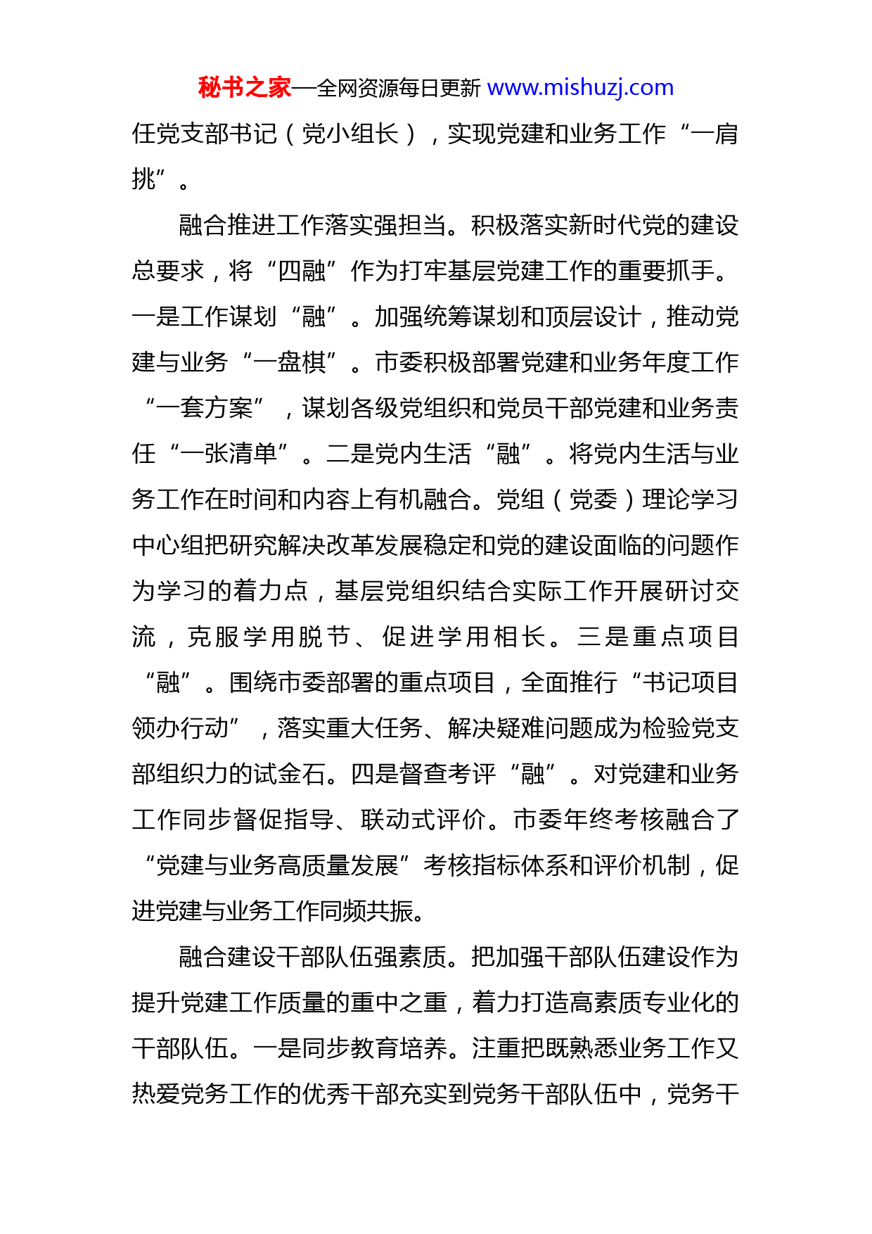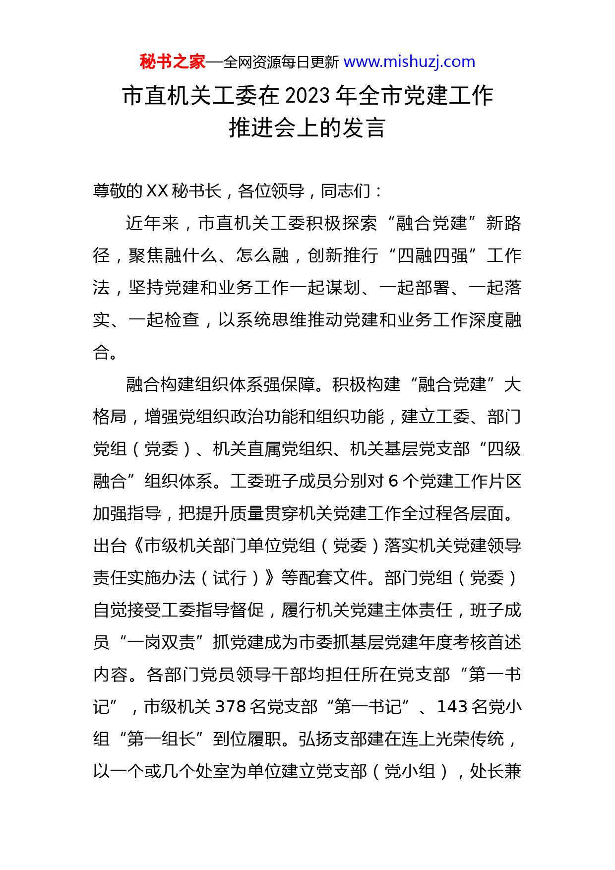 秘书之家—全网资源每日更新www.mishuzj.com市直机关工委在2023年全市党建工作推进会上的发言尊敬的XX秘书长,各位领导,同志们:近年来,市直机关工委积极探索“融合党建”新路径,聚焦融什么、怎么融,创新推行“四融四强”工作法,坚持党建和业务工作一起谋划、一起部署、一起落实、一起检查,以系统思维推动党建和业务工作深度融合。融合构建组织体系强保障。积极构建“融合党建”大格局,增强党组织政治功能和组织功能,建立工委、部门党组(党委)、机关直属党组织、机关基层党支部“四级融合”组织体系。工委班子成员分别对6个党建工作片区加强指导,把提升质量贯穿机关党建工作全过程各层面。出台《市级机关部门单位党组(党委)落实机关党建领导责任实施办法(试行)》等配套文件。部门党组(党委)自觉接受工委指导督促,履行机关党建主体责任,班子成员“一岗双责”抓党建成为市委抓基层党建年度考核首述内容。各部门党员领导干部均担任所在党支部“第一书记”,市级机关378名党支部“第一书记”、143名党小组“第一组长”到位履职。弘扬支部建在连上光荣传统,以一个或几个处室为单位建立党支部(党小组),处长兼秘书之家—全网资源每日更新www.mishuzj.com任党支部书记(党小组长),实现党建和业务工作“一肩挑”。融合推进工作落实强担当。积极落实新时代党的建设总要求,将“四融”作为打牢基层党建工作的重要抓手。一是工作谋划“融”。加强统筹谋划和顶层设计,推动党建与业务“一盘棋”。市委积极部署党建和业务年度工作“一套方案”,谋划各级党组织和党员干部党建和业务责任“一张清单”。二是党内生活“融”。将党内生活与业务工作在时间和内容上有机融合。党组(党委)理论学习中心组把研究解决改革发展稳定和党的建设面临的问题作为学习的着力点,基层党组织结合实际工作开展研讨交流,克服学用脱节、促进学用相长。三是重点项目“融”。围绕市委部署的重点项目,全面推行“书记项目领办行动”,落实重大任务、解决疑难问题成为检验党支部组织力的试金石。四是督查考评“融”。对党建和业务工作同步督促指导、联动式评价。市委年终考核融合了“党建与业务高质量发展”考核指标体系和评价机制,促进党建与业务工作同频共振。融合建设干部队伍强素质。把加强干部队伍建设作为提升党建工作质量的重中之重,着力打造高素质专业化的干部队伍。一是同步教育培养。注重把既熟悉业务工作又热爱党务工作的优秀干部充实到党务干部队伍中,党务干秘书之家—全网资源每日更新www.mishuzj.com部和业务干部同步培养。部分单位设置“融合党建”课程,提升党员干部党建与业务工作融合能力。二是同步管理使用。党务和业务干部同步跟踪、动态管理,使双向交流成为常态。通过岗位练兵、技能比武等途径,增强党员干部的责任感荣誉感。三是同步推优晋升。同等对待党务和业务干部,推优晋升既看党建实效又看业务实绩。融合创建党建品牌强服务。把创建机关党建服务品牌作为推进机关融合党建、推动党建高质量发展的重要抓手,以品牌引领推进融合党建实践。一是品牌定位“融”。坚持“品牌姓党”,不断强化融合理念,赋予机关党建服务品牌新理念新内涵。二是创建过程“融”。机关各部门的品牌创建工作统一由党组(党委)统筹领导创建,机关党组织牵头组织创建,机关全体党员干部职工共同参与创建,推动党建和业务工作全方位融合。三是服务功能“融”。持续开展我与群众面对面、社会评议等活动,每年解决困难诉求XXX余个,把品牌创建工作落实到为基层和群众办实事之中。下一步,我们将深入贯彻落实此次会议精神,特别是XX秘书长的讲话精神,学习各兄弟部门的先进经验,助推市直机关党建工作再上新台阶、再创新辉煌。发言完毕,谢谢!