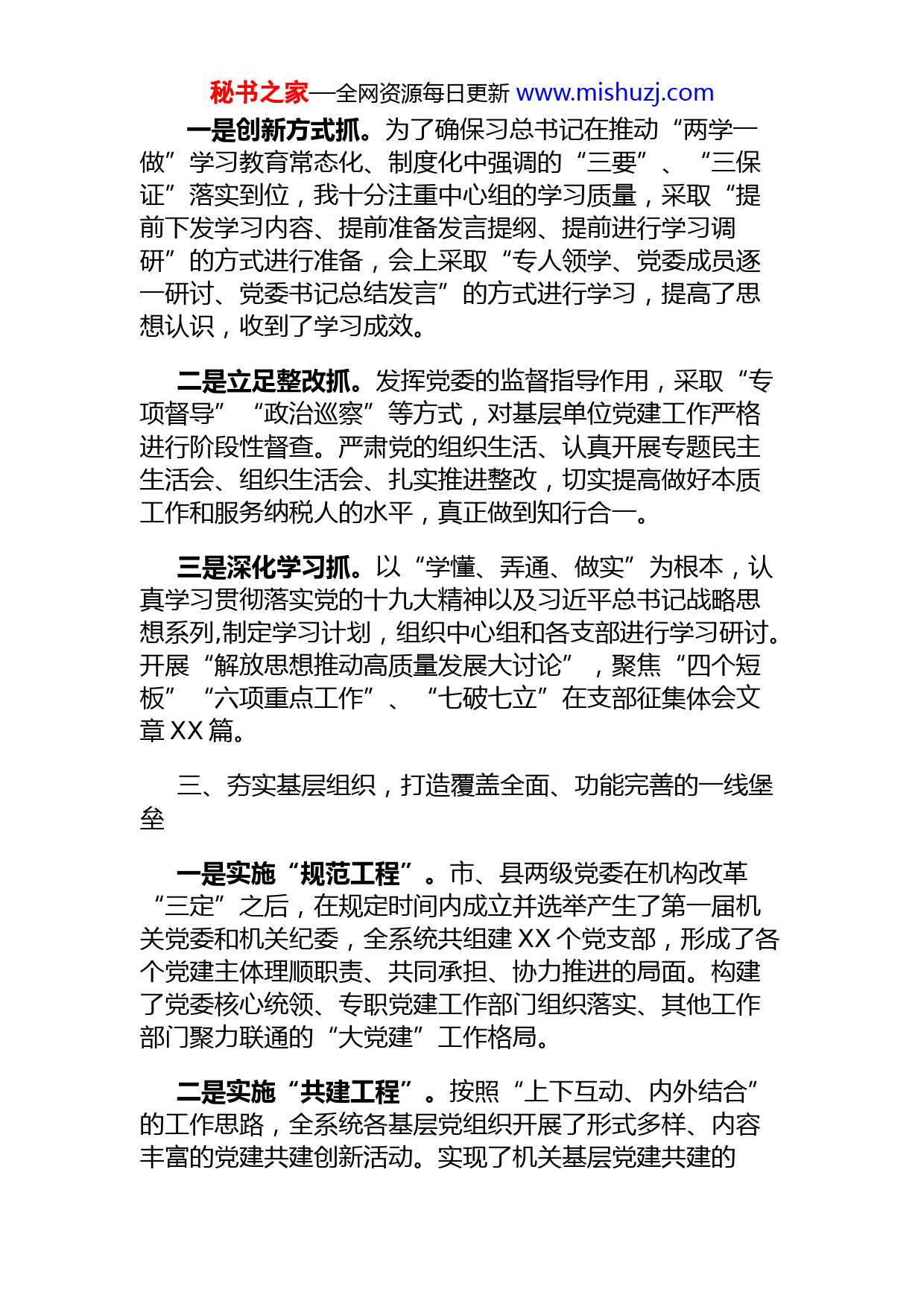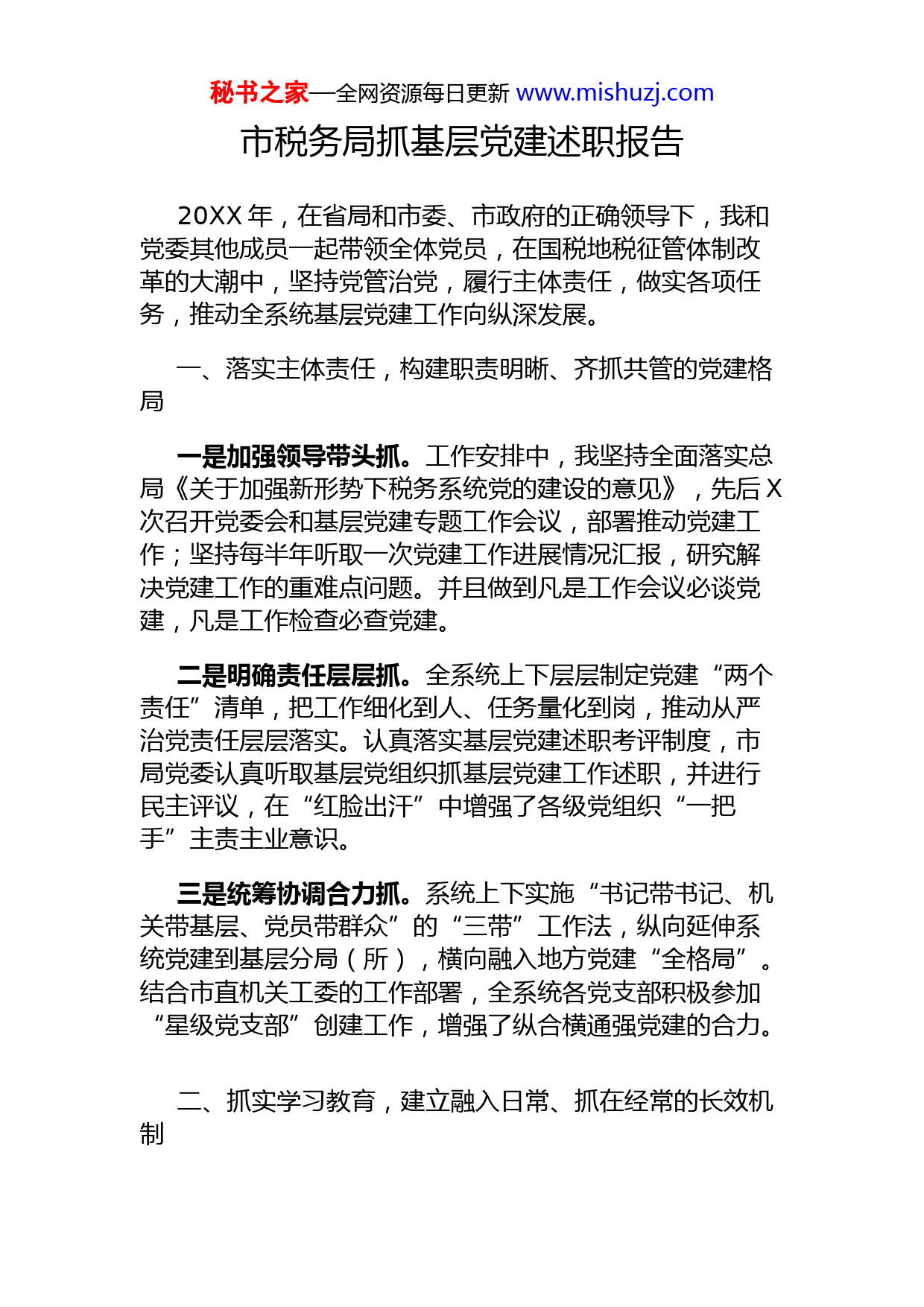 秘书之家—全网资源每日更新www.mishuzj.com市税务局抓基层党建述职报告20XX年,在省局和市委、市政府的正确领导下,我和党委其他成员一起带领全体党员,在国税地税征管体制改革的大潮中,坚持党管治党,履行主体责任,做实各项任务,推动全系统基层党建工作向纵深发展。一、落实主体责任,构建职责明晰、齐抓共管的党建格局一是加强领导带头抓。工作安排中,我坚持全面落实总局《关于加强新形势下税务系统党的建设的意见》,先后X次召开党委会和基层党建专题工作会议,部署推动党建工作;坚持每半年听取一次党建工作进展情况汇报,研究解决党建工作的重难点问题。并且做到凡是工作会议必谈党建,凡是工作检查必查党建。二是明确责任层层抓。全系统上下层层制定党建“两个责任”清单,把工作细化到人、任务量化到岗,推动从严治党责任层层落实。认真落实基层党建述职考评制度,市局党委认真听取基层党组织抓基层党建工作述职,并进行民主评议,在“红脸出汗”中增强了各级党组织“一把手”主责主业意识。三是统筹协调合力抓。系统上下实施“书记带书记、机关带基层、党员带群众”的“三带”工作法,纵向延伸系统党建到基层分局(所),横向融入地方党建“全格局”。结合市直机关工委的工作部署,全系统各党支部积极参加“星级党支部”创建工作,增强了纵合横通强党建的合力。二、抓实学习教育,建立融入日常、抓在经常的长效机制秘书之家—全网资源每日更新www.mishuzj.com一是创新方式抓。为了确保习总书记在推动“两学一做”学习教育常态化、制度化中强调的“三要”、“三保证”落实到位,我十分注重中心组的学习质量,采取“提前下发学习内容、提前准备发言提纲、提前进行学习调研”的方式进行准备,会上采取“专人领学、党委成员逐一研讨、党委书记总结发言”的方式进行学习,提高了思想认识,收到了学习成效。二是立足整改抓。发挥党委的监督指导作用,采取“专项督导”“政治巡察”等方式,对基层单位党建工作严格进行阶段性督查。严肃党的组织生活、认真开展专题民主生活会、组织生活会、扎实推进整改,切实提高做好本质工作和服务纳税人的水平,真正做到知行合一。三是深化学习抓。以“学懂、弄通、做实”为根本,认真学习贯彻落实党的十九大精神以及习近平总书记战略思想系列,制定学习计划,组织中心组和各支部进行学习研讨。开展“解放思想推动高质量发展大讨论”,聚焦“四个短板”“六项重点工作”、“七破七立”在支部征集体会文章XX篇。三、夯实基层组织,打造覆盖全面、功能完善的一线堡垒一是实施“规范工程”。市、县两级党委在机构改革“三定”之后,在规定时间内成立并选举产生了第一届机关党委和机关纪委,全系统共组建XX个党支部,形成了各个党建主体理顺职责、共同承担、协力推进的局面。构建了党委核心统领、专职党建工作部门组织落实、其他工作部门聚力联通的“大党建”工作格局。二是实施“共建工程”。按照“上下互动、内外结合”的工作思路,全系统各基层党组织开展了形式多样、内容丰富的党建共建创新活动。实现了机关基层党建共建的秘书之家—全网资源每日更新www.mishuzj.com“以上率下”、税企党建共建的“结对双赢”、军税党建共建的“强强联合”,拓展了党建工作的外延,实现了支部带动支部、党建互促共融。三是实施“创优工程”。按照“常规工作规范化、创新工作突出化、特色工作品牌化”工作思路。开展全系统XX名中层干部正职参加的“红心向党促改革”大型主题党日活动,厚植党员党性;举办“传承火炬精神凝聚奋进力量”先进典型事迹演讲报告会,引导党员“用身边的事教育身边的人”。回顾一年党建工作,虽然取得了一定成绩,但仍存在许多不足。主要表现为:(一)党组织负责人抓主业意识不到位。存在着自身向下压力传导不足,内部管理制度不严,重点岗位监督不够到位等问题。机关党组织书记、一把手抓主业的意识仍然不是很到位,存在“灯下黑”现象。部分党组织书记工作不到位,一些党建方面重要工作交给支部委员去做,没有在推进工作中积累自己的经验,也致使工作完成质量不高。(二)全系统“两学一做”学习教育工作进展不够平衡。个别单位和市局机关步调协调一致不够,重视力度不一,市局对基层督导还不够多、不够严。全面从严治党压力传导层层递减,存在“上热中温下凉”现象。(三)工学矛盾比较突出。学习上还存在着浅尝则止的现象,在分配业务工作和开展学习教育的时间、精力上协调不到位,有“一手重、一手轻”的问题。存在就党建论党建的问题,党建与业务工作“两层皮”现象还时有发生,在业务工作上抓得多、谋划得多,党建工作往往在考核验收的时候才抓,没有将党建工作与平时工作有效衔接起来。秘书之家—全网资源每日更新www.mishuzj.com(四)基层党组织开展工作创新力度不够。对基层党建工作的重要性认识不足,在带领广大党员完成税收任务、服务群众和纳税人等方面,政治保障作用发挥不够;有的党务工作者对党建业务不精,方法程序不够熟悉,思想政治工作手段单一。20XX年,我将继续坚持党建引领,全面深化国税地税征管体制改革工作,重点抓好以下工作:一是继续压实主体责任。要做到思想越来越