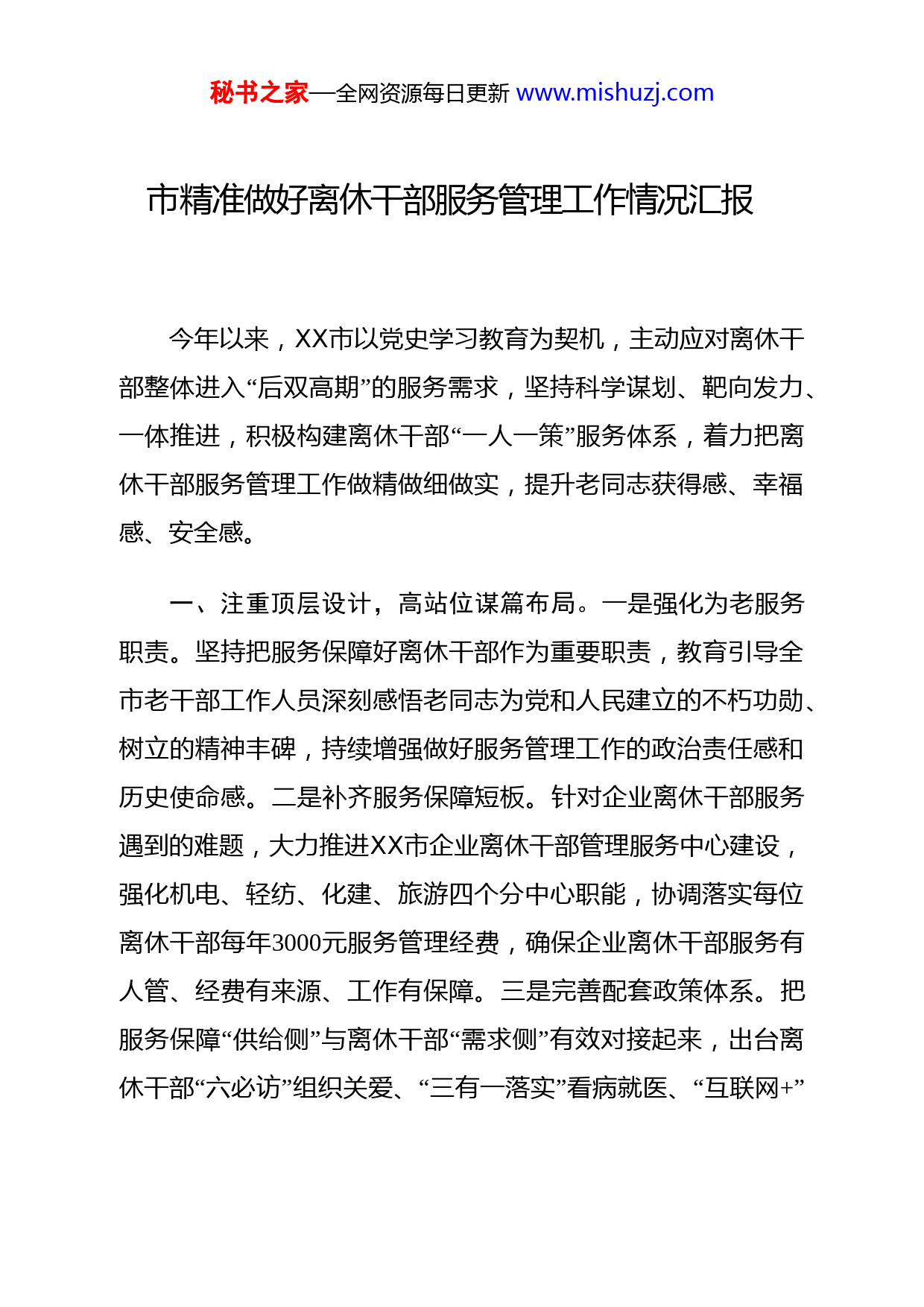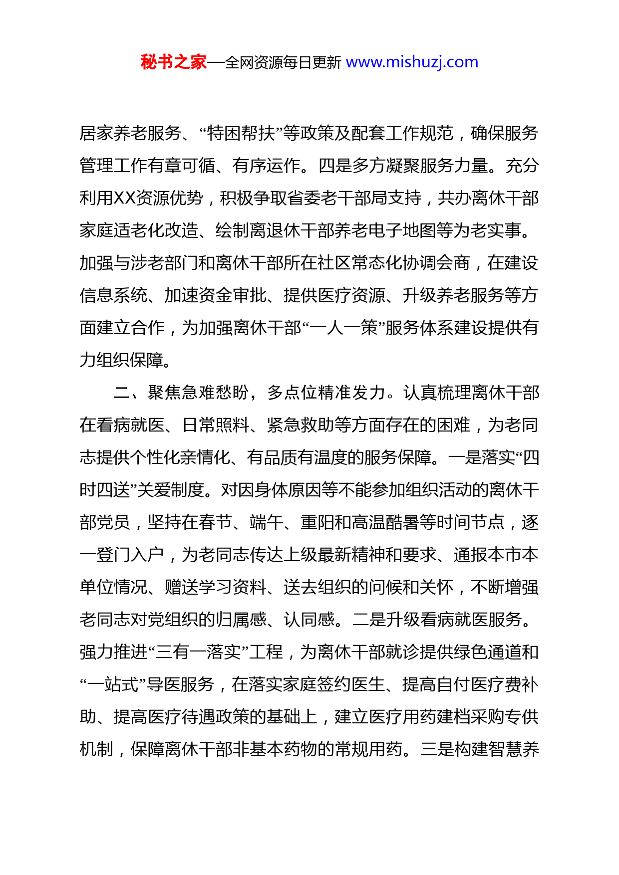 秘书之家—全网资源每日更新www.mishuzj.com市精准做好离休干部服务管理工作情况汇报今年以来,XX市以党史学习教育为契机,主动应对离休干部整体进入“后双高期”的服务需求,坚持科学谋划、靶向发力、一体推进,积极构建离休干部“一人一策”服务体系,着力把离休干部服务管理工作做精做细做实,提升老同志获得感、幸福感、安全感。一、注重顶层设计,高站位谋篇布局。一是强化为老服务职责。坚持把服务保障好离休干部作为重要职责,教育引导全市老干部工作人员深刻感悟老同志为党和人民建立的不朽功勋、树立的精神丰碑,持续增强做好服务管理工作的政治责任感和历史使命感。二是补齐服务保障短板。针对企业离休干部服务遇到的难题,大力推进XX市企业离休干部管理服务中心建设,强化机电、轻纺、化建、旅游四个分中心职能,协调落实每位离休干部每年3000元服务管理经费,确保企业离休干部服务有人管、经费有来源、工作有保障。三是完善配套政策体系。把服务保障“供给侧”与离休干部“需求侧”有效对接起来,出台离休干部“六必访”组织关爱、“三有一落实”看病就医、“互联网+”秘书之家—全网资源每日更新www.mishuzj.com居家养老服务、“特困帮扶”等政策及配套工作规范,确保服务管理工作有章可循、有序运作。四是多方凝聚服务力量。充分利用XX资源优势,积极争取省委老干部局支持,共办离休干部家庭适老化改造、绘制离退休干部养老电子地图等为老实事。加强与涉老部门和离休干部所在社区常态化协调会商,在建设信息系统、加速资金审批、提供医疗资源、升级养老服务等方面建立合作,为加强离休干部“一人一策”服务体系建设提供有力组织保障。二、聚焦急难愁盼,多点位精准发力。认真梳理离休干部在看病就医、日常照料、紧急救助等方面存在的困难,为老同志提供个性化亲情化、有品质有温度的服务保障。一是落实“四时四送”关爱制度。对因身体原因等不能参加组织活动的离休干部党员,坚持在春节、端午、重阳和高温酷暑等时间节点,逐一登门入户,为老同志传达上级最新精神和要求、通报本市本单位情况、赠送学习资料、送去组织的问候和关怀,不断增强老同志对党组织的归属感、认同感。二是升级看病就医服务。强力推进“三有一落实”工程,为离休干部就诊提供绿色通道和“一站式”导医服务,在落实家庭签约医生、提高自付医疗费补助、提高医疗待遇政策的基础上,建立医疗用药建档采购专供机制,保障离休干部非基本药物的常规用药。三是构建智慧养秘书之家—全网资源每日更新www.mishuzj.com老模式。引入“互联网+”居家养老服务,通过政府购买服务的方式,为离休干部提供每人每月8小时生活照护和紧急呼叫服务,涵盖助洁、助急、助餐、助购、助聊、助浴等6大类19小项服务。5家养老机构的21个服务网点与全市XXXX余名离休干部对接服务,目前已累计服务XXXX多人次、XX万多小时。四是完善特困帮扶制度。制定特殊困难离退休干部帮扶办法,实时更新数据库,开展精准帮扶、精准关爱活动。实行在重大节日、重要生日、重病住院、高温酷暑、遭受困难等情况下“六必访”制度,满足离休干部“微心愿”,办好尊老爱老、为老惠老“大实事”。三、健全标准体系,全周期监测管理。联合民政、卫健等多个部门会商研究,建立老同志服务管理评价监督体系。一是统一服务标准。联合相关部门及第三方机构,对居家养老等服务项目统一内容、标准、协议,规范项目建设与管理。对“六必访”等工作试行信息化管理运作,规范平台运用与服务监管。对“家庭签约医生”等服务队伍统一培训,推动区域服务水平共同提升。二是实时动态监测。依托市养老服务综合信息平台,动态管理全市离休干部身体状况、服务需求等信息。开发离休干部综合服务小程序,通过上门扫“码”确认项目,服务结束扫“码”上传相关图片资料,并由老同志进行满意度打分,形成派单、评估等全过程线上监测管理。三是注重考核激励。提高离秘书之家—全网资源每日更新www.mishuzj.com休干部服务管理年度考核占比,依据监测结果及满意度得分对服务机构进行综合考评,兑现服务经费,形成正向激励与反向约束机制,推动离休干部“一人一策”服务管理可持续、高效能推进。四、建立健全“智慧助老”常态化工作机制。年初,将开展“智慧助老”行动、解决老年人运用智能技术困难列为年度工作要点,扎实推进“XX老干部工作网”和“三秦夕阳红”信息化平台升级融合,实现“一网一号一平台”互通共享服务。在广大老同志中进一步普及信息化基本知识,组织编印《老年人智能手机操作使用简明手册》,录制智能手机操作使用视频,发放“三秦夕阳红”APP及“离退休干部工作”、“XX老干部”微信公众号宣传彩页2万余份。各级老干部工作部门纷纷制作内容简洁、易读易懂的智能手机应用“口袋书”、“小卡片”,方便老同志随时随地学习,收到良好效果。五、充分发挥老干部活动场所主阵地作用。依托老年大学老干部活动中心,发挥教学资源丰富、便于集中辅导的优势,将智能技术应用纳入教学课程。今年以来,全市各级老年大学、老干部活动中心普遍开设智能手机使用专题讲座和集中培训,帮助老同志熟练掌握移动支付、出示