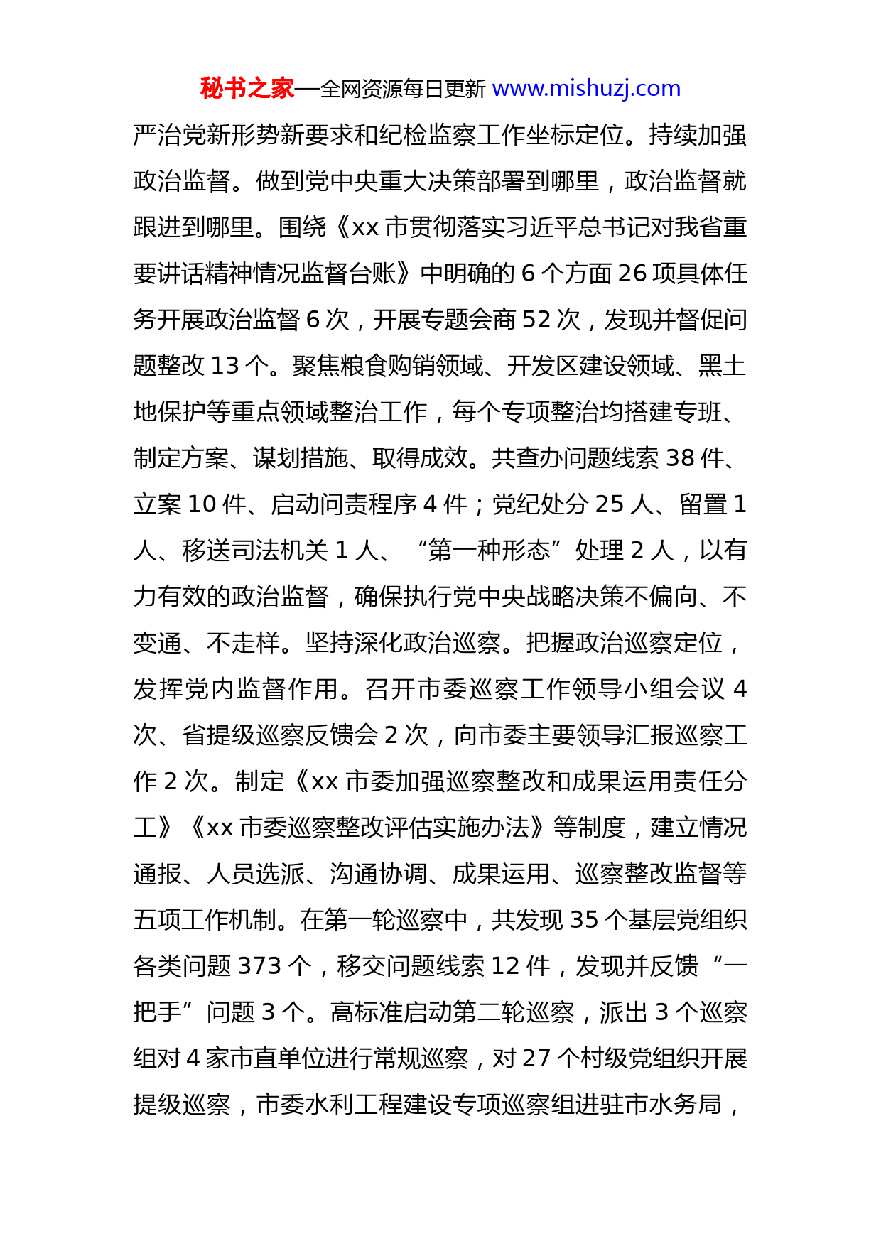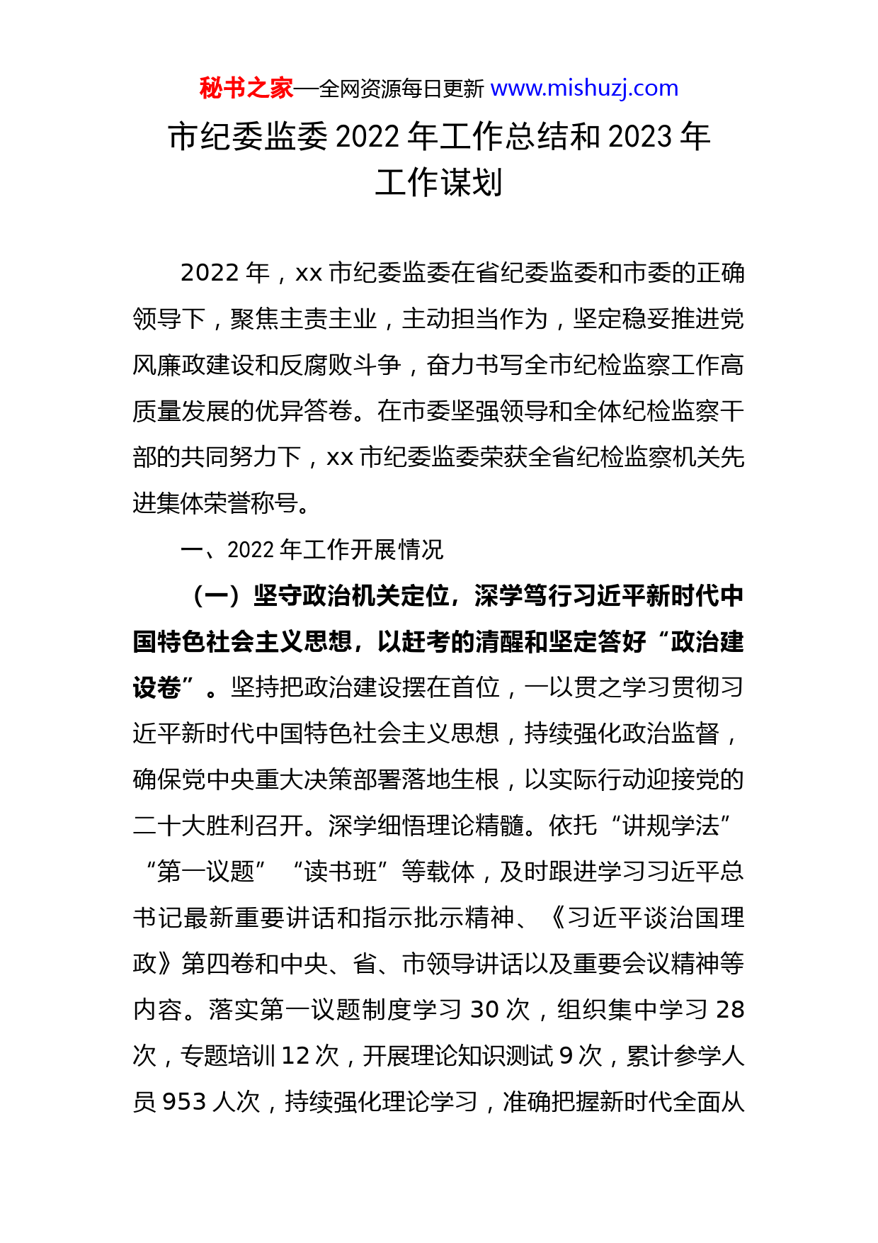 秘书之家—全网资源每日更新www.mishuzj.com市纪委监委2022年工作总结和2023年工作谋划2022年,xx市纪委监委在省纪委监委和市委的正确领导下,聚焦主责主业,主动担当作为,坚定稳妥推进党风廉政建设和反腐败斗争,奋力书写全市纪检监察工作高质量发展的优异答卷。在市委坚强领导和全体纪检监察干部的共同努力下,xx市纪委监委荣获全省纪检监察机关先进集体荣誉称号。一、2022年工作开展情况(一)坚守政治机关定位,深学笃行习近平新时代中国特色社会主义思想,以赶考的清醒和坚定答好“政治建设卷”。坚持把政治建设摆在首位,一以贯之学习贯彻习近平新时代中国特色社会主义思想,持续强化政治监督,确保党中央重大决策部署落地生根,以实际行动迎接党的二十大胜利召开。深学细悟理论精髓。依托“讲规学法”“第一议题”“读书班”等载体,及时跟进学习习近平总书记最新重要讲话和指示批示精神、《习近平谈治国理政》第四卷和中央、省、市领导讲话以及重要会议精神等内容。落实第一议题制度学习30次,组织集中学习28次,专题培训12次,开展理论知识测试9次,累计参学人员953人次,持续强化理论学习,准确把握新时代全面从秘书之家—全网资源每日更新www.mishuzj.com严治党新形势新要求和纪检监察工作坐标定位。持续加强政治监督。做到党中央重大决策部署到哪里,政治监督就跟进到哪里。围绕《xx市贯彻落实习近平总书记对我省重要讲话精神情况监督台账》中明确的6个方面26项具体任务开展政治监督6次,开展专题会商52次,发现并督促问题整改13个。聚焦粮食购销领域、开发区建设领域、黑土地保护等重点领域整治工作,每个专项整治均搭建专班、制定方案、谋划措施、取得成效。共查办问题线索38件、立案10件、启动问责程序4件;党纪处分25人、留置1人、移送司法机关1人、“第一种形态”处理2人,以有力有效的政治监督,确保执行党中央战略决策不偏向、不变通、不走样。坚持深化政治巡察。把握政治巡察定位,发挥党内监督作用。召开市委巡察工作领导小组会议4次、省提级巡察反馈会2次,向市委主要领导汇报巡察工作2次。制定《xx市委加强巡察整改和成果运用责任分工》《xx市委巡察整改评估实施办法》等制度,建立情况通报、人员选派、沟通协调、成果运用、巡察整改监督等五项工作机制。在第一轮巡察中,共发现35个基层党组织各类问题373个,移交问题线索12件,发现并反馈“一把手”问题3个。高标准启动第二轮巡察,派出3个巡察组对4家市直单位进行常规巡察,对27个村级党组织开展提级巡察,市委水利工程建设专项巡察组进驻市水务局,秘书之家—全网资源每日更新www.mishuzj.com开展为期1个月的上下联动专项巡察。纪检监察机关累计派出参与巡察干部7人,主动担负起发现问题、形成震慑、推动改革、促进发展的职能责任,推动全面从严治党向纵深发展。精准聚焦“关键少数”。认真履行协助职责和监督责任,坚决推动《中共中央关于加强对“一把手”和领导班子监督的意见》贯彻落实。坚决落实纪检监察机关28项工作任务,定期督促各责任部门落实65项工作任务。探索建立“四三”监督机制(抓好“三类教育”、做好“三个廉政+”、开好“三个会”、用好“三个手段”),经验作法在省纪委监委信息专刊发表,在省纪检监察系统工作推进会上做专题经验交流。开展任前廉政谈话31人次,督促各单位负责人廉政谈话54人次;制发“两函一书”100份,督促整改问题8个;结合机关能力作风建设和监督保障优化营商环境工作,组织开展了“转作风提效能优环境促发展”群众评议会,对与群众息息相关6家单位“我为群众办实事”等作风建设及营商环境建设情况进行“综合体检”,以“辣味”评议和“立体”监督形式,推动涉及民生问题整改13个,倒逼相关部门“一把手”履职尽责。助推优化政治生态。协助市委完成牡丹江市委考核组对xx市2021年度政治生态建设成效考核的筹备工作,2021年度xx市委政治生态建设成效情况被评定为“A”等次。对省委政治生态建设成效考核反馈问题实秘书之家—全网资源每日更新www.mishuzj.com行月督办,汇总反馈问题整改推进情况4次。全面梳理2018年至2021年省委政治生态考核反馈问题,发现未完成整改问题1个。受理并协调解决牡丹江民心网群众反映问题4件。制定《xx市政治生态建设成效考核工作方案》,拟开展政治生态建设成效考核工作。牵头做好创建全省文明城市政务环境推进组工作,持续打造廉洁高效的政务环境。推动政府落实全面实行权责清单制度,涉及的5个单位全部完成省市下放权责清单的承接工作。搭建了“互联网+社情民意”平台,创新民众办事“码上问效”线上评价,将38个市直部门、8个乡镇全部纳入“问效”管理,共受理群众信件21条,办结19条;线上群众评价4950条,其中五星好评4875条,好评率98.5%。严格执行党员权利保障条例,落实“三个区分开来”,为受到不实举报者澄清正名4人次,对受处分人员开展暖心回访36人次,旗帜鲜明为担当作为干部撑腰鼓劲。(二)聚焦监督第一职责,持续释放监督治理效能,以如磐的执着和韧劲答好“作风建设卷”。紧紧围绕监督首要职责,将责任向监督压实,力量向监督倾斜,在监督上全面从严、全面发力,确保监督执纪和监察执法不留死角、没有空白。日常监督不停