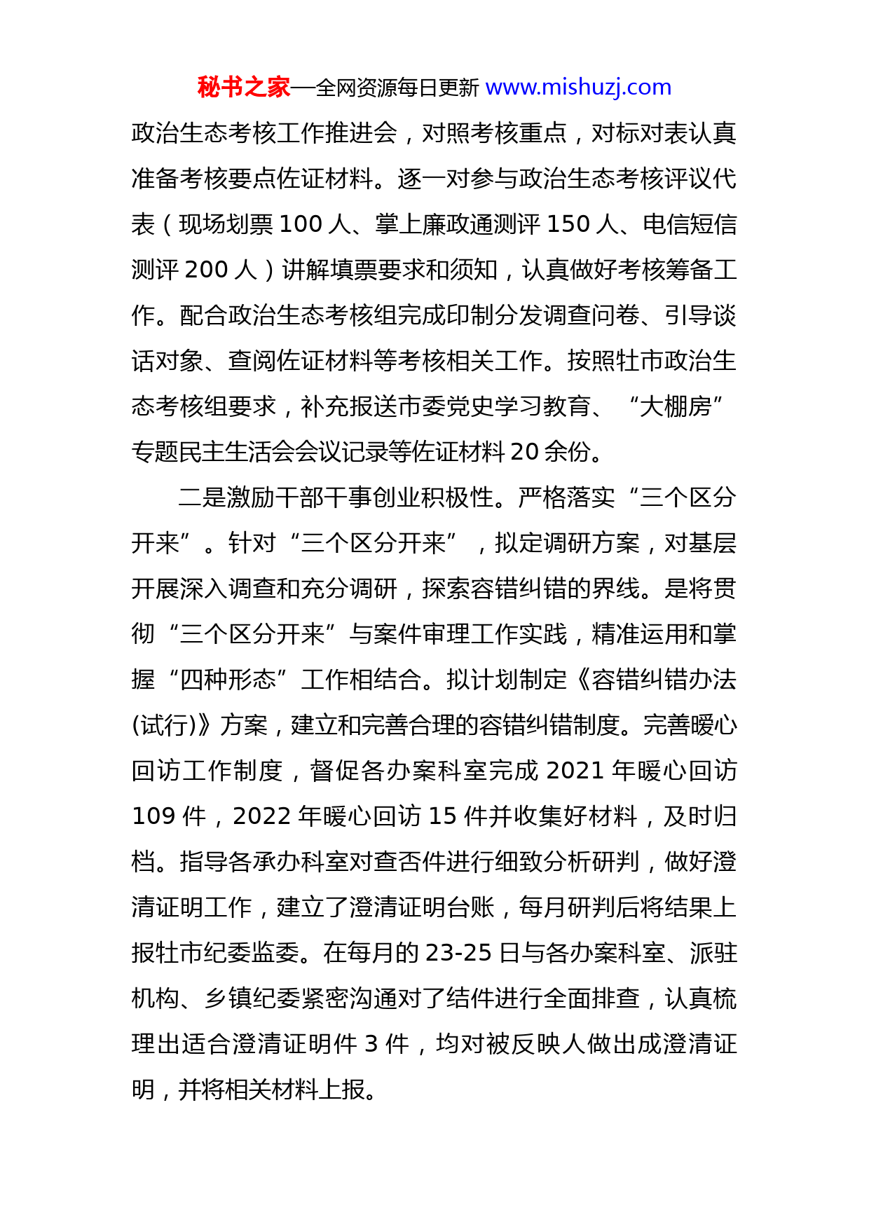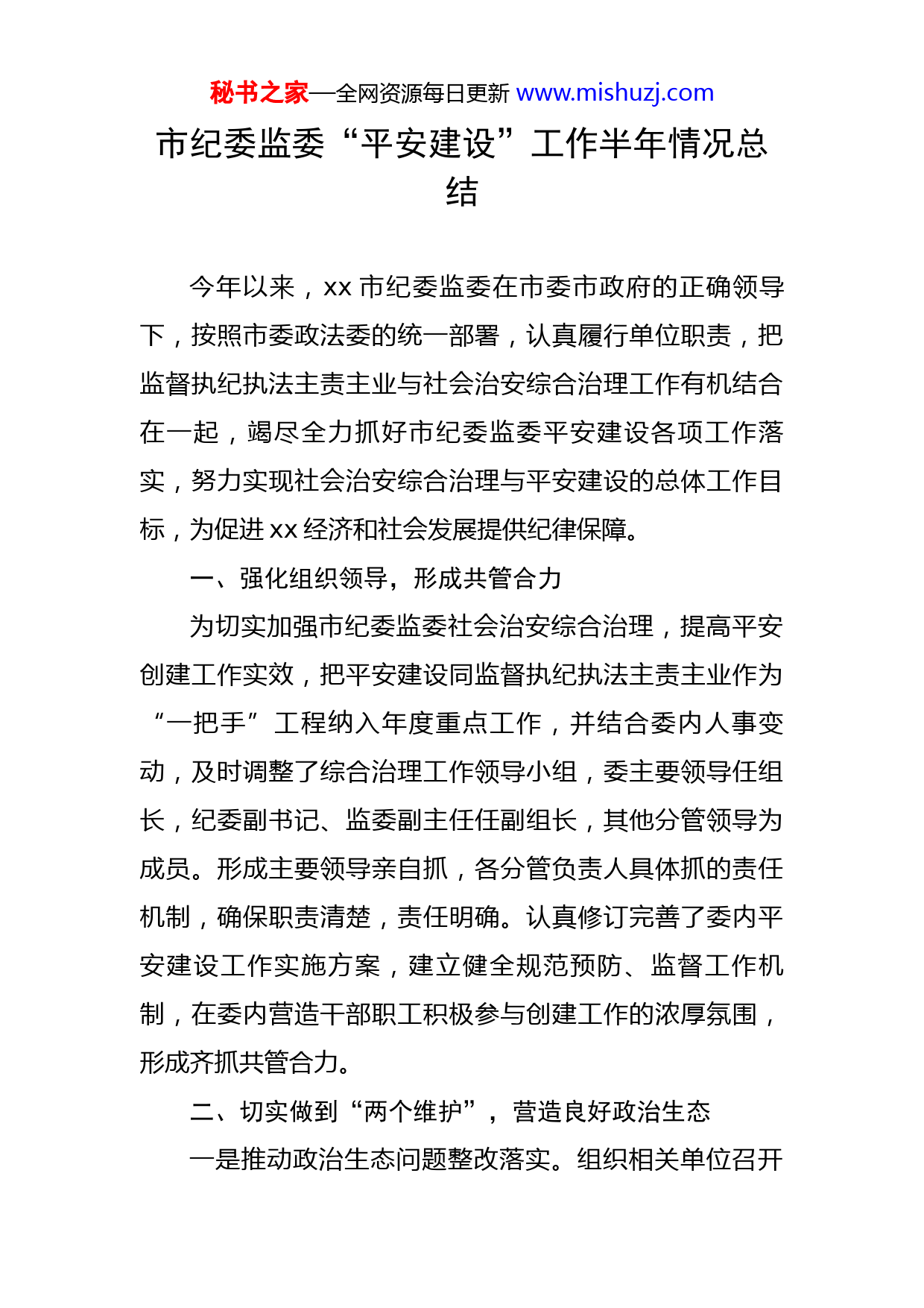 秘书之家—全网资源每日更新www.mishuzj.com市纪委监委“平安建设”工作半年情况总结今年以来,xx市纪委监委在市委市政府的正确领导下,按照市委政法委的统一部署,认真履行单位职责,把监督执纪执法主责主业与社会治安综合治理工作有机结合在一起,竭尽全力抓好市纪委监委平安建设各项工作落实,努力实现社会治安综合治理与平安建设的总体工作目标,为促进xx经济和社会发展提供纪律保障。一、强化组织领导,形成共管合力为切实加强市纪委监委社会治安综合治理,提高平安创建工作实效,把平安建设同监督执纪执法主责主业作为“一把手”工程纳入年度重点工作,并结合委内人事变动,及时调整了综合治理工作领导小组,委主要领导任组长,纪委副书记、监委副主任任副组长,其他分管领导为成员。形成主要领导亲自抓,各分管负责人具体抓的责任机制,确保职责清楚,责任明确。认真修订完善了委内平安建设工作实施方案,建立健全规范预防、监督工作机制,在委内营造干部职工积极参与创建工作的浓厚氛围,形成齐抓共管合力。二、切实做到“两个维护”,营造良好政治生态一是推动政治生态问题整改落实。组织相关单位召开秘书之家—全网资源每日更新www.mishuzj.com政治生态考核工作推进会,对照考核重点,对标对表认真准备考核要点佐证材料。逐一对参与政治生态考核评议代表(现场划票100人、掌上廉政通测评150人、电信短信测评200人)讲解填票要求和须知,认真做好考核筹备工作。配合政治生态考核组完成印制分发调查问卷、引导谈话对象、查阅佐证材料等考核相关工作。按照牡市政治生态考核组要求,补充报送市委党史学习教育、“大棚房”专题民主生活会会议记录等佐证材料20余份。二是激励干部干事创业积极性。严格落实“三个区分开来”。针对“三个区分开来”,拟定调研方案,对基层开展深入调查和充分调研,探索容错纠错的界线。是将贯彻“三个区分开来”与案件审理工作实践,精准运用和掌握“四种形态”工作相结合。拟计划制定《容错纠错办法(试行)》方案,建立和完善合理的容错纠错制度。完善暧心回访工作制度,督促各办案科室完成2021年暖心回访109件,2022年暖心回访15件并收集好材料,及时归档。指导各承办科室对查否件进行细致分析研判,做好澄清证明工作,建立了澄清证明台账,每月研判后将结果上报牡市纪委监委。在每月的23-25日与各办案科室、派驻机构、乡镇纪委紧密沟通对了结件进行全面排查,认真梳理出适合澄清证明件3件,均对被反映人做出成澄清证明,并将相关材料上报。秘书之家—全网资源每日更新www.mishuzj.com三、推进“三不一体”机制建设,取得更大治理成效一是坚决从严惩治腐败。警惕政治腐败,防范和查处“七个有之”问题,对搞利益集团、小团体、小圈子的人毫不手软、一查到底。制定了《xx市纪委监委关于开展贯彻落实习近平总书记对我省重要讲话精神情况专项监督行动的工作方案》和《xx市贯彻落实习近平总书记对我省重要讲话精神情况监督台账》,组织7个监督检查室深入相关责任单位对6个方面26项具体任务开展监督检查10次,开展专题会商4次,发现问题13个,督促限期整改。强化对政策支持力度大、投资密集、资源集中重点领域的监督检查,严肃查处腐败问题,减少腐败存量,遏制腐败增量。制定了《关于开展全市公共资源交易和政府采购领域突出问题专项监督工作方案》,认真开展专项监督检查。督促各职能部门开展自查自纠,截至目前,发现存在公共资源交易和政府采购领域的项目问题38个,现已完成整改问题35个,查处问题1件,给予党纪政务处分1人。持续开展粮食购销领域腐败问题专项整治,立案8件。在全市范围内开展粮食补贴专项行动,成立由监督检查室、审查调查室、相关派驻纪检监察组组成的5个督导组深入乡镇村屯开展清查,对发现的问题线索及时分析研判,共召开推进会议2次,立案7件。制发了《关于落实<省纪委监委关于纪检监察机关监督保障优化营商环境的意见>工作秘书之家—全网资源每日更新www.mishuzj.com措施清单》,明确了5方面监督重点和责任分工。紧盯行政审批、执法司法和窗口服务等岗位,以整治“庸懒散慢浮”为重点,采取“四不两直”方式,对各单位各部门机关风纪等开展明察暗访。共开展监督检查4次,发现优化营商环境方面问题21个,运用第一种形态处理31人。2022年以来,在纪检监察内网党风政风统计系统中上报农村集体“三资”管理问题4件,给予党纪处分4人。加强与司法机关的协作配合,持续加大惩治腐败力度,建立健全司法机关提前介入等工作机制。注重结合工作实际,加强与检法两院及相关专业人员的沟通与联系,通过常年业务咨询与频繁联系,建立起长期有效的沟通模式。拟制定《xx市法律专家咨询工作方案》,进一涉建立健全司法机关提前介入工作机制。与牡市纪委监委、xx市人民检察院相关专业人员沟通吕某某案件,就是否构成职务犯罪展开讨论研判。规范线索移送机制,接收公检法单位移交线索5件,全部按时限予以分办流转到承办部门,现已结案4件,处分4人。二是深入推进标本兼治。落实党中央《关于加强新时代廉洁文化建设的意见》,深入开展廉洁文化“六进”工作。组织城乡社区工作局、设计公司人员到牡丹江阳明区碧水云天小区考察廉洁文