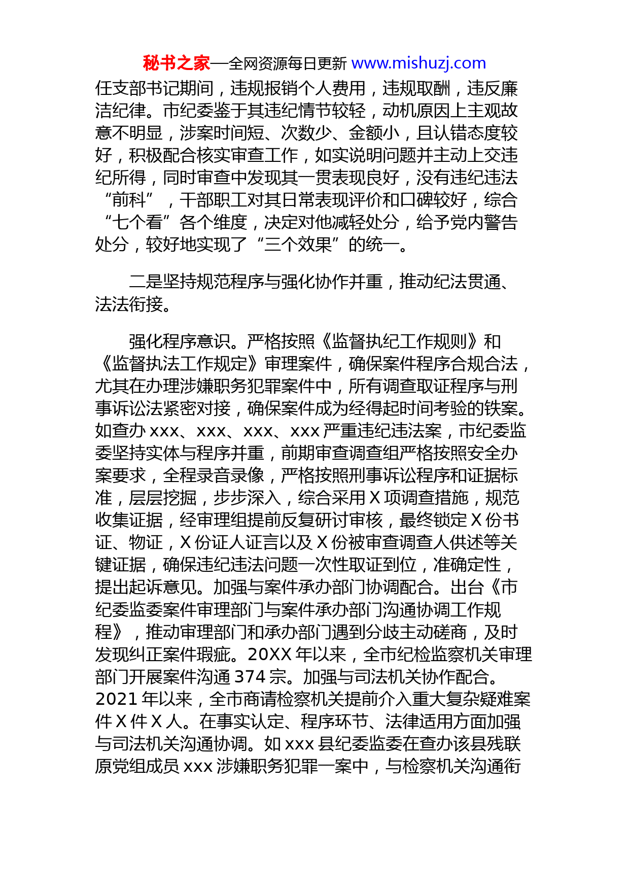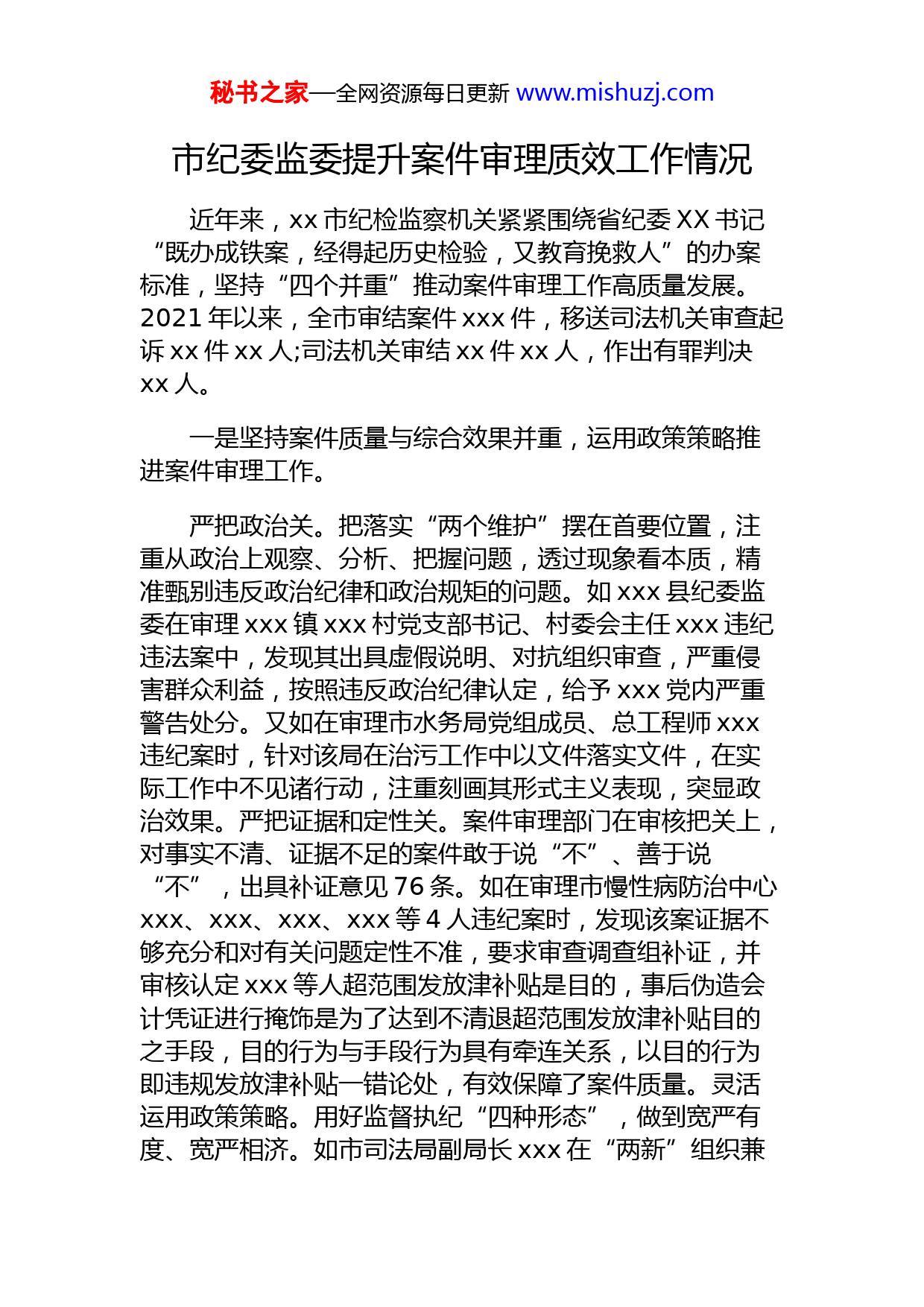秘书之家—全网资源每日更新www.mishuzj.com市纪委监委提升案件审理质效工作情况近年来,xx市纪检监察机关紧紧围绕省纪委XX书记“既办成铁案,经得起历史检验,又教育挽救人”的办案标准,坚持“四个并重”推动案件审理工作高质量发展。2021年以来,全市审结案件xxx件,移送司法机关审查起诉xx件xx人;司法机关审结xx件xx人,作出有罪判决xx人。一是坚持案件质量与综合效果并重,运用政策策略推进案件审理工作。严把政治关。把落实“两个维护”摆在首要位置,注重从政治上观察、分析、把握问题,透过现象看本质,精准甄别违反政治纪律和政治规矩的问题。如xxx县纪委监委在审理xxx镇xxx村党支部书记、村委会主任xxx违纪违法案中,发现其出具虚假说明、对抗组织审查,严重侵害群众利益,按照违反政治纪律认定,给予xxx党内严重警告处分。又如在审理市水务局党组成员、总工程师xxx违纪案时,针对该局在治污工作中以文件落实文件,在实际工作中不见诸行动,注重刻画其形式主义表现,突显政治效果。严把证据和定性关。案件审理部门在审核把关上,对事实不清、证据不足的案件敢于说“不”、善于说“不”,出具补证意见76条。如在审理市慢性病防治中心xxx、xxx、xxx、xxx等4人违纪案时,发现该案证据不够充分和对有关问题定性不准,要求审查调查组补证,并审核认定xxx等人超范围发放津补贴是目的,事后伪造会计凭证进行掩饰是为了达到不清退超范围发放津补贴目的之手段,目的行为与手段行为具有牵连关系,以目的行为即违规发放津补贴一错论处,有效保障了案件质量。灵活运用政策策略。用好监督执纪“四种形态”,做到宽严有度、宽严相济。如市司法局副局长xxx在“两新”组织兼秘书之家—全网资源每日更新www.mishuzj.com任支部书记期间,违规报销个人费用,违规取酬,违反廉洁纪律。市纪委鉴于其违纪情节较轻,动机原因上主观故意不明显,涉案时间短、次数少、金额小,且认错态度较好,积极配合核实审查工作,如实说明问题并主动上交违纪所得,同时审查中发现其一贯表现良好,没有违纪违法“前科”,干部职工对其日常表现评价和口碑较好,综合“七个看”各个维度,决定对他减轻处分,给予党内警告处分,较好地实现了“三个效果”的统一。二是坚持规范程序与强化协作并重,推动纪法贯通、法法衔接。强化程序意识。严格按照《监督执纪工作规则》和《监督执法工作规定》审理案件,确保案件程序合规合法,尤其在办理涉嫌职务犯罪案件中,所有调查取证程序与刑事诉讼法紧密对接,确保案件成为经得起时间考验的铁案。如查办xxx、xxx、xxx、xxx严重违纪违法案,市纪委监委坚持实体与程序并重,前期审查调查组严格按照安全办案要求,全程录音录像,严格按照刑事诉讼程序和证据标准,层层挖掘,步步深入,综合采用X项调查措施,规范收集证据,经审理组提前反复研讨审核,最终锁定X份书证、物证,X份证人证言以及X份被审查调查人供述等关键证据,确保违纪违法问题一次性取证到位,准确定性,提出起诉意见。加强与案件承办部门协调配合。出台《市纪委监委案件审理部门与案件承办部门沟通协调工作规程》,推动审理部门和承办部门遇到分歧主动磋商,及时发现纠正案件瑕疵。20XX年以来,全市纪检监察机关审理部门开展案件沟通374宗。加强与司法机关协作配合。2021年以来,全市商请检察机关提前介入重大复杂疑难案件X件X人。在事实认定、程序环节、法律适用方面加强与司法机关沟通协调。如xxx县纪委监委在查办该县残联原党组成员xxx涉嫌职务犯罪一案中,与检察机关沟通衔秘书之家—全网资源每日更新www.mishuzj.com接充分,从提前介入到移送审查起诉仅用时一周,最终法院判决认定的事实与监察机关认定事实一致。三是坚持严厉惩治与预防教育并重,发挥审理推动以案促改最大作用。坚持实事求是、依规依纪依法,严格审理案件。2020年、2021年分别给予党纪政务处分xxx人、xxx人,惩治力度不断加大。同时,扎实做好审理“后半篇文章”,一体推进不敢腐、不能腐、不想腐。抓好回访教育。对近三年以来受到处分的xxx名党员干部进行回访教育,帮助“跌倒干部”提高思想认识重新振作,让其感受到纪律的硬度和组织的温度。如20xx年市交通运输局安全监督科科长xxx因违反工作纪律被给予党内警告和行政记过处分,该同志一度情绪低落。市纪委及时对其回访教育,讲清楚“惩前毖后、治病救人”“改了就是好同志”“改好可用”政策,使其放下思想包袱,重新振作,兢兢业业工作。因工作表现突出,xxx于2021年被组织提拔为市交通运输局党组成员、副局长。加强警示教育。梳理党的十九大以来全市查处的教育、公安、自然资源、水务、卫健等重点领域案件,印发《关于利用身边人身边案开展专题警示教育的通知》,督促案发单位针对内部问题开展全员警示教育。推动以案促改。用好用活本地典型违纪违法案例,与xx日报联合开设“以案促改·我们这么做”专栏,自今年7月起,每月刊登1宗违纪违法典型案例以案促改实践。对标省纪委监委做好纪检监察建议工作的最新部署要求,在抓好重大案件“一案一总结”的基础上,针对xxx、xxx、xxx等案件,研究提出务实管用的整改建议,如就xxx区人社局系列案暴露的设立账外账问题向xxx区委提出纪检监察建议,重点整治虚列虚增