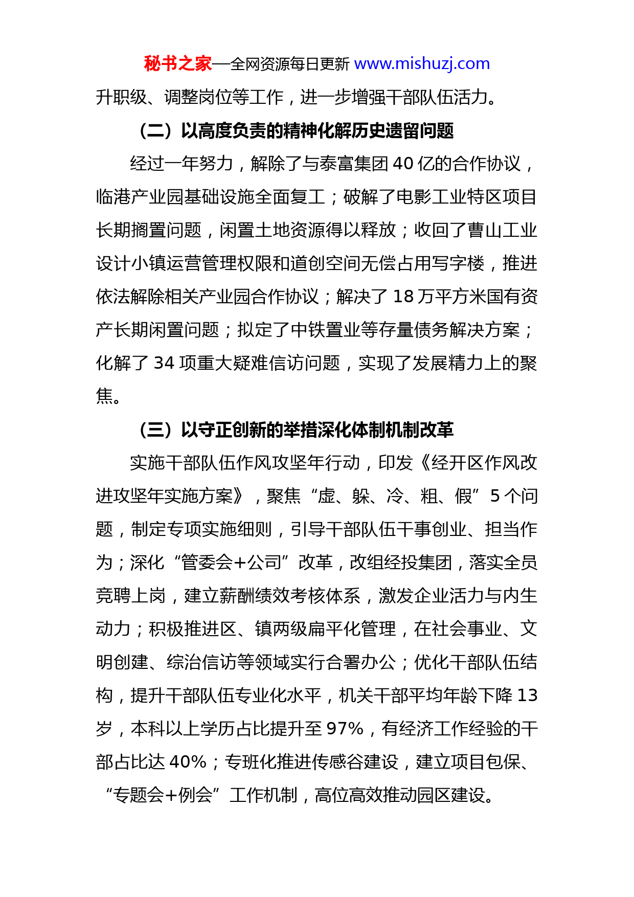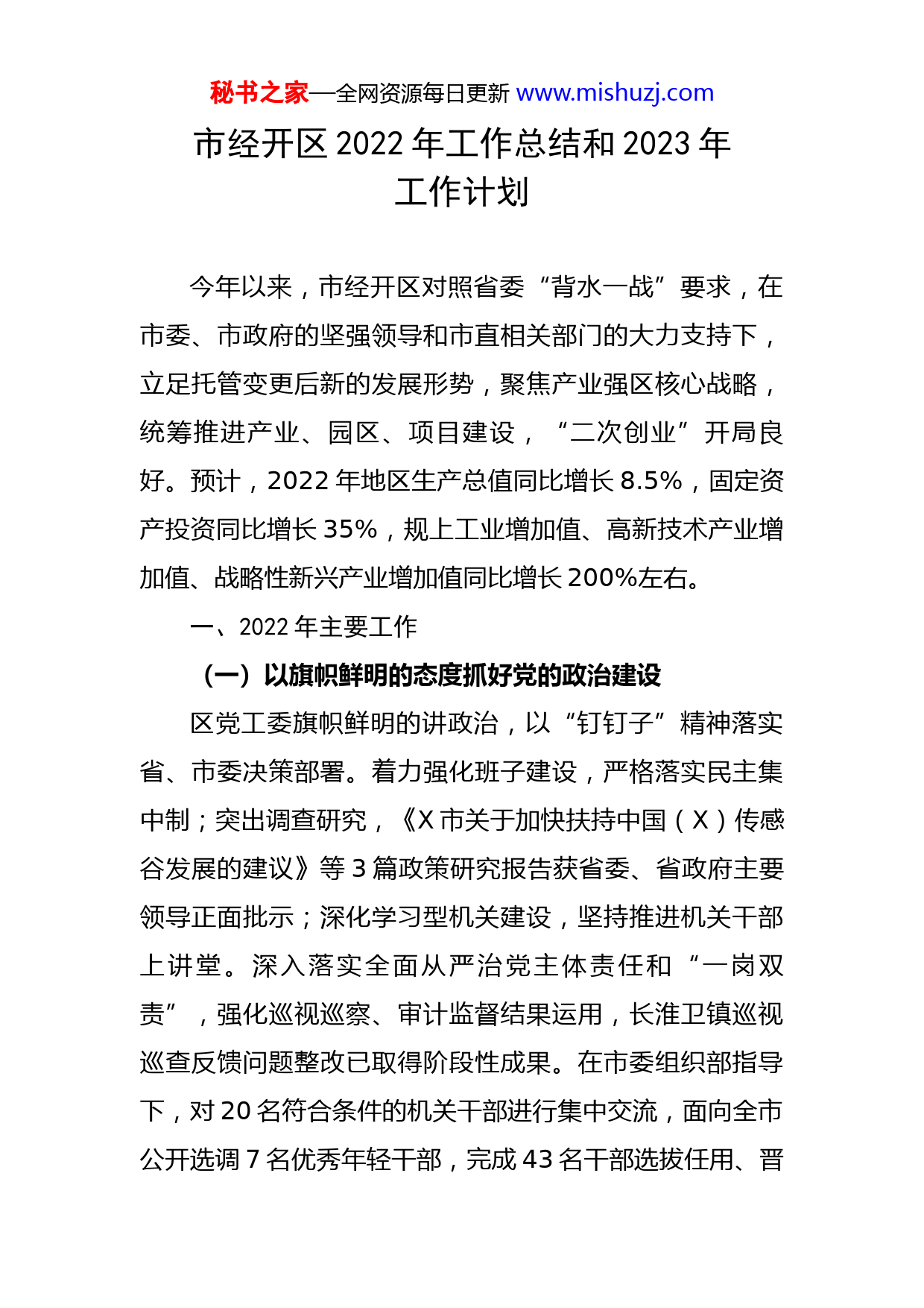 秘书之家—全网资源每日更新www.mishuzj.com市经开区2022年工作总结和2023年工作计划今年以来,市经开区对照省委“背水一战”要求,在市委、市政府的坚强领导和市直相关部门的大力支持下,立足托管变更后新的发展形势,聚焦产业强区核心战略,统筹推进产业、园区、项目建设,“二次创业”开局良好。预计,2022年地区生产总值同比增长8.5%,固定资产投资同比增长35%,规上工业增加值、高新技术产业增加值、战略性新兴产业增加值同比增长200%左右。一、2022年主要工作(一)以旗帜鲜明的态度抓好党的政治建设区党工委旗帜鲜明的讲政治,以“钉钉子”精神落实省、市委决策部署。着力强化班子建设,严格落实民主集中制;突出调查研究,《X市关于加快扶持中国(X)传感谷发展的建议》等3篇政策研究报告获省委、省政府主要领导正面批示;深化学习型机关建设,坚持推进机关干部上讲堂。深入落实全面从严治党主体责任和“一岗双责”,强化巡视巡察、审计监督结果运用,长淮卫镇巡视巡查反馈问题整改已取得阶段性成果。在市委组织部指导下,对20名符合条件的机关干部进行集中交流,面向全市公开选调7名优秀年轻干部,完成43名干部选拔任用、晋秘书之家—全网资源每日更新www.mishuzj.com升职级、调整岗位等工作,进一步增强干部队伍活力。(二)以高度负责的精神化解历史遗留问题经过一年努力,解除了与泰富集团40亿的合作协议,临港产业园基础设施全面复工;破解了电影工业特区项目长期搁置问题,闲置土地资源得以释放;收回了曹山工业设计小镇运营管理权限和道创空间无偿占用写字楼,推进依法解除相关产业园合作协议;解决了18万平方米国有资产长期闲置问题;拟定了中铁置业等存量债务解决方案;化解了34项重大疑难信访问题,实现了发展精力上的聚焦。(三)以守正创新的举措深化体制机制改革实施干部队伍作风攻坚年行动,印发《经开区作风改进攻坚年实施方案》,聚焦“虚、躲、冷、粗、假”5个问题,制定专项实施细则,引导干部队伍干事创业、担当作为;深化“管委会+公司”改革,改组经投集团,落实全员竞聘上岗,建立薪酬绩效考核体系,激发企业活力与内生动力;积极推进区、镇两级扁平化管理,在社会事业、文明创建、综治信访等领域实行合署办公;优化干部队伍结构,提升干部队伍专业化水平,机关干部平均年龄下降13岁,本科以上学历占比提升至97%,有经济工作经验的干部占比达40%;专班化推进传感谷建设,建立项目包保、“专题会+例会”工作机制,高位高效推动园区建设。秘书之家—全网资源每日更新www.mishuzj.com(四)以二次创业的决心推动重大项目突破今年新开工建设希磁科技产业园一期等亿元以上项目14个;目前在建重点项目34个,其中产业类项目14个,总投资146亿元。总投资50亿元的8英寸MEMS晶圆生产线项目顺利通过国家发改委窗口指导。总投资10亿元的6英寸MEMS晶圆扩能项目(5000片)部分设备正在安装调试,预计明年上半年达产;总投资11亿元的融薇科技6英寸MEMS晶圆生产线项目全套生产设备已运抵X,正在开展厂房装修改造;总投资5亿元的仙芈智造新型智能功率模组(IPM)研发生产基地、芯动联科MEMS封装测试生产及研发项目正加快建设,计划年底前正式投产。总投资20亿元的传感谷EPC一期40万方标准化厂房项目正在加快建设,首批6万方标准化厂房年内建成交付;EPC二期9.9亿元中标单位正进场搭建临舍;比亚迪追加投资10亿元,其中总投资3.5亿元的pack包项目正式投产,总投资6.5亿元的电解液、介质回收等项目即将开工;总投资5亿元的奥福精密陶瓷产业园即将投产。(五)以专业精准的打法扩大双招双引成效推动省级开发区核准范围移区和主导产业变更,确定智能传感器、非金属新材料、装备制造为3大主导产业,大力推进基金招商、平台招商、产业链招商。与北京深赛创业投资管理有限公司和蚌投集团合作设立的1亿元智能秘书之家—全网资源每日更新www.mishuzj.com传感器投资基金、与皖投集团合作设立的5亿元智能传感器产业基金正在加快推进。今年以来累计引进智能传感器器件孵化中试线、希磁科技产业园一期等优质产业链上下游项目32个,总投资147亿元,其中10亿元以上项目4个,50亿元以上项目1个,初步形成了以华东光电集成器件、芯动联科、中科米微为主的研发设计,以北方电子、华鑫微纳、融薇科技为主的晶圆制造,以希磁科技、禹芯半导体、仙芈智造为主的封装测试,以芯智达、金诚聚、中科九衡为主的终端应用为一体的智能传感器全产业链体系和以弗迪电池、奥福环保、大力熊为代表的新能源新材料产业集群。(六)以办就办好的力度推动社会事业进步大力实施安居保障工程。今年以来共实施兰凤家园B、C地块等5个安置房项目建设,共计7354套。其中,兰凤家园B区C区、龙湖嘉园三期、淮光新型城镇化项目南区已竣工,总建筑面积87.2万平方米,总投资27.13亿元,安置住宅6728套;继续实施卫教提质工程。新城临港分校9月顺利开学招生,首批在校生1000余人;长淮卫镇中心卫生院与X三院签订合作框架协议,深化紧密型医联体合作;实施农村人居环境整治和生态综合治理,加快推进公益性公墓、农村老年食堂、农村托幼所等场所建设,提高农民生活质量;织密疫情防控防护网,全区共设秘书之家—全网资源每日更新www.mishuzj.com置采样点18个,采样台36个,机动采样
