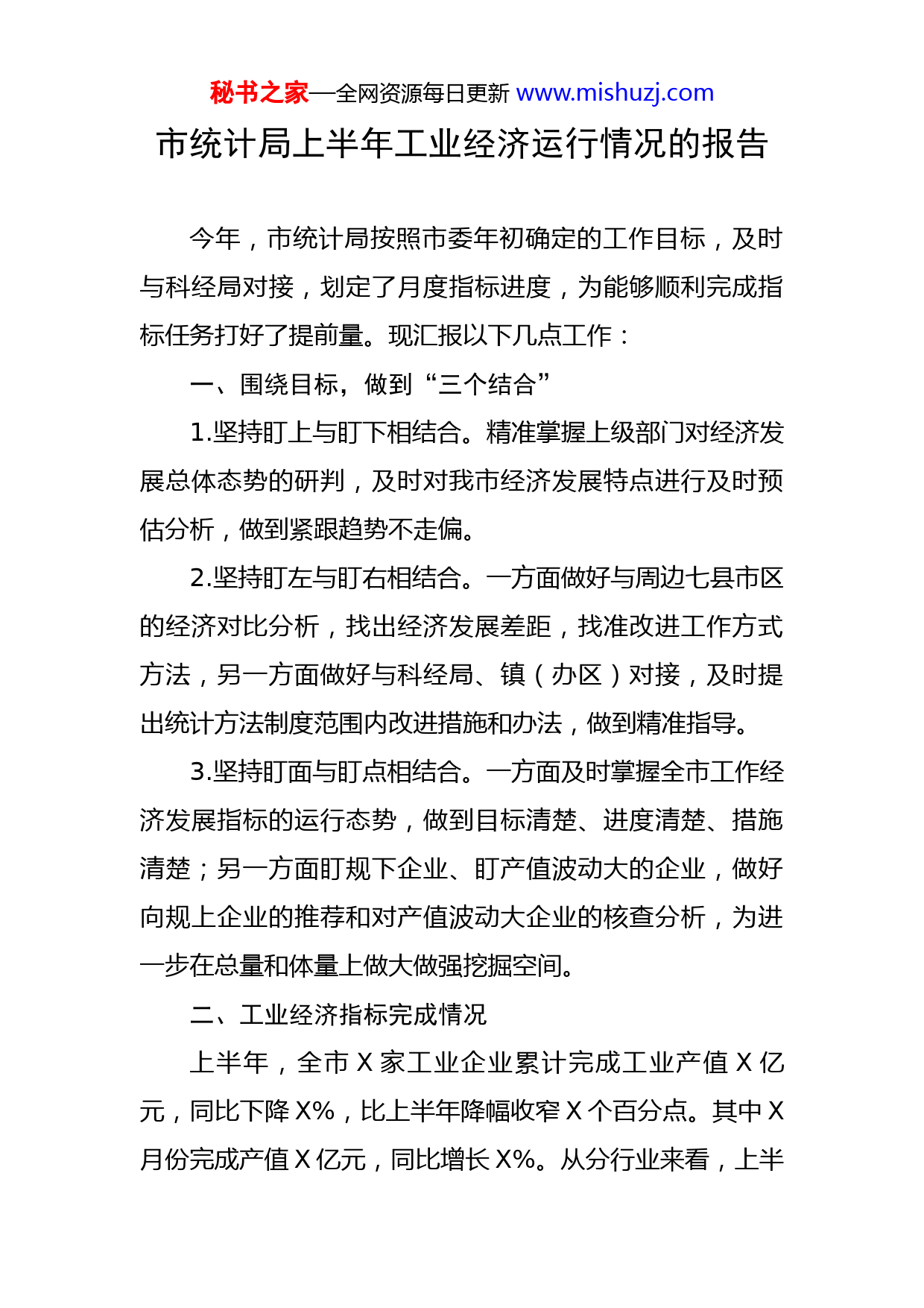 秘书之家—全网资源每日更新www.mishuzj.com市统计局上半年工业经济运行情况的报告今年,市统计局按照市委年初确定的工作目标,及时与科经局对接,划定了月度指标进度,为能够顺利完成指标任务打好了提前量。现汇报以下几点工作:一、围绕目标,做到“三个结合”1.坚持盯上与盯下相结合。精准掌握上级部门对经济发展总体态势的研判,及时对我市经济发展特点进行及时预估分析,做到紧跟趋势不走偏。2.坚持盯左与盯右相结合。一方面做好与周边七县市区的经济对比分析,找出经济发展差距,找准改进工作方式方法,另一方面做好与科经局、镇(办区)对接,及时提出统计方法制度范围内改进措施和办法,做到精准指导。3.坚持盯面与盯点相结合。一方面及时掌握全市工作经济发展指标的运行态势,做到目标清楚、进度清楚、措施清楚;另一方面盯规下企业、盯产值波动大的企业,做好向规上企业的推荐和对产值波动大企业的核查分析,为进一步在总量和体量上做大做强挖掘空间。二、工业经济指标完成情况上半年,全市X家工业企业累计完成工业产值X亿元,同比下降X%,比上半年降幅收窄X个百分点。其中X月份完成产值X亿元,同比增长X%。从分行业来看,上半秘书之家—全网资源每日更新www.mishuzj.com年,全市除装备电子行业产值同比增幅走正外,农产品加工、纺织服装、精细化工、新能源新材料和建材行业同比均为负增长,分别下降X%、X%、X%、X%和X%,除精细化工产业外,其他行业很难在较短时间内走正。具体表现在:1.新进规企业出力较大。上半年,进规企业达到X家,实现合计产值X亿元,贡献率实现X%,拉动产值增幅X个百分点。其中同方计算机实现产值X亿元,拉动产值增幅X个百分点。2.重点企业贡献较大。除同方计算机外,产值贡献前十企业:襄大农牧实现产值X亿元,占累计产值X%;X实现产值X亿元,占X%;X化工实现产值X亿元,占X%;X实现产值X亿元,占X%;X实现产值X亿元,占X%;X新材料实现产值X亿元,占X%;X机械实现产值X亿元,占X%;X建材实现产值X亿元,占X%;X化工实现产值X亿元,占X%;X工贸实现产值X亿元,占X%,共计产值X亿元,占累计产值的X%。上半年,产值过亿元的工业企业达到X个,其中过X亿元的工业企业X个(襄大农牧、嘉施利)。3.工业技改拉动较大。上半年,全市工业投资X亿元,同比降幅X%,占固定资产投资总额X%。其中规模工业技改项目X个(聚源粮油、葛洲坝水泥、万众纱业、燕秘书之家—全网资源每日更新www.mishuzj.com京啤酒、禾丰米业和生升纺织),累计投资X亿元,同比下降X%,占工业投资X%,共计实现产值X亿元,占累计产值X%三、存在的问题1.产值增长提速较慢。一方面受环保治理、企业注销和统计核查双重影响,全市有X家企业从X、X月份开始在平台上停止报数。X家企业月平减少产值X亿元,至少拉低月增速X个百分点。另一方面,新入规企业块头较小。绿鑫生态、吉人涂料、东葳科技从年初进规到现在累计产值仅实现X亿元。2.部分企业质量不优。X月份,按照上级业务部门要求对不达标的规上企业进行清库,而从摸底结果来看,有X家企业存在不达标情况,直接拉低了产值增速。3.价格因素影响较大。如棉纱,今年上半年全市生产棉纱X万吨,产值X亿元,与同期产量、产值相比,分别增长同比增长X%和下降X%。合成氨吨产品下降X元以上、硫酸价格下跌幅度超过X%等,预计影响全年产值超过X亿元。(X月份财务表还在报送)4.部分重点企业生产不佳。截止X月份,累计产值实现与同期持平及以上的仅有X家企业。其中一部分重点企业负增长较大,如襄大农牧累计产值同比下降X%,大山合农业下降X%,雅新家纺下降X%,天舒纺织下降X%,新秘书之家—全网资源每日更新www.mishuzj.com鄂西下降X%,共同药业下降X%,葛洲坝下降X%,安达水泥下降X%,华润风电下降X%。5.匹配性指标支撑不足。X月份,工业用电量为X万千瓦时,同比增长X%,在X县(市区)排名第X,与全市平均增幅相比,相差X个百分点;上半年,工业用电量累计为X万千瓦时,同比下降X%,比全市平均增幅下降X个百分点,在X县(市区)排名第X。X月份工业增值税X万元,同比下降X%,与X县(市区)平均增幅相差X个百分点,排第X;上半年份工业增值税累计X万元,同比下降X%,与X县(市区)平均增幅相差X个百分点,排第X。(X月份指标数据未出来)四、建议1.加快市场主体培育。充分调动各行业主管部门对照年初的制定新进企业个数和年度工作目标,开展倒排工序、强化施工,及时发现、培育、壮大一批市场主体,让他们及时入库报数。2.做实企业退库工作。X月份,不达标企业清退工作正在实施,如果今年不能对不达标企业进行有序退库,特别是一些僵尸企业、“三无”(无厂房、无人员、无设备)企业不能实现有效退库,不仅今后要背负较大的同期基数,影响明年的经济运行态势,而且也会给后续统计核查和统计执法检查埋下隐患。这项工作难度较大,主要存秘书之家—全网资源每日更新www.mishuzj.com在:一是前期平台锁定的X家企业面对不能报数、不能退库的问题,二是新摸底的企业平台报数已经超过X万元,也面对难于退库问题。3.做好市场主体服务。对生产下滑较大的重点企业,如新鄂西、共同药业、华润风电和华恒达等,各项目服务单位应安排专人进行蹲点服务,帮助企业打通资金链、产业链、人才链、物流链和原料端,为企业发展站台唱戏,尽快实现企业满负荷生产。4.加大工作调度力度。落实各
