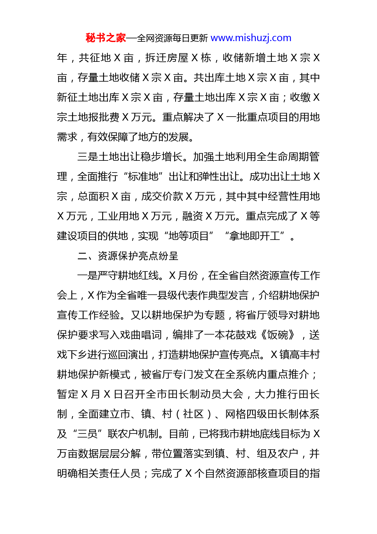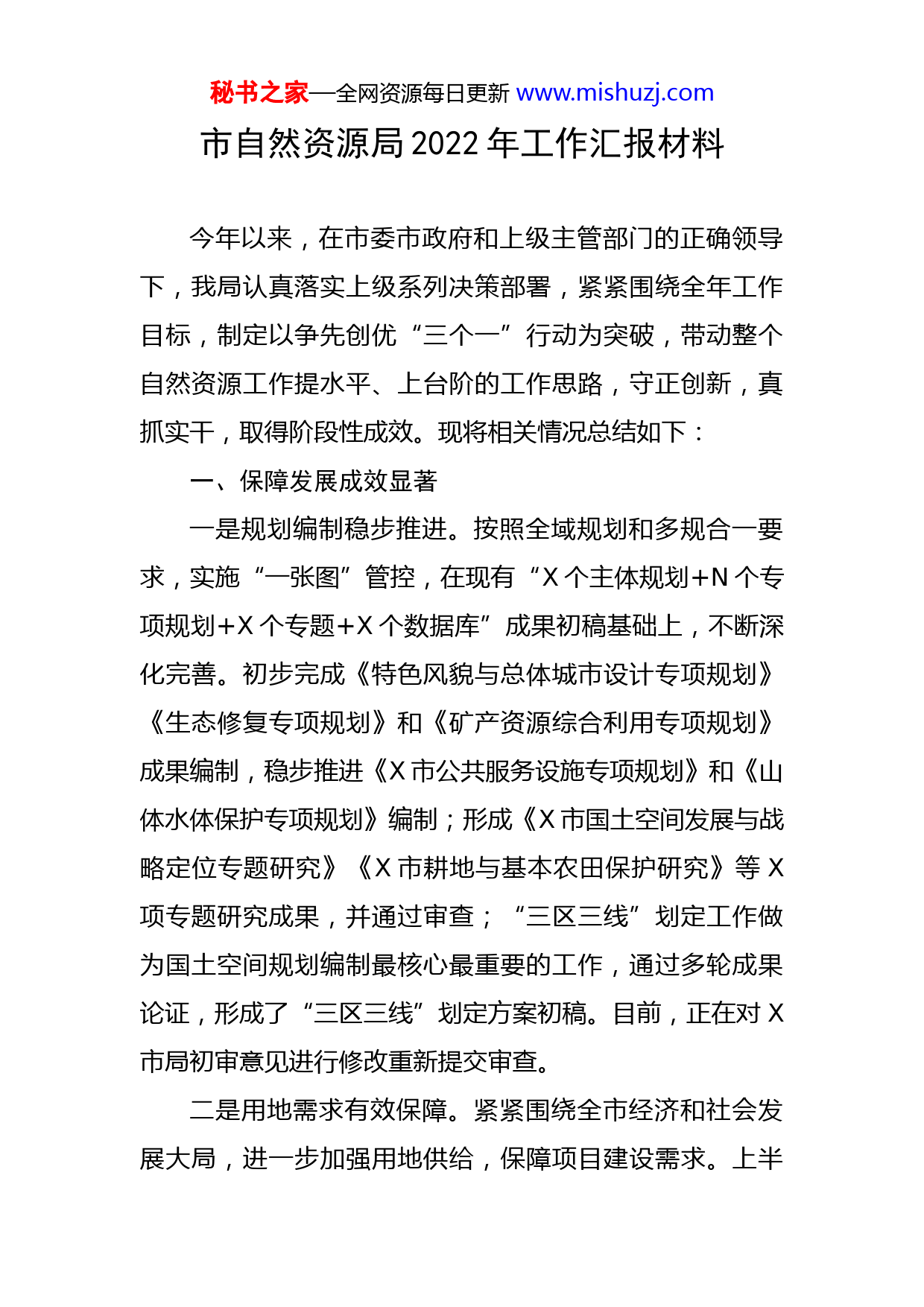 秘书之家—全网资源每日更新www.mishuzj.com市自然资源局2022年工作汇报材料今年以来,在市委市政府和上级主管部门的正确领导下,我局认真落实上级系列决策部署,紧紧围绕全年工作目标,制定以争先创优“三个一”行动为突破,带动整个自然资源工作提水平、上台阶的工作思路,守正创新,真抓实干,取得阶段性成效。现将相关情况总结如下:一、保障发展成效显著一是规划编制稳步推进。按照全域规划和多规合一要求,实施“一张图”管控,在现有“X个主体规划+N个专项规划+X个专题+X个数据库”成果初稿基础上,不断深化完善。初步完成《特色风貌与总体城市设计专项规划》《生态修复专项规划》和《矿产资源综合利用专项规划》成果编制,稳步推进《X市公共服务设施专项规划》和《山体水体保护专项规划》编制;形成《X市国土空间发展与战略定位专题研究》《X市耕地与基本农田保护研究》等X项专题研究成果,并通过审查;“三区三线”划定工作做为国土空间规划编制最核心最重要的工作,通过多轮成果论证,形成了“三区三线”划定方案初稿。目前,正在对X市局初审意见进行修改重新提交审查。二是用地需求有效保障。紧紧围绕全市经济和社会发展大局,进一步加强用地供给,保障项目建设需求。上半秘书之家—全网资源每日更新www.mishuzj.com年,共征地X亩,拆迁房屋X栋,收储新增土地X宗X亩,存量土地收储X宗X亩。共出库土地X宗X亩,其中新征土地出库X宗X亩,存量土地出库X宗X亩;收缴X宗土地报批费X万元。重点解决了X一批重点项目的用地需求,有效保障了地方的发展。三是土地出让稳步增长。加强土地利用全生命周期管理,全面推行“标准地”出让和弹性出让。成功出让土地X宗,总面积X亩,成交价款X万元,其中其中经营性用地X万元,工业用地X万元,融资X万元。重点完成了X等建设项目的供地,实现“地等项目”“拿地即开工”。二、资源保护亮点纷呈一是严守耕地红线。X月份,在全省自然资源宣传工作会上,X作为全省唯一县级代表作典型发言,介绍耕地保护宣传工作经验。又以耕地保护为专题,将省厅领导对耕地保护要求写入戏曲唱词,编排了一本花鼓戏《饭碗》,送戏下乡进行巡回演出,打造耕地保护宣传亮点。X镇高丰村耕地保护新模式,被省厅专门发文在全系统内重点推介;暂定X月X日召开全市田长制动员大会,大力推行田长制,全面建立市、镇、村(社区)、网格四级田长制体系及“三员”联农户机制。目前,已将我市耕地底线目标为X万亩数据层层分解,带位置落实到镇、村、组及农户,并明确相关责任人员;完成了X个自然资源部核查项目的指秘书之家—全网资源每日更新www.mishuzj.com标入库工作,共确认新增耕地数量指标X亩,水田指标X亩,产能指标X公斤;完成部分耕地占补指标交易,指标交易费共计X万元。二是加强矿山管理。X市汉山矿区建筑用花岗岩矿采矿权历时三年,经过多番努力,X月X日,成功在湖南省公共交易中心进场交易信息网上挂牌出让,将在X月X日启动网上竞拍工作。积极完成方家坪矿山挂牌出让前的基础业务工作,矿区范围线划定已工作已提交省厅事务中心,待矿区范围线划定储量报告评审工作立马启动。建立健全绿色矿山建设长效机制,落实矿山企业绿色矿山建设,有望十月份完成我市绿色矿山验收。三是推进生态修复。积极做好第二轮中央环保督察。打好“蓝天保卫战”“洞庭清波”行动,整改工作。2022年历史遗留矿山生态修复工程。省级下达绩效指标修复任务面积X公顷,而我市拟修复面积X公顷,超规定修复面积的X%。完成了对湖鼻、周坊、凤形、庙岭四个矿山的年度生态保护修复验收,并通过了省级抽查。开展了2022年历史遗留矿山图斑核查工作,并完成“三上”数据的填报。将玉池山风景名胜区所有历史遗留矿山打包向上申报项目。目前该项目已纳入全省“十四五”期间第二批山水林田湖草沙一体化保护和修复工程子项目,已通过自然资源部、财政部、生态环境部组织的竞争性评审会,整个湖秘书之家—全网资源每日更新www.mishuzj.com南项目排名全国第三名。三、监察执法不断强化一是扎实开展月清“三地两矿”。2022年X到X月份省厅共下发月度卫片执法图斑X个,都已完成现场核查和数据上报,均已通过验收。根据省厅一季度月清“三地两矿”情况通报,我市批而未供土地、闲置土地、违法用地连续四个月实现零新增。省厅要求,对按季度处置未达到规定要求的县市区,暂停市级权限内的征收土地预公告发布、农用地转用和集体建设用地审批、土地报批和规划调整等业务工作。目前X市局已研究决定暂停除X市以外的其他县市权限业务审批。二是严厉打击非法开采行为。我们将盗采高岭土、非法洗砂等问题一并纳入“月调度”机制进行常态化管理。今年以来,共组织打击行动X次,出动执法人员X多人次,现场制止非法开采高岭X起,强制拆除洗砂场X家,扣押挖机X台,铲车X台;共立案查处涉砂涉矿违法案件X宗,罚没款X万元;向司法机关移送涉矿案件X宗。有力打击了非法开采的嚣张气焰,对违法行为起到了强有力的震慑作用。三是强力推进控建拆违工作。我们把控建拆违作为彰显公平正义、助推人居环境的重要抓手,强力推进城乡一体违法建设集中整治行动,持续开展禁违拆违治违工作。秘书之家—全网资源每日更新www.mishuzj.com我市城市重