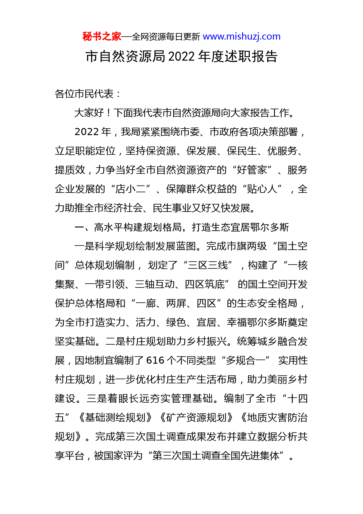 秘书之家—全网资源每日更新www.mishuzj.com市自然资源局2022年度述职报告各位市民代表:大家好!下面我代表市自然资源局向大家报告工作。2022年,我局紧紧围绕市委、市政府各项决策部署,立足职能定位,坚持保资源、保发展、保民生、优服务、提质效,力争当好全市自然资源资产的“好管家”、服务企业发展的“店小二”、保障群众权益的“贴心人”,全力助推全市经济社会、民生事业又好又快发展。一、高水平构建规划格局,打造生态宜居鄂尔多斯一是科学规划绘制发展蓝图。完成市旗两级“国土空间”总体规划编制,划定了“三区三线”,构建了“一核集聚、一带引领、三轴互动、四区筑底”的国土空间开发保护总体格局和“一廊、两屏、四区”的生态安全格局,为全市打造实力、活力、绿色、宜居、幸福鄂尔多斯奠定坚实基础。二是村庄规划助力乡村振兴。统筹城乡融合发展,因地制宜编制了616个不同类型“多规合一”实用性村庄规划,进一步优化村庄生产生活布局,助力美丽乡村建设。三是着眼长远夯实管理基础。编制了全市“十四五”《基础测绘规划》《矿产资源规划》《地质灾害防治规划》。完成第三次国土调查成果发布并建立数据分析共享平台,被国家评为“第三次国土调查全国先进集体”。秘书之家—全网资源每日更新www.mishuzj.com二、精细化管理自然资源,助力全市经济提速增效强化要素支撑,着力保项目。印发“建设项目用地审查报批制度”,建立“重点项目绿色审批”等多项快速审批机制,实现重大项目“随报随审”“容缺受理”,审查时限由20个工作日压缩至3个工作日。累计报批各类建设用地165件次、3583.7公顷,供应1095宗、3659.57公顷。全市443个重大项目和61个新能源项目用地,实现应保尽保。聚焦能源安全,着力保供应。为11家有用地需求的保供煤矿审批用地1135.87公顷,新办新上海一号、白家海子等5座煤矿采矿许可证,年释放产能2730万吨。大力实施战略找矿行动,持续推进塔然高勒和新街矿区等6个煤田地质详查工作,为“十四五”乃至今后我市产业发展提供充足的后备资源保障。发挥资源优势,着力稳收益。累计收缴自然资源出让收益55.54亿元,其中土地出让收益37.1亿元,矿产资源首期出让收益18.44亿元,为地方财政增收和市域发展做出了积极贡献。三、多举措激发市场活力,减存量强力攻坚大起底盘活存量,让沉睡资源“活起来”。深入开展土地综合整治,实施建设用地“增减挂钩”拆旧复垦1335.45亩、消化批而未供土地2.12万亩、闲置土地3.23万亩,完成率分别达到133.5%、146.2%和326.3%,均超额完成年度任务,处置量居全区第一。极速审批,让项目建设秘书之家—全网资源每日更新www.mishuzj.com“快起来”。创新推进工业项目“标准地+项目带方案+拿地即开工”全流程审批服务新模式,竞买人签订出让合同后,最短1个工作日即可实现“四证”齐发、拿地即开工,刷新了鄂尔多斯极速审批新纪录。已挂牌“标准地”8宗1016.46亩,成交2宗461.45亩;通过“拿地即开工”供应土地846.02亩。我市有效化解存量、创新审批服务的新举措、新思路,被人民日报、人民网、新华网、中国网等多家权威媒体广泛宣传报道。四、全方位保护利用资源,推动自然生态持续向好牢牢端稳粮食饭碗。严守耕地保护红线,建立四级耕地保护网格体系和“网格员”责任制度,全市411.6万亩耕地和333.9万亩基本农田,实现“总量不减少、质量有提升”。严格耕地占补平衡,率先在全区实现补充耕地指标网上挂牌出让,新建补充耕地库1.97万亩,建设项目占用耕地全部实现“占一补一、占优补优”。持续推进生态修复。编制了《乌海及周边地区绿色矿山建设和矿山地质环境治理“十四五”规划》,实施棋蒙地区矿山“集中连片”治理7.79平方公里,建成横跨棋盘井矿区至乌海交界7公里绿色走廊。完成鄂尔多斯市龙口镇—万家寨—薛家湾段黄河西岸地质环境治理及历史遗留废弃矿山治理项目4个。累计争取中央重点生态保护修复治理资金1.13亿元,企业支取使用矿山地质环境治理恢复基金43.7亿元,年度秘书之家—全网资源每日更新www.mishuzj.com矿山地质环境修复治理面积达143.97平方公里,治理面积及成效位居全区前列。高效规范管理秩序。报请市政府制定出台了自然资源管理秩序规范意见,从矿产资源、土地等7个方面明确了管控措施。开展了历史遗留违法问题专项整改“清零行动”,累计拆除整改违法用地图斑849个,恢复土地面积33776.4亩。推动数字鄂尔多斯·自然资源智慧平台建设,构建“高空看、智能判、地上查、网上管”的空天地一体化自然资源监测体系,保障自然资源管理秩序健康稳定发展。五、高质量回应社会关切,用心用情办好民生实事聚焦目标导向,群众办事更舒心。持续深化“放管服”改革,全区首个实现新建商品房“交房即交证”9个旗区全覆盖。中心城区用地规划、工程规划许可、工业类方案审查等多项审批权限进一步下放。不动产登记实现呼包鄂乌“四城通办”,市内“一网通办”,水电气暖“一窗联办”,抵押换证异地申办,企业群众办事更便捷、更高效。强化信息共享,实现新生入学、公租房申请、公积金贷款等“我要办理不动产权证”一件事一次办。率先在全区实现“不动产登记+用电”联合过户、“公积金贷款+不动产抵押登记”线上一次办、不