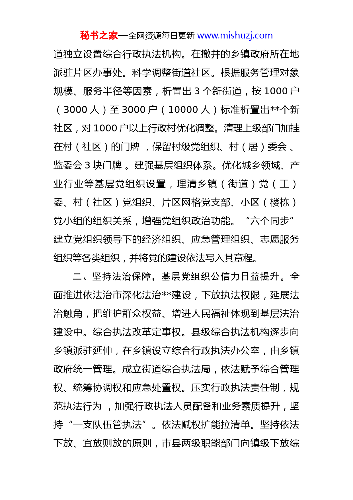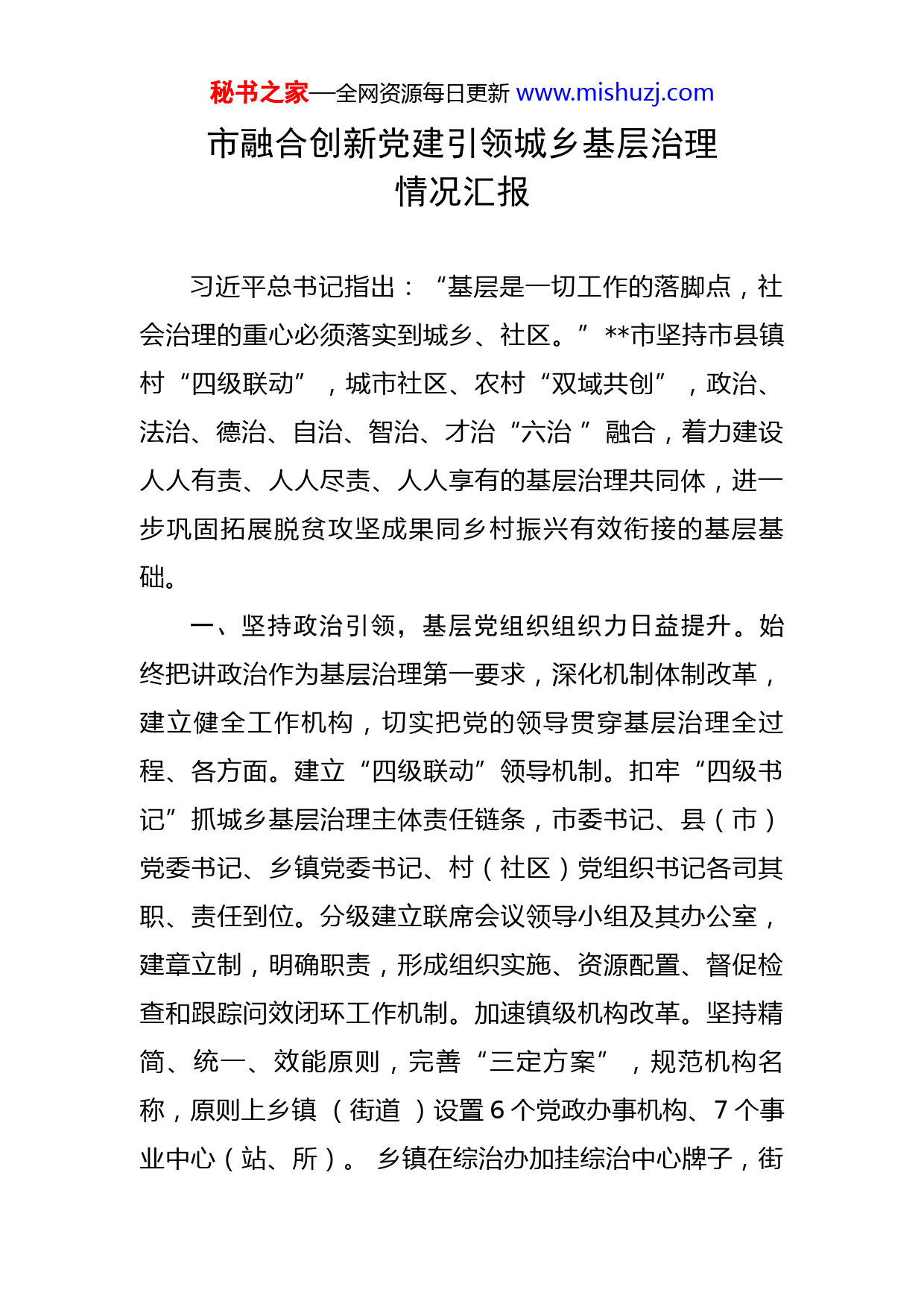 秘书之家—全网资源每日更新www.mishuzj.com市融合创新党建引领城乡基层治理情况汇报习近平总书记指出:“基层是一切工作的落脚点,社会治理的重心必须落实到城乡、社区。”市坚持市县镇村“四级联动”,城市社区、农村“双域共创”,政治、法治、德治、自治、智治、才治“六治”融合,着力建设人人有责、人人尽责、人人享有的基层治理共同体,进一步巩固拓展脱贫攻坚成果同乡村振兴有效衔接的基层基础。一、坚持政治引领,基层党组织组织力日益提升。始终把讲政治作为基层治理第一要求,深化机制体制改革,建立健全工作机构,切实把党的领导贯穿基层治理全过程、各方面。建立“四级联动”领导机制。扣牢“四级书记”抓城乡基层治理主体责任链条,市委书记、县(市)党委书记、乡镇党委书记、村(社区)党组织书记各司其职、责任到位。分级建立联席会议领导小组及其办公室,建章立制,明确职责,形成组织实施、资源配置、督促检查和跟踪问效闭环工作机制。加速镇级机构改革。坚持精简、统一、效能原则,完善“三定方案”,规范机构名称,原则上乡镇(街道)设置6个党政办事机构、7个事业中心(站、所)。乡镇在综治办加挂综治中心牌子,街秘书之家—全网资源每日更新www.mishuzj.com道独立设置综合行政执法机构。在撤并的乡镇政府所在地派驻片区办事处。科学调整街道社区。根据服务管理对象规模、服务半径等因素,析置出3个新街道,按1000户(3000人)至3000户(10000人)标准析置出个新社区,对1000户以上行政村优化调整。清理上级部门加挂在村(社区)的门牌,保留村级党组织、村(居)委会、监委会3块门牌。建强基层组织体系。优化城乡领域、产业行业等基层党组织设置,理清乡镇(街道)党(工)委、村(社区)党组织、片区网格党支部、小区(楼栋)党小组的组织关系,增强党组织政治功能。“六个同步”建立党组织领导下的经济组织、应急管理组织、志愿服务组织等各类组织,并将党的建设依法写入其章程。二、坚持法治保障,基层党组织公信力日益提升。全面推进依法治市深化法治建设,下放执法权限,延展法治触角,把维护群众权益、增进人民福祉体现到基层法治建设中。综合执法改革定事权。县级综合执法机构逐步向乡镇派驻延伸,在乡镇设立综合行政执法办公室,由乡镇政府统一管理。成立街道综合执法局,依法赋予综合管理权、统筹协调权和应急处置权。压实行政执法责任制,规范执法行为,加强行政执法人员配备和业务素质提升,坚持“一支队伍管执法”。依法赋权扩能拉清单。坚持依法下放、宜放则放的原则,市县两级职能部门向镇级下放综秘书之家—全网资源每日更新www.mishuzj.com合行政执法权限119项。派驻乡镇(街道)的机构在环境综治、人事任免、年度考核时征求乡镇(街道)党(工)委意见。建立街道权力清单、责任清单和社区工作事项清单。规范“小微”权力,制定村级组织为民服务11大类70小项责任清单,额外服务实行购买,切实为基层减负。法律为民服务进村社。实施法律明白人培养工程,设置一村(社区)一辅警一法律顾问,建立人民调解委员会,村(社区)“两委”管理有章、办事有法。创新车载法庭巡回审判,随时在田间地头、场坝院落开展微小民事纠纷案件审判,及时化解社会矛盾纠纷。开展群众普法宣传教育,增强群众学法、守法意识,创建全国民主法治示范村(社区)11个。三、坚持德治教化,基层党组织感召力日益提升。立足建设民族地区创新发展先行示范区实际,大力培育社会主义核心价值观,增强传统道德约束力。牢记嘱托思奋进。开展专题教育,全面建成镇级党校,依托新时代文明实践中心(所、站)、道德讲堂,推进习近平新时代中国特色社会主义思想进入寻常百姓家。利用布依族三月三、苗族六月六等民族节庆日,以山歌、花灯、马尾绣、农民画等独特文化,传递党的好声音、好政策,讴歌新气象、新风尚。思想扶贫当自强。采取有力举措,促使山山寨寨有敬语、村村组组树村规、家家户户明家训、老老少少颂秘书之家—全网资源每日更新www.mishuzj.com党恩、人人处处显先进、事事物物皆景观。建立红黑榜,奖勤罚懒,根治“靠着墙根晒太阳,等着政府送小康”思想,为推进乡村振兴扫清思想障碍。道德浸润树新风。巩固“明礼知耻·崇德向善”主题实践活动成果,倡导良好的家教家风,孝老敬老,立德立言,让德润蔚然成风,23个村镇被命名为“全国文明村镇”,1镇7村被认定为全国乡村治理示范乡镇、村。构筑“精神高地”,每两年开展“骄傲”人物评选。四、坚持自治强基,基层党组织凝聚力日益提升。坚持问计于民、还权于民,群众自我管理、自我服务、自我教育、自我监督更加自觉,人民群众获得感、幸福感、安全感不断攀升。议事决策人人共商。健全基层民主协商、社会参与等议事决策制度,个村规民约和居民公约自治章程通过合法性审查备案。组建“组管委”“事管委”“社管委”个、乡贤会个,将基层“两代表一委员”推选为委员、会员。在大型住宅小区建立居委会、业委会和物业公司“三方共议”的“红色物业”服务机制,解决小区停车等急难愁盼问题2100余个。改革红利人人共享。发展壮大村级集体经济,每个行政村成立股份经济合作社,确权赋能,铺平“资源变资产、资金变股金、农民变股东”之路。农村