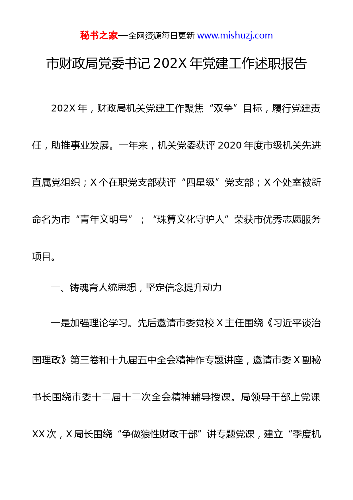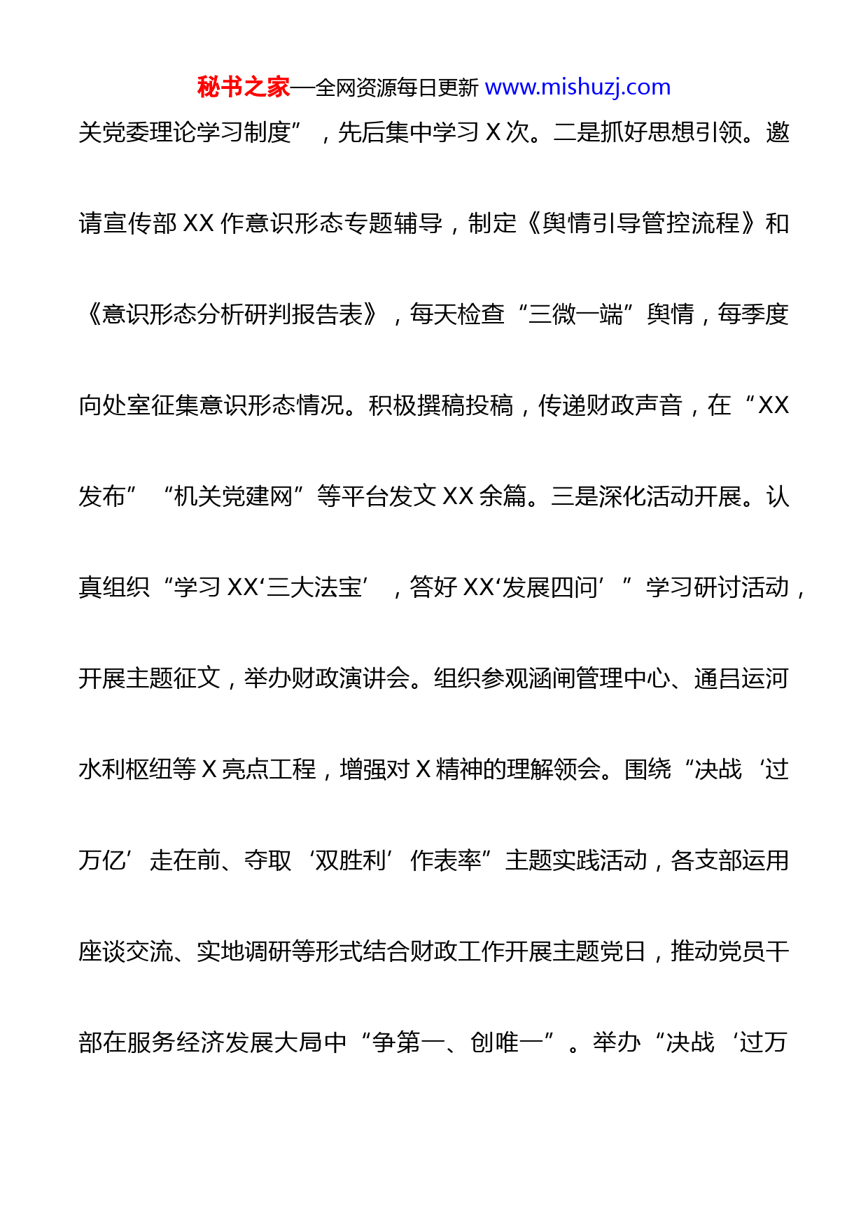 秘书之家—全网资源每日更新www.mishuzj.com市财政局党委书记202X年党建工作述职报告202X年,财政局机关党建工作聚焦“双争”目标,履行党建责任,助推事业发展。一年来,机关党委获评2020年度市级机关先进直属党组织;X个在职党支部获评“四星级”党支部;X个处室被新命名为市“青年文明号”;“珠算文化守护人”荣获市优秀志愿服务项目。一、铸魂育人统思想,坚定信念提升动力一是加强理论学习。先后邀请市委党校X主任围绕《习近平谈治国理政》第三卷和十九届五中全会精神作专题讲座,邀请市委X副秘书长围绕市委十二届十二次全会精神辅导授课。局领导干部上党课XX次,X局长围绕“争做狼性财政干部”讲专题党课,建立“季度机秘书之家—全网资源每日更新www.mishuzj.com关党委理论学习制度”,先后集中学习X次。二是抓好思想引领。邀请宣传部XX作意识形态专题辅导,制定《舆情引导管控流程》和《意识形态分析研判报告表》,每天检查“三微一端”舆情,每季度向处室征集意识形态情况。积极撰稿投稿,传递财政声音,在“XX发布”“机关党建网”等平台发文XX余篇。三是深化活动开展。认真组织“学习XX‘三大法宝’,答好XX‘发展四问’”学习研讨活动,开展主题征文,举办财政演讲会。组织参观涵闸管理中心、通吕运河水利枢纽等X亮点工程,增强对X精神的理解领会。围绕“决战‘过万亿’走在前、夺取‘双胜利’作表率”主题实践活动,各支部运用座谈交流、实地调研等形式结合财政工作开展主题党日,推动党员干部在服务经济发展大局中“争第一、创唯一”。举办“决战‘过万秘书之家—全网资源每日更新www.mishuzj.com亿’,夺取‘双胜利’财政新答卷”道德讲堂,弘扬榜样力量。四是做实党建项目。每周选派X名党团员提供珠博防疫检查、文明引导志愿服务,“珠算文化守护人”荣获今年优秀志愿服务项目。组织“狼性精神”拓展培训,聆听市委党校季建林教授专题讲座。开展“青苗助学行动”,X次走访慰问海安南莫镇XX名贫困学生,捐赠助学金X万余元,活动被XX日报报道。二、建强组织用实功,夯实堡垒凝聚合力一是抓组织强化功能。每季度下发“三会一课”指导意见,落实好谈心谈话等组织生活制度。推行“第一书记”制度,印发工作制度和责任清单,推介形成第一书记发挥“头雁”作用X个鲜活案例,做法在XX日报上报道。抓好离退休干部党建工作,组织老党员集中上秘书之家—全网资源每日更新www.mishuzj.com党课,参观考察XX大桥;开展“不忘初心,致敬芳华”初心接力活动,邀请老党员与年轻党员对话交流;建立“财政夕阳红”“财政银发先锋”微信群,及时上传学习资料、群发倡议通知;走访慰问患病住院老党员XX人次,为X名老党员贺寿;在省财政系统培训会介绍老干部支部经验做法,一名老党员当选“全省离退休干部先进个人”二是抓队伍提升形象。逐项落实“三级书记”抓党建工作责任清单,印发《党员量化评议办法》,做好党员信息管理系统维护,完成XX名党员组织关系转接,确定入党积极分子X人,批准预备党员X人。为XX名党员过政治生日,发放政治书籍XXX余册。建成X个党员活动室,优化了党务活动环境。三是抓融合增强活力。聚力创建“精业阜财”党建服务品牌,推介X个品牌创建典型案例。选派X批XX名秘书之家—全网资源每日更新www.mishuzj.com党员干部参与社区企业疫情防控和复工复产,出台XX多项财政帮扶政策,足额保障疫情防控资金。常态开展结对帮扶,“阳光扶贫”和革命老功臣、困难职工走访慰问工作。三、压实责任肃风纪,纯化党性增强定力一是教育提醒坚持经常。紧盯节庆日,开展廉政提醒、组织专项检查。结合“XX”思廉日,组织参观党风廉政教育基地,开展微型廉课。结合算账教育月,组织学习法规案例,召开警示教育大会。结合“国际反腐败日”,组织学习《全省财政系统党员干部违纪违法案件案例选编》,以案明纪、以案释法。二是监督整治较真碰硬。抓好机关作风整治,聚焦“松软散”“庸拖懒”,党员干部人人制定问题清单,共落实整改措施XXX条。抓好市委巡察整改,将问题分解落实到秘书之家—全网资源每日更新www.mishuzj.com具体处室,制定XX项XX条整改措施,明确整改时限,确定责任领导,形成整改清单,全面压实整改责任。先后XX次召开学习会、碰头会,推进整改进度,协调解决问题,配合做好省委巡察督导组抽查指导工作。目前,巡察问题已基本整改完成。四、下年度工作打算下一步,继续贯彻落实十九届六中全会和习近平总书记视察时重要讲话指示精神,抓好“双争”活动,以迎庆党的二十大胜利召开为契机深化守初心、担使命要求;强化组织功能,推进党支部按期换届,全面争创“五星级”;落实助推发展“走在前”要求,加大品牌创建力度,提升服务发展质效。