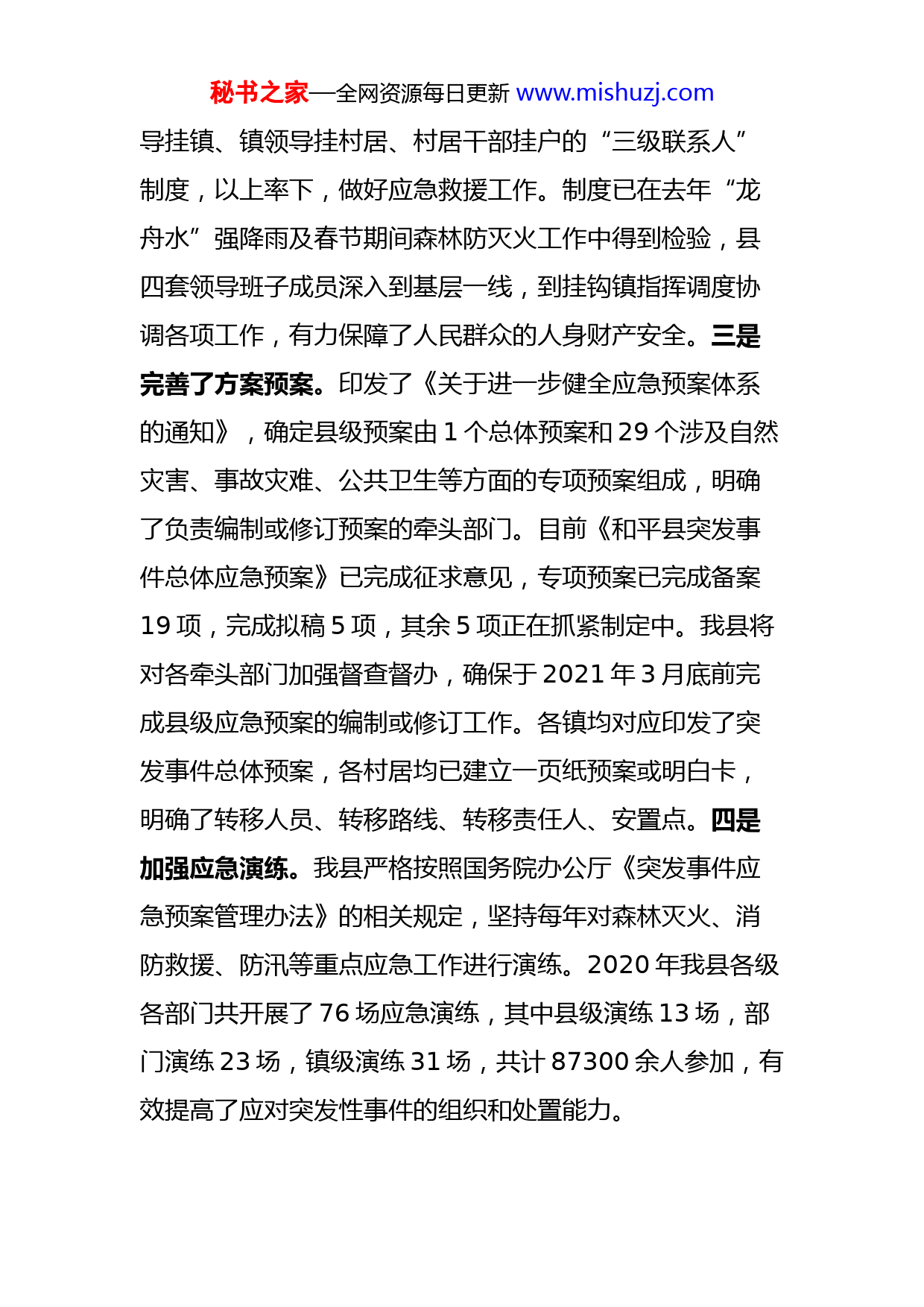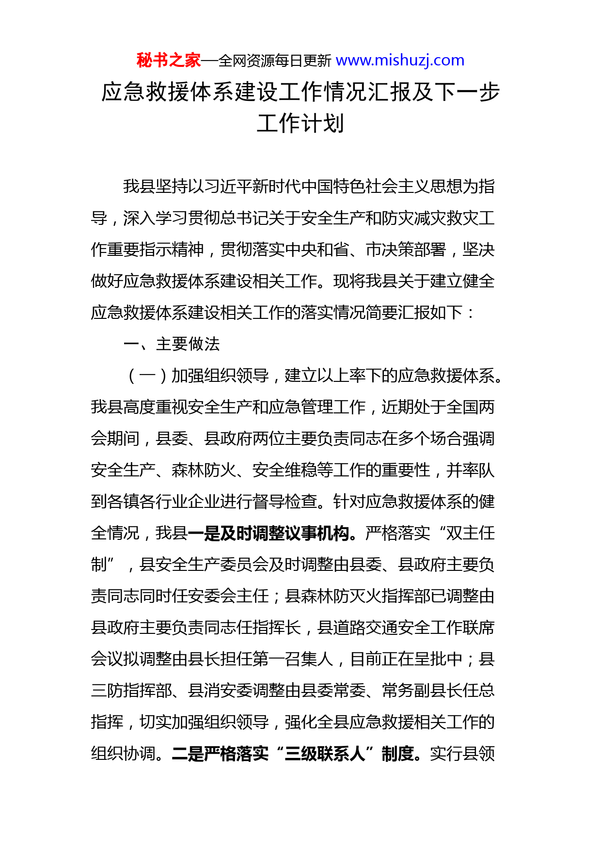 秘书之家—全网资源每日更新www.mishuzj.com应急救援体系建设工作情况汇报及下一步工作计划我县坚持以习近平新时代中国特色社会主义思想为指导,深入学习贯彻总书记关于安全生产和防灾减灾救灾工作重要指示精神,贯彻落实中央和省、市决策部署,坚决做好应急救援体系建设相关工作。现将我县关于建立健全应急救援体系建设相关工作的落实情况简要汇报如下:一、主要做法(一)加强组织领导,建立以上率下的应急救援体系。我县高度重视安全生产和应急管理工作,近期处于全国两会期间,县委、县政府两位主要负责同志在多个场合强调安全生产、森林防火、安全维稳等工作的重要性,并率队到各镇各行业企业进行督导检查。针对应急救援体系的健全情况,我县一是及时调整议事机构。严格落实“双主任制”,县安全生产委员会及时调整由县委、县政府主要负责同志同时任安委会主任;县森林防灭火指挥部已调整由县政府主要负责同志任指挥长,县道路交通安全工作联席会议拟调整由县长担任第一召集人,目前正在呈批中;县三防指挥部、县消安委调整由县委常委、常务副县长任总指挥,切实加强组织领导,强化全县应急救援相关工作的组织协调。二是严格落实“三级联系人”制度。实行县领秘书之家—全网资源每日更新www.mishuzj.com导挂镇、镇领导挂村居、村居干部挂户的“三级联系人”制度,以上率下,做好应急救援工作。制度已在去年“龙舟水”强降雨及春节期间森林防灭火工作中得到检验,县四套领导班子成员深入到基层一线,到挂钩镇指挥调度协调各项工作,有力保障了人民群众的人身财产安全。三是完善了方案预案。印发了《关于进一步健全应急预案体系的通知》,确定县级预案由1个总体预案和29个涉及自然灾害、事故灾难、公共卫生等方面的专项预案组成,明确了负责编制或修订预案的牵头部门。目前《和平县突发事件总体应急预案》已完成征求意见,专项预案已完成备案19项,完成拟稿5项,其余5项正在抓紧制定中。我县将对各牵头部门加强督查督办,确保于2021年3月底前完成县级应急预案的编制或修订工作。各镇均对应印发了突发事件总体预案,各村居均已建立一页纸预案或明白卡,明确了转移人员、转移路线、转移责任人、安置点。四是加强应急演练。我县严格按照国务院办公厅《突发事件应急预案管理办法》的相关规定,坚持每年对森林灭火、消防救援、防汛等重点应急工作进行演练。2020年我县各级各部门共开展了76场应急演练,其中县级演练13场,部门演练23场,镇级演练31场,共计87300余人参加,有效提高了应对突发性事件的组织和处置能力。秘书之家—全网资源每日更新www.mishuzj.com(二)加强部门联动,建立条通理顺的应急救援运行机制。一是理顺职能体系。调整优化县应急救援总指挥部和专项应急指挥部,坚持一岗双责,由各行业部门分管领导担任各专项指挥部指挥长。近两年已顺利完成三防指挥部和森林防灭火指挥部的职能划转,将县水务、林业部门的相关人员、设备、物资交接给县应急部门,并补充加强了人员力量。二是建立各部门间的沟通协调和联席机制。县应急管理部门与县人武部、武警中队等当地驻军每半年定期召开一次联席会议,完善抢险救援协同体系;与气象、水务部门在强降雨来临前均会举行会商会议,分析研判形势,作出预警预报;与发改部门联合制定了《关于建立县级救灾物资应急保障联动机制(试行)的通知》,健全完善了统一指挥、协调有序、运转高效的应急物资保障体系,确保紧急情况下救灾物资及时调拨到受灾地区,全力保障受灾群众基本生活。三是健全县镇两级救援联动队伍。我县统筹全县应急救援队伍建设,健全了由县应急管理部门统一协调、各部门应急联动的处置与救援机制,形成了以“综合性应急救援队伍为主、部门救援为辅、镇村救援为补充”的综合性应急救援队伍体系。目前,全县综合性应急抢险救灾队伍主要有5支共269人,分别为县森林消防大队80人、县消防救援大队49人、县武警中队20人、县人武部基干民兵连100人、县医疗救援队20人,配备秘书之家—全网资源每日更新www.mishuzj.com有橡皮艇、冲锋舟、救生衣、消防车、破拆工具、对讲机、无人机等救援设备。各镇均按规范要求组建了半专业扑火队。接下来,将按照省市工作要求和部署,有计划、有组织、有重点地建设应急专业救援队,形成“统一指挥、反应灵敏、协调有序、运转高效”的应急救援体系。(三)加强资金投入,建立标准化的应急救援平台设施。一是优化县级应急指挥平台。县级应急指挥中心将在原县工业园管委会大楼重新建设,预计上半年实现搬迁。在配齐其他设施设备后我县将一改原县级指挥中心面积狭窄,条件简陋的现状,建成技术先进、标准统一的县级智能应急指挥平台,有效提升我县自然灾害防治、安全生产事故预防和应急救援指挥调度能力。二是完善应急救援装备和物资仓库建设。我县已设置1个救灾物资仓库和1个应急物资仓库,其中救灾物资仓库设置在县粮食仓库,面积可根据物资储备数量灵活调配,各项设施设备较为完善,救灾物资能够得到有效保管;应急物资仓库为临时租用店面,面积约200平方米,设置有防潮、消防、照明和给排水等设施设备,能够基本满足目前物资储备要求。接下来,我县将加大县级