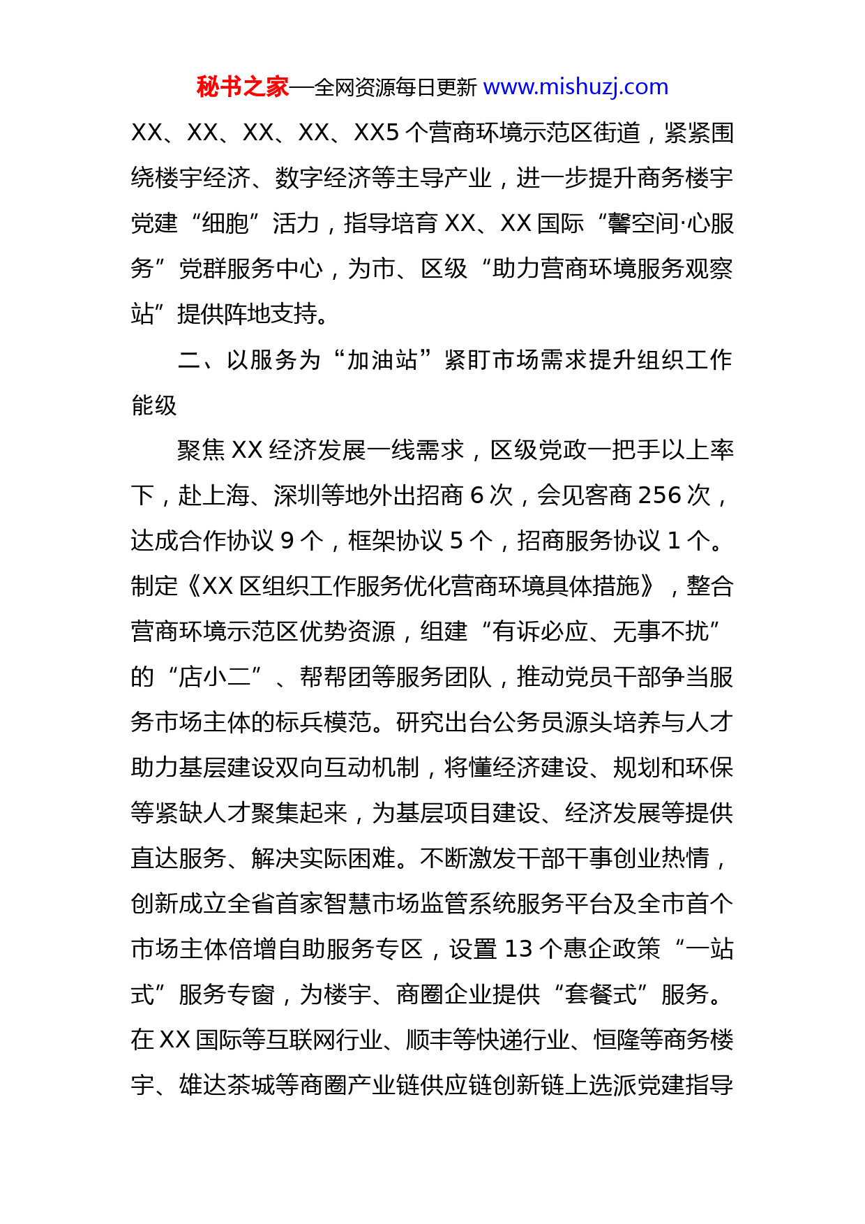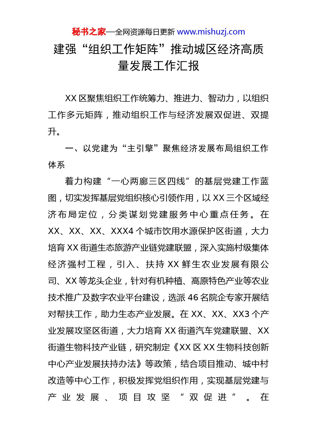 秘书之家—全网资源每日更新www.mishuzj.com建强“组织工作矩阵”推动城区经济高质量发展工作汇报XX区聚焦组织工作统筹力、推进力、智动力,以组织工作多元矩阵,推动组织工作与经济发展双促进、双提升。一、以党建为“主引擎”聚焦经济发展布局组织工作体系着力构建“一心两廊三区四线”的基层党建工作蓝图,切实发挥基层党组织核心引领作用,以XX三个区域经济布局定位,分类谋划党建服务中心重点任务。在XX、XX、XX、XXX4个城市饮用水源保护区街道,大力培育XX街道生态旅游产业链党建联盟,深入实施村级集体经济强村工程,引入、扶持XX鲜生农业发展有限公司、XX等龙头企业,针对有机种植、高原特色产业等农业技术推广及数字农业平台建设,选派46名院企专家开展结对帮扶工作,助力生态产业发展。在XX、XX、XX3个产业发展攻坚区街道,大力培育XX街道汽车党建联盟、XX街道生物科技产业链,研究制定《XX区XX生物科技创新中心产业发展扶持办法》等政策,结合项目推动、城中村改造等中心工作,积极发挥党组织作用,实现基层党建与产业发展、项目攻坚“双促进”。在秘书之家—全网资源每日更新www.mishuzj.comXX、XX、XX、XX、XX5个营商环境示范区街道,紧紧围绕楼宇经济、数字经济等主导产业,进一步提升商务楼宇党建“细胞”活力,指导培育XX、XX国际“馨空间·心服务”党群服务中心,为市、区级“助力营商环境服务观察站”提供阵地支持。二、以服务为“加油站”紧盯市场需求提升组织工作能级聚焦XX经济发展一线需求,区级党政一把手以上率下,赴上海、深圳等地外出招商6次,会见客商256次,达成合作协议9个,框架协议5个,招商服务协议1个。制定《XX区组织工作服务优化营商环境具体措施》,整合营商环境示范区优势资源,组建“有诉必应、无事不扰”的“店小二”、帮帮团等服务团队,推动党员干部争当服务市场主体的标兵模范。研究出台公务员源头培养与人才助力基层建设双向互动机制,将懂经济建设、规划和环保等紧缺人才聚集起来,为基层项目建设、经济发展等提供直达服务、解决实际困难。不断激发干部干事创业热情,创新成立全省首家智慧市场监管系统服务平台及全市首个市场主体倍增自助服务专区,设置13个惠企政策“一站式”服务专窗,为楼宇、商圈企业提供“套餐式”服务。在XX国际等互联网行业、顺丰等快递行业、恒隆等商务楼宇、雄达茶城等商圈产业链供应链创新链上选派党建指导秘书之家—全网资源每日更新www.mishuzj.com员442名,将党建工作有效融入服务企业的全过程。动员人社、司法、政务服务等部门党员干部组建“暖新帮帮团”,为“新新”群体以点单式提供创新创业等51项特色服务,帮助解决实际困难115项。2022年,全区地区生产总值预计实现1060亿元、同比增长2%以上。市场主体总量达13.26万户,同比增长16.54%。43家企业落户XX,新引进重大产业项目21个,其中世界500强1户,中国500强企业4户,民营500强企业3户。三、以人才为“动力源”运用贤才聚盘激发组织工作活力将人才工作融入全区经济发展战略,以产业链“补链”“强链”人才为重点,推行“项目引才”“大赛聚才”“以才引才”。开展特色重点产业人才培育行动,以“区域+领域”推进商务楼宇人才管理一体化建设,补齐楼宇总部经济、生命科技、大健康、大文创等紧缺急需领域人才短板,近年来全区吸纳了院士X人,国家级专家学者X人,引进高层次急需紧缺人才X人,高层次人才在企业发展中的驱动作用不断显现,全区人才贡献率达37.56%。统筹全区人才工作力量,投入100余万元举办首届“贤才聚盘”创新创业创造大赛,首创职工“五小”岗位创新优秀成果赛制,面向全市包括滇籍外地高校生“以赛促创”,吸引X个项目报名参赛,评选出的获奖项秘书之家—全网资源每日更新www.mishuzj.com目与XX区发展定位高度契合,及时将大赛成果转化运用为推动产业转型发展的实际成效。推动科技创新与科技成果转化,全社会研发投入达XX亿元,全区发明专利有效量同比增长18.75%。不断拓展区院校合作“朋友圈”,出台落实《XX区加强与高校科研院所合作实施方案》,同XX农业大学、XXX大学、XX创新研究院、XX农业科学院等院(校、所)建立18个合作对子,协同推进“五中心一平台”体系建设,依托该体系2022年共获各类知识产权587项,实现科技成果转化153项,经济效益9亿元。