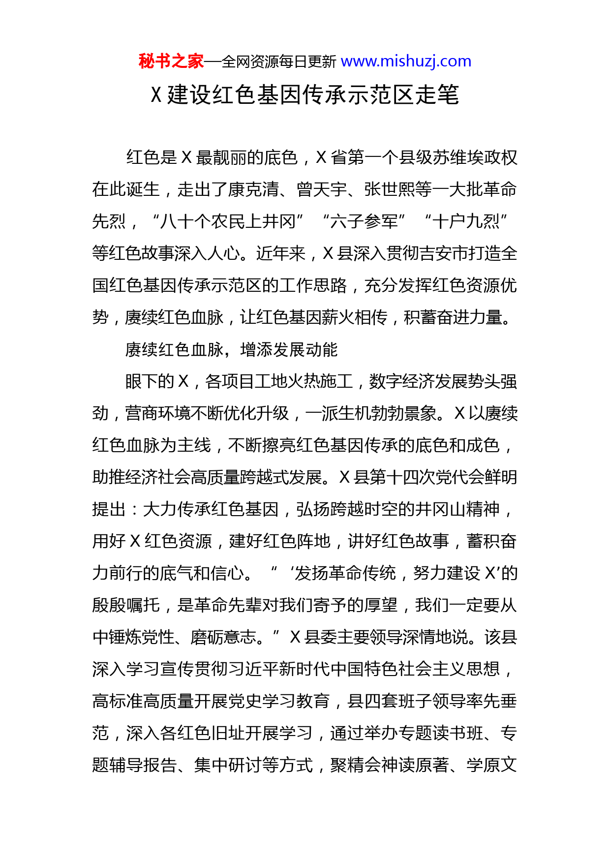 秘书之家—全网资源每日更新www.mishuzj.comX建设红色基因传承示范区走笔红色是X最靓丽的底色,X省第一个县级苏维埃政权在此诞生,走出了康克清、曾天宇、张世熙等一大批革命先烈,“八十个农民上井冈”“六子参军”“十户九烈”等红色故事深入人心。近年来,X县深入贯彻吉安市打造全国红色基因传承示范区的工作思路,充分发挥红色资源优势,赓续红色血脉,让红色基因薪火相传,积蓄奋进力量。赓续红色血脉,增添发展动能眼下的X,各项目工地火热施工,数字经济发展势头强劲,营商环境不断优化升级,一派生机勃勃景象。X以赓续红色血脉为主线,不断擦亮红色基因传承的底色和成色,助推经济社会高质量跨越式发展。X县第十四次党代会鲜明提出:大力传承红色基因,弘扬跨越时空的井冈山精神,用好X红色资源,建好红色阵地,讲好红色故事,蓄积奋力前行的底气和信心。“‘发扬革命传统,努力建设X’的殷殷嘱托,是革命先辈对我们寄予的厚望,我们一定要从中锤炼党性、磨砺意志。”X县委主要领导深情地说。该县深入学习宣传贯彻习近平新时代中国特色社会主义思想,高标准高质量开展党史学习教育,县四套班子领导率先垂范,深入各红色旧址开展学习,通过举办专题读书班、专题辅导报告、集中研讨等方式,聚精会神读原著、学原文秘书之家—全网资源每日更新www.mishuzj.com悟原理,汲取精神营养。创新开展“三比一争”(比学习比服务、比业绩、争先进)”跨越赶超活动,凝聚起奋力建设富裕美丽幸福新X的强大力量。传承红色基因,培育时代新人走进X县实验小学校园,红色书籍遍布读书长廊和教学楼楼道,革命故事随处可见,学生在校园里随时随处能学习革命故事。在X县保育院,每周一通过升国旗、宣誓、唱红歌、向国旗敬礼等,让红色文化在幼儿心中生根发芽该县坚持立德树人,不断创新育人方式,大力传承红色基因。以数字化教学为载体,投入资金约2700万元组建了教育城域网,通过教育信息化手段促进红色教育资源共建共享。将康克清故居、X暴动行动委员会旧址等7处红色教育基地以及“红色名村”作为活的“教科书”,免费向公众开放。该县制定文化重点项目清单,着力创新,策划创作系列有特色、有影响、优势明显的红色精品。以“八十农民上井冈”为题材,把革命先烈的经历融入红色童书创作,创作《八十农民上井冈》连环画。同时挖掘整理康克清、曾天宇、七位X籍开国将军以及X暴动、“八十农民上井冈”“六子参军”“十户九烈”等革命故事,创作系列文艺作品采茶歌舞剧《山乡红旗》《六棵桂花树》、文学刊物《康克清》《X红色故事集》《天下X》《红色X》等。秘书之家—全网资源每日更新www.mishuzj.com同时,实施红色基因史料抢救性挖掘、系统性编纂工作,收集X革命文献史料,充实红色基因库。探索红色治理,践行为民宗旨“红马甲成了我们群众的‘活雷锋’,帮农事、修水沟、村庄整治,就连邻里间有矛盾也会帮忙解决。”谈起村里的红色志愿服务队,涧田乡畲族村村民雷长福连连竖起大拇指。该县将积极探索“红色文化+社会治理”机制,通过打造“红色阵地”、构建“红色网格、培育“红色队伍”,常态化为群众开展服务,解决“急难愁盼”问题,带动当地群众共建共治共享。该县依托红色历史文化,以党建为引领,打造各具特色的红色名村,划分红色网格,由村干部、红军后代等担任网格员,真情服务群众。利用村史馆、红色文化广场等红色阵地,建设了1300多个“村民说事点”和“流动说事点”,2021年以来,共调处各类矛盾纠纷1100余起。同时,该县还积极为群众开展线上服务,开辟新时代文明实践点单平台专区,设计“红色基因传承”点单服务志愿服务项目27个,上线“红色观影”“红色故事”“红色歌曲”等志愿服务项目,丰富群众文化生活,更好服务群众。