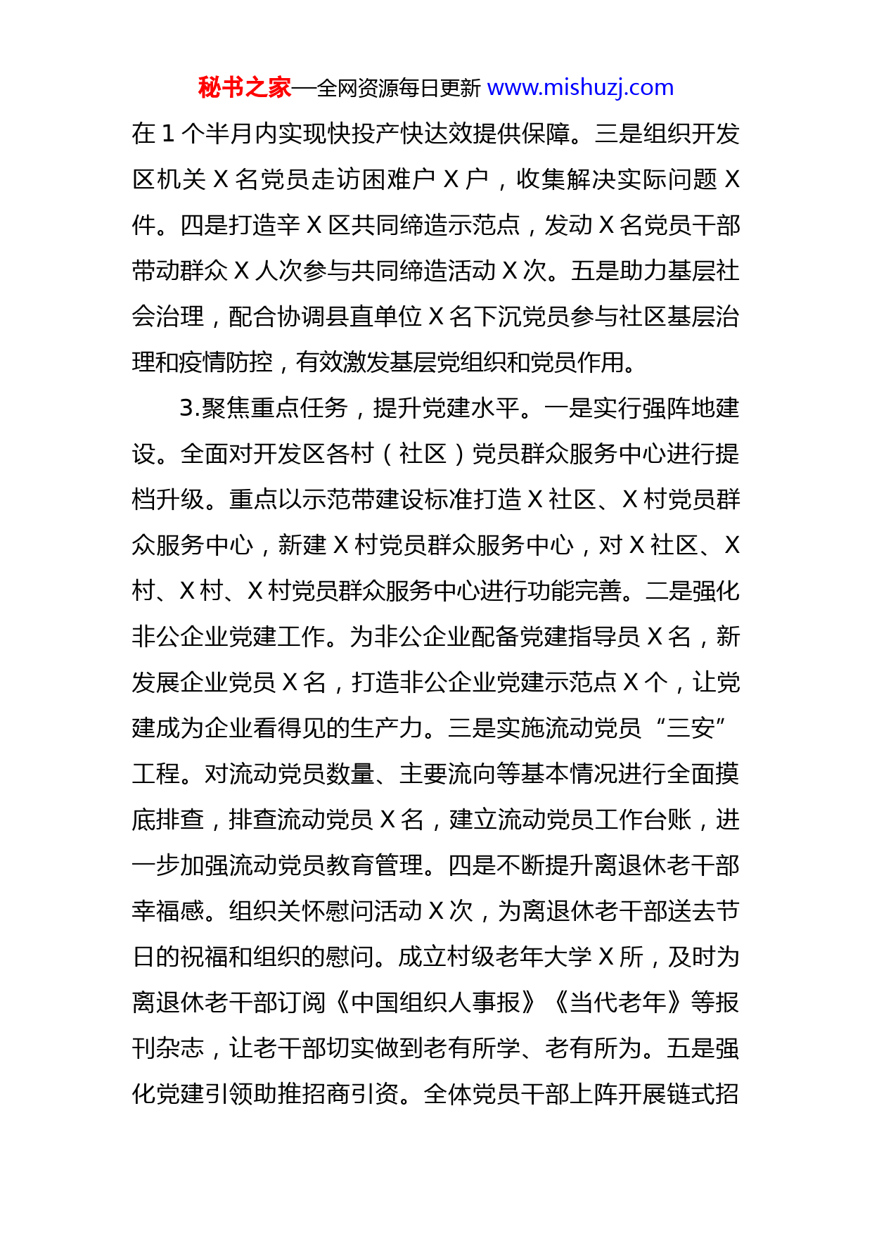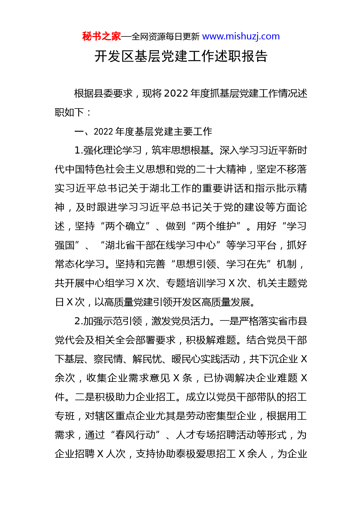 秘书之家—全网资源每日更新www.mishuzj.com开发区基层党建工作述职报告根据县委要求,现将2022年度抓基层党建工作情况述职如下:一、2022年度基层党建主要工作1.强化理论学习,筑牢思想根基。深入学习习近平新时代中国特色社会主义思想和党的二十大精神,坚定不移落实习近平总书记关于湖北工作的重要讲话和指示批示精神,及时跟进学习习近平总书记关于党的建设等方面论述,坚持“两个确立”、做到“两个维护”。用好“学习强国”、“湖北省干部在线学习中心”等学习平台,抓好常态化学习。坚持和完善“思想引领、学习在先”机制,共开展中心组学习X次、专题培训学习X次、机关主题党日X次,以高质量党建引领开发区高质量发展。2.加强示范引领,激发党员活力。一是严格落实省市县党代会及相关全会部署要求,积极解难题。结合党员干部下基层、察民情、解民忧、暧民心实践活动,共下沉企业X余次,收集企业需求意见X条,已协调解决企业难题X件。二是积极助力企业招工。成立以党员干部带队的招工专班,对辖区重点企业尤其是劳动密集型企业,根据用工需求,通过“春风行动”、人才专场招聘活动等形式,为企业招聘X人次,支持协助泰极爱思招工X余人,为企业秘书之家—全网资源每日更新www.mishuzj.com在1个半月内实现快投产快达效提供保障。三是组织开发区机关X名党员走访困难户X户,收集解决实际问题X件。四是打造辛X区共同缔造示范点,发动X名党员干部带动群众X人次参与共同缔造活动X次。五是助力基层社会治理,配合协调县直单位X名下沉党员参与社区基层治理和疫情防控,有效激发基层党组织和党员作用。3.聚焦重点任务,提升党建水平。一是实行强阵地建设。全面对开发区各村(社区)党员群众服务中心进行提档升级。重点以示范带建设标准打造X社区、X村党员群众服务中心,新建X村党员群众服务中心,对X社区、X村、X村、X村党员群众服务中心进行功能完善。二是强化非公企业党建工作。为非公企业配备党建指导员X名,新发展企业党员X名,打造非公企业党建示范点X个,让党建成为企业看得见的生产力。三是实施流动党员“三安”工程。对流动党员数量、主要流向等基本情况进行全面摸底排查,排查流动党员X名,建立流动党员工作台账,进一步加强流动党员教育管理。四是不断提升离退休老干部幸福感。组织关怀慰问活动X次,为离退休老干部送去节日的祝福和组织的慰问。成立村级老年大学X所,及时为离退休老干部订阅《中国组织人事报》《当代老年》等报刊杂志,让老干部切实做到老有所学、老有所为。五是强化党建引领助推招商引资。全体党员干部上阵开展链式招秘书之家—全网资源每日更新www.mishuzj.com商,开展考察洽谈活动X场次,签约落地X项目X个。六是以党建引领推进项目建设。牢固树立抓项目就是抓党建的理念,谋划X个项目,签约项目X个,在建项目X个,主体工程竣工项目X个,建成投产项目X个。七是以党建引领强化乡村振兴。落实农村低收入人群防贫监测和帮扶机制,为其享受教育、健康、就业、住房、兜底提供保障。同时,结合常态化疫情防控,保障独居老人等重点人群安全过冬。八是以党建引领促进和谐稳定。排查信访案件X件,成功化解X件,妥善处置X起突发事件,及时有效化解风险,社会面稳定可控。4.履行主体责任,强化担当意识。认真履行抓基层党建第一责任人职责,制定了《2022年党建重点任务工作清单》,将党建工作分解到责任领导、责任科室,确保党建工作落到实处。坚持带头履行书记职责,其他班子成员认真履行分管领域基层党建工作责任,形成了书记带头抓、其他班子成员分工抓、支部书记具体抓、全体党员共同抓的责任体系。对2021年基层党建工作述职评议反馈的、市县巡察反馈涉及基层党建的X条问题,逐条建立整改措施,抓好整改落实。二、存在的突出问题1.思想认识还不够到位。没有把政治理论学习摆上重要日程,工委班子存在以会代学现象,班子成员例会研究招秘书之家—全网资源每日更新www.mishuzj.com商引资、项目建设多,研究党建工作少。基层党建工作不同程度地存在“说起来重要,做起来次要,忙起来不要”的现象。对基层党建工作抓一阵、放一阵,紧一阵、松一阵,没有真正把党建工作作为自己的“责任田”和“份内事”,工作中过于注重经济发展,没有把党的建设摆到同等位置上,党建工作部署多、督办多,参与较少,没有做到重要工作亲自部署、重大问题亲自过问、重要环节亲自协调。2.党建工作内容还不够丰富。基层党内组织生活缺少创新意识和手段,存在流于形式的倾向,“三会一课”内容与实际工作联系不够紧密,吸引力和凝聚力不够;部分党组织对党员的思想教育缺乏针对性,教育内容枯燥,方式方法单一,缺乏生机和活力;党建工作的载体创新不够,基层党建工作缺乏特色亮点。3.党员先锋作用还不够突出。一些基层党组织不注重党员发挥先锋模范作用,致使个别党员放松了对自己的要求。有的党员党性淡簿,日常工作中把自己等同于普通群众,只顾局部利益,缺乏全局观念;有的党员工作缺乏热情和积极性,得过且过,工作上不求进取,少数党员只缴纳党费不参加组织生活;有的党费也要催缴,还有的甚至连党费也不愿意按规定标准缴纳。三、下一步工作打算秘书之家—全网资源每日更新www.mishuzj